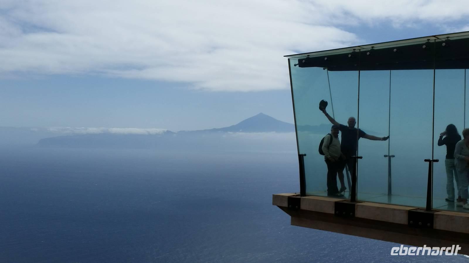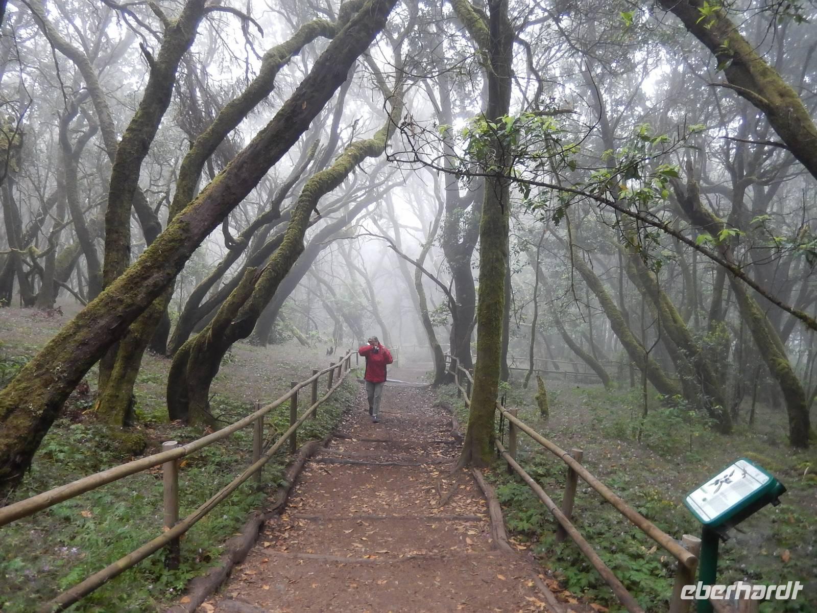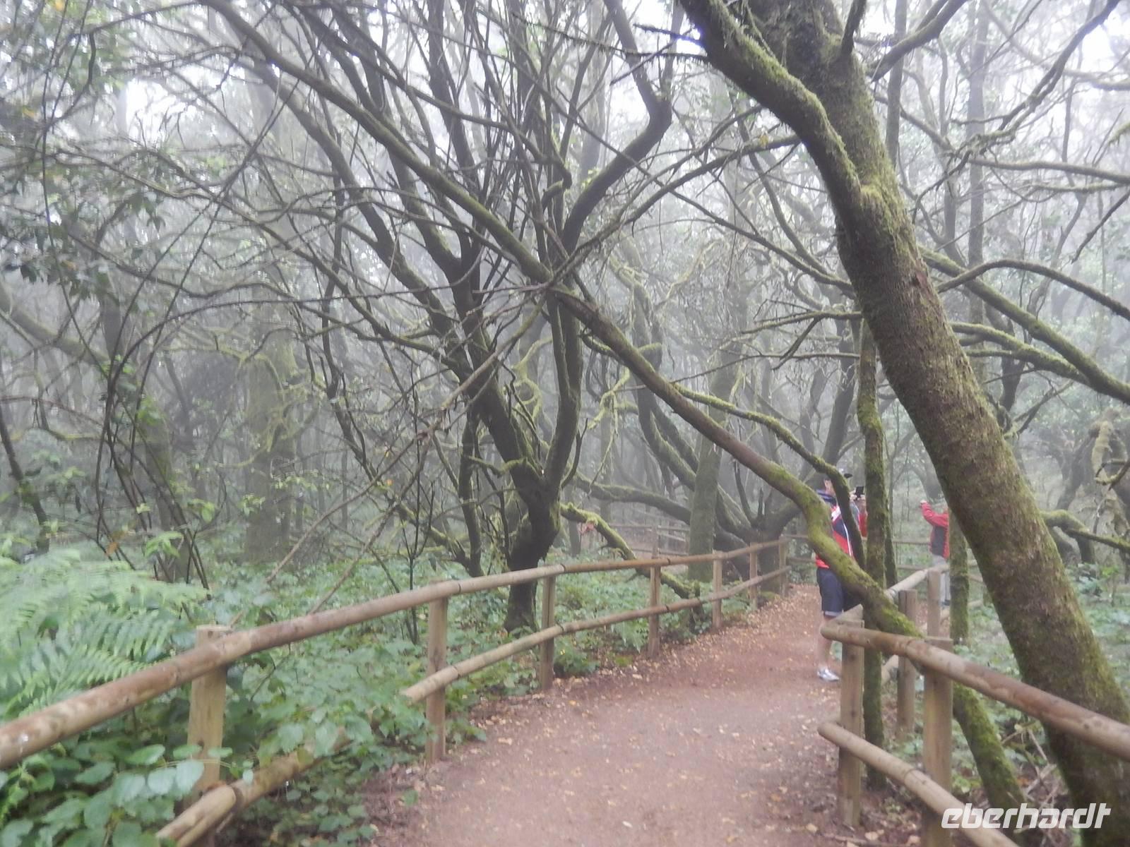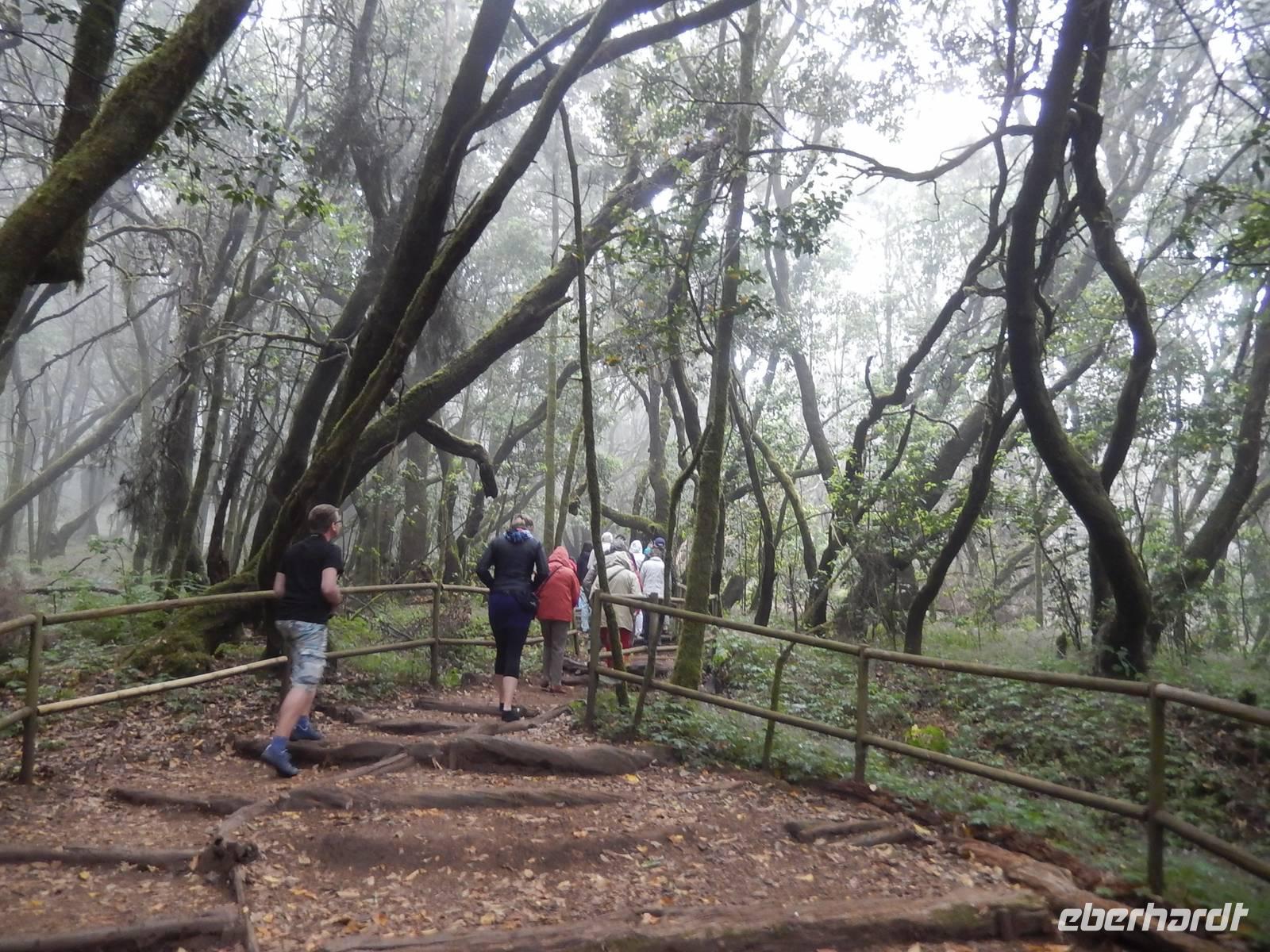 Wir fuhren durch den Nationalpark Garajonay mit seinem einzigartigen, immergrünen Lorbeerwald. Zweifelsohne ist dieser Park eines der beeindruckendsten Sehenswürdigkeiten La Gomeras. Das Wahrzeichen des UNESCO-Weltnaturerbes sind die Lorbeerbäume mit bemoosten Stämmen und bizarr von den Ästen flatternden Bartflechten. Hier bei Laguna Grande machten wir einen 40-minütigen Spaziergang. Heute gab es Wolken und Nebel und dies war genau richtig, um diesen Lorbeerwald zu erkunden. Der Busfahrer brachte uns als Überraschung zu dem neuen Aussichtspunkt Abrante im Norden der Inseln. Es war eine Art Skywalker wie auf dem Grand Canyon in Colorado. Auf einer Glasscheibe konnte man über eine Schlucht unter seinen Füssen die Höhe und Teneriffa mit Teide im Hintergrund bestaunen. Unglaublich schön. Später im Besucherzentrum schauten wir uns einen sehr guten, ca. 20-minütigen Film auf deutsch an und besichtigten das Museum sowie den Botanischen Garten.