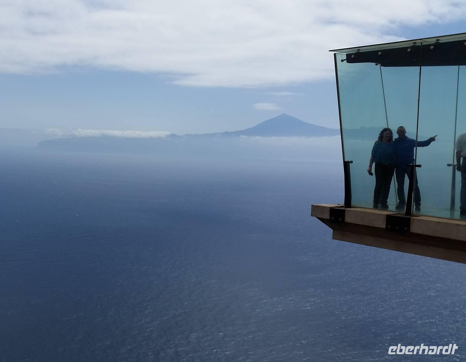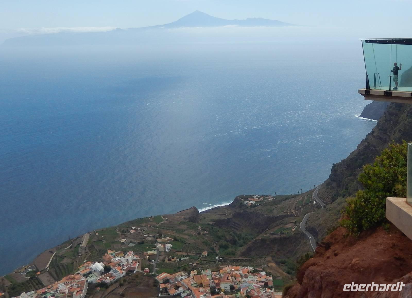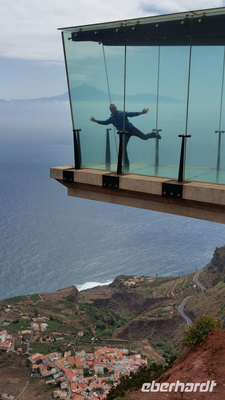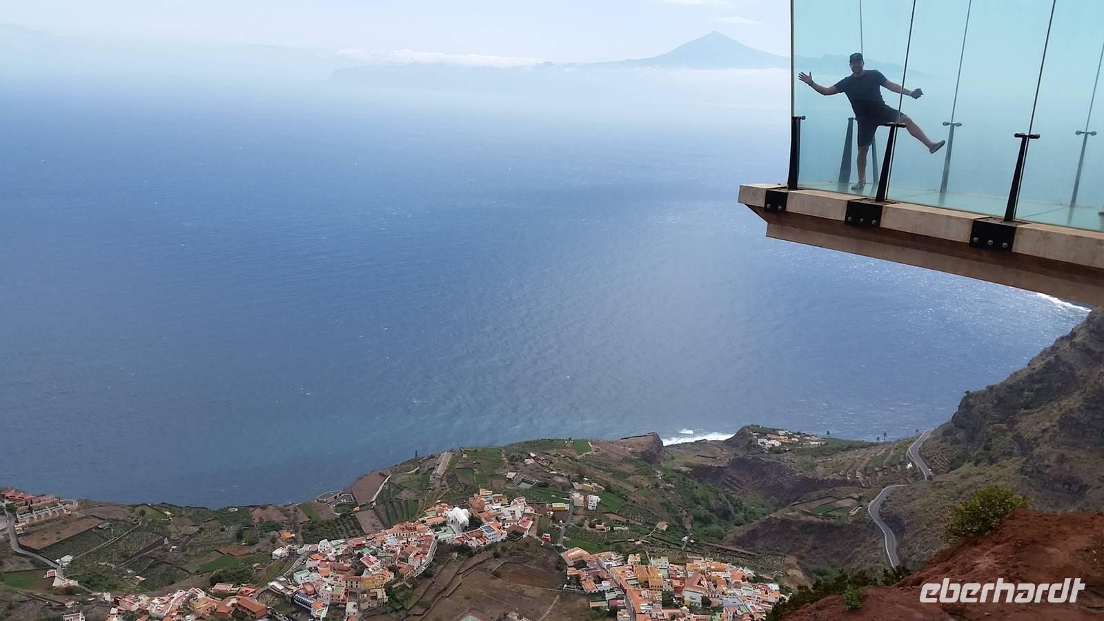 Wir fuhren durch den Nationalpark Garajonay mit seinem einzigartigen, immergrünen Lorbeerwald. Zweifelsohne ist dieser Park eines der beeindruckendsten Sehenswürdigkeiten La Gomeras. Das Wahrzeichen des UNESCO-Weltnaturerbes sind die Lorbeerbäume mit bemoosten Stämmen und bizarr von den Ästen flatternden Bartflechten. Hier bei Laguna Grande machten wir einen 40-minütigen Spaziergang. Heute gab es Wolken und Nebel und dies war genau richtig, um diesen Lorbeerwald zu erkunden. Der Busfahrer brachte uns als Überraschung zu dem neuen Aussichtspunkt Abrante im Norden der Inseln. Es war eine Art Skywalker wie auf dem Grand Canyon in Colorado. Auf einer Glasscheibe konnte man über eine Schlucht unter seinen Füssen die Höhe und Teneriffa mit Teide im Hintergrund bestaunen. Unglaublich schön. Später im Besucherzentrum schauten wir uns einen sehr guten, ca. 20-minütigen Film auf deutsch an und besichtigten das Museum sowie den Botanischen Garten.