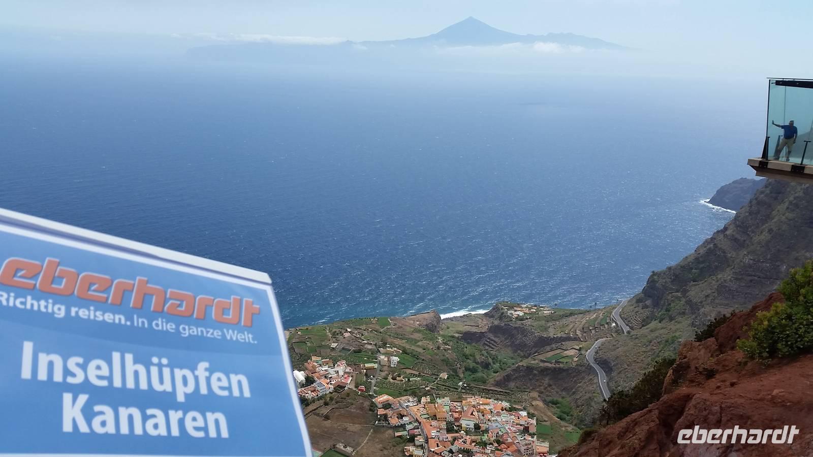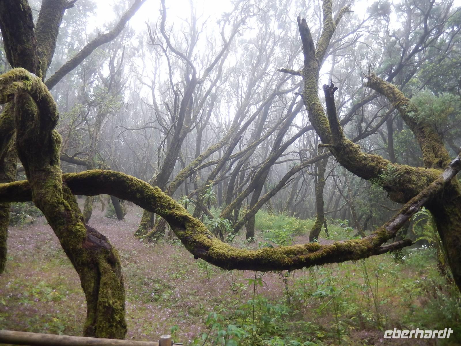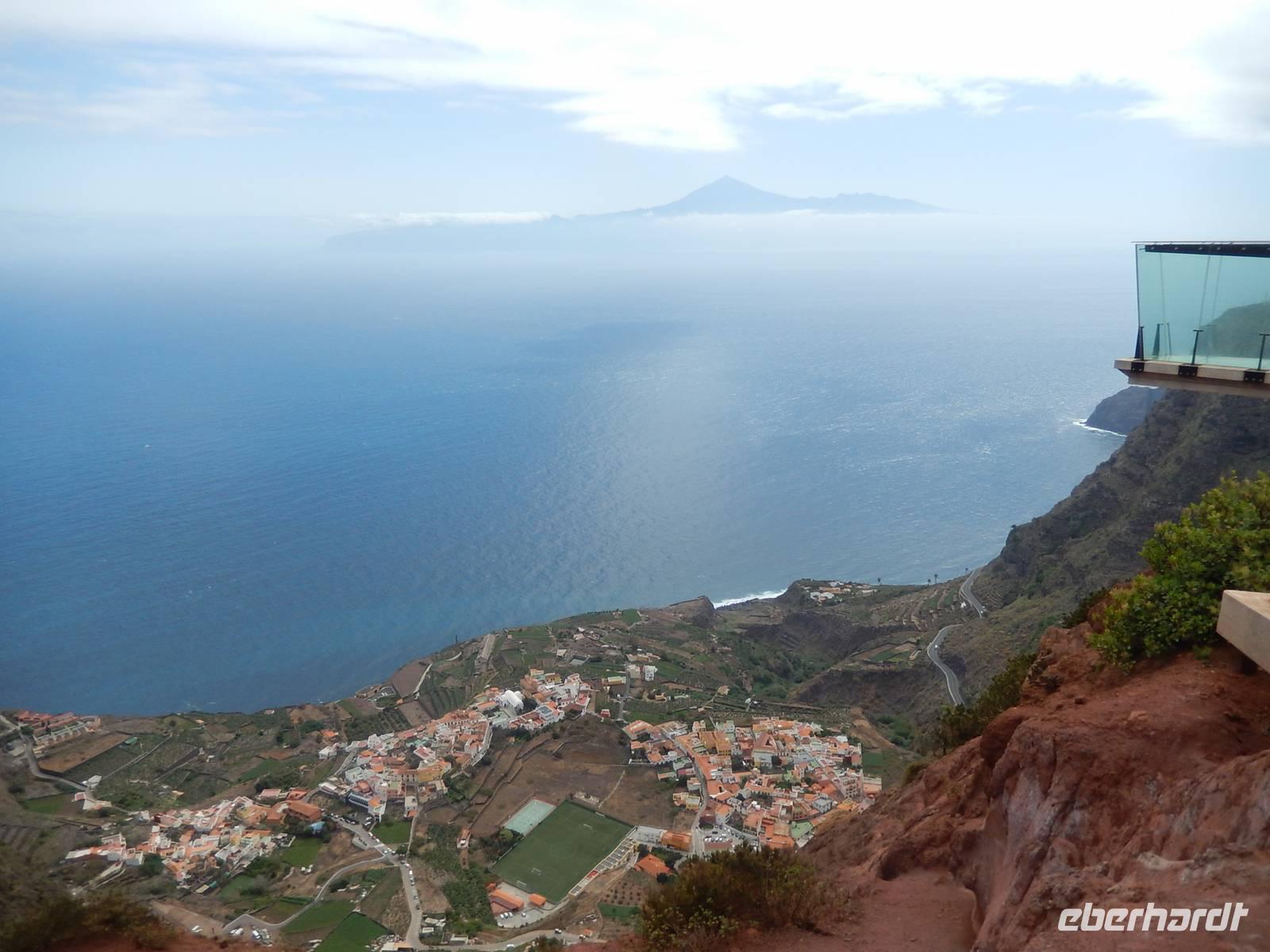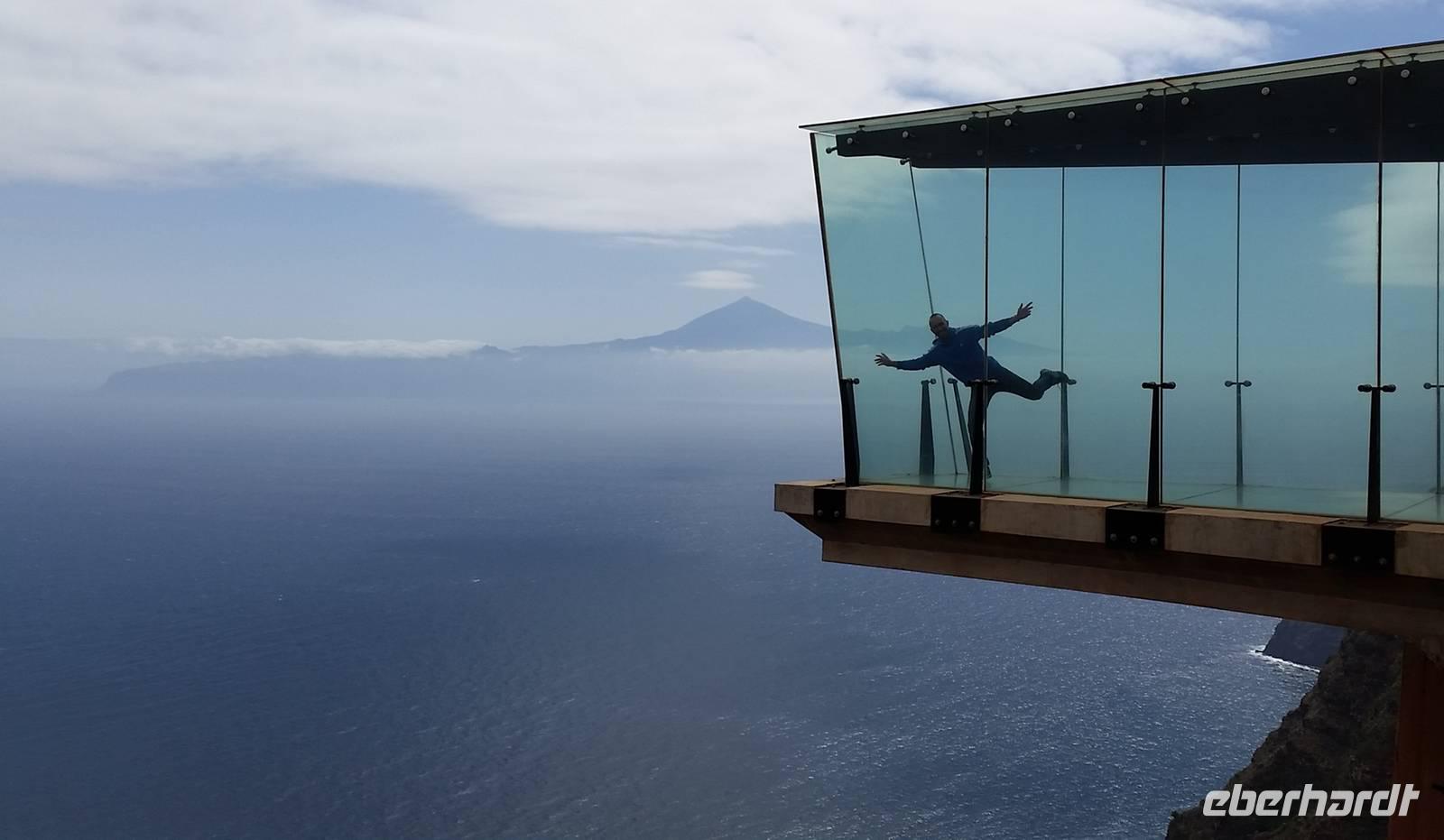 Wir fuhren durch den Nationalpark Garajonay mit seinem einzigartigen, immergrünen Lorbeerwald. Zweifelsohne ist dieser Park eines der beeindruckendsten Sehenswürdigkeiten La Gomeras. Das Wahrzeichen des UNESCO-Weltnaturerbes sind die Lorbeerbäume mit bemoosten Stämmen und bizarr von den Ästen flatternden Bartflechten. Hier bei Laguna Grande machten wir einen 40-minütigen Spaziergang. Heute gab es Wolken und Nebel und dies war genau richtig, um diesen Lorbeerwald zu erkunden. Der Busfahrer brachte uns als Überraschung zu dem neuen Aussichtspunkt Abrante im Norden der Inseln. Es war eine Art Skywalker wie auf dem Grand Canyon in Colorado. Auf einer Glasscheibe konnte man über eine Schlucht unter seinen Füssen die Höhe und Teneriffa mit Teide im Hintergrund bestaunen. Unglaublich schön. Später im Besucherzentrum schauten wir uns einen sehr guten, ca. 20-minütigen Film auf deutsch an und besichtigten das Museum sowie den Botanischen Garten.