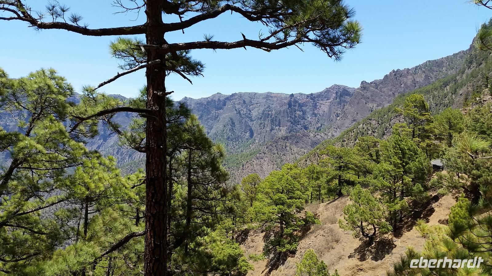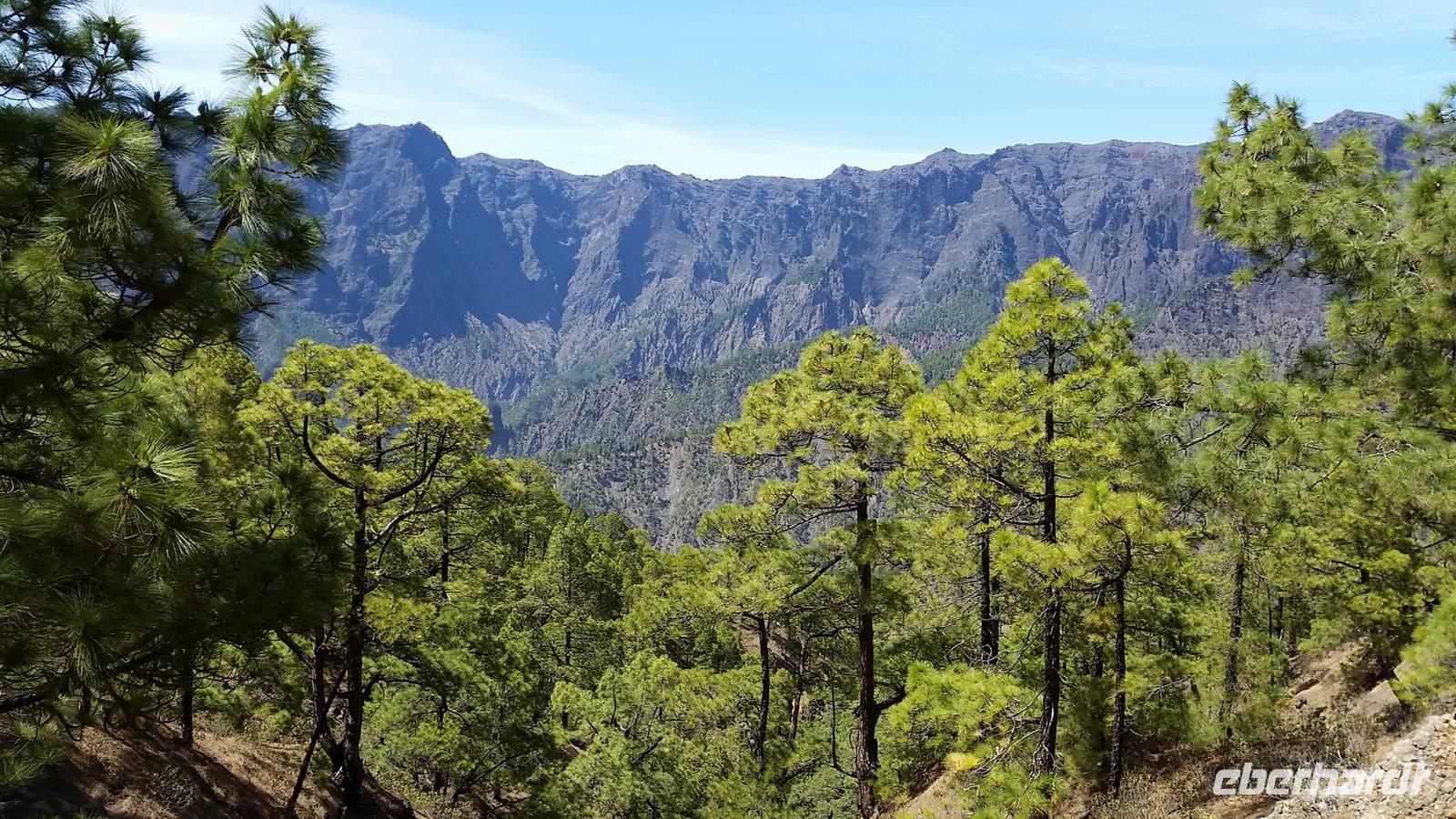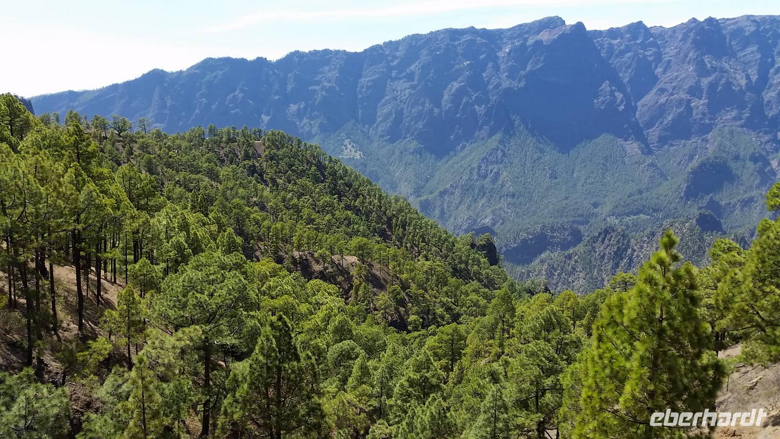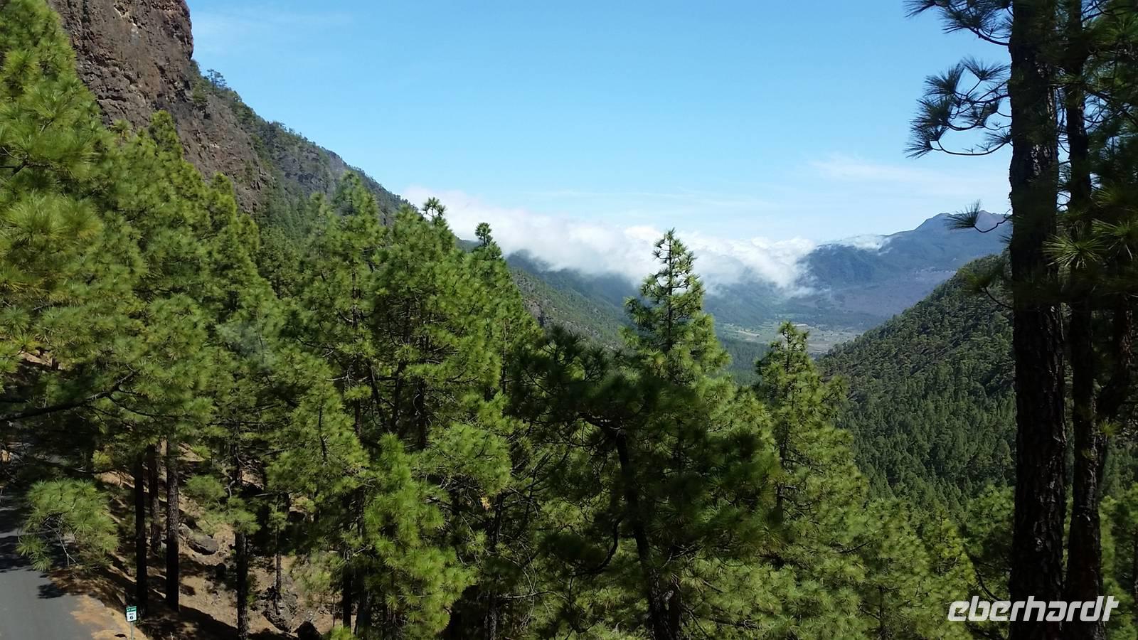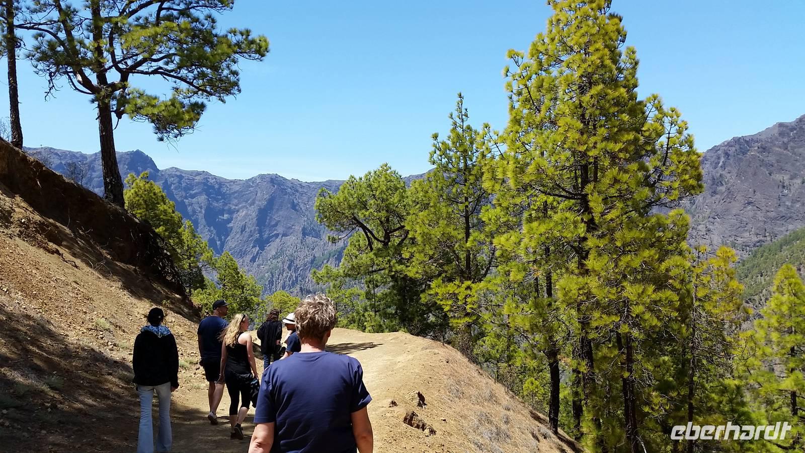 Wir fuhren später zum Nationalpark Caldera de Taburiente, der nicht im Programm vorgesehen war, aber uns von Detlef und dem Busfahrer sehr empfohlen wurde! Hier machten wir eine wunderschöne kurze Wanderung bis zum Aussichtspunkt Mirador La Cumbrecita. Diesmal gab es keine Wolken und wir konnten den Caldera (Kessel) von Taburiente in seiner vollen Schönheit bestaunen. Heute messen der Krater und das Amphitheater etwa neun Kilometer im Durchmesser und haben einen Umfang von etwa 28 Kilometern. Den höchsten Punkt erreicht der Kraterrand von 2.426 Metern im Norden mit dem gleichzeitig höchsten Punkt La Palmas, dem Roque de los Muchachos, den wir morgen bei tollem Wetter besichtigen werden.