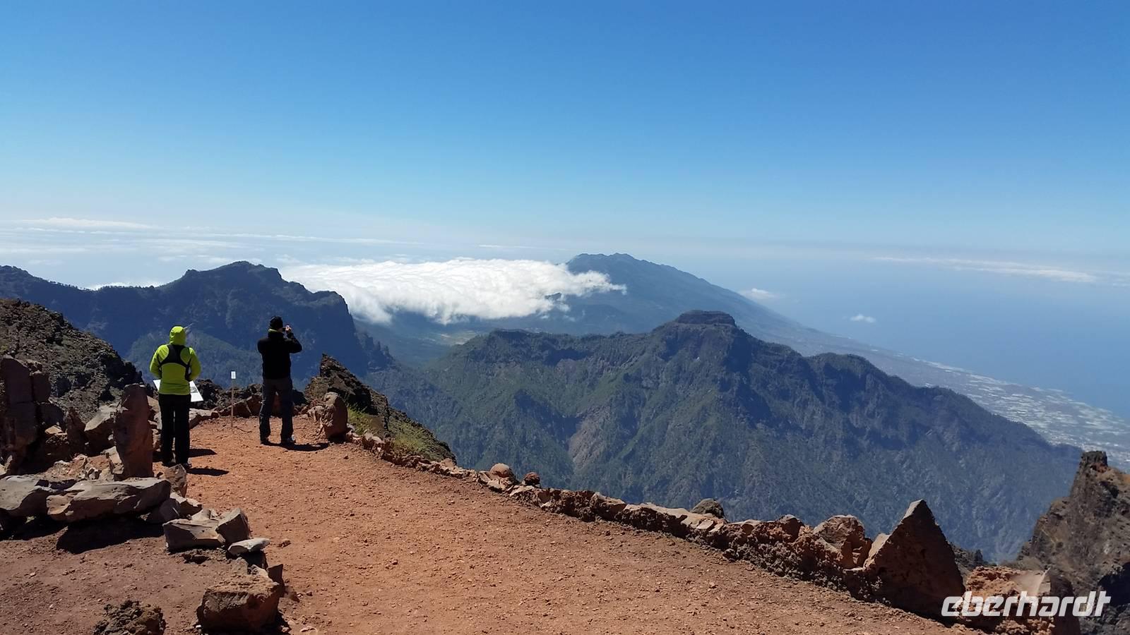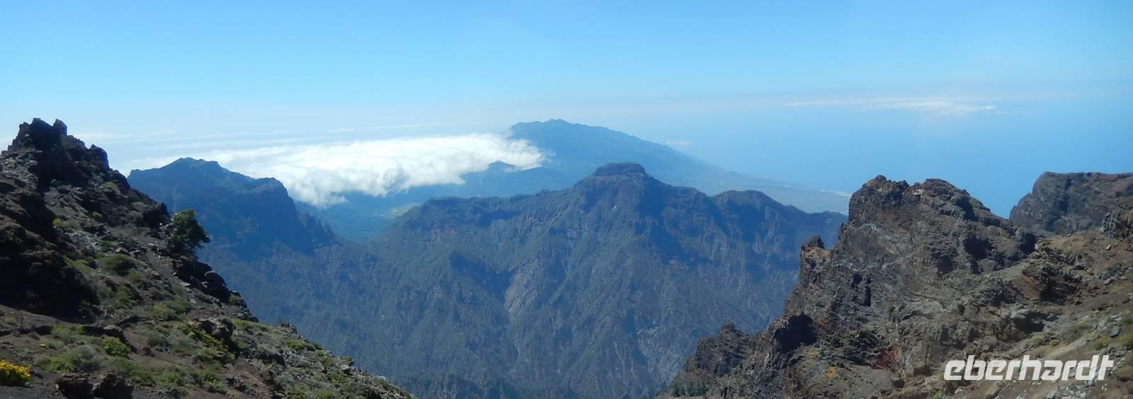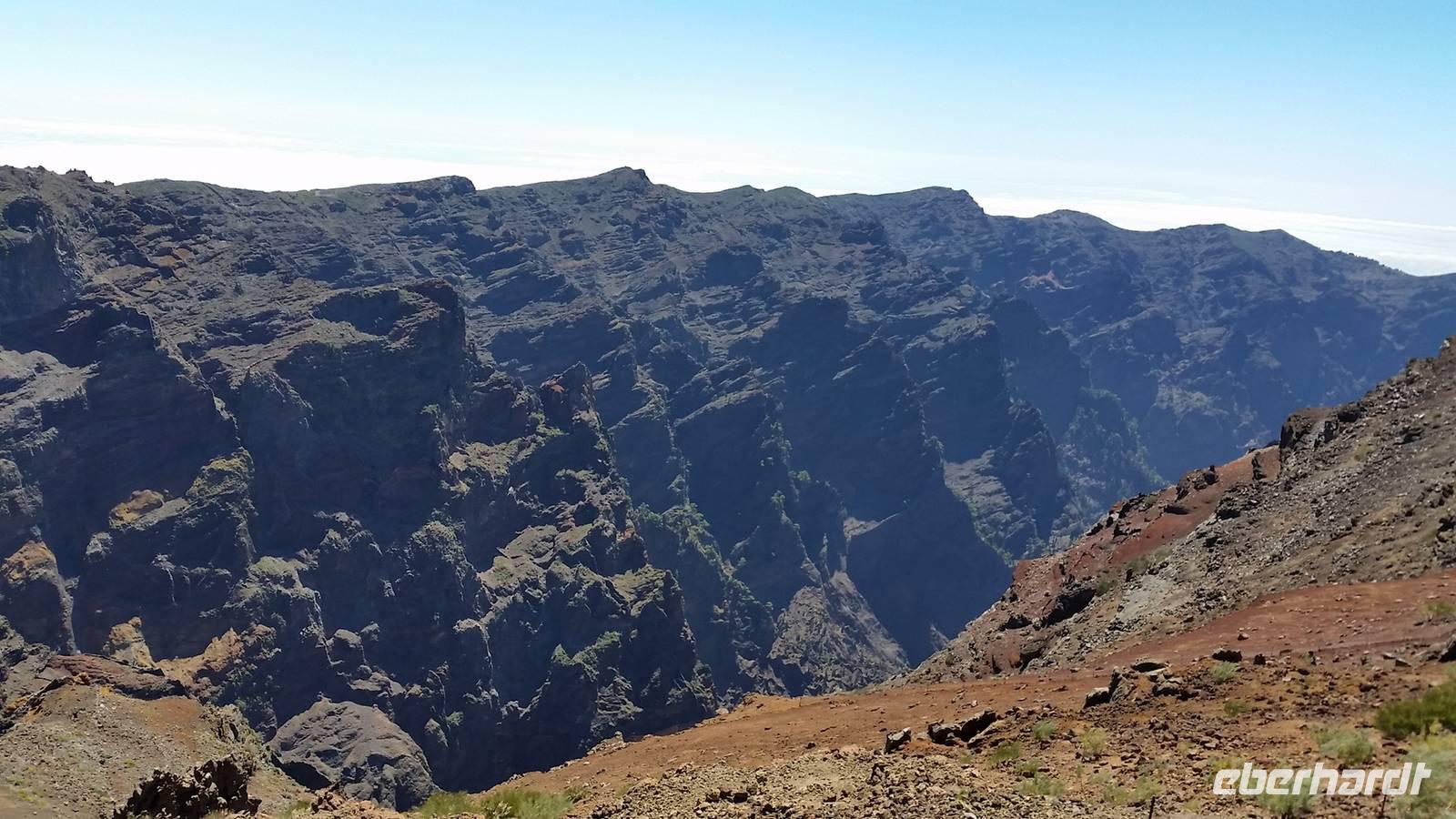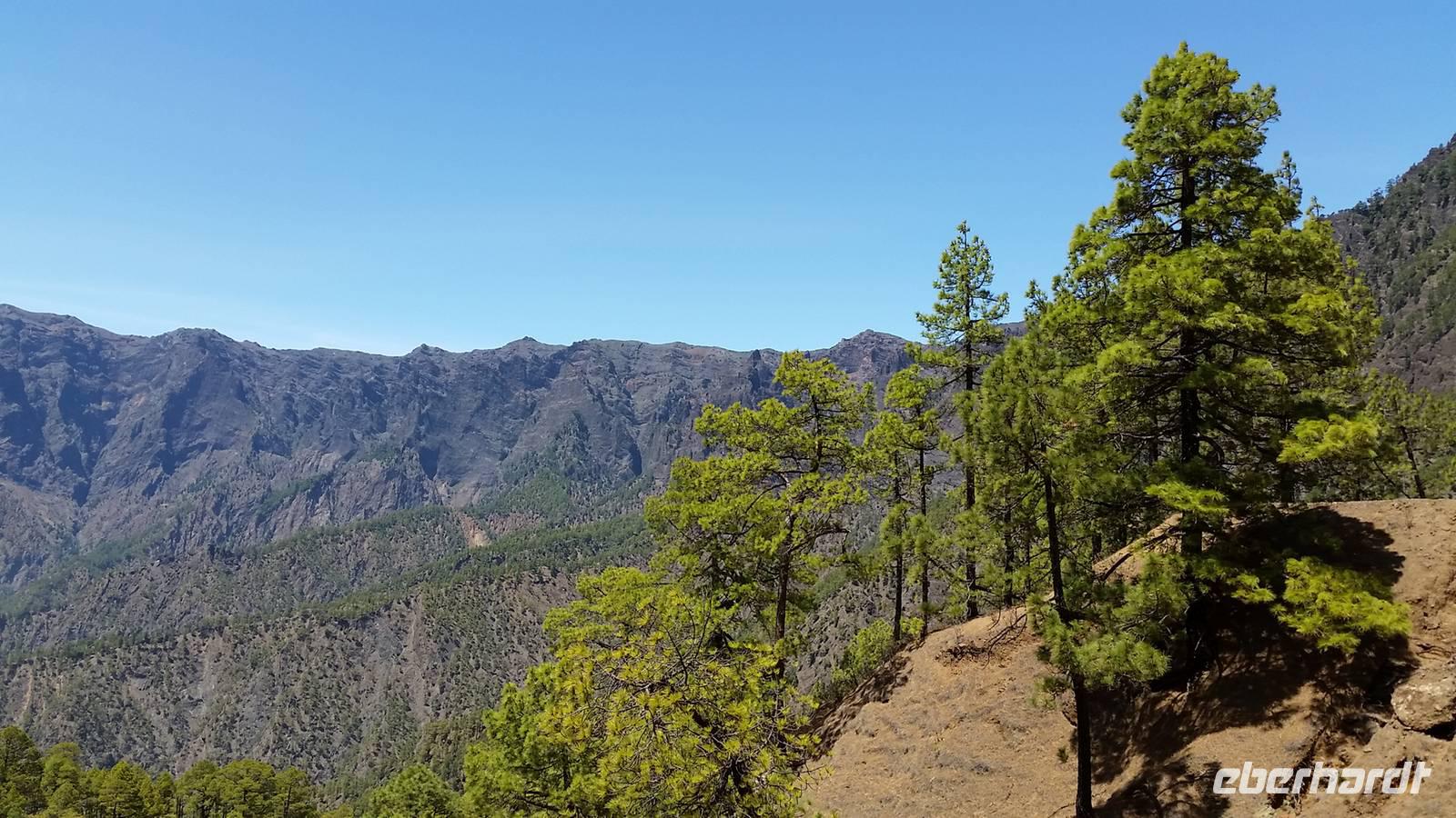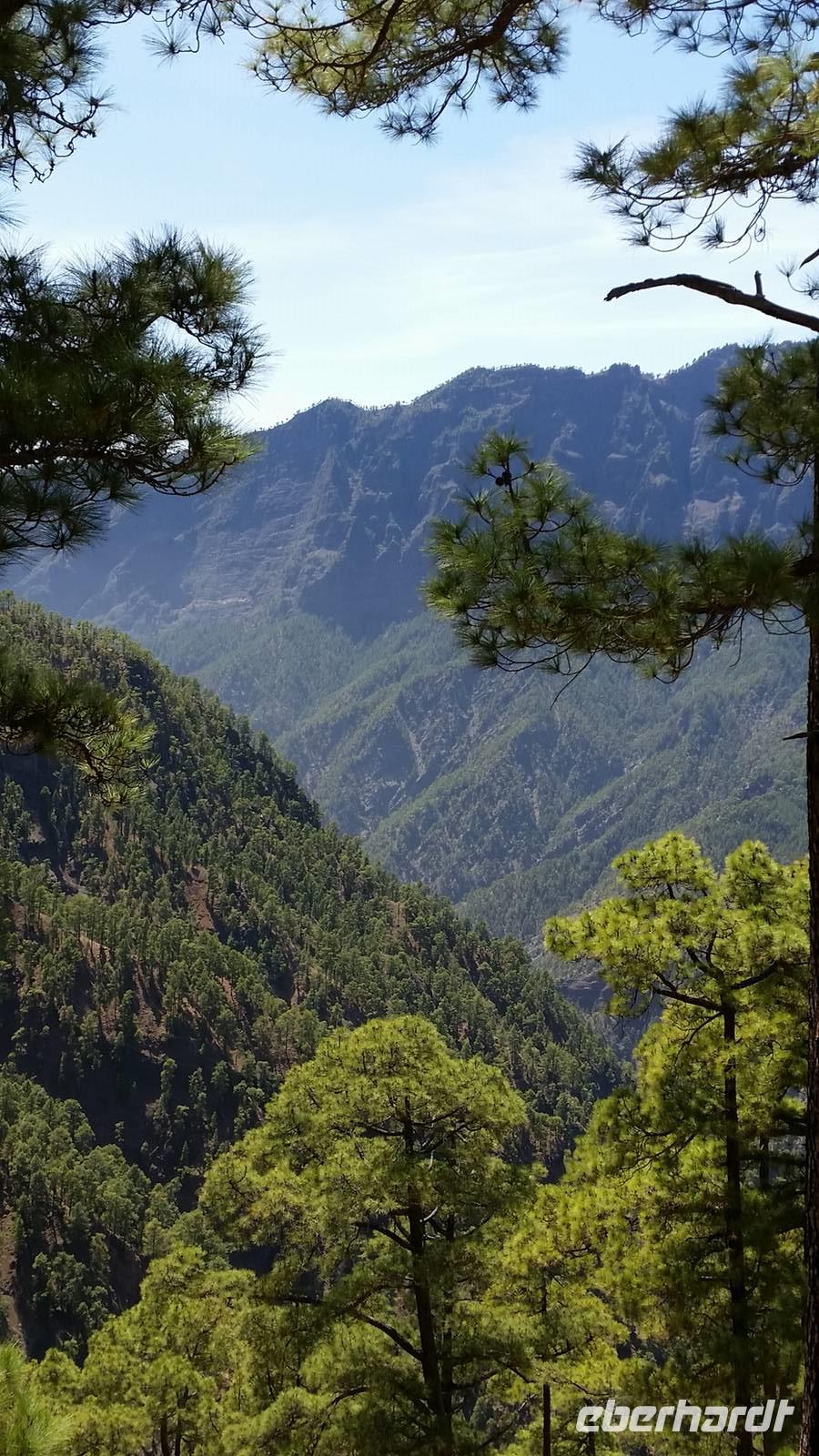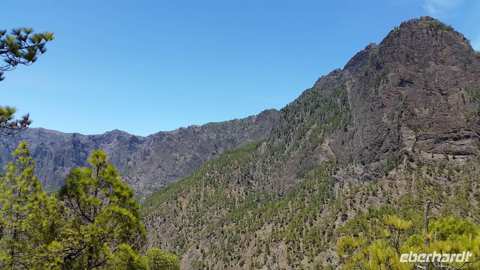 Wir fuhren später zum Nationalpark Caldera de Taburiente, der nicht im Programm vorgesehen war, aber uns von Detlef und dem Busfahrer sehr empfohlen wurde! Hier machten wir eine wunderschöne kurze Wanderung bis zum Aussichtspunkt Mirador La Cumbrecita. Diesmal gab es keine Wolken und wir konnten den Caldera (Kessel) von Taburiente in seiner vollen Schönheit bestaunen. Heute messen der Krater und das Amphitheater etwa neun Kilometer im Durchmesser und haben einen Umfang von etwa 28 Kilometern. Den höchsten Punkt erreicht der Kraterrand von 2.426 Metern im Norden mit dem gleichzeitig höchsten Punkt La Palmas, dem Roque de los Muchachos, den wir morgen bei tollem Wetter besichtigen werden.