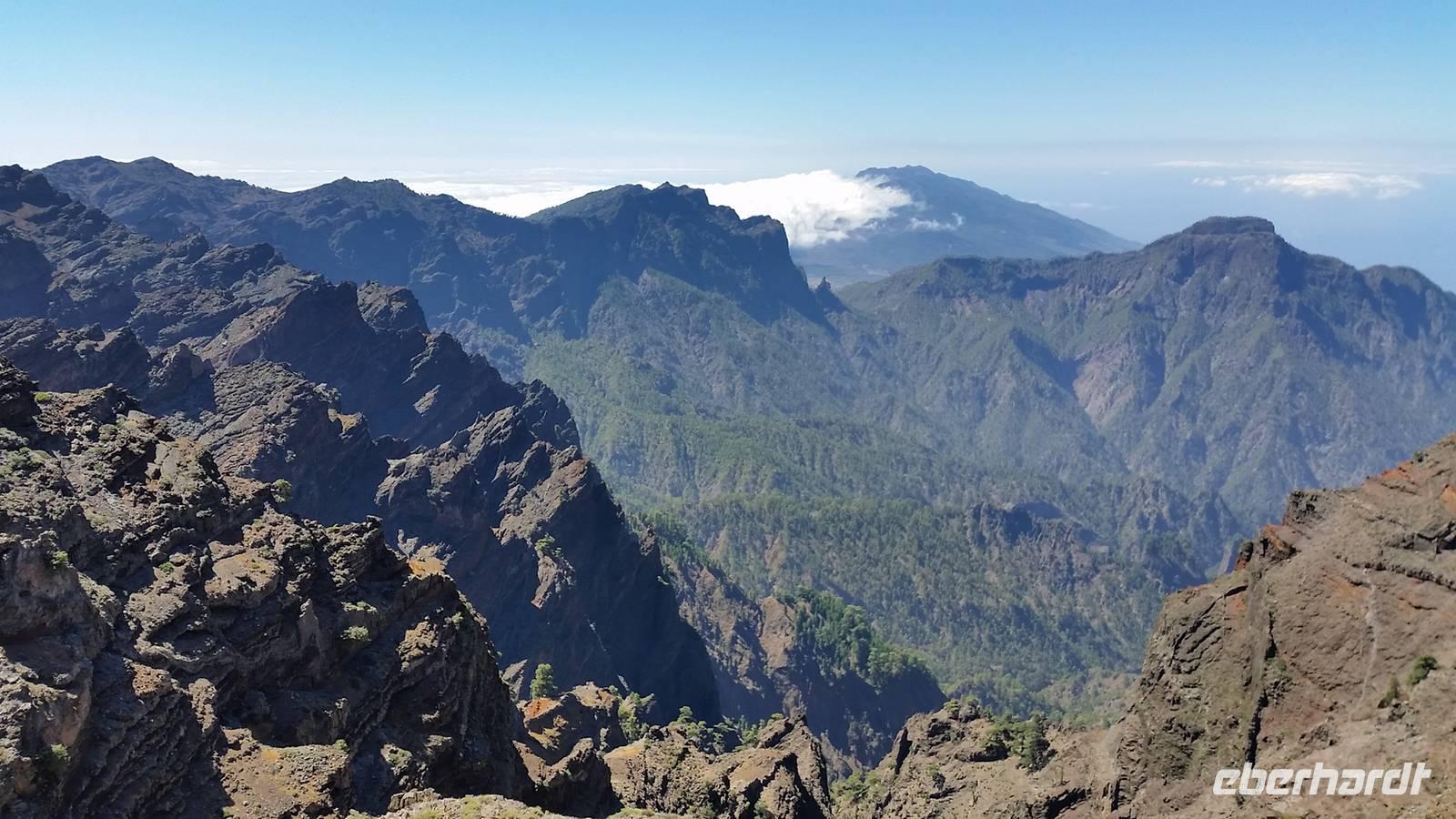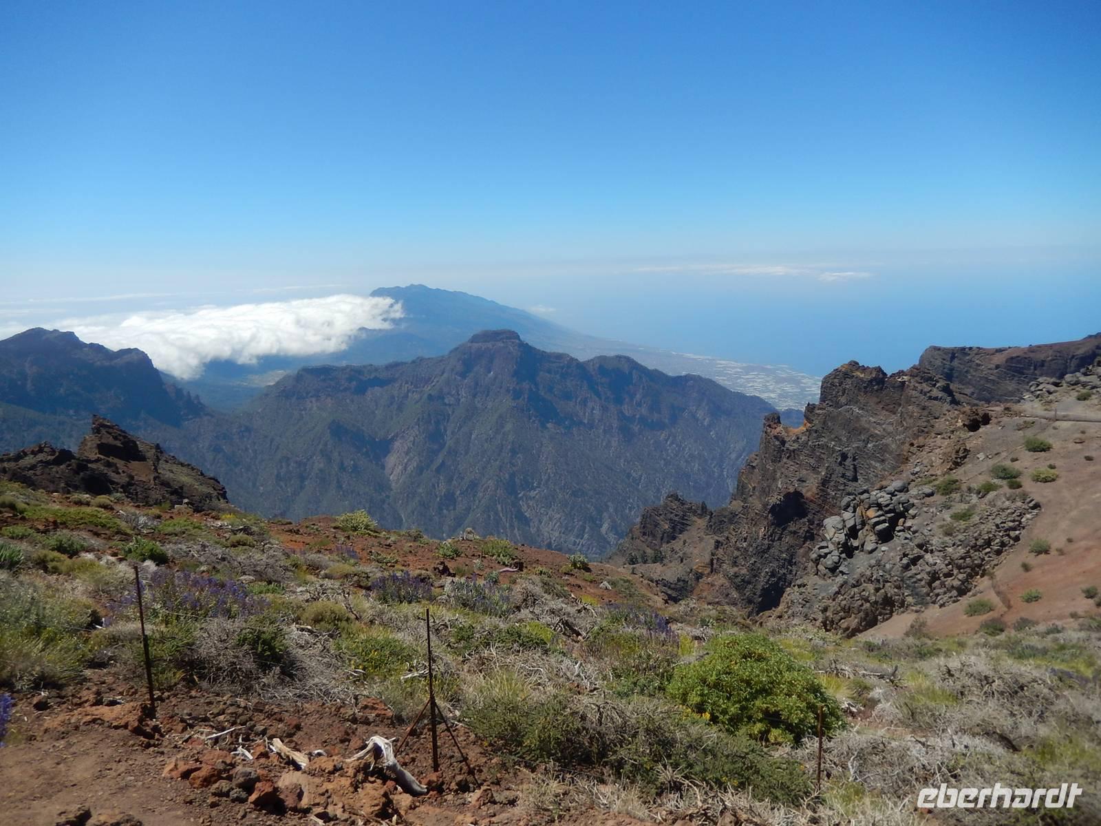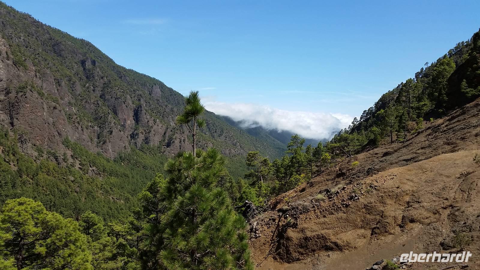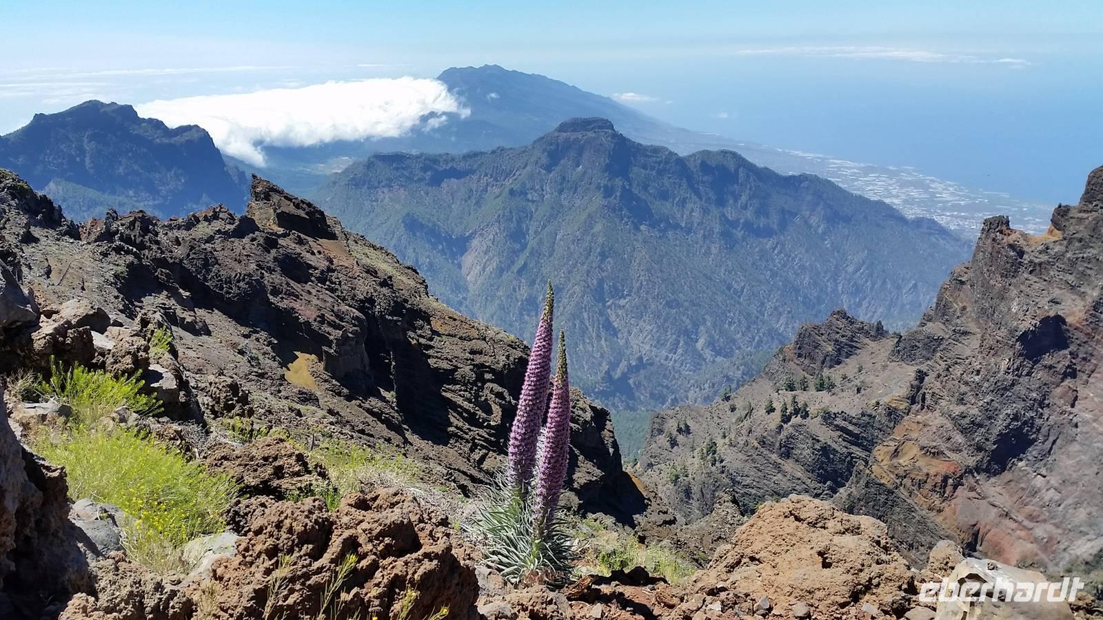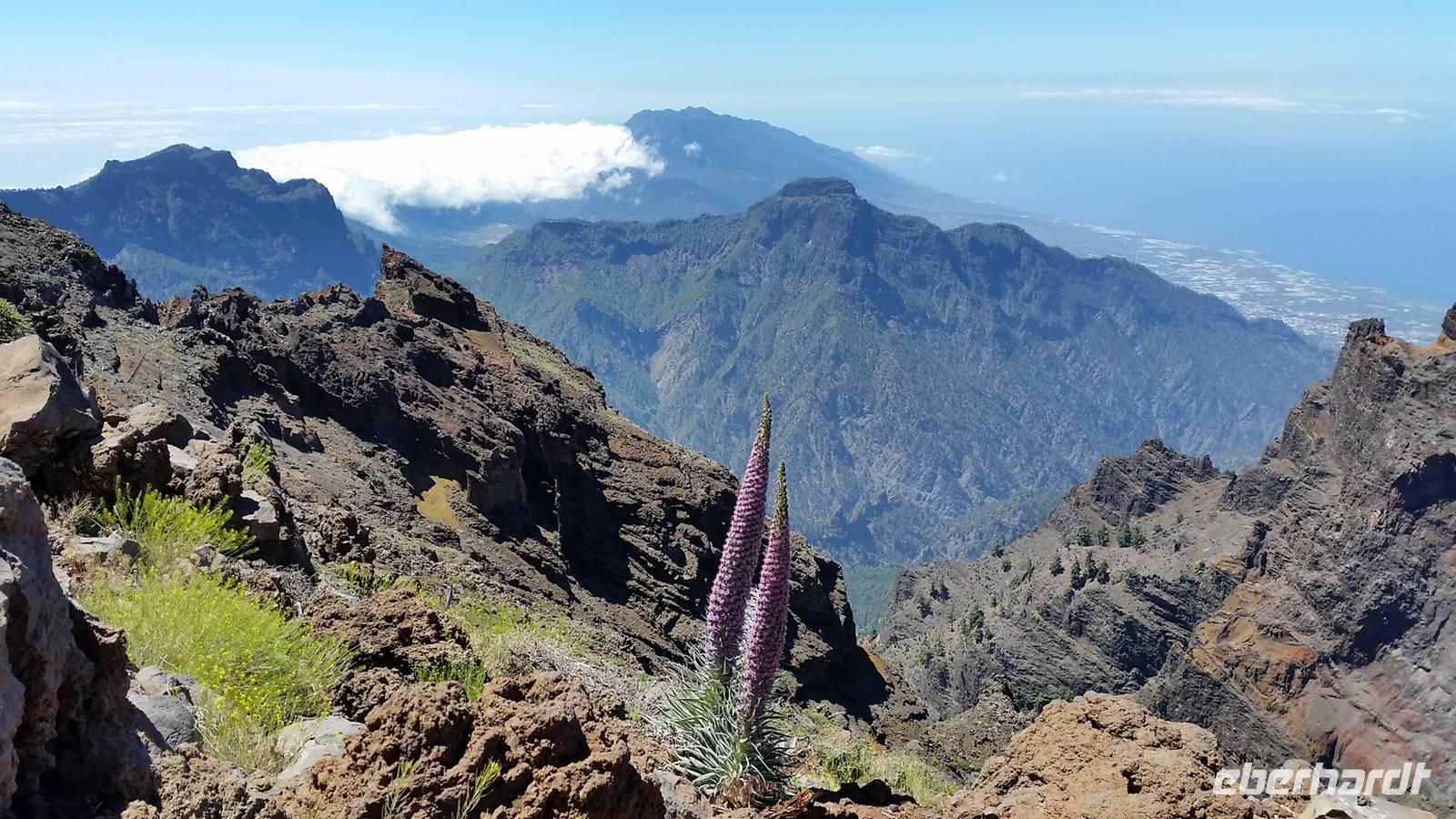 Wir fuhren später zum Nationalpark Caldera de Taburiente, der nicht im Programm vorgesehen war, aber uns von Detlef und dem Busfahrer sehr empfohlen wurde! Hier machten wir eine wunderschöne kurze Wanderung bis zum Aussichtspunkt Mirador La Cumbrecita. Diesmal gab es keine Wolken und wir konnten den Caldera (Kessel) von Taburiente in seiner vollen Schönheit bestaunen. Heute messen der Krater und das Amphitheater etwa neun Kilometer im Durchmesser und haben einen Umfang von etwa 28 Kilometern. Den höchsten Punkt erreicht der Kraterrand von 2.426 Metern im Norden mit dem gleichzeitig höchsten Punkt La Palmas, dem Roque de los Muchachos, den wir morgen bei tollem Wetter besichtigen werden.
