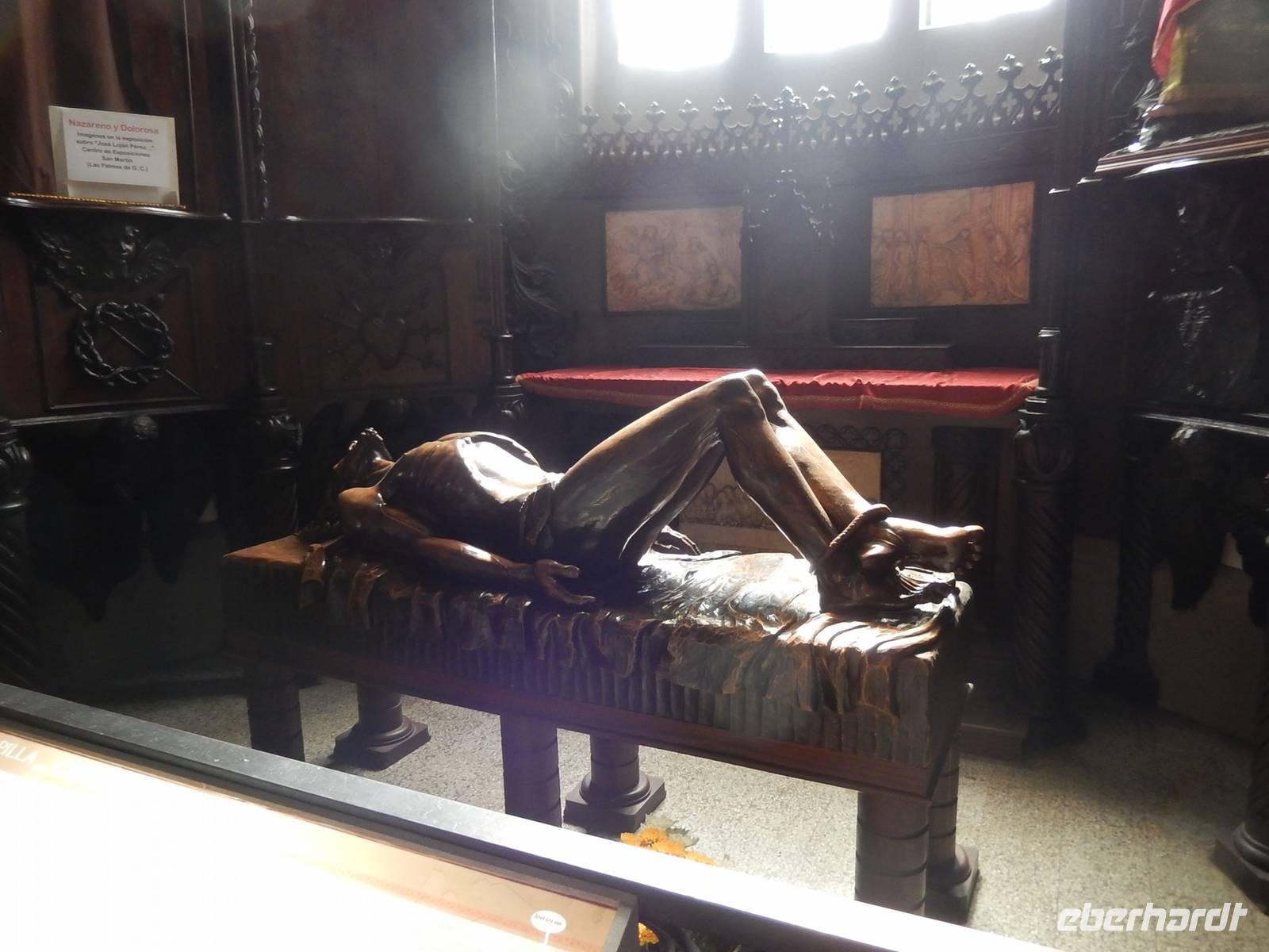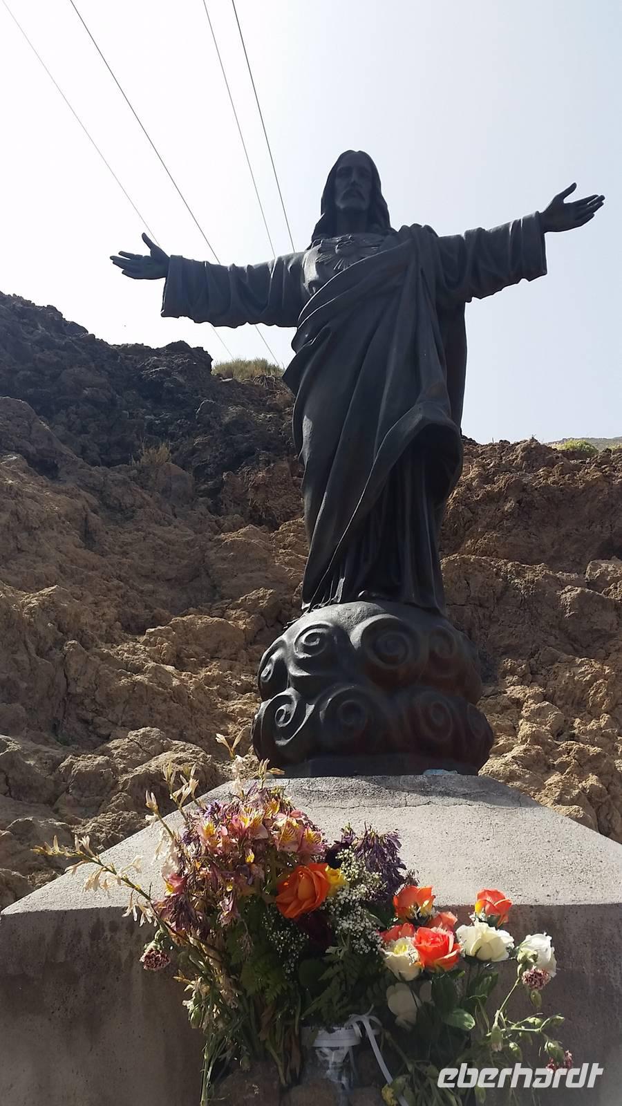Nach einer Fahrt auf der kanarischen Autobahn gelangten wir zu unserem ersten Stop und besichtigten den bedeutendsten katholischen Wallfahrtsort der Kanaren, Candelaria, in dessen Basilika die Schutzpatronin der Kanarischen Inseln, Virgen de Candelaria, zu finden ist. Uns wurde erklärt, dass eine Figur der „Madonna" 100 Jahre vor Ankunft der Spanier von zwei Guanchen (Ureinwohner) am Strand gefunden worden sein soll. Hier in der Kirche sang Benjamin uns allen ein kirchliches Lied, welches er aus seiner Chorzeit noch kannte, vor. Die Akkustik war sehr gut.