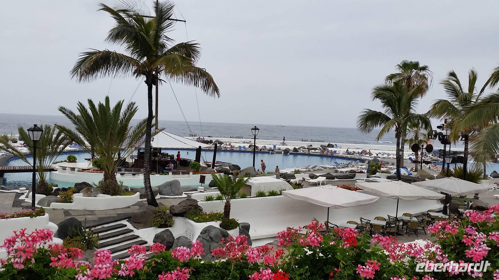 Am frühen Nachmittag landeten wir am „Königin Sofia" Teneriffa Süd Flughafen wo es Kalima (heisses Wetter) gab. Wilkommen im Sommer! Die Gäste aus Berlin, Wien und Frankfurt waren schon gelandet und wir warteten noch ein kleines bisschen auf die 2 Gäste aus Nürnberg. Benjamin brachte Wasser für alle im Bus, damit die 20 Minuten Wartezeit einfacher gingen. Mit unserem Gepäck fuhren wir zum Hotel, wo wir unser ein Abendessen bekamen. Aber vorher organisierte das Hotel für uns einen Begrüssungscocktail am Pool wo wir uns alle zum ersten Mal vorstellten und sagten, wie wir heissen, woher wir kommen oder warum wir diese Reise machen wollten. Das Buffet-Abendessen war Klasse und einige machten einen Spaziergang an der Promenade entlang. Andere, die schon müde waren, gingen ins Bett und wir freuten uns alle sehr auf die folgenden Tage.