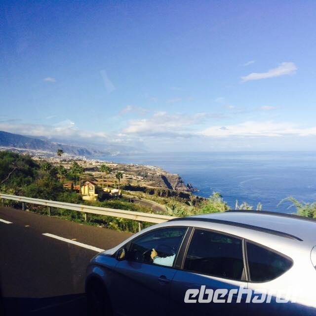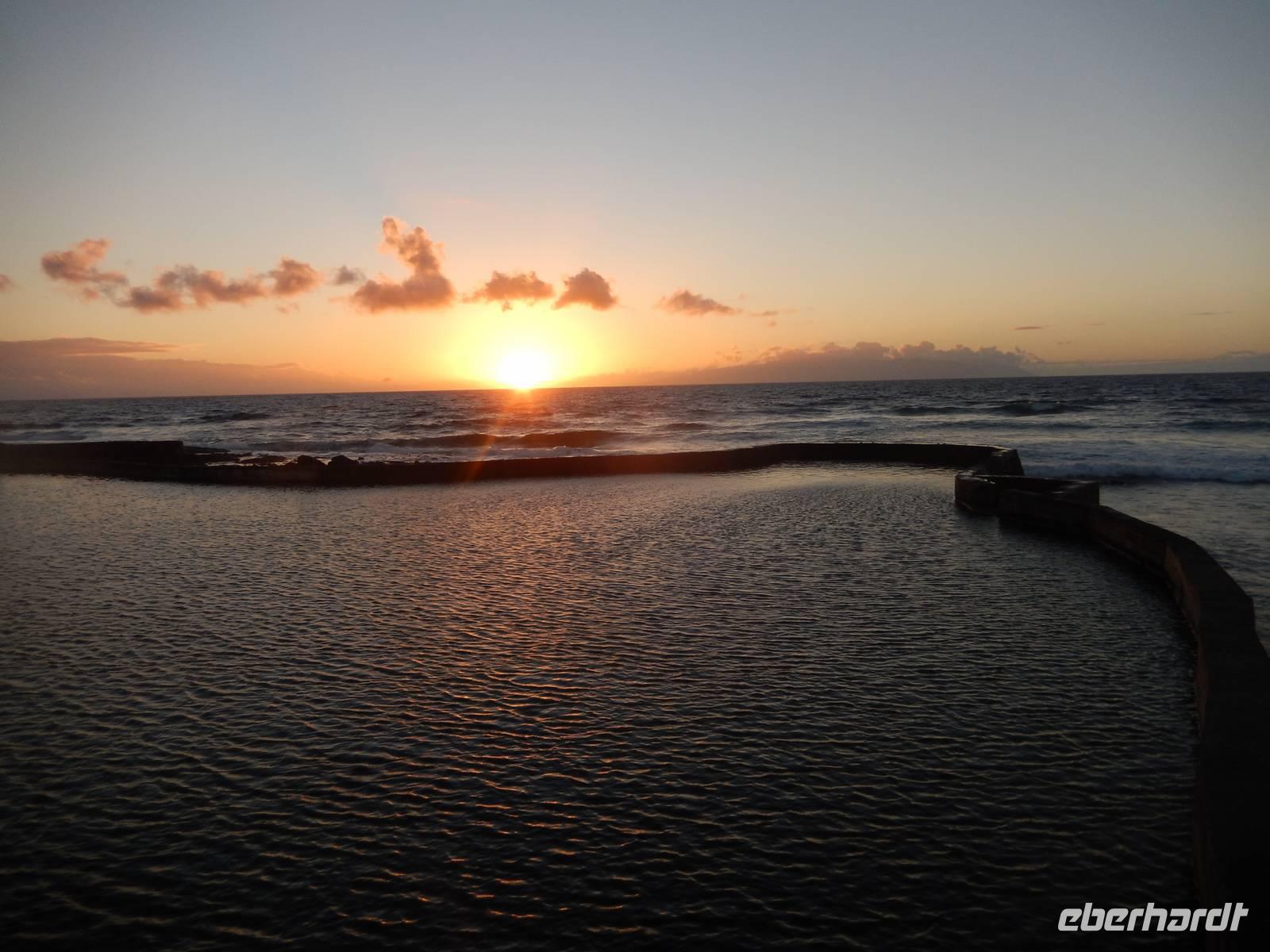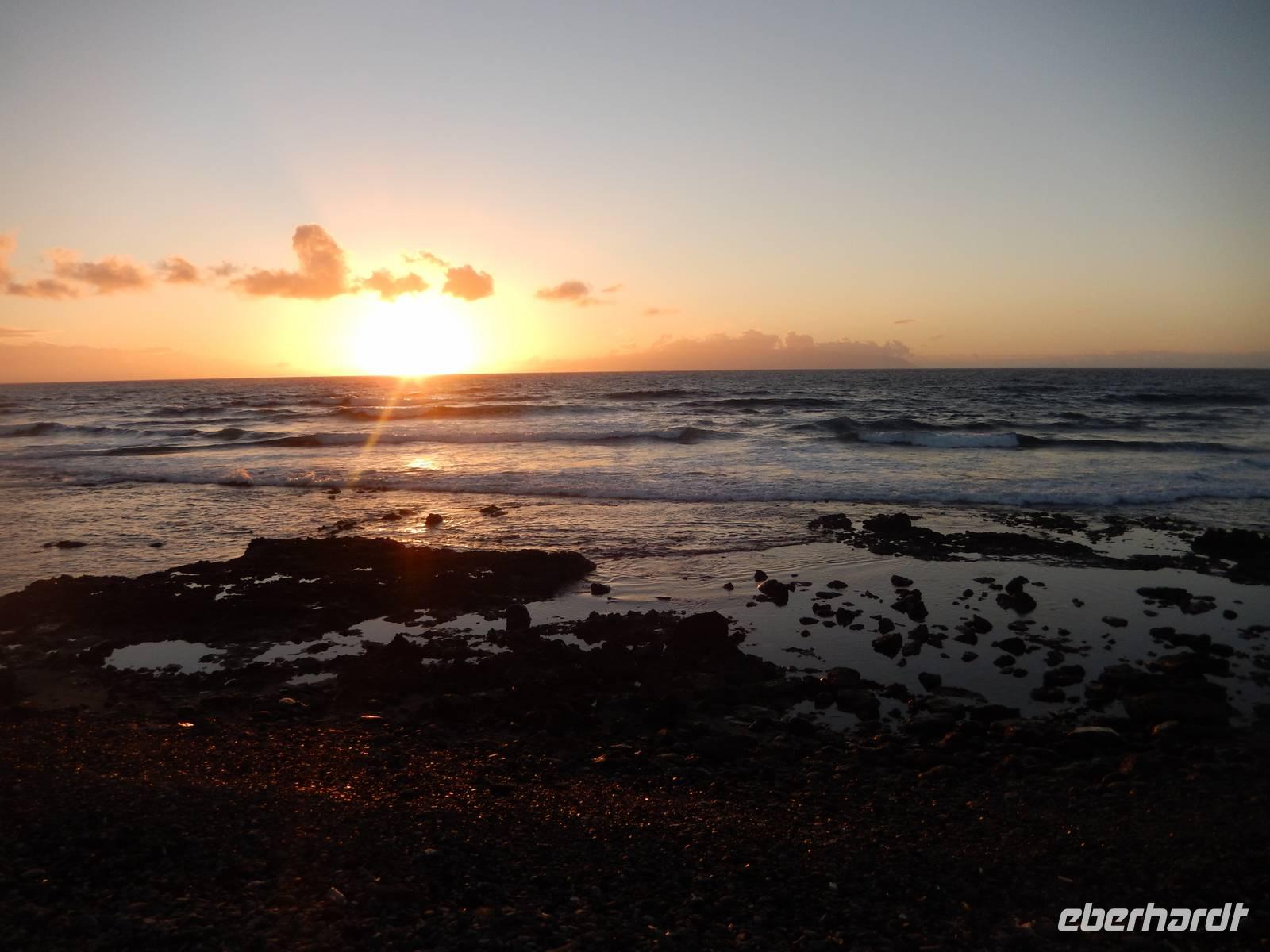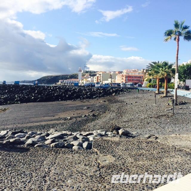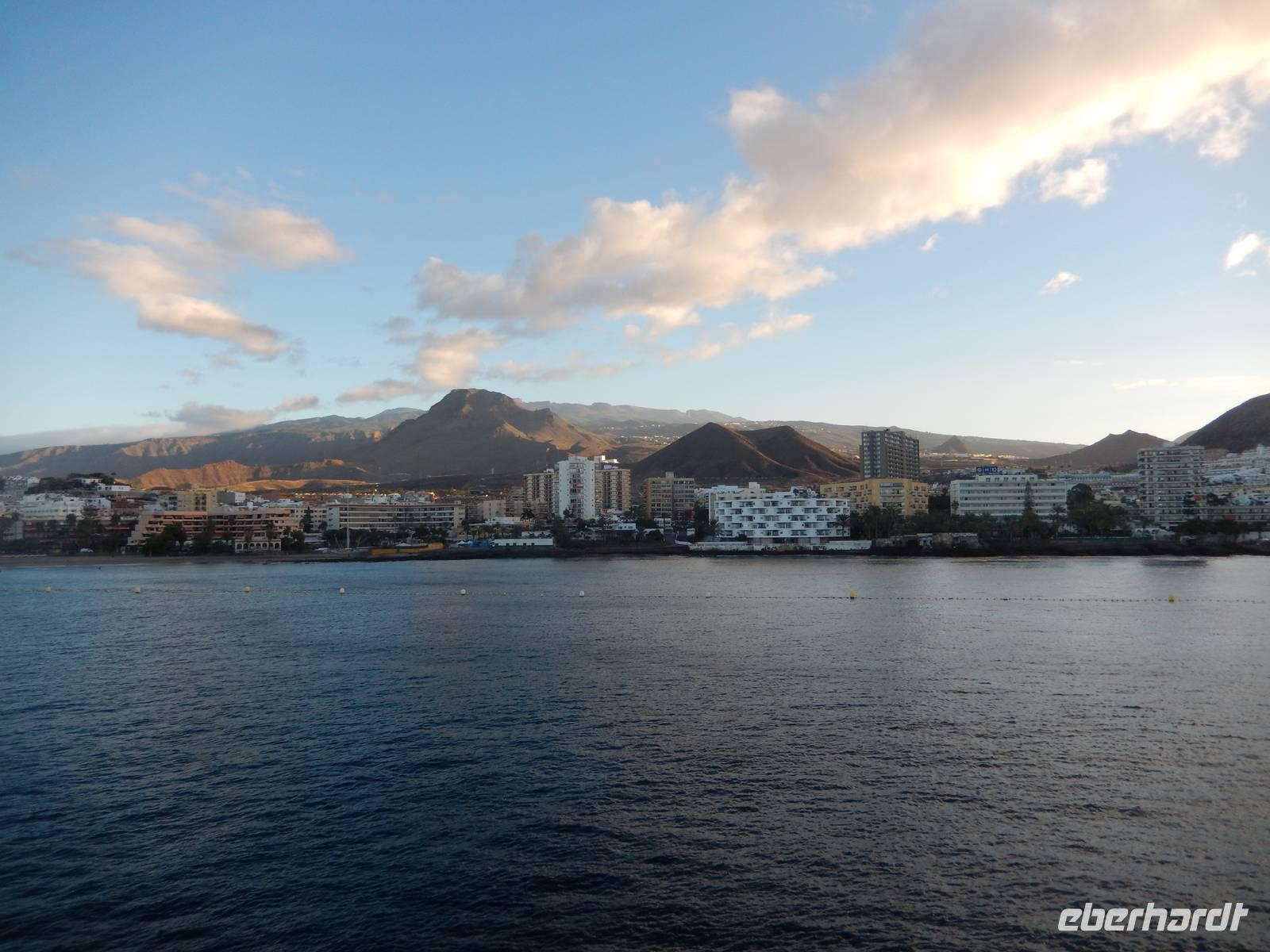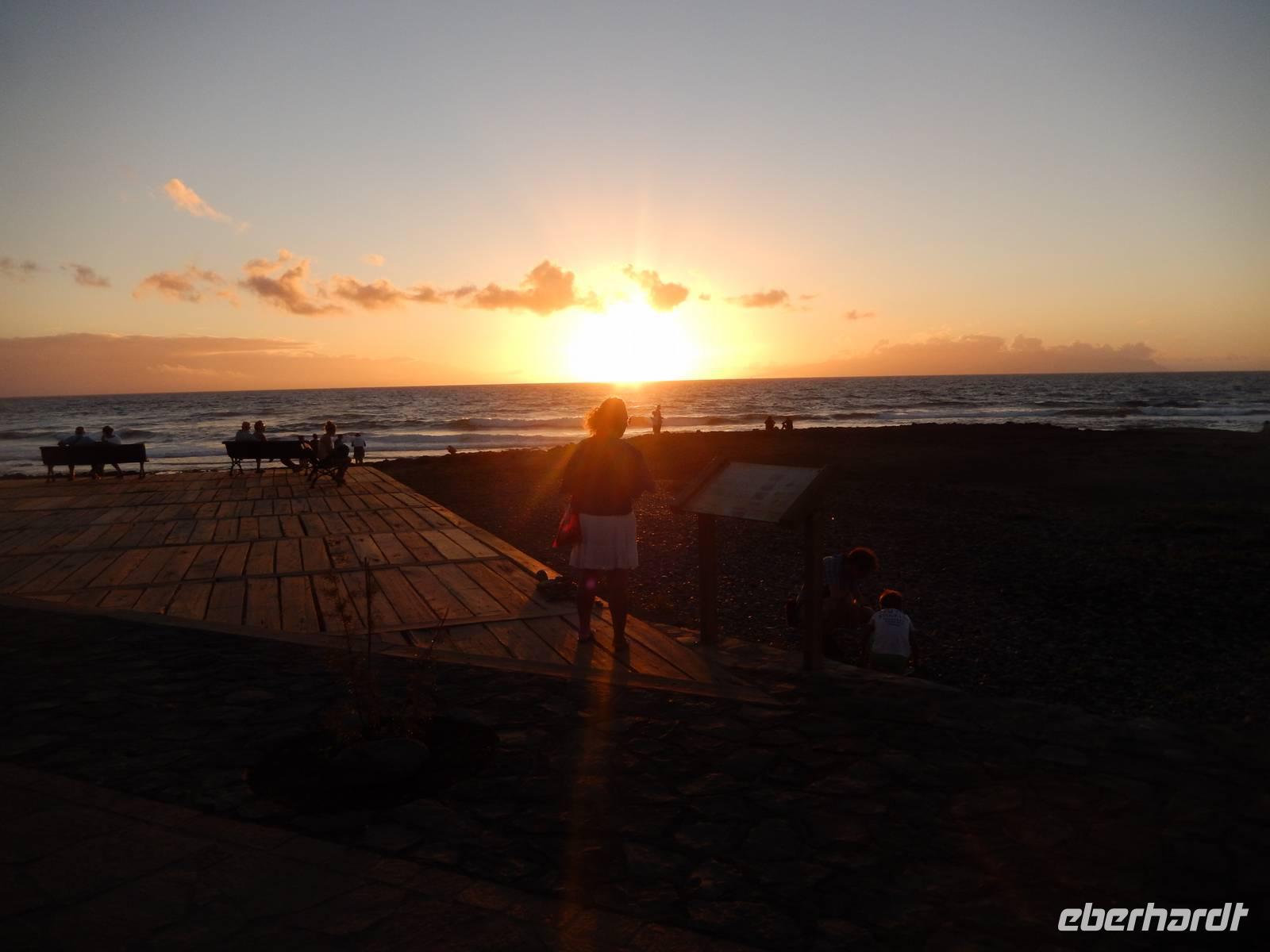 Nach einem leckeren und reichhaltigen Frühstück lernen wir unsere Reiseleiterin Anne kennen, welche uns in den nächsten Tagen die größte kanarische Insel Teneriffa zeigen wird. Wir fahren durch Las Americas und begeben uns auf der Autobahn gen Hauptstadt Santa Cruz. Der bewölkte Himmel klärt in der halben Stunde gen Norden immer weiter auf. Mit dem Atlantik zur Rechten und der Bergkette der Canadas del Teide zur Linken, fahren wir der Sonne entgegen. Wir haben das Glück freie Sicht auf den Teide zu haben und bekommen sogar die Umrisse von Gran Canaria zu sehen. Während unserer Panoramafahrt erklärt uns Anne die Geologie, Wirtschaft und das Klima der Insel. So erfahren wir, dass alle kanarischen Insel eigentlich riesige Unterwasservulkane sind, welche aus der Meeresoberfläche herausragen und das alles unter unseren Füßen verfestigte Lava ist. Desweiteren lernen wir, dass der Tourismus die Hauptbeschäftigungs- und Einkommensquelle der Insel ist. Dann erreichen wir schon den Wallfahrtsort Candelaria. Hier spazieren wir an der Promenade entlang, sehen die Statuen der Guanchenkönige und besichtigen die Kathedrale der Senora de Candelaria. Bei dem tollen Wetter probieren wir auch noch die spanische Frühstücksspezialität „Churros con Chocolate": Fettgebäck, welches in Schokolade getunkt wird. Ungesund aber soo lecker! :) Weiter geht es und wir kreuzen auf der Autobahn Santa Cruz und fahren an der Weltkulturerbestadt La Laguna vorbei. Schon sehen wir wieder das Meer vor uns und bemerken das wir schon auf der Nordseite der Insel sind. Auf der Fahrtstrecke von circa einer Stunde bekommen wir schon ein gutes Bild über die schnellen Wetter- und Vegetationsveränderungen auf Teneriffa, dem Minikontinenten. Auf dem Weg nach Puerto de la Cruz fahren wir an einer steil herabfallenden Küste entlang, vorbei an Terrassenfeldern, hübschen Kolonialhäusern und vielen Palmen. Den Teide sehen wir in seiner ganzen Pracht - überhaupt nicht selbstverständlich, denn hier im Norden ist er normalerweise wolkenverhangen, wenn überhaupt zu sehen. In Puerto de la Cruz haben wir etwas Freizeit und unternehmen einen Spaziergang oder probieren den empfohlenen Likörkaffee Barraquito. Dieser ist eine kanarische Spezialität, bestehend aus Kaffee, Süßmilch, Zimt, Orangenlikör und Zitronenschale. Puerto de la Cruz ist der zweite große Touristenort auf Teneriffa, gleich hinter Las Americas und Los Cristianos. Zwischen riesigen Hotelklotzen aus den 70ger Jahren entdecken wir auch schöne alte Fleckchen mit Kirchen und Herrenhäusern aus der Kolonialzeit. Auf dem Weiterweg gen Westen erklärt uns Anne das Geheimnis der kanarischen Dattelpalme und die kanarische Küche näher. Typische Spezialitäten der Insel sind die Papas Arrugadas (Runzelkartoffeln, in Meerwasser zubereitet), die grünen und roten Mojosoßen, Ziegenkäse, Gofio und der gute Barsch. Unser nächster Besichtigungspunkt, der Drachenbaum vom Icod de los Vinos, ist schon in Sicht. Dieser soll angeblich 1000 Jahre alt sein. Das lässt sich jedoch schwer bestimmen, meint Anne, denn Drachenbäume haben keine Jahresringe, sonder können nur anhand ihrer „Arme" ungefährt altersmäßig bestimmt werden. Nachdem wir den Drachenbaum gesehen haben, kehren wir in ein landestypisches Restaurant ein und probieren die Köstlichkeiten des Landes. Mit dicken Bäuchen fahren wir die Küste weiter und sehen im Meer vor uns einen riesigen Felsen. Dies ist der Vulkanfelsen von Garachico, der Handelsstadt, welche 1706 komplett nach einem Vulkanausbruch von der Lava verschluckt wurde. Diese Stadt sehen wir uns heute von oben an - ein traumhafter Ausblick! Wir haben wirklich fantastisches Wetter erwischt und haben alle Aussichtspunkte toll sehen können. Durch die Terrassenfelder von Erjos schlängern wir uns die Serpentinen des Tenogebirges entlang und fahren von 1000 Metern herunter an die Küste. Hier halten wir an den 600 Meter steil abfallenden Felsen von Los Gigantes. Und dann ist für uns noch eine kleine Überraschung von Eberhardt Travel an der Playa Arena vorbereitet: Sangria, kleine Tapas mit Kroketten, frittierte Sardelen und Mini-Tintenfische. Wir genießen die Sonne und nutzen die Gelegenheit um kurz ins Wasser zu springen und uns abzukühlen. Anschließend fahren wir etwas müde zum Hotel, denn es war ein schöner aber auch anstrengender Tag gewesen. Die komplette Insel haben wir einmal umrundet! Vor dem gemeinsamen Abendessen trifft sich noch ein Teil der Gruppe zu einem Abendstrandspaziergang mit Blick auf den sich rot färbenden Himmel.