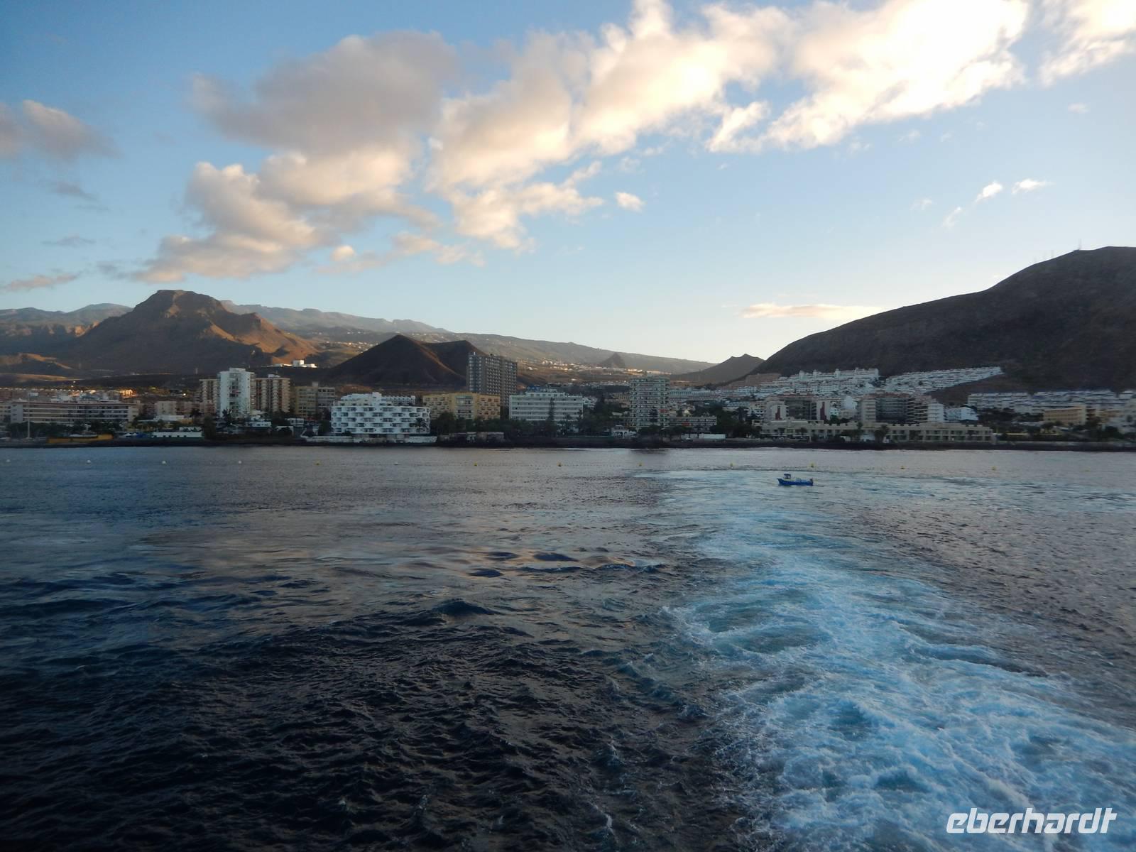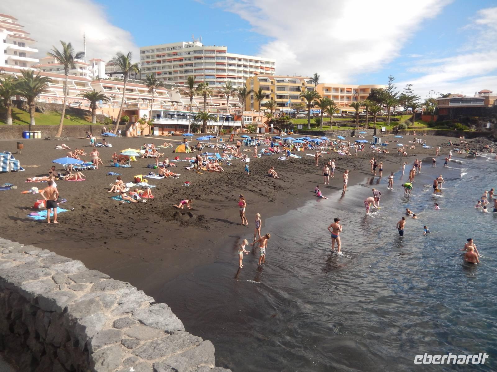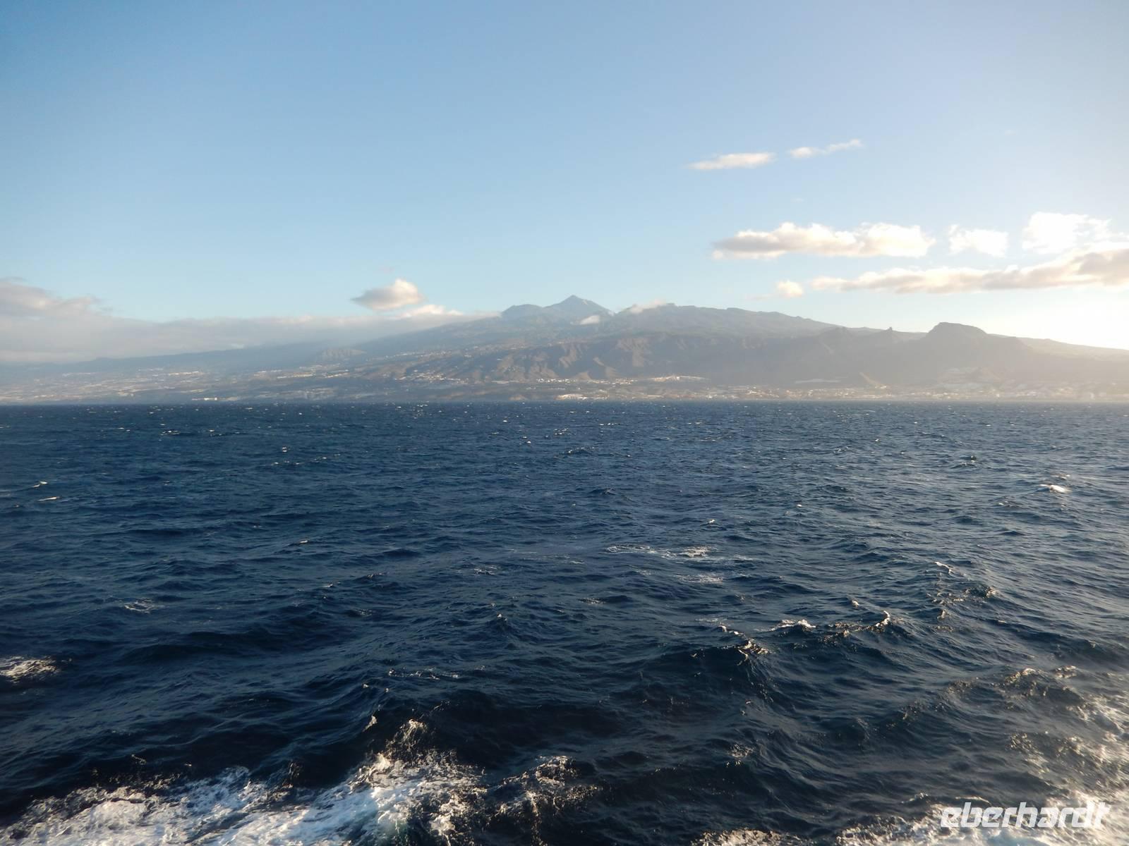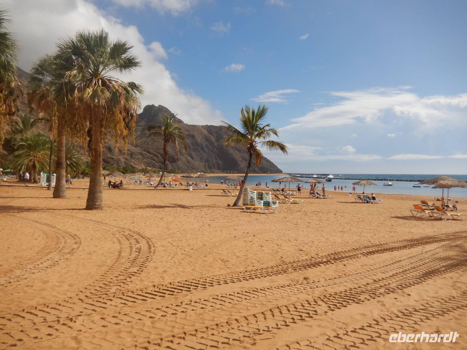 Nach einem leckeren und reichhaltigen Frühstück lernen wir unsere Reiseleiterin Anne kennen, welche uns in den nächsten Tagen die größte kanarische Insel Teneriffa zeigen wird. Wir fahren durch Las Americas und begeben uns auf der Autobahn gen Hauptstadt Santa Cruz. Der bewölkte Himmel klärt in der halben Stunde gen Norden immer weiter auf. Mit dem Atlantik zur Rechten und der Bergkette der Canadas del Teide zur Linken, fahren wir der Sonne entgegen. Wir haben das Glück freie Sicht auf den Teide zu haben und bekommen sogar die Umrisse von Gran Canaria zu sehen. Während unserer Panoramafahrt erklärt uns Anne die Geologie, Wirtschaft und das Klima der Insel. So erfahren wir, dass alle kanarischen Insel eigentlich riesige Unterwasservulkane sind, welche aus der Meeresoberfläche herausragen und das alles unter unseren Füßen verfestigte Lava ist. Desweiteren lernen wir, dass der Tourismus die Hauptbeschäftigungs- und Einkommensquelle der Insel ist. Dann erreichen wir schon den Wallfahrtsort Candelaria. Hier spazieren wir an der Promenade entlang, sehen die Statuen der Guanchenkönige und besichtigen die Kathedrale der Senora de Candelaria. Bei dem tollen Wetter probieren wir auch noch die spanische Frühstücksspezialität „Churros con Chocolate": Fettgebäck, welches in Schokolade getunkt wird. Ungesund aber soo lecker! :) Weiter geht es und wir kreuzen auf der Autobahn Santa Cruz und fahren an der Weltkulturerbestadt La Laguna vorbei. Schon sehen wir wieder das Meer vor uns und bemerken das wir schon auf der Nordseite der Insel sind. Auf der Fahrtstrecke von circa einer Stunde bekommen wir schon ein gutes Bild über die schnellen Wetter- und Vegetationsveränderungen auf Teneriffa, dem Minikontinenten. Auf dem Weg nach Puerto de la Cruz fahren wir an einer steil herabfallenden Küste entlang, vorbei an Terrassenfeldern, hübschen Kolonialhäusern und vielen Palmen. Den Teide sehen wir in seiner ganzen Pracht - überhaupt nicht selbstverständlich, denn hier im Norden ist er normalerweise wolkenverhangen, wenn überhaupt zu sehen. In Puerto de la Cruz haben wir etwas Freizeit und unternehmen einen Spaziergang oder probieren den empfohlenen Likörkaffee Barraquito. Dieser ist eine kanarische Spezialität, bestehend aus Kaffee, Süßmilch, Zimt, Orangenlikör und Zitronenschale. Puerto de la Cruz ist der zweite große Touristenort auf Teneriffa, gleich hinter Las Americas und Los Cristianos. Zwischen riesigen Hotelklotzen aus den 70ger Jahren entdecken wir auch schöne alte Fleckchen mit Kirchen und Herrenhäusern aus der Kolonialzeit. Auf dem Weiterweg gen Westen erklärt uns Anne das Geheimnis der kanarischen Dattelpalme und die kanarische Küche näher. Typische Spezialitäten der Insel sind die Papas Arrugadas (Runzelkartoffeln, in Meerwasser zubereitet), die grünen und roten Mojosoßen, Ziegenkäse, Gofio und der gute Barsch. Unser nächster Besichtigungspunkt, der Drachenbaum vom Icod de los Vinos, ist schon in Sicht. Dieser soll angeblich 1000 Jahre alt sein. Das lässt sich jedoch schwer bestimmen, meint Anne, denn Drachenbäume haben keine Jahresringe, sonder können nur anhand ihrer „Arme" ungefährt altersmäßig bestimmt werden. Nachdem wir den Drachenbaum gesehen haben, kehren wir in ein landestypisches Restaurant ein und probieren die Köstlichkeiten des Landes. Mit dicken Bäuchen fahren wir die Küste weiter und sehen im Meer vor uns einen riesigen Felsen. Dies ist der Vulkanfelsen von Garachico, der Handelsstadt, welche 1706 komplett nach einem Vulkanausbruch von der Lava verschluckt wurde. Diese Stadt sehen wir uns heute von oben an - ein traumhafter Ausblick! Wir haben wirklich fantastisches Wetter erwischt und haben alle Aussichtspunkte toll sehen können. Durch die Terrassenfelder von Erjos schlängern wir uns die Serpentinen des Tenogebirges entlang und fahren von 1000 Metern herunter an die Küste. Hier halten wir an den 600 Meter steil abfallenden Felsen von Los Gigantes. Und dann ist für uns noch eine kleine Überraschung von Eberhardt Travel an der Playa Arena vorbereitet: Sangria, kleine Tapas mit Kroketten, frittierte Sardelen und Mini-Tintenfische. Wir genießen die Sonne und nutzen die Gelegenheit um kurz ins Wasser zu springen und uns abzukühlen. Anschließend fahren wir etwas müde zum Hotel, denn es war ein schöner aber auch anstrengender Tag gewesen. Die komplette Insel haben wir einmal umrundet! Vor dem gemeinsamen Abendessen trifft sich noch ein Teil der Gruppe zu einem Abendstrandspaziergang mit Blick auf den sich rot färbenden Himmel.