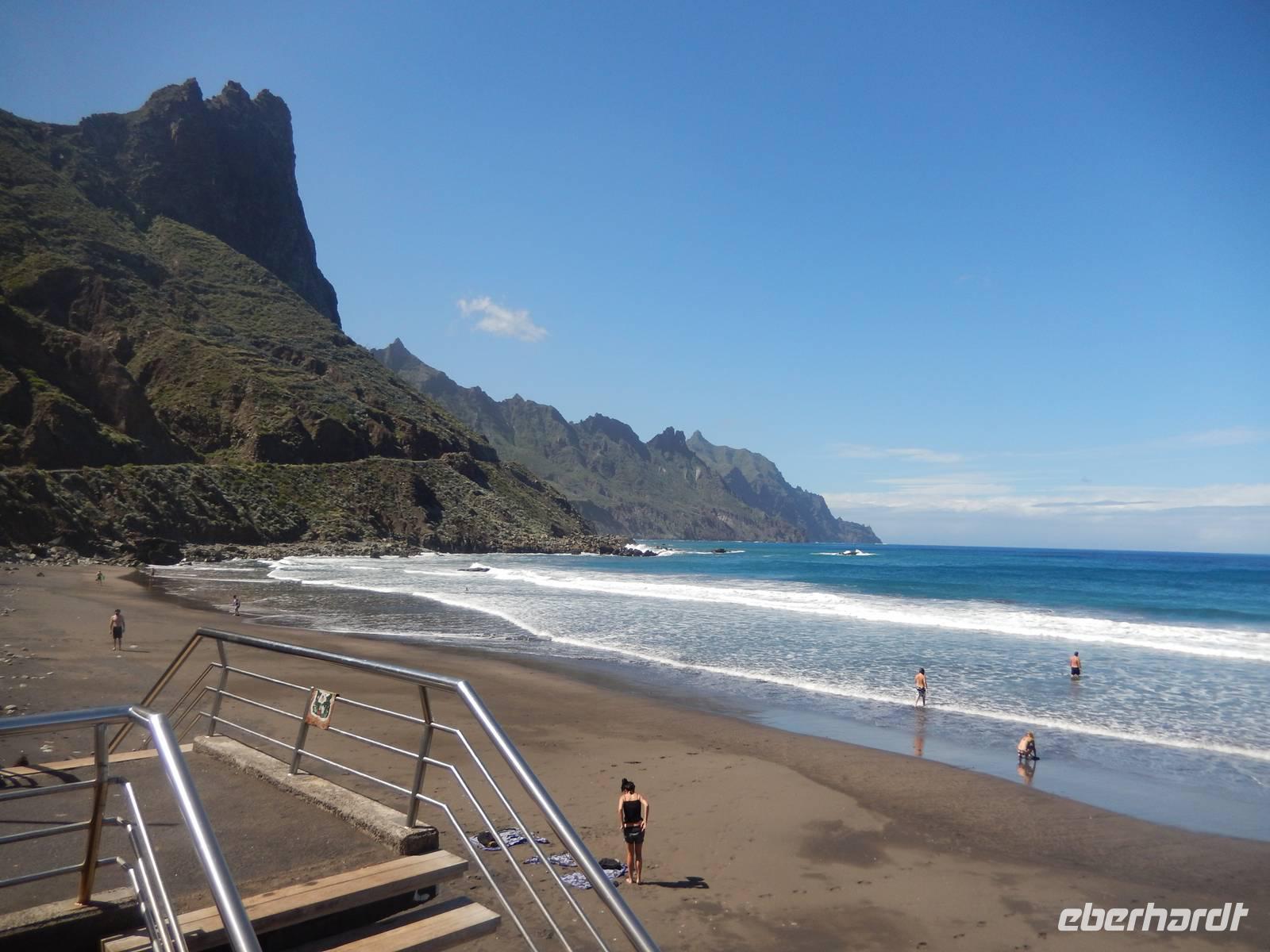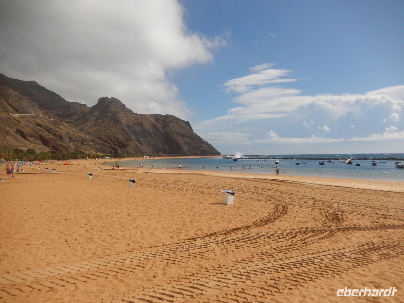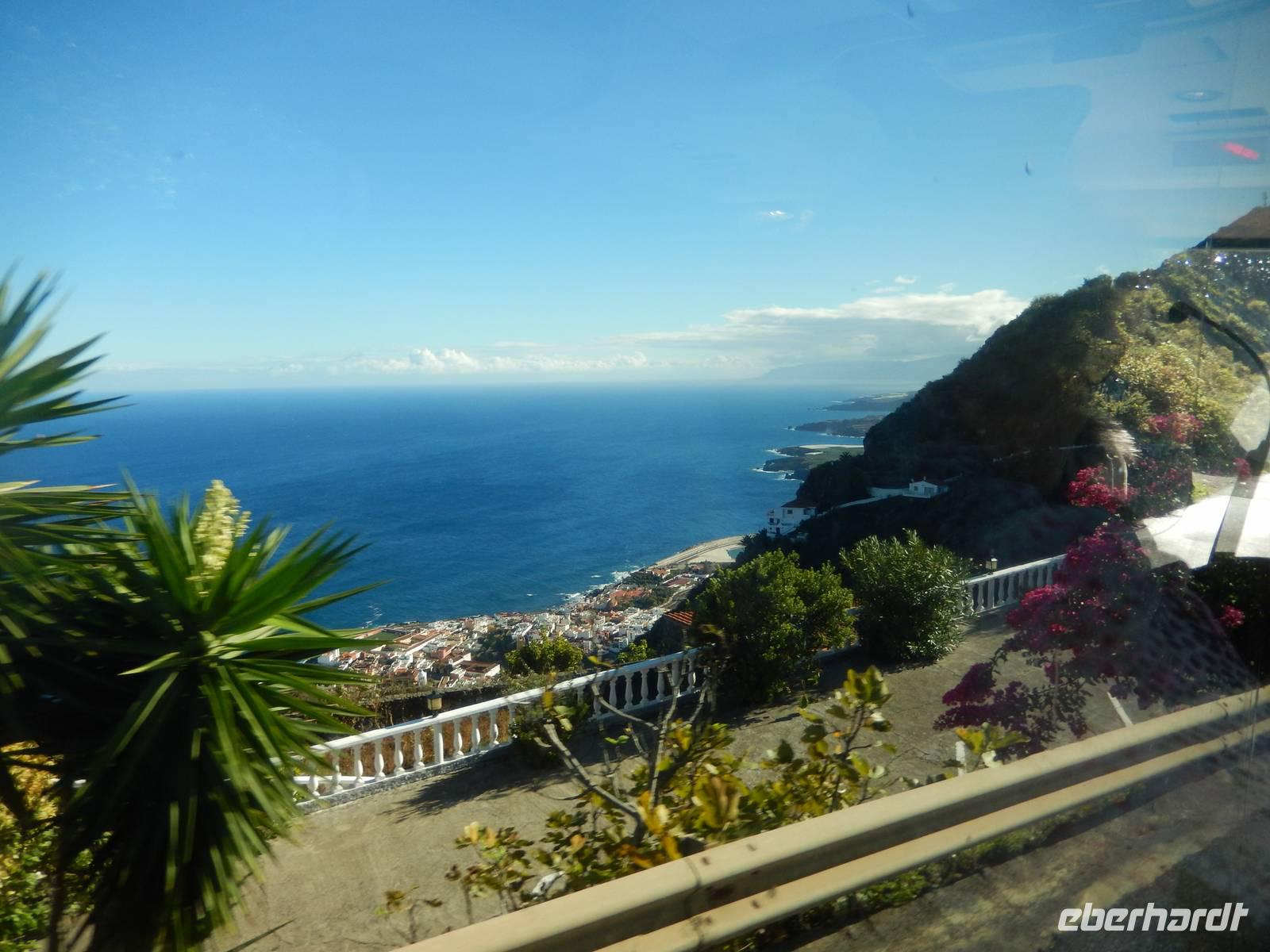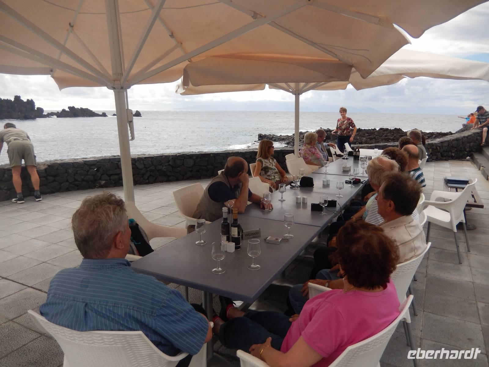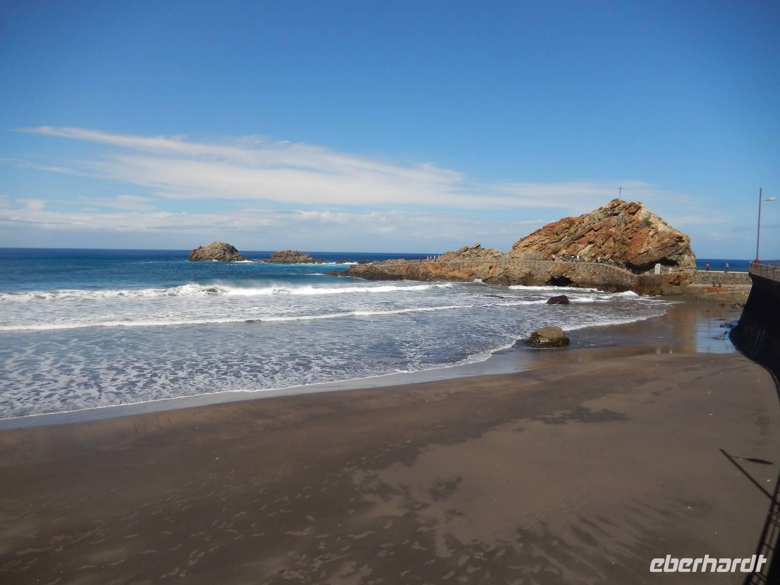 Nach einem leckeren und reichhaltigen Frühstück lernen wir unsere Reiseleiterin Anne kennen, welche uns in den nächsten Tagen die größte kanarische Insel Teneriffa zeigen wird. Wir fahren durch Las Americas und begeben uns auf der Autobahn gen Hauptstadt Santa Cruz. Der bewölkte Himmel klärt in der halben Stunde gen Norden immer weiter auf. Mit dem Atlantik zur Rechten und der Bergkette der Canadas del Teide zur Linken, fahren wir der Sonne entgegen. Wir haben das Glück freie Sicht auf den Teide zu haben und bekommen sogar die Umrisse von Gran Canaria zu sehen. Während unserer Panoramafahrt erklärt uns Anne die Geologie, Wirtschaft und das Klima der Insel. So erfahren wir, dass alle kanarischen Insel eigentlich riesige Unterwasservulkane sind, welche aus der Meeresoberfläche herausragen und das alles unter unseren Füßen verfestigte Lava ist. Desweiteren lernen wir, dass der Tourismus die Hauptbeschäftigungs- und Einkommensquelle der Insel ist. Dann erreichen wir schon den Wallfahrtsort Candelaria. Hier spazieren wir an der Promenade entlang, sehen die Statuen der Guanchenkönige und besichtigen die Kathedrale der Senora de Candelaria. Bei dem tollen Wetter probieren wir auch noch die spanische Frühstücksspezialität „Churros con Chocolate": Fettgebäck, welches in Schokolade getunkt wird. Ungesund aber soo lecker! :) Weiter geht es und wir kreuzen auf der Autobahn Santa Cruz und fahren an der Weltkulturerbestadt La Laguna vorbei. Schon sehen wir wieder das Meer vor uns und bemerken das wir schon auf der Nordseite der Insel sind. Auf der Fahrtstrecke von circa einer Stunde bekommen wir schon ein gutes Bild über die schnellen Wetter- und Vegetationsveränderungen auf Teneriffa, dem Minikontinenten. Auf dem Weg nach Puerto de la Cruz fahren wir an einer steil herabfallenden Küste entlang, vorbei an Terrassenfeldern, hübschen Kolonialhäusern und vielen Palmen. Den Teide sehen wir in seiner ganzen Pracht - überhaupt nicht selbstverständlich, denn hier im Norden ist er normalerweise wolkenverhangen, wenn überhaupt zu sehen. In Puerto de la Cruz haben wir etwas Freizeit und unternehmen einen Spaziergang oder probieren den empfohlenen Likörkaffee Barraquito. Dieser ist eine kanarische Spezialität, bestehend aus Kaffee, Süßmilch, Zimt, Orangenlikör und Zitronenschale. Puerto de la Cruz ist der zweite große Touristenort auf Teneriffa, gleich hinter Las Americas und Los Cristianos. Zwischen riesigen Hotelklotzen aus den 70ger Jahren entdecken wir auch schöne alte Fleckchen mit Kirchen und Herrenhäusern aus der Kolonialzeit. Auf dem Weiterweg gen Westen erklärt uns Anne das Geheimnis der kanarischen Dattelpalme und die kanarische Küche näher. Typische Spezialitäten der Insel sind die Papas Arrugadas (Runzelkartoffeln, in Meerwasser zubereitet), die grünen und roten Mojosoßen, Ziegenkäse, Gofio und der gute Barsch. Unser nächster Besichtigungspunkt, der Drachenbaum vom Icod de los Vinos, ist schon in Sicht. Dieser soll angeblich 1000 Jahre alt sein. Das lässt sich jedoch schwer bestimmen, meint Anne, denn Drachenbäume haben keine Jahresringe, sonder können nur anhand ihrer „Arme" ungefährt altersmäßig bestimmt werden. Nachdem wir den Drachenbaum gesehen haben, kehren wir in ein landestypisches Restaurant ein und probieren die Köstlichkeiten des Landes. Mit dicken Bäuchen fahren wir die Küste weiter und sehen im Meer vor uns einen riesigen Felsen. Dies ist der Vulkanfelsen von Garachico, der Handelsstadt, welche 1706 komplett nach einem Vulkanausbruch von der Lava verschluckt wurde. Diese Stadt sehen wir uns heute von oben an - ein traumhafter Ausblick! Wir haben wirklich fantastisches Wetter erwischt und haben alle Aussichtspunkte toll sehen können. Durch die Terrassenfelder von Erjos schlängern wir uns die Serpentinen des Tenogebirges entlang und fahren von 1000 Metern herunter an die Küste. Hier halten wir an den 600 Meter steil abfallenden Felsen von Los Gigantes. Und dann ist für uns noch eine kleine Überraschung von Eberhardt Travel an der Playa Arena vorbereitet: Sangria, kleine Tapas mit Kroketten, frittierte Sardelen und Mini-Tintenfische. Wir genießen die Sonne und nutzen die Gelegenheit um kurz ins Wasser zu springen und uns abzukühlen. Anschließend fahren wir etwas müde zum Hotel, denn es war ein schöner aber auch anstrengender Tag gewesen. Die komplette Insel haben wir einmal umrundet! Vor dem gemeinsamen Abendessen trifft sich noch ein Teil der Gruppe zu einem Abendstrandspaziergang mit Blick auf den sich rot färbenden Himmel.
