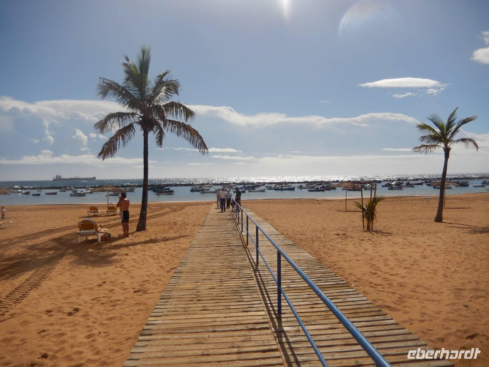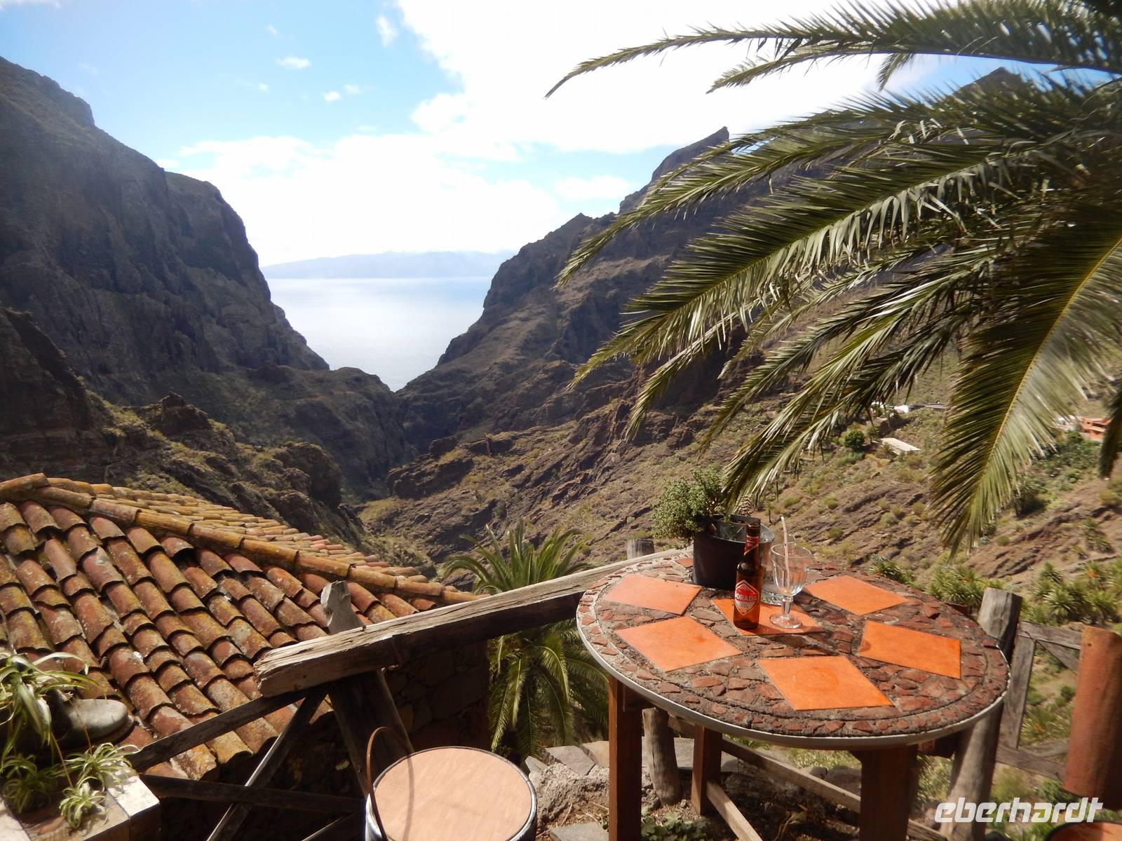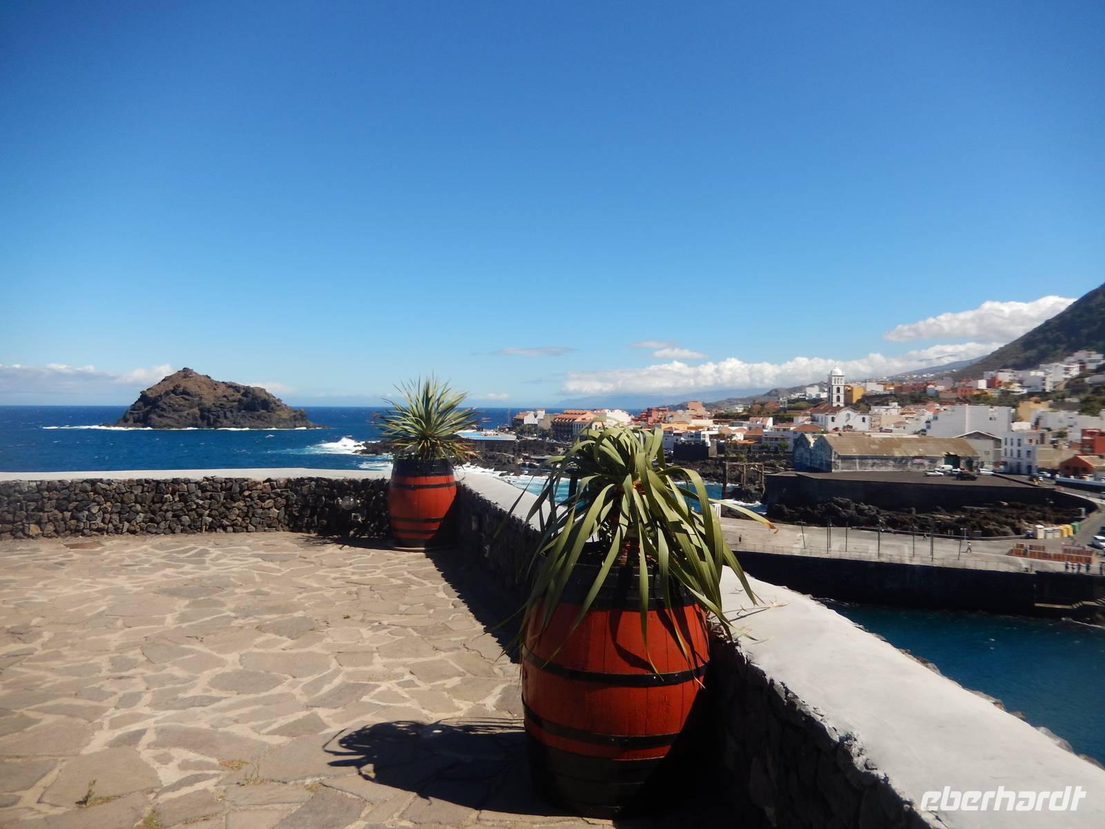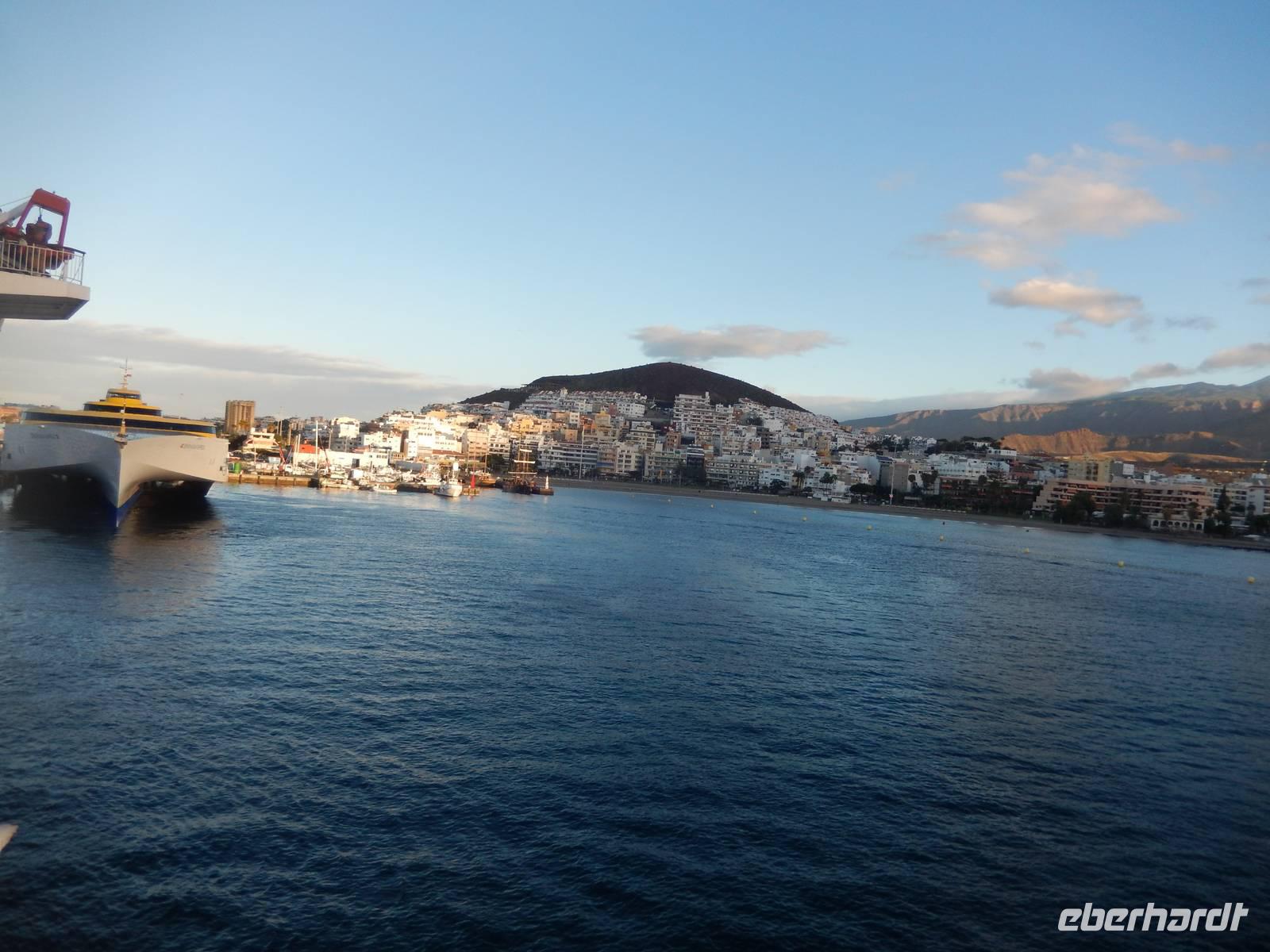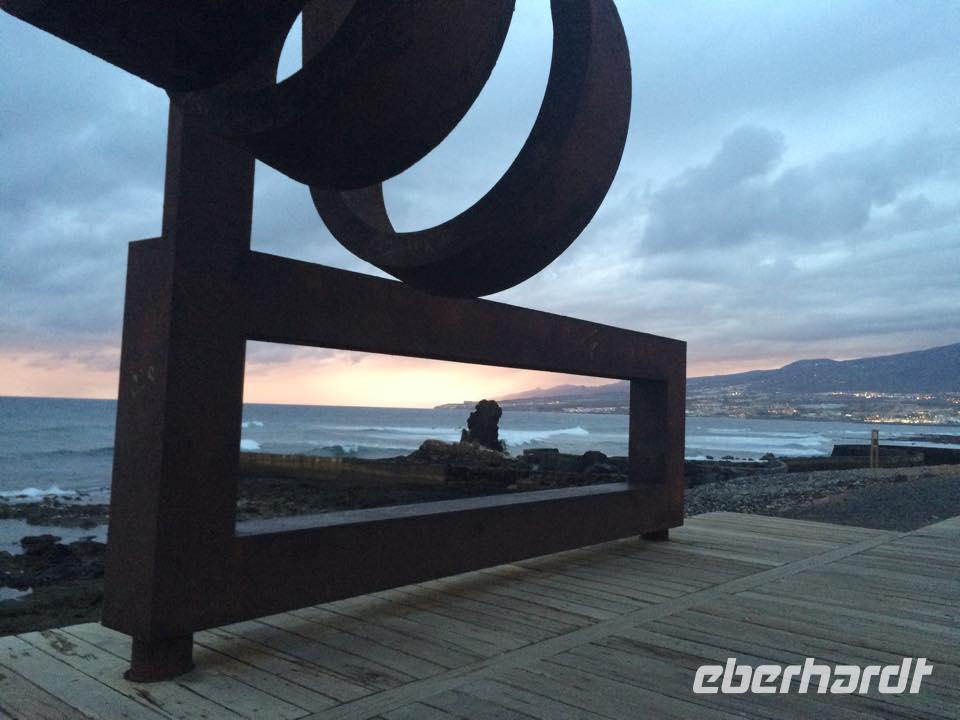 Nach einem leckeren und reichhaltigen Frühstück lernen wir unsere Reiseleiterin Anne kennen, welche uns in den nächsten Tagen die größte kanarische Insel Teneriffa zeigen wird. Wir fahren durch Las Americas und begeben uns auf der Autobahn gen Hauptstadt Santa Cruz. Der bewölkte Himmel klärt in der halben Stunde gen Norden immer weiter auf. Mit dem Atlantik zur Rechten und der Bergkette der Canadas del Teide zur Linken, fahren wir der Sonne entgegen. Wir haben das Glück freie Sicht auf den Teide zu haben und bekommen sogar die Umrisse von Gran Canaria zu sehen. Während unserer Panoramafahrt erklärt uns Anne die Geologie, Wirtschaft und das Klima der Insel. So erfahren wir, dass alle kanarischen Insel eigentlich riesige Unterwasservulkane sind, welche aus der Meeresoberfläche herausragen und das alles unter unseren Füßen verfestigte Lava ist. Desweiteren lernen wir, dass der Tourismus die Hauptbeschäftigungs- und Einkommensquelle der Insel ist. Dann erreichen wir schon den Wallfahrtsort Candelaria. Hier spazieren wir an der Promenade entlang, sehen die Statuen der Guanchenkönige und besichtigen die Kathedrale der Senora de Candelaria. Bei dem tollen Wetter probieren wir auch noch die spanische Frühstücksspezialität „Churros con Chocolate": Fettgebäck, welches in Schokolade getunkt wird. Ungesund aber soo lecker! :) Weiter geht es und wir kreuzen auf der Autobahn Santa Cruz und fahren an der Weltkulturerbestadt La Laguna vorbei. Schon sehen wir wieder das Meer vor uns und bemerken das wir schon auf der Nordseite der Insel sind. Auf der Fahrtstrecke von circa einer Stunde bekommen wir schon ein gutes Bild über die schnellen Wetter- und Vegetationsveränderungen auf Teneriffa, dem Minikontinenten. Auf dem Weg nach Puerto de la Cruz fahren wir an einer steil herabfallenden Küste entlang, vorbei an Terrassenfeldern, hübschen Kolonialhäusern und vielen Palmen. Den Teide sehen wir in seiner ganzen Pracht - überhaupt nicht selbstverständlich, denn hier im Norden ist er normalerweise wolkenverhangen, wenn überhaupt zu sehen. In Puerto de la Cruz haben wir etwas Freizeit und unternehmen einen Spaziergang oder probieren den empfohlenen Likörkaffee Barraquito. Dieser ist eine kanarische Spezialität, bestehend aus Kaffee, Süßmilch, Zimt, Orangenlikör und Zitronenschale. Puerto de la Cruz ist der zweite große Touristenort auf Teneriffa, gleich hinter Las Americas und Los Cristianos. Zwischen riesigen Hotelklotzen aus den 70ger Jahren entdecken wir auch schöne alte Fleckchen mit Kirchen und Herrenhäusern aus der Kolonialzeit. Auf dem Weiterweg gen Westen erklärt uns Anne das Geheimnis der kanarischen Dattelpalme und die kanarische Küche näher. Typische Spezialitäten der Insel sind die Papas Arrugadas (Runzelkartoffeln, in Meerwasser zubereitet), die grünen und roten Mojosoßen, Ziegenkäse, Gofio und der gute Barsch. Unser nächster Besichtigungspunkt, der Drachenbaum vom Icod de los Vinos, ist schon in Sicht. Dieser soll angeblich 1000 Jahre alt sein. Das lässt sich jedoch schwer bestimmen, meint Anne, denn Drachenbäume haben keine Jahresringe, sonder können nur anhand ihrer „Arme" ungefährt altersmäßig bestimmt werden. Nachdem wir den Drachenbaum gesehen haben, kehren wir in ein landestypisches Restaurant ein und probieren die Köstlichkeiten des Landes. Mit dicken Bäuchen fahren wir die Küste weiter und sehen im Meer vor uns einen riesigen Felsen. Dies ist der Vulkanfelsen von Garachico, der Handelsstadt, welche 1706 komplett nach einem Vulkanausbruch von der Lava verschluckt wurde. Diese Stadt sehen wir uns heute von oben an - ein traumhafter Ausblick! Wir haben wirklich fantastisches Wetter erwischt und haben alle Aussichtspunkte toll sehen können. Durch die Terrassenfelder von Erjos schlängern wir uns die Serpentinen des Tenogebirges entlang und fahren von 1000 Metern herunter an die Küste. Hier halten wir an den 600 Meter steil abfallenden Felsen von Los Gigantes. Und dann ist für uns noch eine kleine Überraschung von Eberhardt Travel an der Playa Arena vorbereitet: Sangria, kleine Tapas mit Kroketten, frittierte Sardelen und Mini-Tintenfische. Wir genießen die Sonne und nutzen die Gelegenheit um kurz ins Wasser zu springen und uns abzukühlen. Anschließend fahren wir etwas müde zum Hotel, denn es war ein schöner aber auch anstrengender Tag gewesen. Die komplette Insel haben wir einmal umrundet! Vor dem gemeinsamen Abendessen trifft sich noch ein Teil der Gruppe zu einem Abendstrandspaziergang mit Blick auf den sich rot färbenden Himmel.
