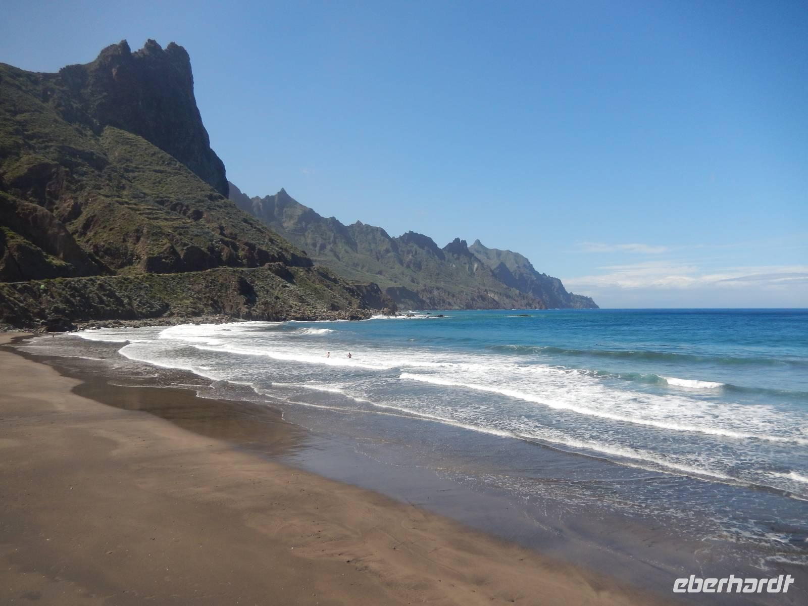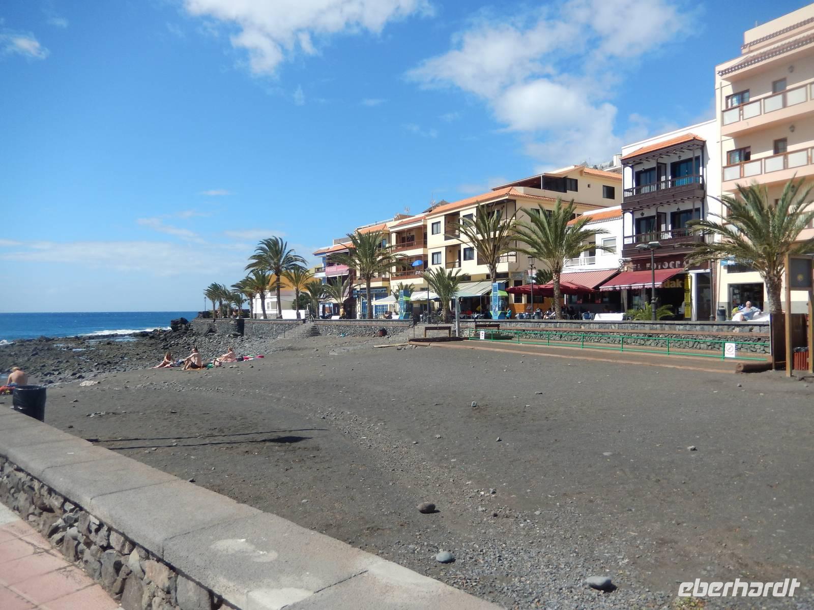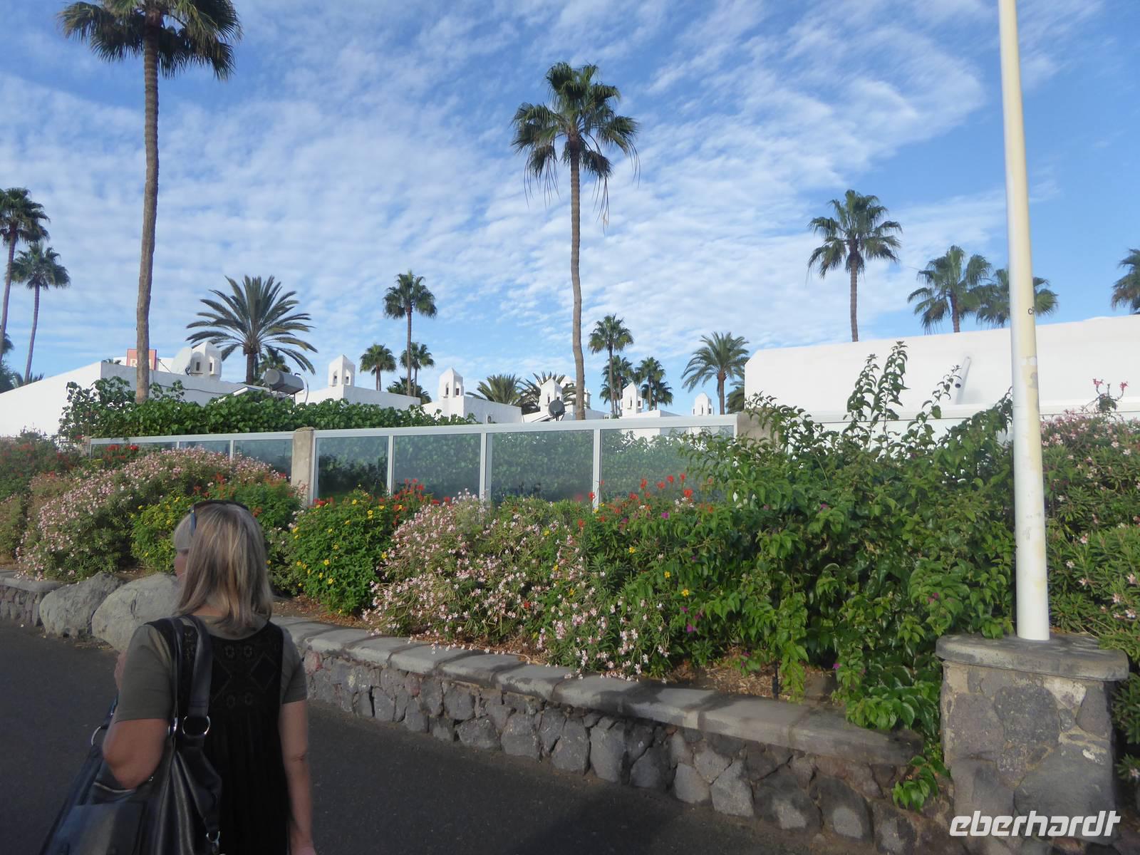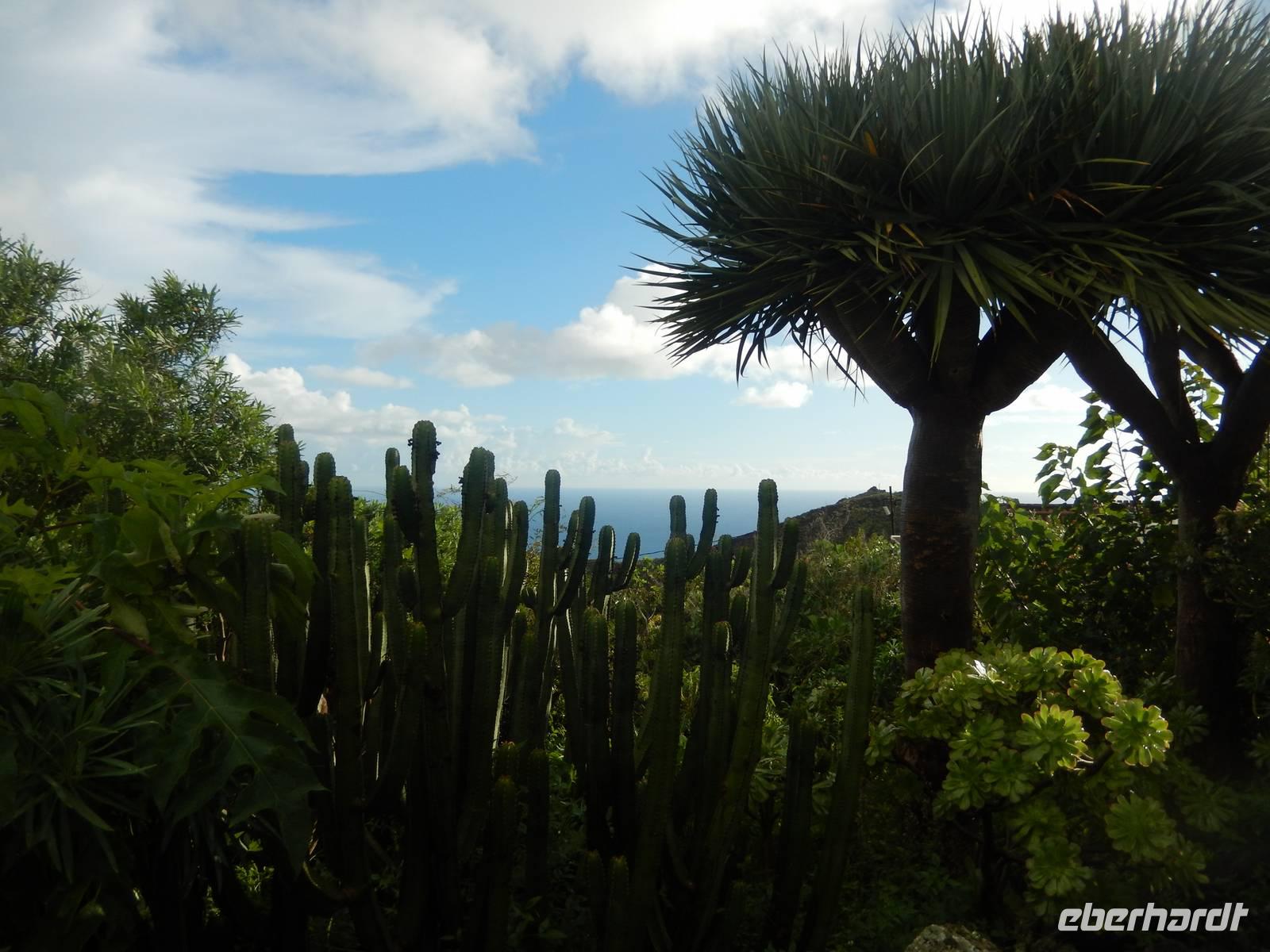 Nach einem leckeren und reichhaltigen Frühstück lernen wir unsere Reiseleiterin Anne kennen, welche uns in den nächsten Tagen die größte kanarische Insel Teneriffa zeigen wird. Wir fahren durch Las Americas und begeben uns auf der Autobahn gen Hauptstadt Santa Cruz. Der bewölkte Himmel klärt in der halben Stunde gen Norden immer weiter auf. Mit dem Atlantik zur Rechten und der Bergkette der Canadas del Teide zur Linken, fahren wir der Sonne entgegen. Wir haben das Glück freie Sicht auf den Teide zu haben und bekommen sogar die Umrisse von Gran Canaria zu sehen. Während unserer Panoramafahrt erklärt uns Anne die Geologie, Wirtschaft und das Klima der Insel. So erfahren wir, dass alle kanarischen Insel eigentlich riesige Unterwasservulkane sind, welche aus der Meeresoberfläche herausragen und das alles unter unseren Füßen verfestigte Lava ist. Desweiteren lernen wir, dass der Tourismus die Hauptbeschäftigungs- und Einkommensquelle der Insel ist. Dann erreichen wir schon den Wallfahrtsort Candelaria. Hier spazieren wir an der Promenade entlang, sehen die Statuen der Guanchenkönige und besichtigen die Kathedrale der Senora de Candelaria. Bei dem tollen Wetter probieren wir auch noch die spanische Frühstücksspezialität „Churros con Chocolate": Fettgebäck, welches in Schokolade getunkt wird. Ungesund aber soo lecker! :) Weiter geht es und wir kreuzen auf der Autobahn Santa Cruz und fahren an der Weltkulturerbestadt La Laguna vorbei. Schon sehen wir wieder das Meer vor uns und bemerken das wir schon auf der Nordseite der Insel sind. Auf der Fahrtstrecke von circa einer Stunde bekommen wir schon ein gutes Bild über die schnellen Wetter- und Vegetationsveränderungen auf Teneriffa, dem Minikontinenten. Auf dem Weg nach Puerto de la Cruz fahren wir an einer steil herabfallenden Küste entlang, vorbei an Terrassenfeldern, hübschen Kolonialhäusern und vielen Palmen. Den Teide sehen wir in seiner ganzen Pracht - überhaupt nicht selbstverständlich, denn hier im Norden ist er normalerweise wolkenverhangen, wenn überhaupt zu sehen. In Puerto de la Cruz haben wir etwas Freizeit und unternehmen einen Spaziergang oder probieren den empfohlenen Likörkaffee Barraquito. Dieser ist eine kanarische Spezialität, bestehend aus Kaffee, Süßmilch, Zimt, Orangenlikör und Zitronenschale. Puerto de la Cruz ist der zweite große Touristenort auf Teneriffa, gleich hinter Las Americas und Los Cristianos. Zwischen riesigen Hotelklotzen aus den 70ger Jahren entdecken wir auch schöne alte Fleckchen mit Kirchen und Herrenhäusern aus der Kolonialzeit. Auf dem Weiterweg gen Westen erklärt uns Anne das Geheimnis der kanarischen Dattelpalme und die kanarische Küche näher. Typische Spezialitäten der Insel sind die Papas Arrugadas (Runzelkartoffeln, in Meerwasser zubereitet), die grünen und roten Mojosoßen, Ziegenkäse, Gofio und der gute Barsch. Unser nächster Besichtigungspunkt, der Drachenbaum vom Icod de los Vinos, ist schon in Sicht. Dieser soll angeblich 1000 Jahre alt sein. Das lässt sich jedoch schwer bestimmen, meint Anne, denn Drachenbäume haben keine Jahresringe, sonder können nur anhand ihrer „Arme" ungefährt altersmäßig bestimmt werden. Nachdem wir den Drachenbaum gesehen haben, kehren wir in ein landestypisches Restaurant ein und probieren die Köstlichkeiten des Landes. Mit dicken Bäuchen fahren wir die Küste weiter und sehen im Meer vor uns einen riesigen Felsen. Dies ist der Vulkanfelsen von Garachico, der Handelsstadt, welche 1706 komplett nach einem Vulkanausbruch von der Lava verschluckt wurde. Diese Stadt sehen wir uns heute von oben an - ein traumhafter Ausblick! Wir haben wirklich fantastisches Wetter erwischt und haben alle Aussichtspunkte toll sehen können. Durch die Terrassenfelder von Erjos schlängern wir uns die Serpentinen des Tenogebirges entlang und fahren von 1000 Metern herunter an die Küste. Hier halten wir an den 600 Meter steil abfallenden Felsen von Los Gigantes. Und dann ist für uns noch eine kleine Überraschung von Eberhardt Travel an der Playa Arena vorbereitet: Sangria, kleine Tapas mit Kroketten, frittierte Sardelen und Mini-Tintenfische. Wir genießen die Sonne und nutzen die Gelegenheit um kurz ins Wasser zu springen und uns abzukühlen. Anschließend fahren wir etwas müde zum Hotel, denn es war ein schöner aber auch anstrengender Tag gewesen. Die komplette Insel haben wir einmal umrundet! Vor dem gemeinsamen Abendessen trifft sich noch ein Teil der Gruppe zu einem Abendstrandspaziergang mit Blick auf den sich rot färbenden Himmel.