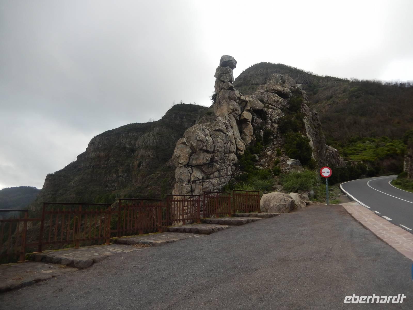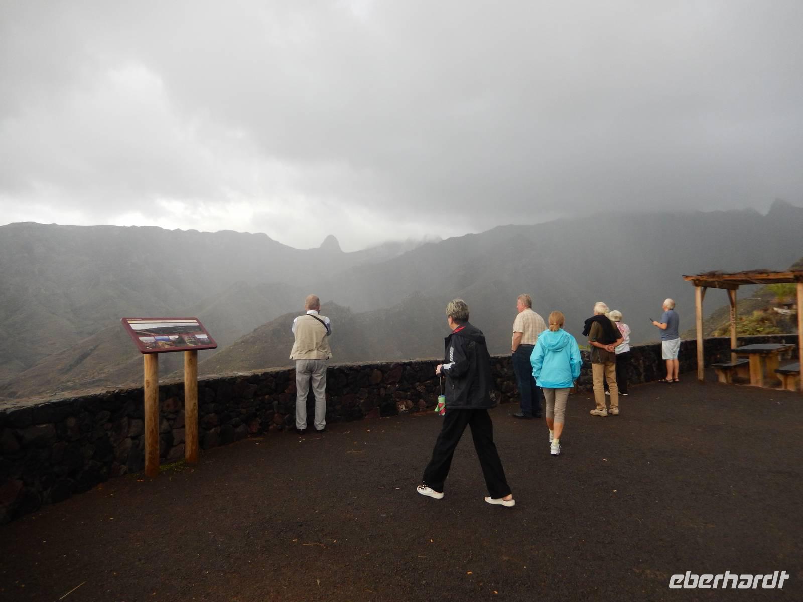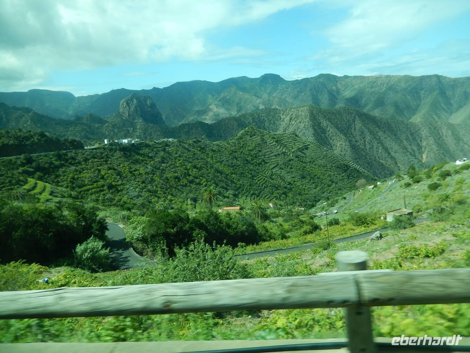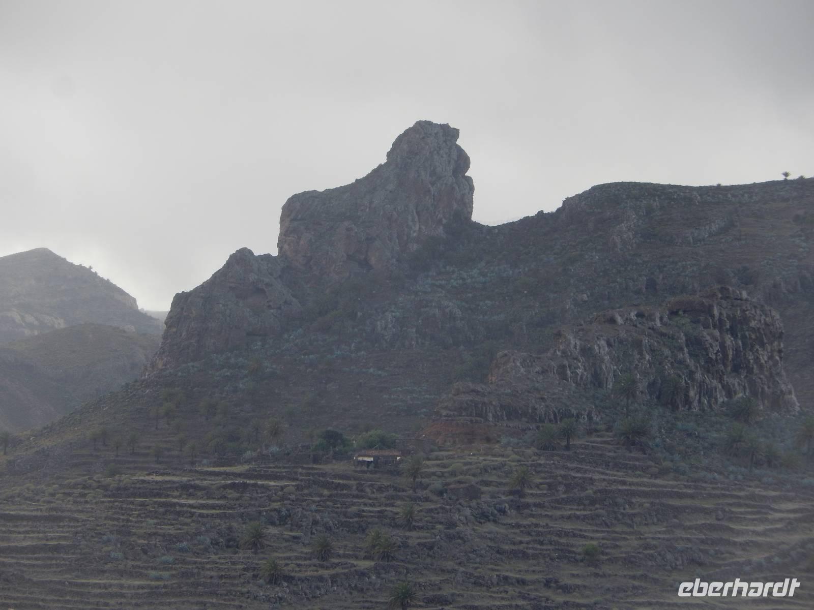Wir gelangen nach Arure und fahren weiter durch die Ortschaften El Retamal und Los Granados hinunter ans Meer nach Valle Gran Rey (Tal des großen Köngs). Früher wurden hier überall Bananen angebaut. Heute lebt das Tal größtenteils vom Tourismus. Im Ort La Calera haben wir Freizeit und gehen etwas typisch kanarisches essen, am Strand spazieren oder baden. Der Strand hier ist bekannt für seine Hippiekommune. Anschließend begeben wir uns zu einem kurzen Abstecher an den Hafen mit der Playa de Vuelas. Auf der Rückfahrt erklärt uns Gordo noch etwas zur Geschichte von La Gomera. Die Insel ist die einzige, welche sich die Guanchen Pfeifsprache El Silbo bewahrt hat. Damit konnten ganze Sätze über die Barrancos (Schluchten) hinweg übertragen werden. Als die Sprache auszusterben drohte, hat man Sie als Pflichtfach in der Schule eingeführt. Damit ist das Kulturgut von La Gomera bis heute erhalten blieben. Wir gelangen in einen Nebelwald und es fängt wieder langsam zu tröpfeln an. Doch einer kleiner Spaziergang durch den Wald mit den märchenhaften Baumstämmen und Moosbewuchs darf nicht fehlen. Der Nebelwald gehört zum Nationalpark Garajonay. Der Name entstammt einer Liebesgeschichte von Jonay aus Teneriffa und der Prinzessin Gara aus La Gomera. Anschließend geht es zurück in den ruhigen und idyllischen Ort San Sebastian. Auf dem Weg stoppen wir noch am Mirador el Cabrito und sehen den Sombrero- und den Löwenfelsen.