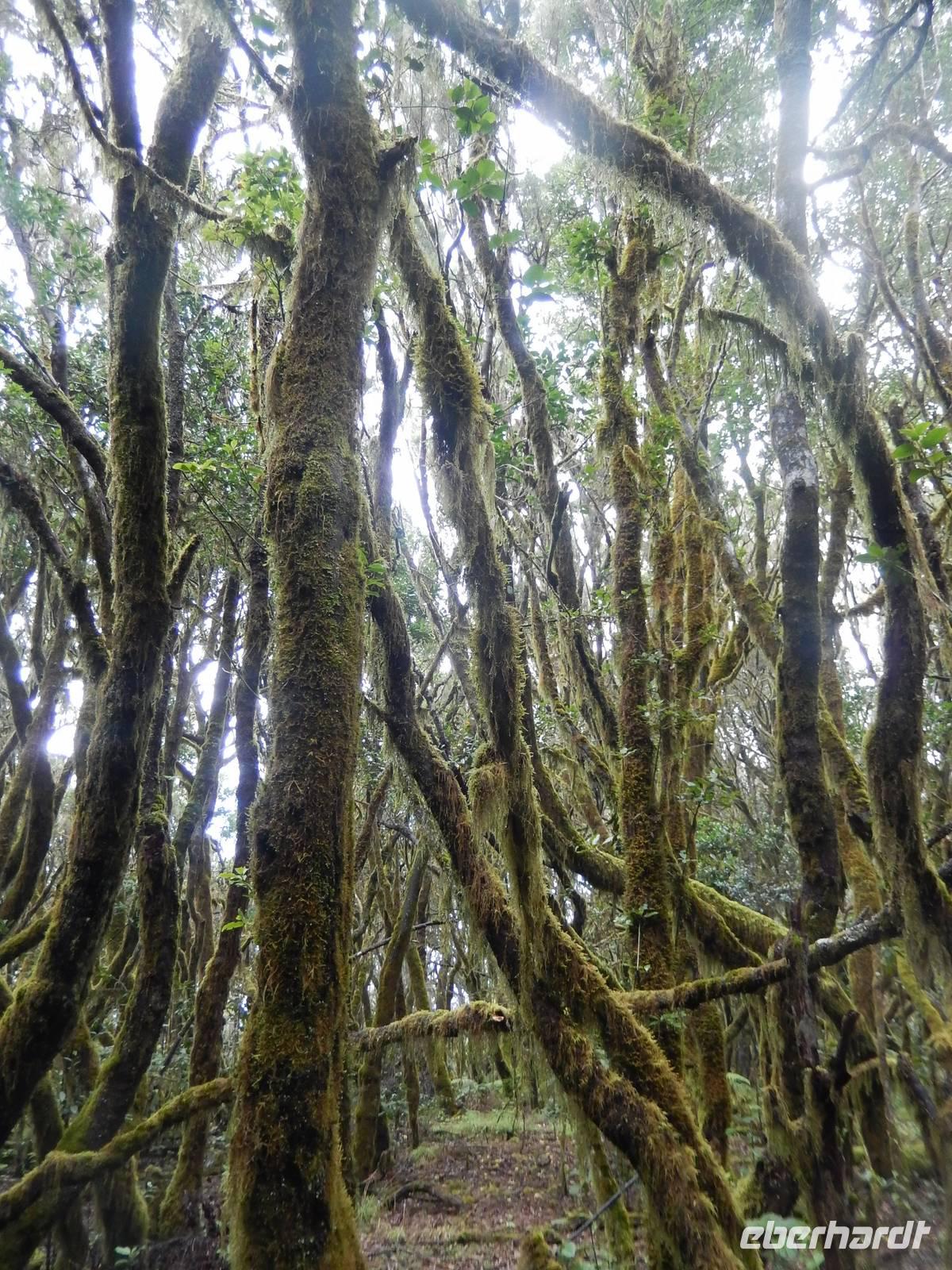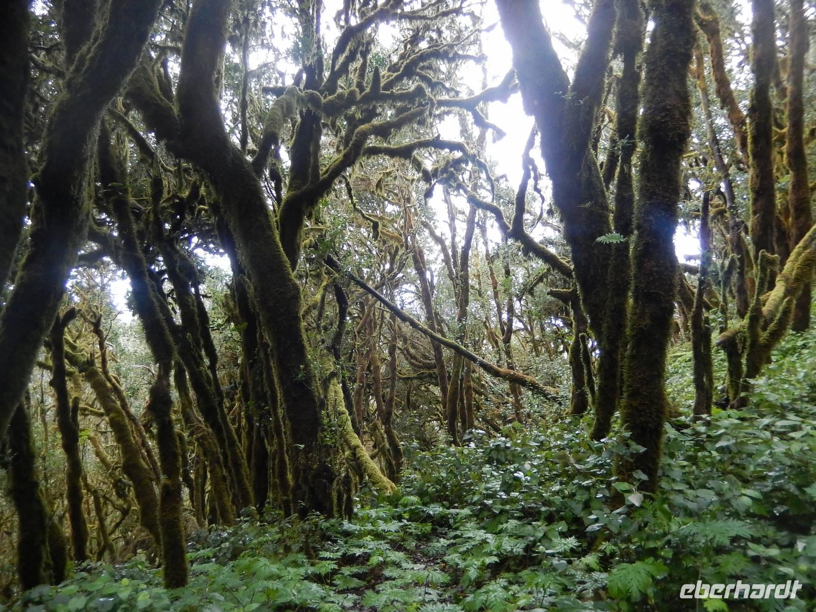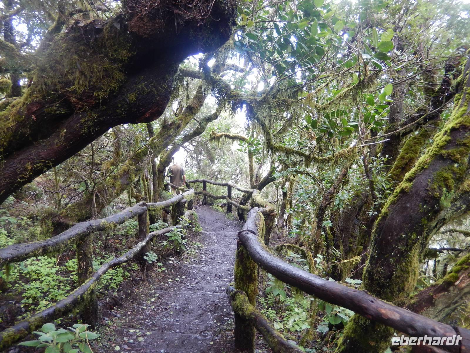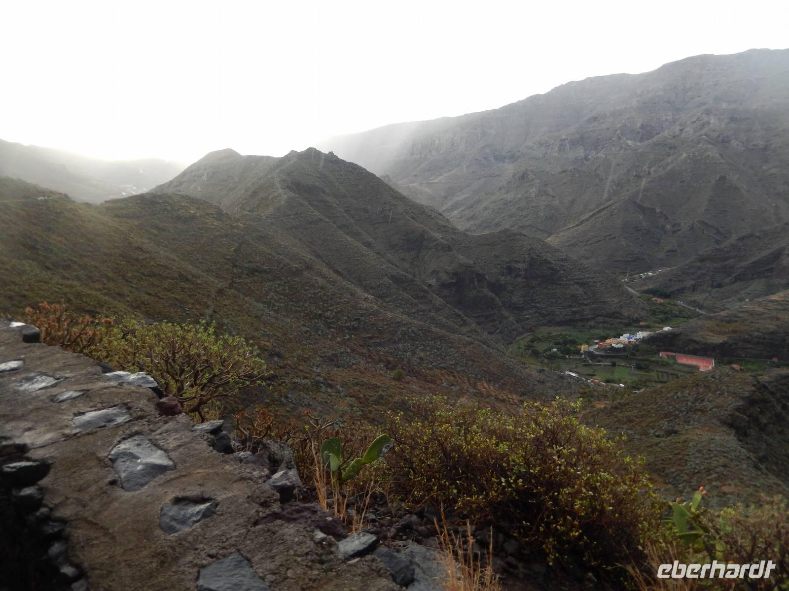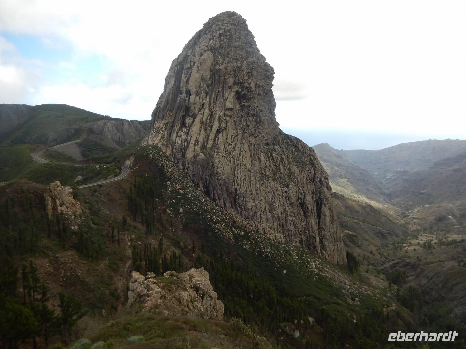 Wir gelangen nach Arure und fahren weiter durch die Ortschaften El Retamal und Los Granados hinunter ans Meer nach Valle Gran Rey (Tal des großen Köngs). Früher wurden hier überall Bananen angebaut. Heute lebt das Tal größtenteils vom Tourismus. Im Ort La Calera haben wir Freizeit und gehen etwas typisch kanarisches essen, am Strand spazieren oder baden. Der Strand hier ist bekannt für seine Hippiekommune. Anschließend begeben wir uns zu einem kurzen Abstecher an den Hafen mit der Playa de Vuelas. Auf der Rückfahrt erklärt uns Gordo noch etwas zur Geschichte von La Gomera. Die Insel ist die einzige, welche sich die Guanchen Pfeifsprache El Silbo bewahrt hat. Damit konnten ganze Sätze über die Barrancos (Schluchten) hinweg übertragen werden. Als die Sprache auszusterben drohte, hat man Sie als Pflichtfach in der Schule eingeführt. Damit ist das Kulturgut von La Gomera bis heute erhalten blieben. Wir gelangen in einen Nebelwald und es fängt wieder langsam zu tröpfeln an. Doch einer kleiner Spaziergang durch den Wald mit den märchenhaften Baumstämmen und Moosbewuchs darf nicht fehlen. Der Nebelwald gehört zum Nationalpark Garajonay. Der Name entstammt einer Liebesgeschichte von Jonay aus Teneriffa und der Prinzessin Gara aus La Gomera. Anschließend geht es zurück in den ruhigen und idyllischen Ort San Sebastian. Auf dem Weg stoppen wir noch am Mirador el Cabrito und sehen den Sombrero- und den Löwenfelsen.