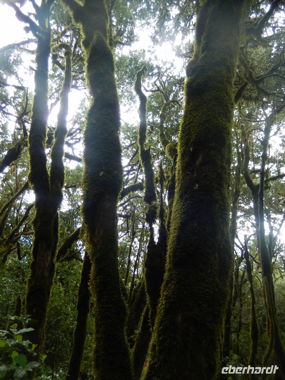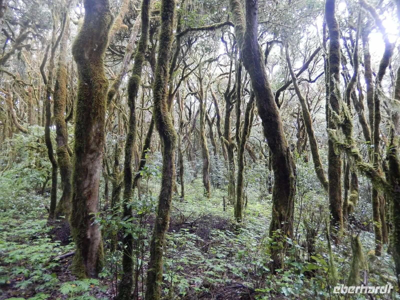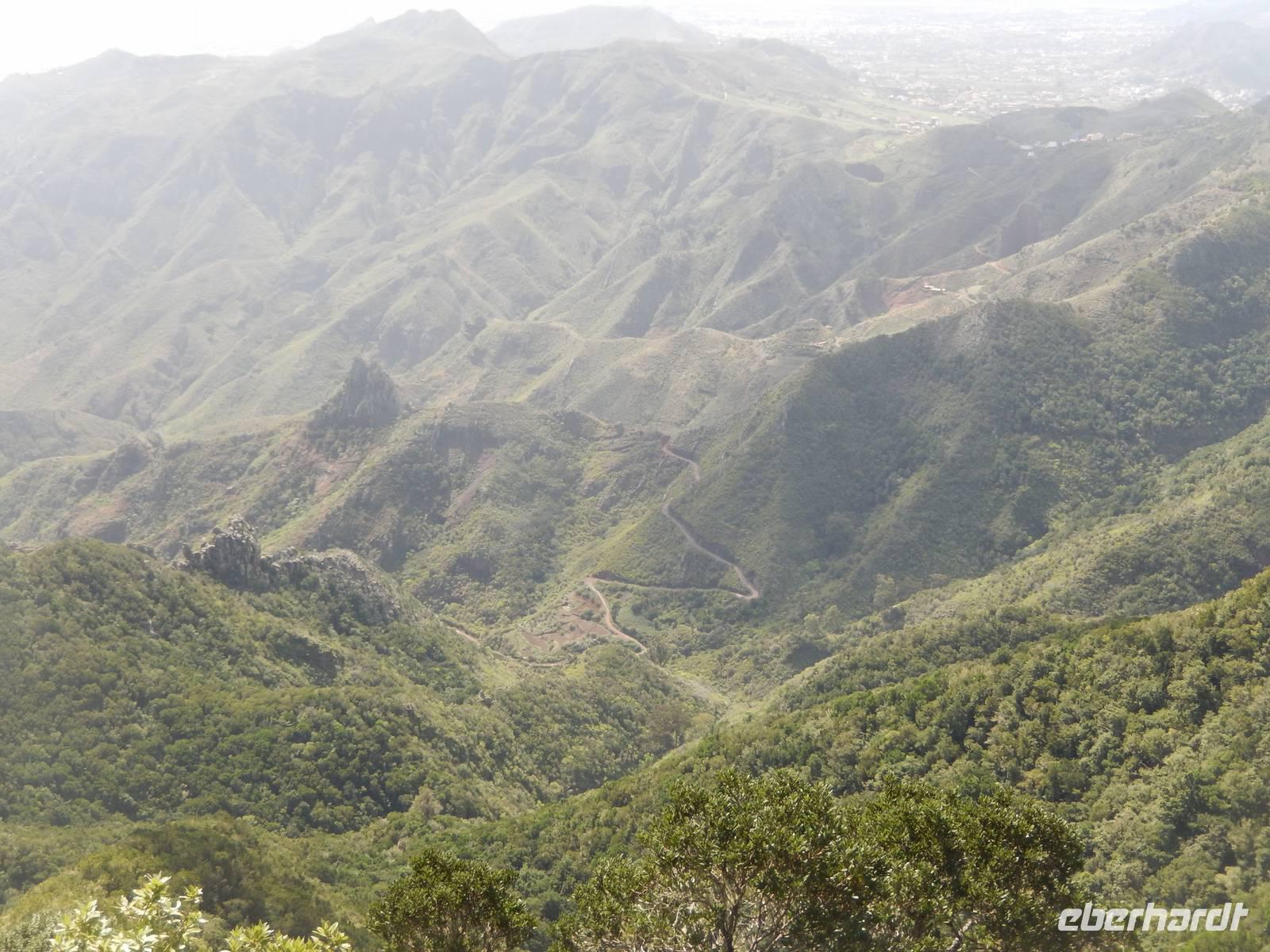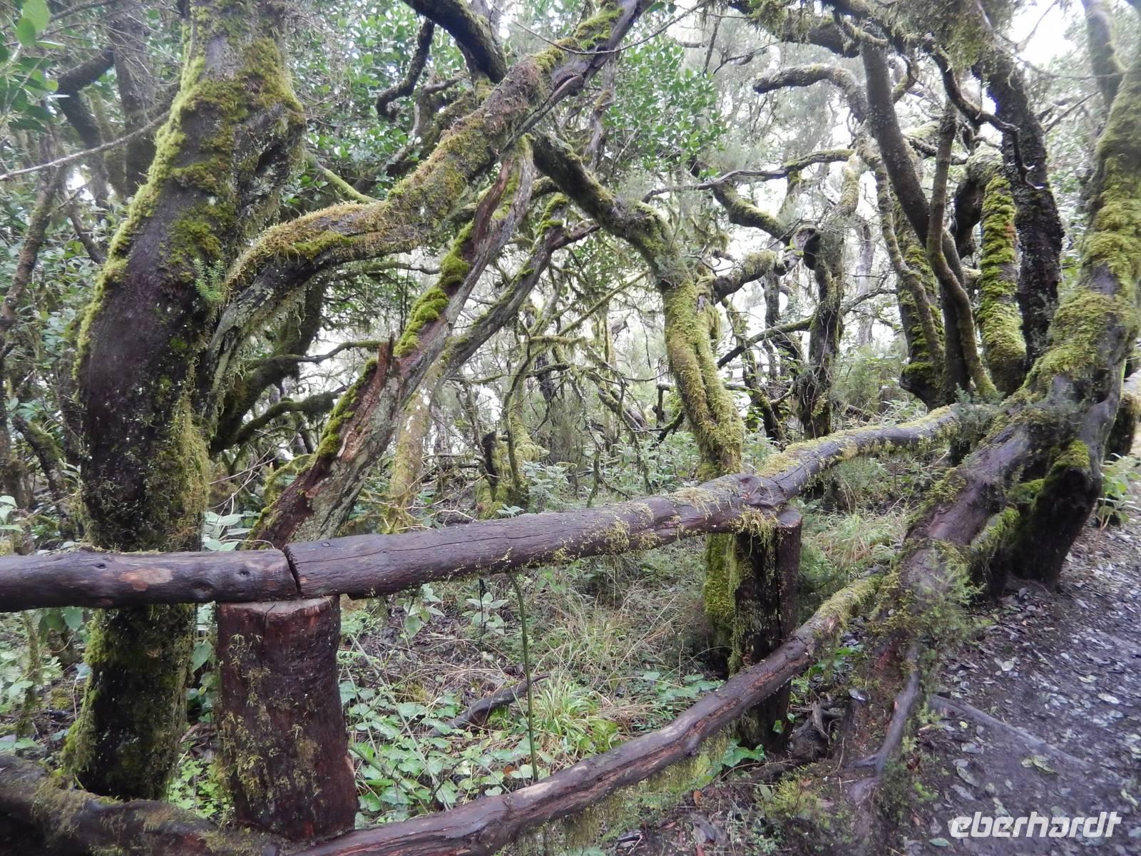 Wir gelangen nach Arure und fahren weiter durch die Ortschaften El Retamal und Los Granados hinunter ans Meer nach Valle Gran Rey (Tal des großen Köngs). Früher wurden hier überall Bananen angebaut. Heute lebt das Tal größtenteils vom Tourismus. Im Ort La Calera haben wir Freizeit und gehen etwas typisch kanarisches essen, am Strand spazieren oder baden. Der Strand hier ist bekannt für seine Hippiekommune. Anschließend begeben wir uns zu einem kurzen Abstecher an den Hafen mit der Playa de Vuelas. Auf der Rückfahrt erklärt uns Gordo noch etwas zur Geschichte von La Gomera. Die Insel ist die einzige, welche sich die Guanchen Pfeifsprache El Silbo bewahrt hat. Damit konnten ganze Sätze über die Barrancos (Schluchten) hinweg übertragen werden. Als die Sprache auszusterben drohte, hat man Sie als Pflichtfach in der Schule eingeführt. Damit ist das Kulturgut von La Gomera bis heute erhalten blieben. Wir gelangen in einen Nebelwald und es fängt wieder langsam zu tröpfeln an. Doch einer kleiner Spaziergang durch den Wald mit den märchenhaften Baumstämmen und Moosbewuchs darf nicht fehlen. Der Nebelwald gehört zum Nationalpark Garajonay. Der Name entstammt einer Liebesgeschichte von Jonay aus Teneriffa und der Prinzessin Gara aus La Gomera. Anschließend geht es zurück in den ruhigen und idyllischen Ort San Sebastian. Auf dem Weg stoppen wir noch am Mirador el Cabrito und sehen den Sombrero- und den Löwenfelsen.