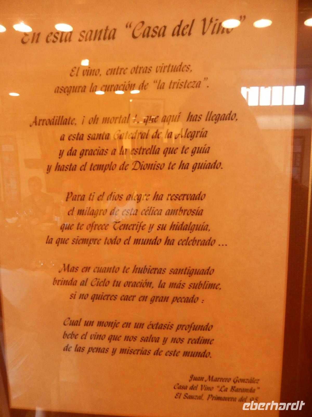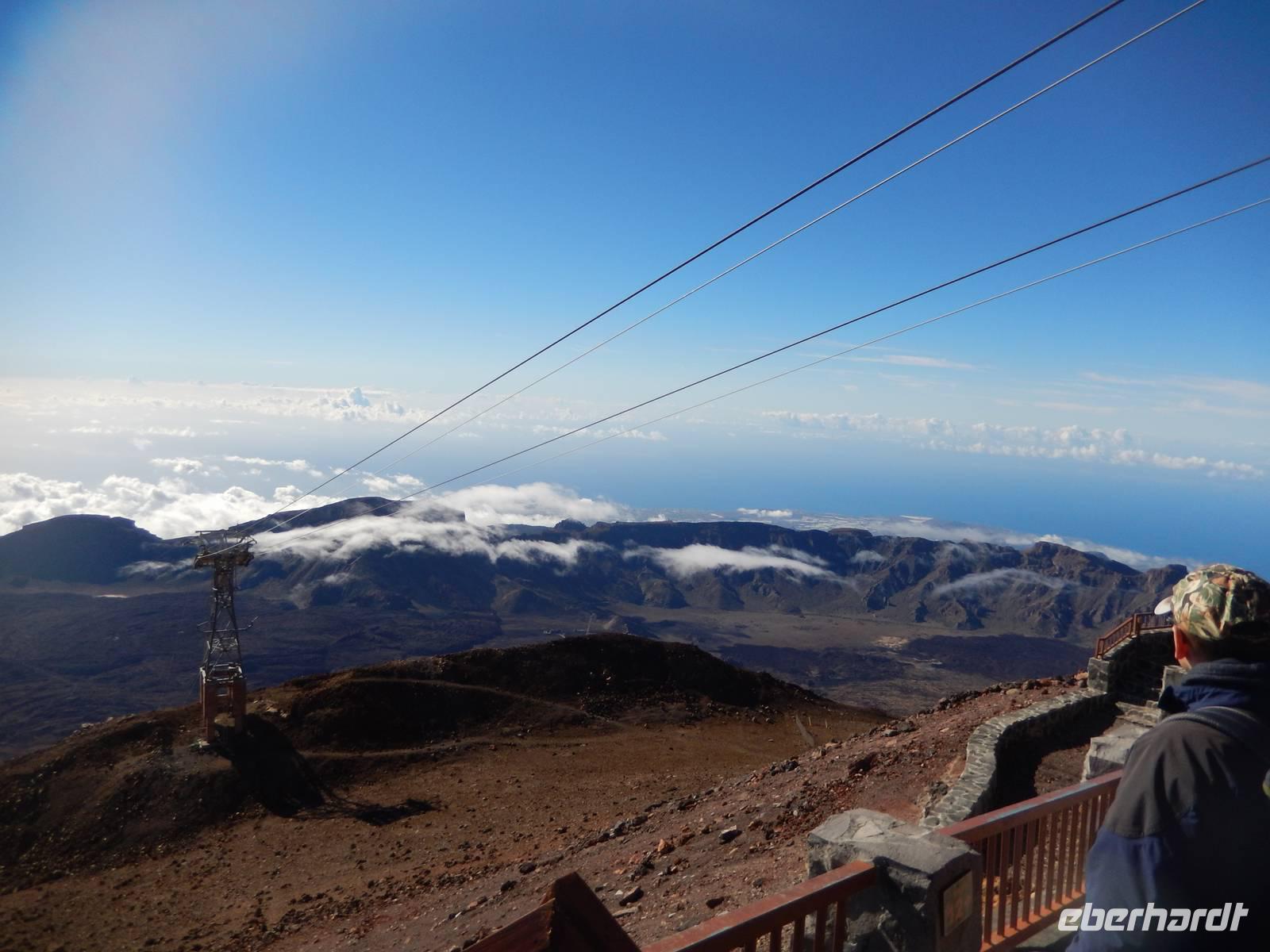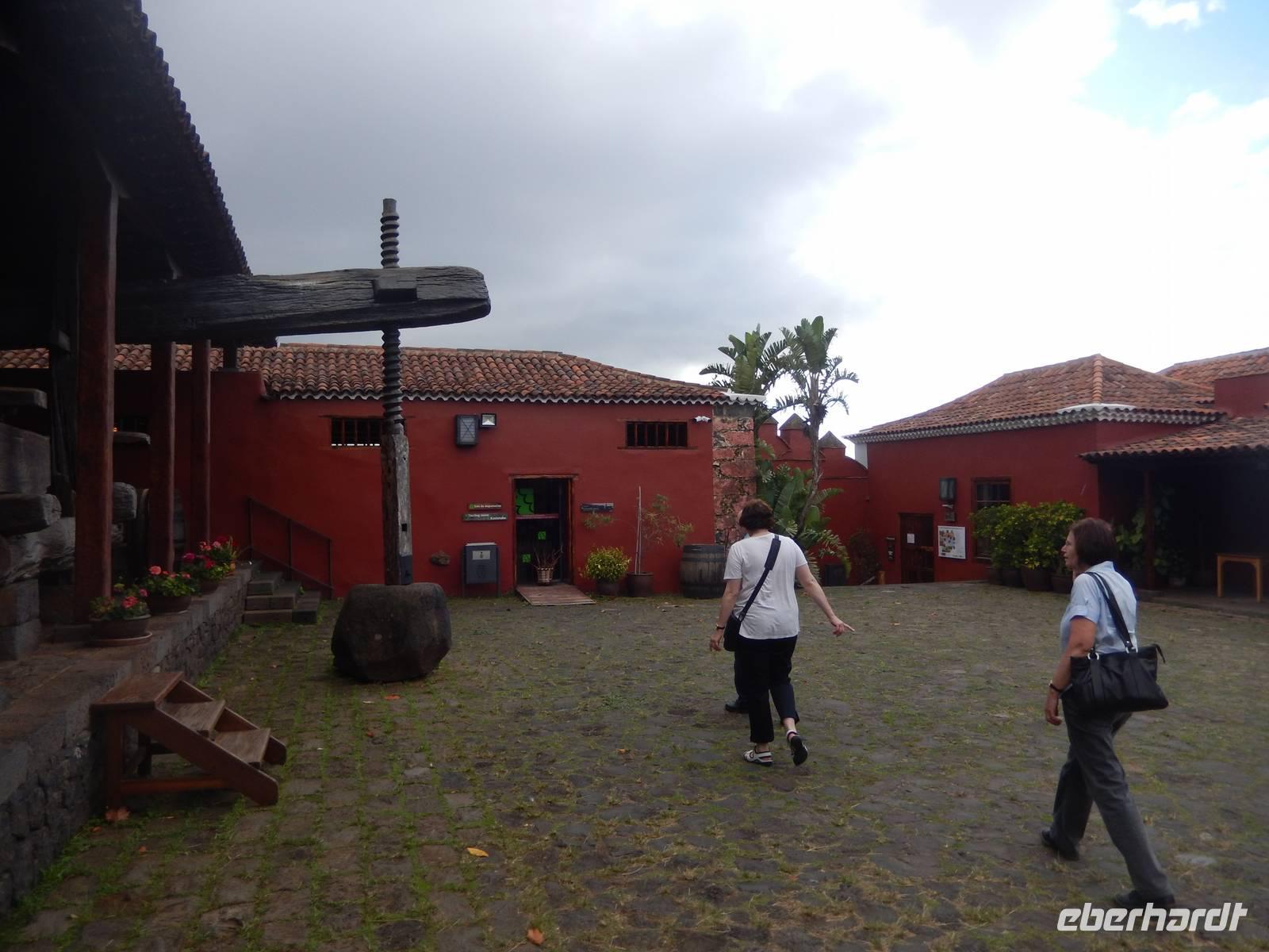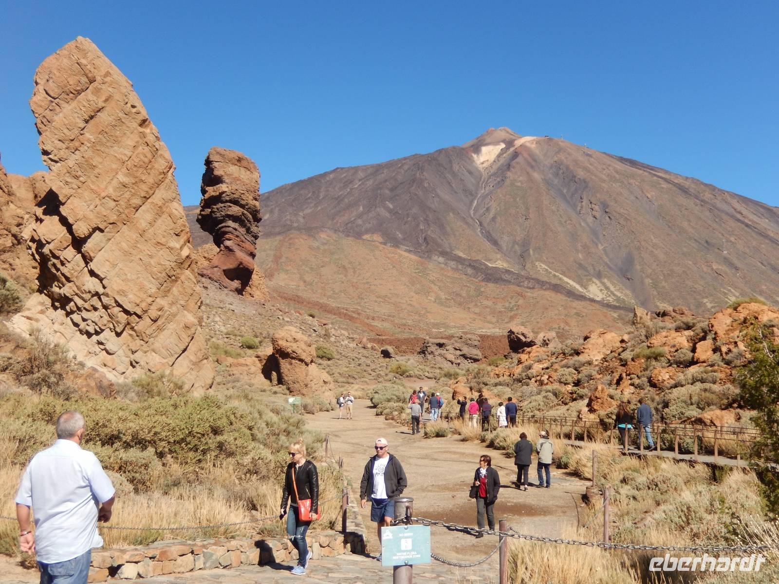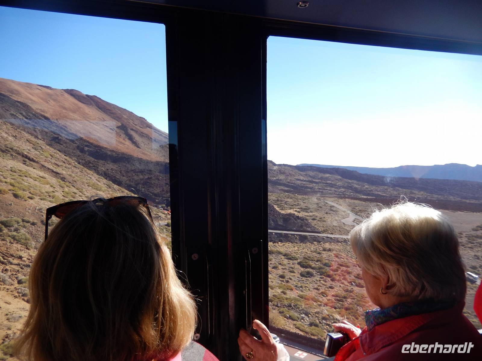 Heute starten wir schon um 8.30 Uhr von Las Americas aus, denn wir wollen vor den vielen Ausflugsbussen an der Seilbahn zum Teide sein. Der Tag fängt wettermäßig mal wieder vielversprechend an. Daran könnte man sich gewöhnen! Heute nehmen wir zur Abwechslung einmal nicht die Autobahn, sondern schlängerln uns geradewegs durch das Gebirge den Berg hinauf. Wir befinden uns hier im ältesten Teil der Insel. Wir fahren am Tafelberg Roque Conde vorbei und sehen viele Weinanbaugebiete. Nach einer halben Stunde Fahrt erreichen wir schon das Dörfchen Vilaflor. Dies ist das höchstgelegendste Dorf Spaniens. Es befindet sich schon über der Frostgrenze und bekommt somit auch zeitweise Schnee ab. Hier fühlt sich die kanarische Kiefer wohl. Diese ist feuerresistent und kann sich nach den öfteren Waldbränden (meistens durch Brandstifterei verursacht) verhältnismäßig schnell regenerieren. Wir sehen flächenweise auch noch die Folgen der katastrophalen Kanarenbrände aus dem Jahre 2012. Hier in Vilaflor finden wir auch den dicksten Baum, den Pino Gordo, wessen Stamm gut vier Menschen umfassen können. Nicht viele Tierarten fühlen sich hier wohl, doch Bergziegen und Kaninchen haben sich hier arg verbreitet und regelrecht zur Plage entwickelt. Dann endet die Kiefernvegetation und wir fahren durch karges Bergland mit viel Steckginster. Dies ist die Grenze zu den ca. 2300 Meter hoch gelegenen Canadas del Teide, dem kilometerlangen Kraterkessel. Der Urteide, welcher vor vielen Millionen Jahren ca. 6000 Meter hoch war, war zusammengebrochen und die Canadas del Teide sind dessen Hinterlassenschaft. Wir bewundern die rot, lila und grünlichen Felsfarben und die schwarzen Lavafelder. Dann erhebt sich vor uns schon der Teide und der Pico Viejo, dessen Zwilling. Hier oben rührt sich noch nichts, keine Seilbahn fährt, obwohl es schon weit nach 9.00 Uhr ist. Doch erfahren wir zu unserer Freude, dass die Seilbahn aufgrund starker Winde nur später startet. Dank unserer Vorbuchung brauchen wir uns nicht der langen Schlange einreihen und schweben wenige Minuten später mit der Seilbahn weitere 1000 Meter nach oben. Hier oben erwarten uns frische acht Grad und ein starker Wind. Doch wir haben tolle Aussicht bis hinunter auf das Meer, wo die Sonnenstrahlen im Wasser glitzern. Hier besteht auch die Möglichkeit, einen kurzen Spaziergang an der Kraterkante zu unternehmen. 65 Windkilometer haben wir heute hier oben in schwindelerregender Höhe. Dann begeben wir uns wieder zum Bus und fahren zu den unweit entfernten Roques de Garcia. Nachdem wir uns alles angeschaut haben, erwartet uns als Gipfelschnaps ein typischer Ron Miel - Honigrum von den Kanaren. Auf dem Weiterweg durch den Nationalpark in Richtung Westküste, erzählt uns Anne von den zahlreichen, weltberühmten Filmen, welche hier in der faszinierenden Lavalandschaft gedreht wurden. Dazu zählen zum Beispiel Fast and Furios, Kampf der Giganten, Planet der Affen und viele mehr. Auch soll es hier viele Esotherikergruppen auf den Gipfel treiben, denn der Nationalpark, so sagen Sie, soll übernatürliche Kräfte besitzen. Eine dieser Gruppen soll hier einen Massenselbstmord versucht haben. Gegen Mittag erreichen wir eine versteckte Picknickstelle mitten im Wald. Hier erwartet uns eine Überraschung: ein Picknick im Wald. Es gibt typisch kanarische Leckereien wie Papas Arrugadas mit Mojo (natürlich), Ziegenfleisch, Kichererbseneintopf, Fischkroketten, Gofio und natürlich leckerer selbstgemachter Wein. Leider erwischt es uns nass von Oben, denn Regen steht hier im Orotava Tal oft auf dem Programm. Doch wir lassen uns nicht stören und haben viel Spaß bei unserem Picknick im Regen. Nachdem die 12 Flaschen Wein geleert sind ;), begeben wir uns zum Bus und fahren hinunter nach Villa de La Orotava. Dies ist ein idyllisches Örtchen mit vielen Kolonialbauten, engen Gassen und steilen Kopfsteilplasterstraßen. Jährlich findet hier das berühmte Fronleichnamfest mit den Blumen- und Vulkanstaubteppichen statt. Wir spazieren durch die toll angelegten Gärten von Victoria mit Blick auf das Meer, sehen das Rathaus, die Kirche und gelangen zum Haus der Balkone (Casa de los Balcones). Hier ist ein guter Platz für eine Kaffeepause. Wir sehen uns auch die alten Innenhöfe der Herrenhäuser an. Dann geht es nach einem sehr ereignisreichen und lustigen Tag zurück ins Hotel, wo wir den Tag beim Abendessen ausklingen lassen.