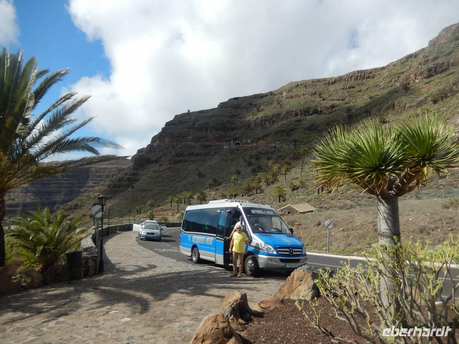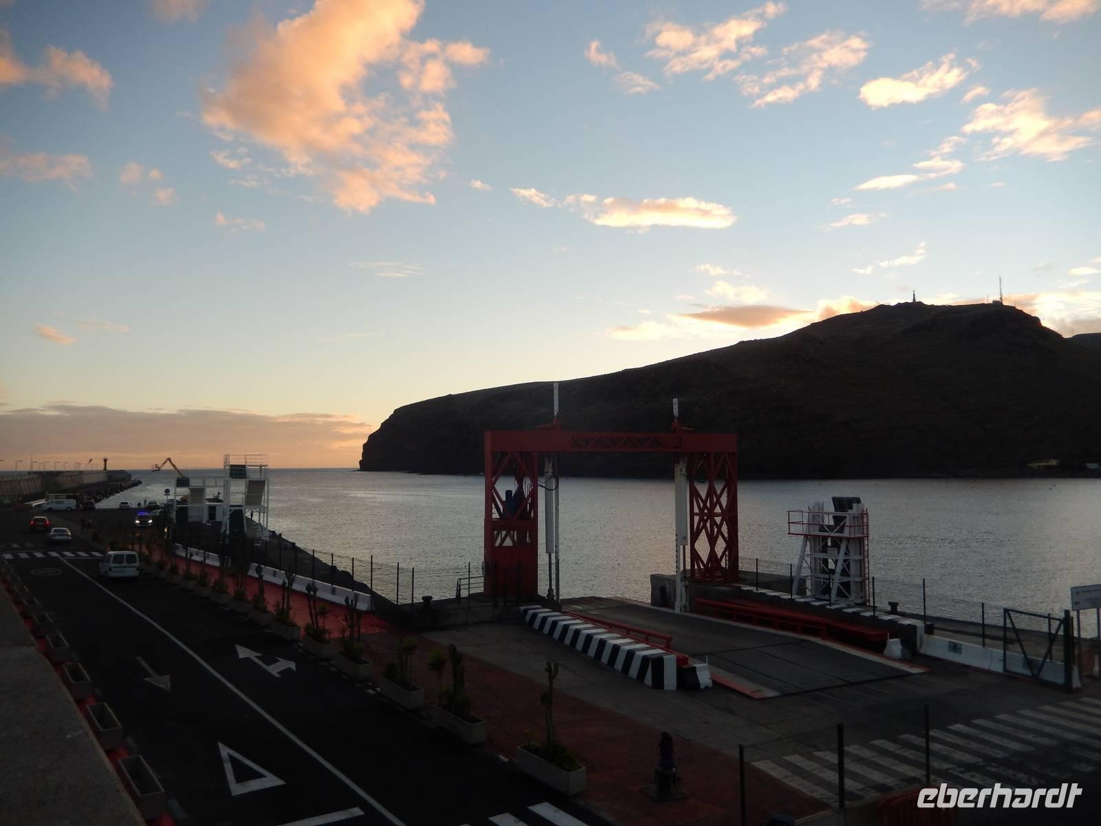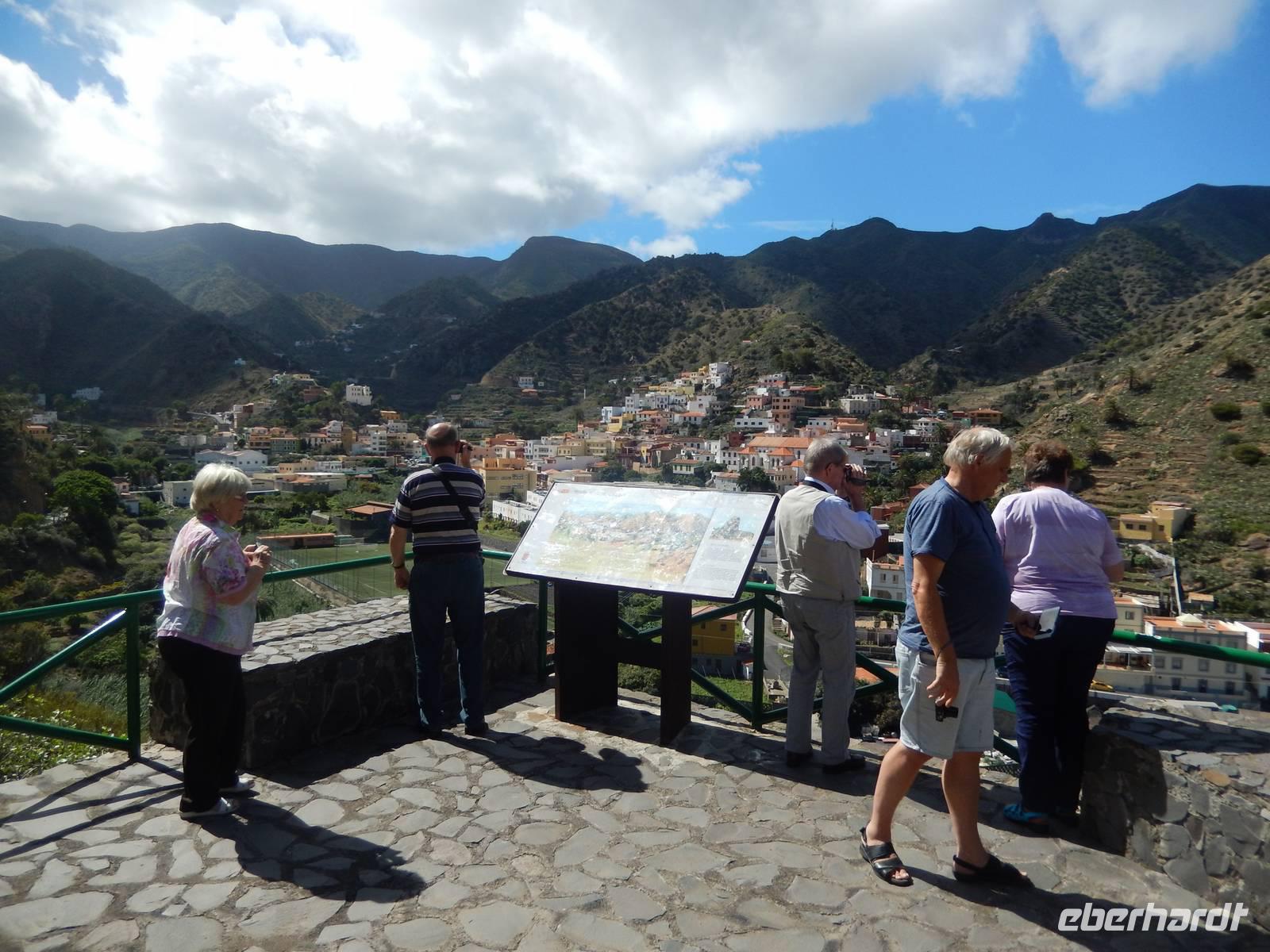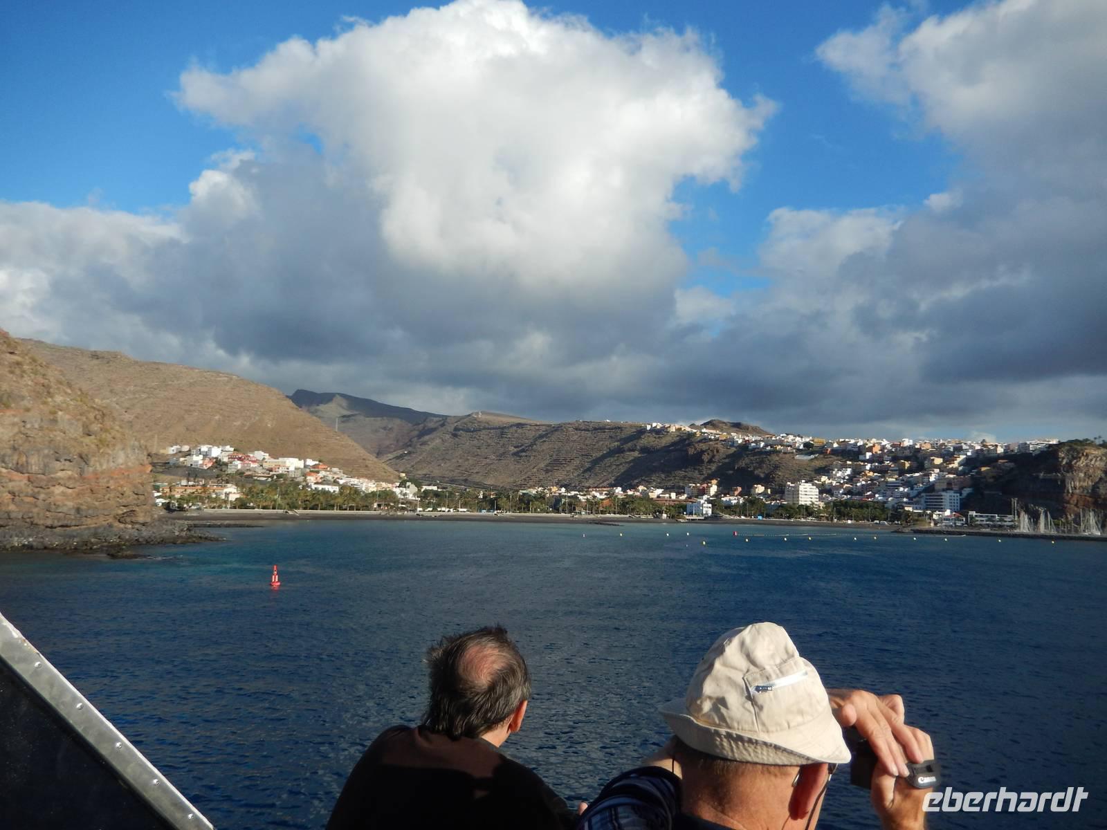 Sehr früh am Morgen checken wir heute im La Siesta aus und begeben uns nach Los Cristianos, wo wir bei Sonnenaufgang beobachten, wie die riesige Armas Fähre anlegt. Ein tolles Schauspiel. Dann schippern wir los in Richtung La Gomera. Circa eine Stunde dauert die Überfahrt und wird an Deck von Animation und Musik untermalt. Wir suchen nach Delphinen und Walen, finden aber leide keine. Dann erhebt sich schon La Gomera vor uns. Unser heutiger Busfahrer Pedro erwartet uns schon und bringt uns zum Hotel Torre del Conde. Es fängt gleich zu regnen an. Nachdem wir die Koffer abgestellt haben, lernen wir unseren Reiseleiter Gordo kennen. Wir fahren auf der Südstraße entlang, heute zur Abwechslung mal begleitet von starken Regen. Daher fahren wir am Roque Grande vorbei, hier ist nichts als dicker weißer Nebel zu sehen. Die Vegetation hier im Süden ist trocken, überall sind Terrassen in den Hängen angelegt. Unter uns gähnen die steilen Abgründe der Barrancos - La Gomera ist sehr stark zerklüftet. Gordo erzählt uns, dass Palmen in La Gomera geschützt sind, daher werden wir hier besonders viele sehen. Und tatsächtlich: überall stehen riesige kanarische Dattelpalmen. Auf La Gomera gibt es die Palmenkletterer, welche unter lebensgefährlichen Bedingungen den Palmensaft doch oben in den Kronen „ernten". Nun ändert sich die Vegetation, alles wird grüner und feuchter und schon befinden wir uns im Loorbeer - Nebelwald. Einge Stellen sind stark schwarz verkohlt, denn auch hier auf La Gomera gab es Fälle von Brandstifterei, welche riesige Waldbrände ausgelöst haben. Vorbei am Dörfchen Igualero und dem dazugehörigen Mirador mit kleiner Kapelle, dem Tafelberg Fortaleza, Chipude erreichen wir das Dorf El Cercado. Hier legen wir eine kleine Kaffeepause im Kaffee Maria ein. Es gibt leckeren Kaffee mit Cognac, La Gomera Weisswein oder natürlich den bekannten Barraquito. Wir haben Gelegenheit die hier befindlichen Töpfereien zu besuchen. Ein netter Verkäufer erklärt uns, dass der Ton direkt von der Insel stammt. Anschließend fahren wir weiter durch die Palmenoase von La Haya. Hier stoppen wir an einem Aussichtspunkt mit Blick ca. 1100 Meter tief ins Palmental.