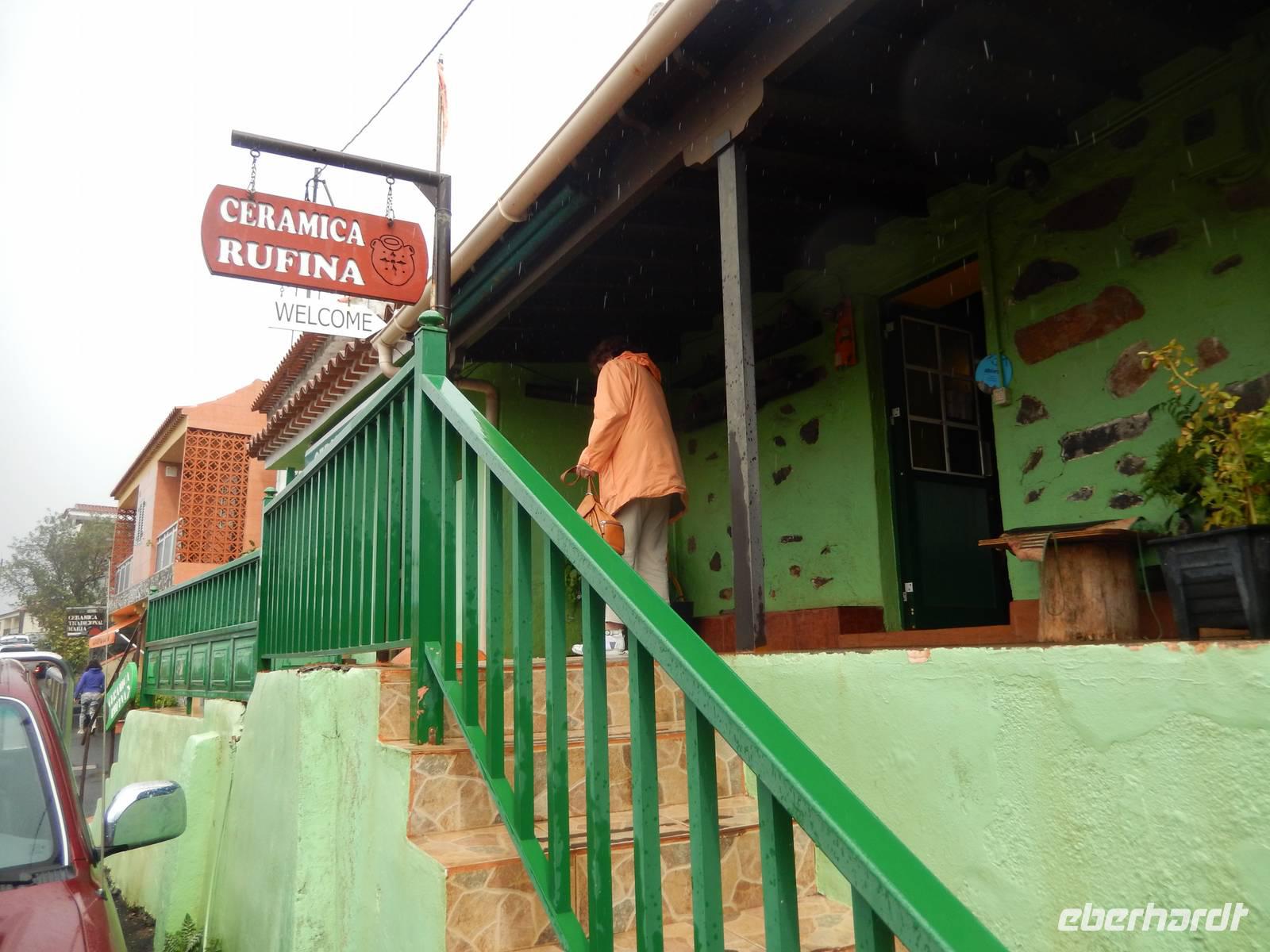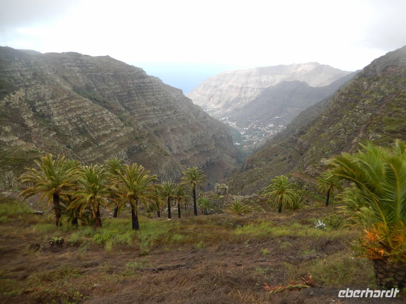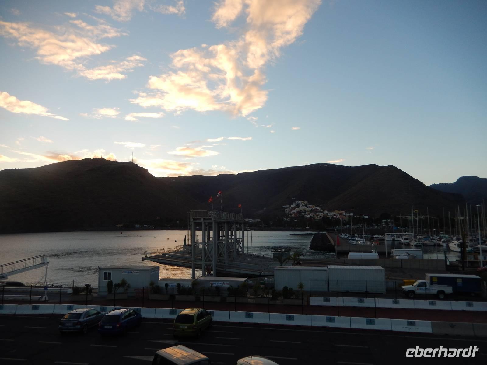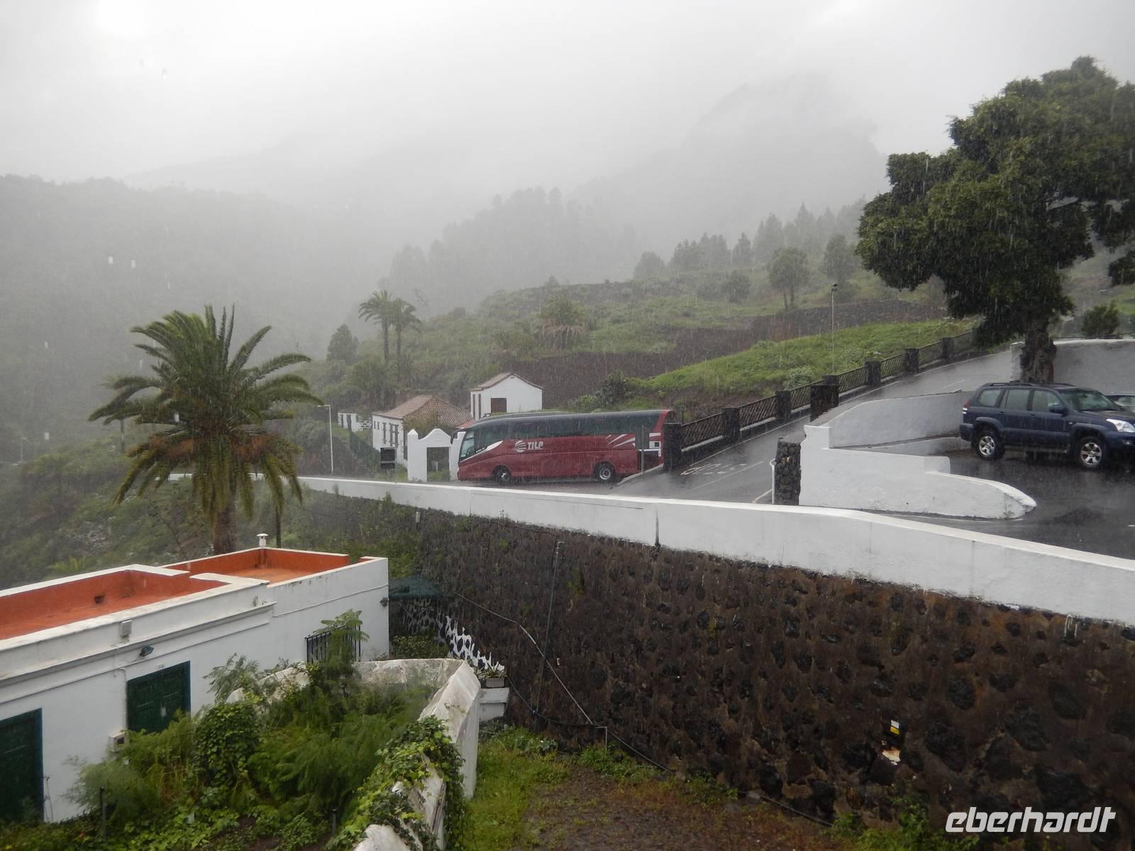 Sehr früh am Morgen checken wir heute im La Siesta aus und begeben uns nach Los Cristianos, wo wir bei Sonnenaufgang beobachten, wie die riesige Armas Fähre anlegt. Ein tolles Schauspiel. Dann schippern wir los in Richtung La Gomera. Circa eine Stunde dauert die Überfahrt und wird an Deck von Animation und Musik untermalt. Wir suchen nach Delphinen und Walen, finden aber leide keine. Dann erhebt sich schon La Gomera vor uns. Unser heutiger Busfahrer Pedro erwartet uns schon und bringt uns zum Hotel Torre del Conde. Es fängt gleich zu regnen an. Nachdem wir die Koffer abgestellt haben, lernen wir unseren Reiseleiter Gordo kennen. Wir fahren auf der Südstraße entlang, heute zur Abwechslung mal begleitet von starken Regen. Daher fahren wir am Roque Grande vorbei, hier ist nichts als dicker weißer Nebel zu sehen. Die Vegetation hier im Süden ist trocken, überall sind Terrassen in den Hängen angelegt. Unter uns gähnen die steilen Abgründe der Barrancos - La Gomera ist sehr stark zerklüftet. Gordo erzählt uns, dass Palmen in La Gomera geschützt sind, daher werden wir hier besonders viele sehen. Und tatsächtlich: überall stehen riesige kanarische Dattelpalmen. Auf La Gomera gibt es die Palmenkletterer, welche unter lebensgefährlichen Bedingungen den Palmensaft doch oben in den Kronen „ernten". Nun ändert sich die Vegetation, alles wird grüner und feuchter und schon befinden wir uns im Loorbeer - Nebelwald. Einge Stellen sind stark schwarz verkohlt, denn auch hier auf La Gomera gab es Fälle von Brandstifterei, welche riesige Waldbrände ausgelöst haben. Vorbei am Dörfchen Igualero und dem dazugehörigen Mirador mit kleiner Kapelle, dem Tafelberg Fortaleza, Chipude erreichen wir das Dorf El Cercado. Hier legen wir eine kleine Kaffeepause im Kaffee Maria ein. Es gibt leckeren Kaffee mit Cognac, La Gomera Weisswein oder natürlich den bekannten Barraquito. Wir haben Gelegenheit die hier befindlichen Töpfereien zu besuchen. Ein netter Verkäufer erklärt uns, dass der Ton direkt von der Insel stammt. Anschließend fahren wir weiter durch die Palmenoase von La Haya. Hier stoppen wir an einem Aussichtspunkt mit Blick ca. 1100 Meter tief ins Palmental.