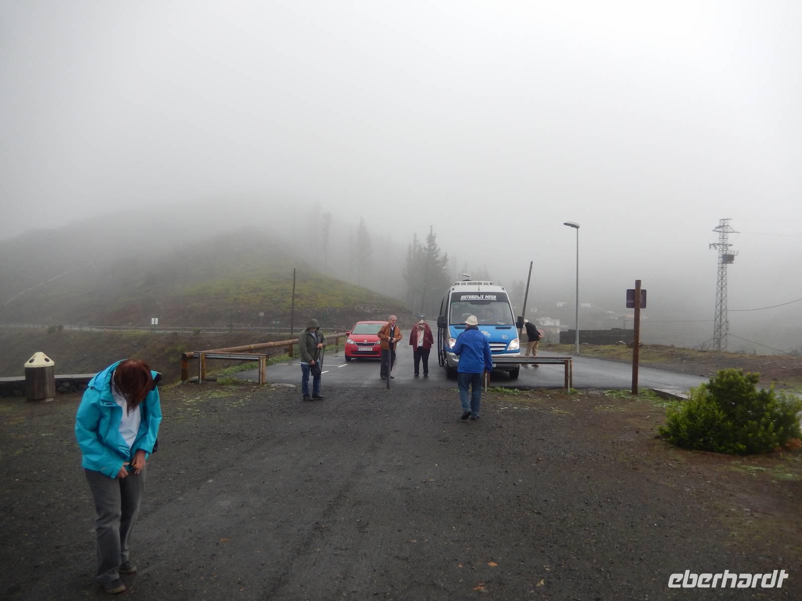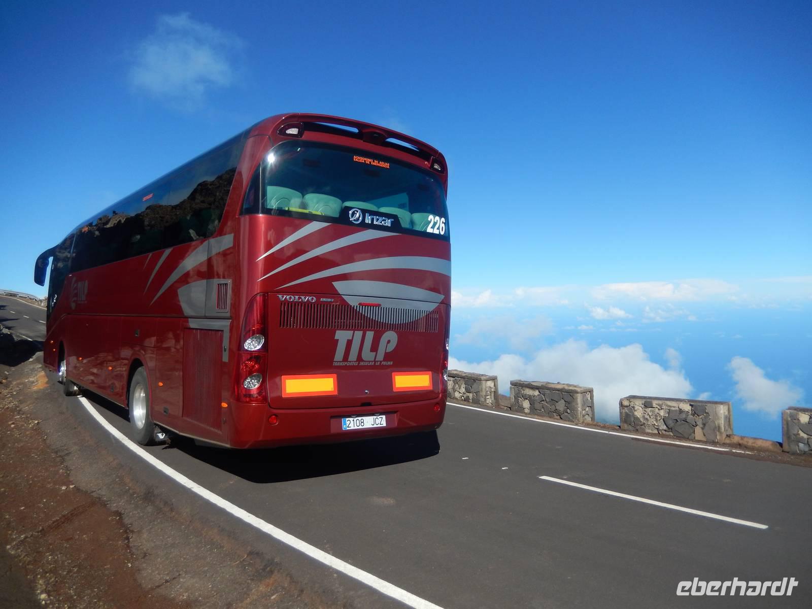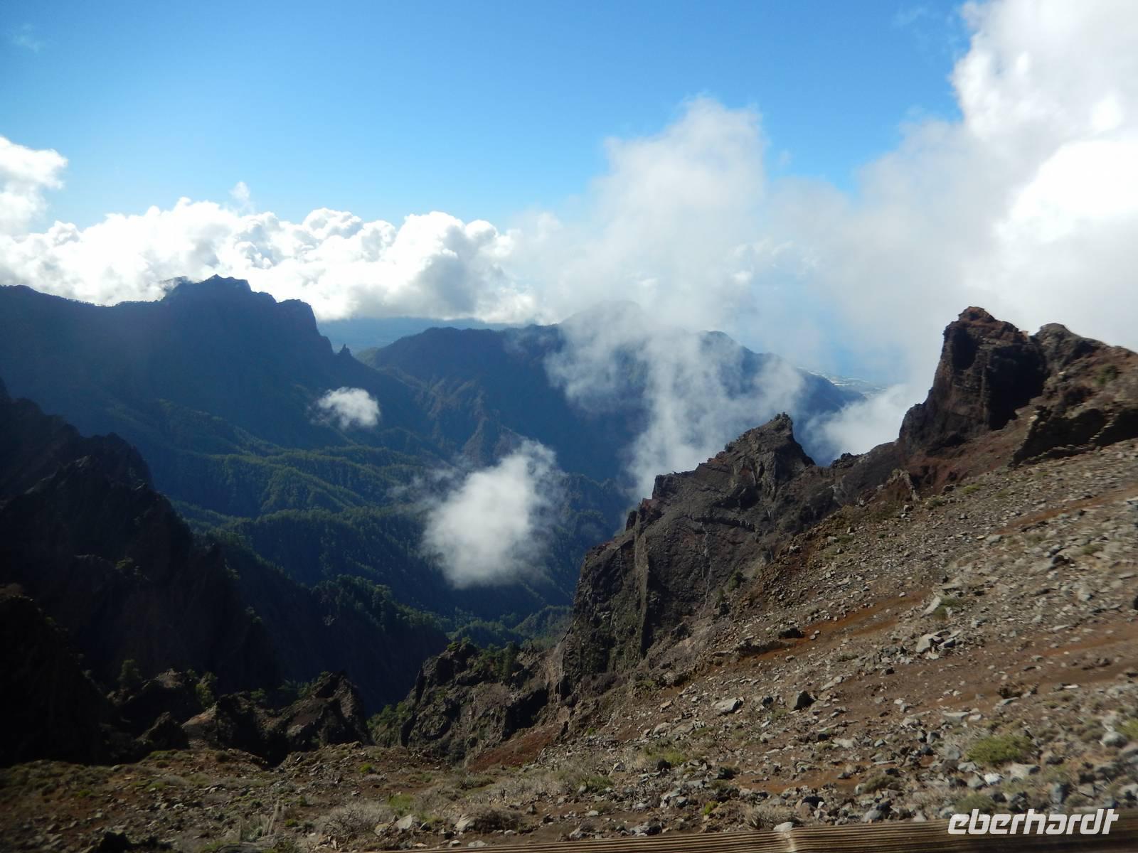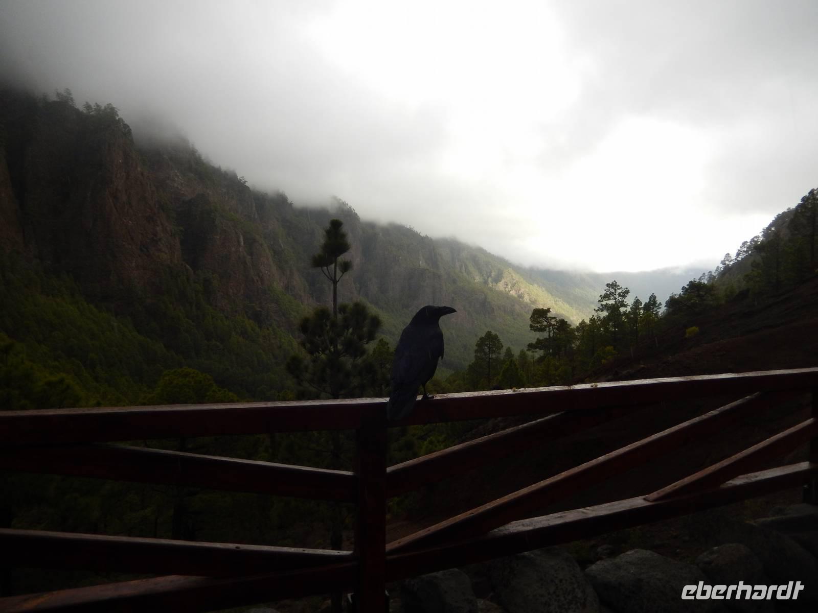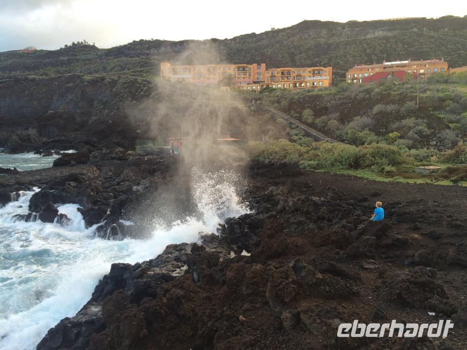 Nach einem späten Frühstück erwartet uns Reiseleiter Detlef zu einem Ausflug zum höchsten Punkt der Insel La Palma. Wir verlassen bei sonnigen und blauem Himmel den Ort Los Cancajos und fahren gen Inselmitte. Dabei fahren wir durch die Inselhauptstadt Santa Cruz, ein beschauliches Städtchen mit einem Hafen, altkanarischen Balkonhäusern und einer Nachbildung vom Kolumbus Schiff „Santa Maria". Dann beginnt die Serpentinenstraße, welche uns heute den ganzen Tag begleiten wird. Von einem höheren Punkt aus sehen wir sehr gut, dass Santa Cruz in einen Vulkankrater, welcher eine geschütze Bucht formte, gebaut ist. Wir durchqueren heute vier Vegetationszonen bis hin zum höchstes Gipfel von 2726 Metern. Detlef erklärt uns ausführlich Flora, Fauna, Landschwirtschaft und Geschichte der grünen Insel. Diese ist noch aktiv, sieben Vulkanausbrüche gab es hier in den letzten Jahrhunderten. Oft gibt es hier auch Waldbrände, wie auf allen anderen Inseln. Heute werden wir immer wieder von Regen begleitet, doch normalerweise wird es hier auf der Hochebene sehr heiß. 1993 hat es hier an einer Stelle zehn Tage lang gebrannt. Wir erreichen den Parque Natural de las Nieves und halten am Cabildo de la Palma und am Mirador de los Andenes. Hier zeigt uns Detlef die zutraulichen Raben in der Gegend, welche er füttert und welche sich ihm sogar auf die Schulter setzen. Wir haben einen guten Blick in die Caldera, aus welcher die Wolken von unten nach oben „brodeln". Spitze Lavafelsen, wechseln sich mit sattgrünen Kieferwäldern ab. Dann geht es weiter nach Oben, doch wir müssen auf der Strecke stoppen und Steine wegräumen - ein Steinschlag! Dann erreichen wir die Caldera de Taburiente mit dem Sterne Observatorium. An den Hängen sind riesige Spiegel und Teleskope angebaut. Detlef erklärt uns deren Herkunft und Funktionsweise. So gehören die riesigen Spiegel zum Beispiel der deutschen Forschung und dienen der Bestimmung von Gammastrahlung. Als wir die Roques de los Muchachos erreichen, klettert die sich auftürmende Wolkenwand langsam den Gipfel hoch. Doch wir haben Glück und können den Aussichtspunkt noch sehen, bevor der von der Wolkenwand verschlungen wird. Hier unternehmen wir einen kleinen Spaziergang und erfahren die Herkunft und Legende des Roque de los Muchachos. Nun geht es eine gefährliche Serpentinenstraße wieder hinunter ins Dörfchen Punta Gorda, wo wir ein leckeres und typisches Mittagessen genießen. So probieren wir neue, typisch lokale Köstlichkeiten, wie die sopa de picadillo, die kanarische Suppe oder den echten La Palma Wein. Auf der Weiterfahrt sehen wir in Tijarafe einen riesigen Felsen in Form eines Nashornkopfes. Wir halten am Mirador del Time, der Todeschlucht, um welche sich ebenfalls eine Legende webt. Nun haben sich die Wolken verzogen und wir haben wieder Sonne pur. Wir schlängeln uns wieder den Berg herauf, vorbei an riesigen Bananenplantagen, durch die Dörfchen Tazacorte, Los Llanos und El Paso. Unser Ziel ist die Cumbrecita, wo wir eine exklusive kleine Wanderung durch unternehmen. Für das Betreten des Parks, braucht es einer extra vorherigen Genehmigung. Wir spazieren ca. eine Stunde durch den Kieferwald und haben einen tollen Blick auf die unter uns liegende Caldera. Anschließend fahren wir zurück an die Küste zu unserem Hotel und unternehmen noch einen kleinen Spaziergang an der zerklüfteten Lavaküste. Die Wellen preschen gegen die Felsen und hinterlassen teilweise sogar richtige Sprühfontänen. Das Abendessen wird uns heute im Hotel serviert.