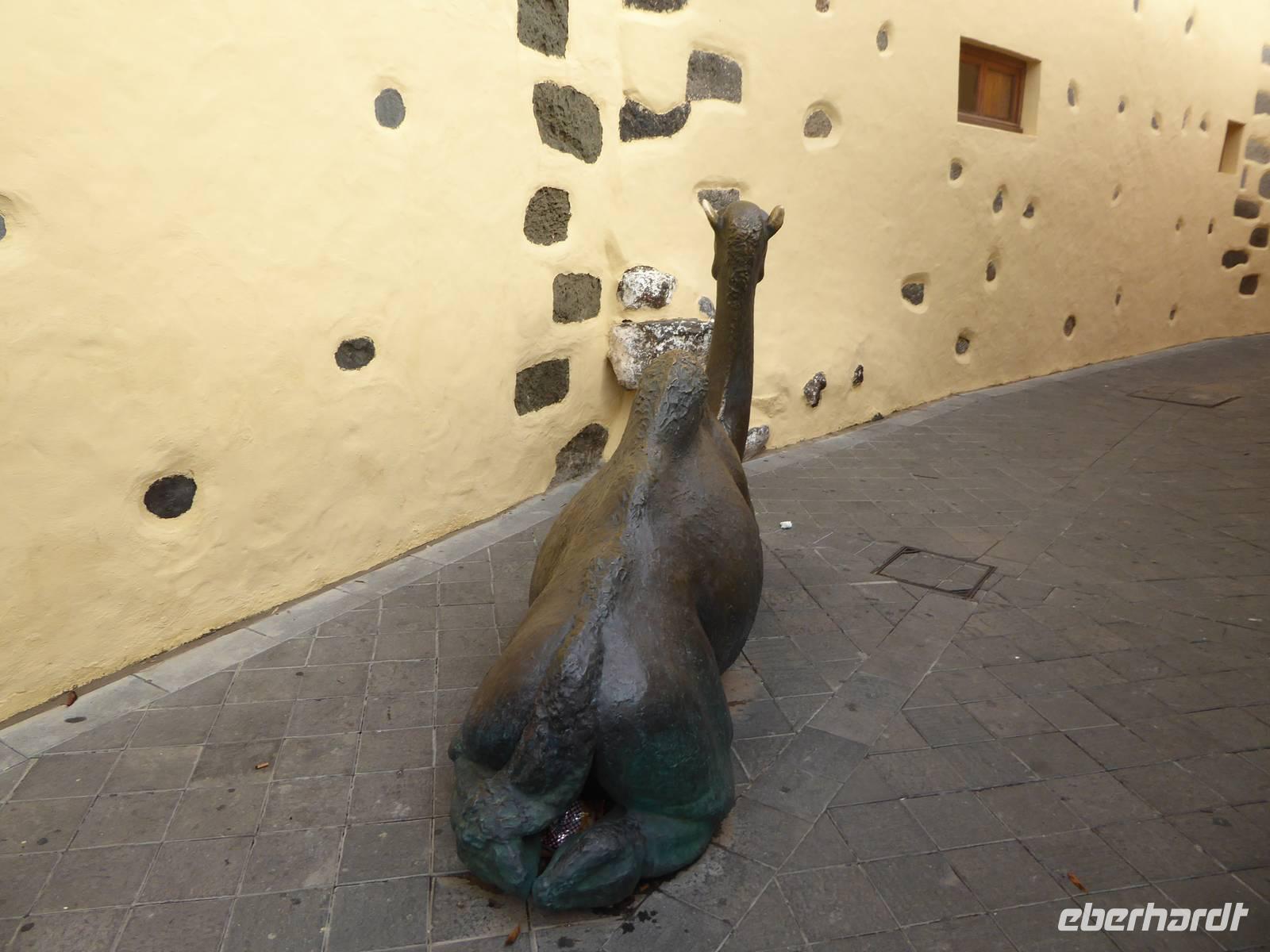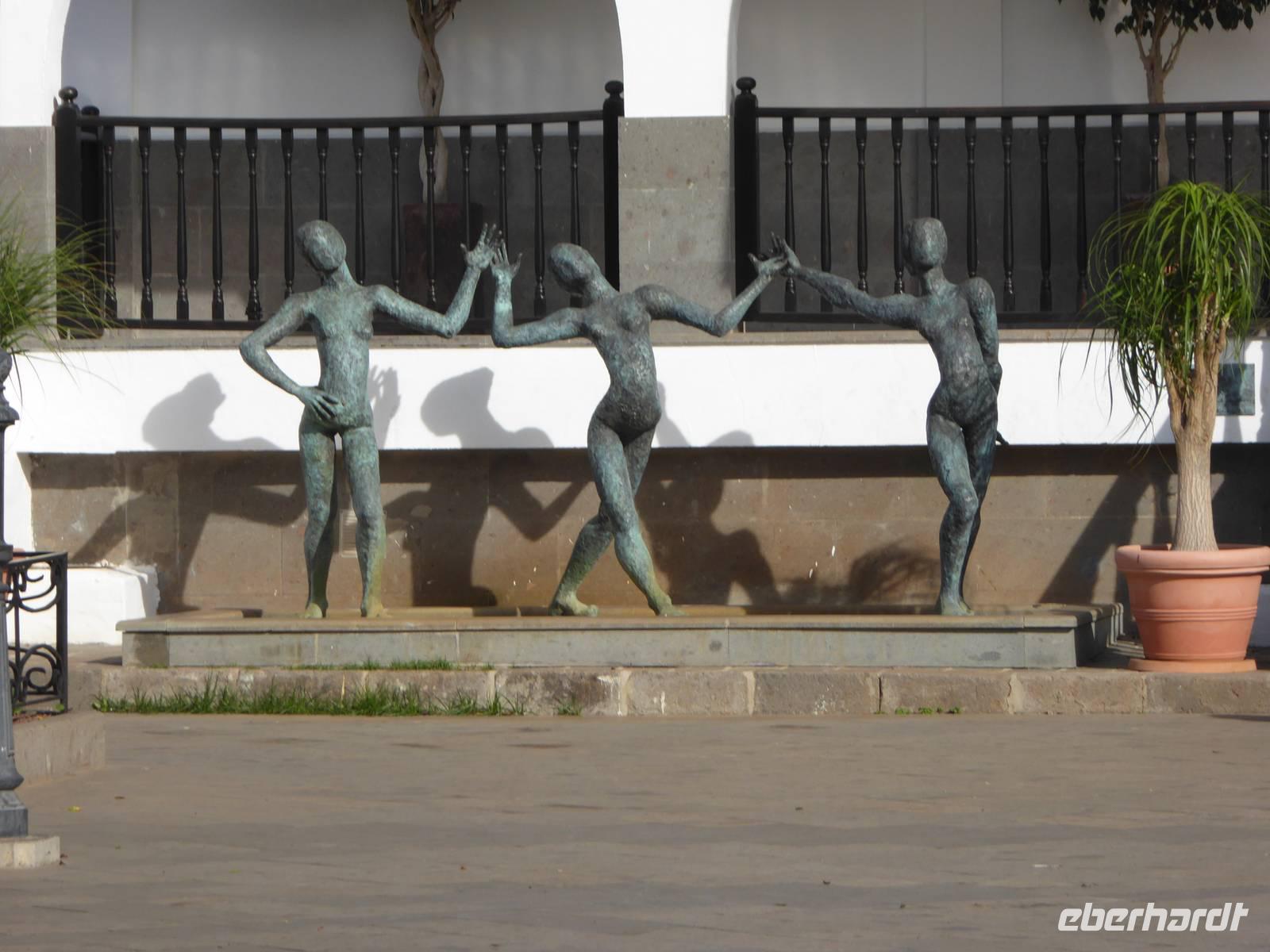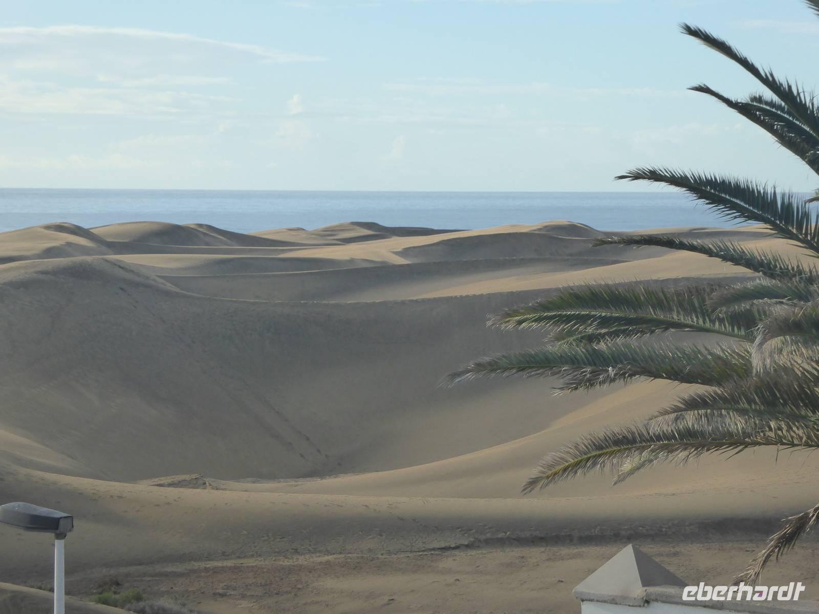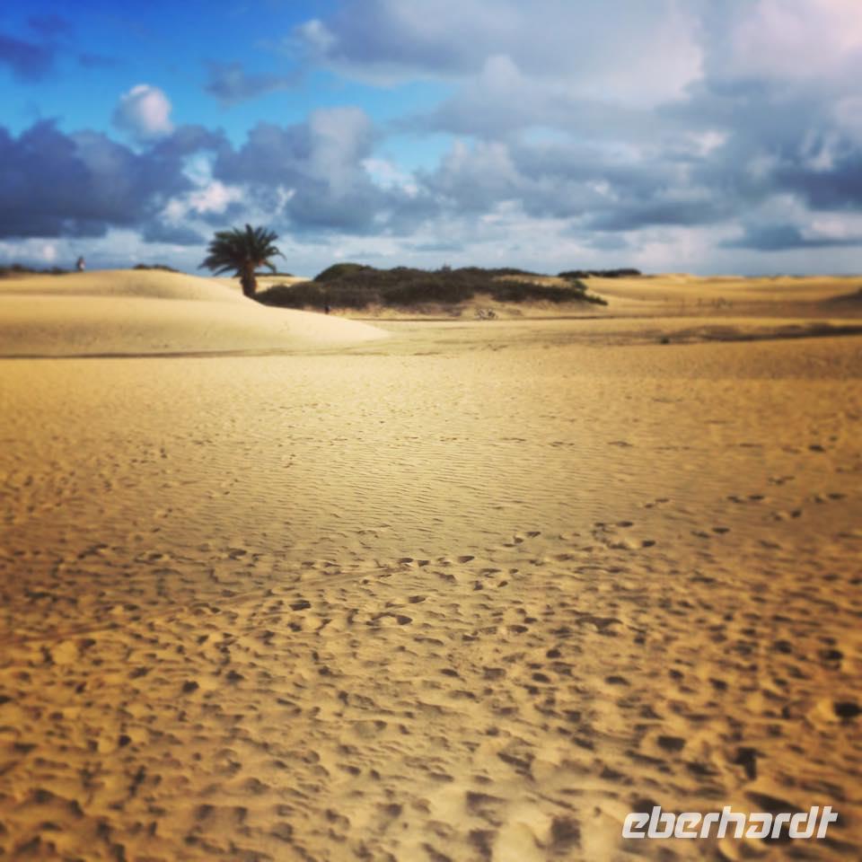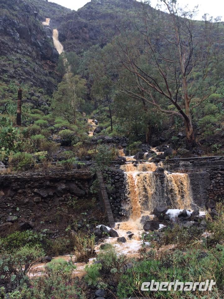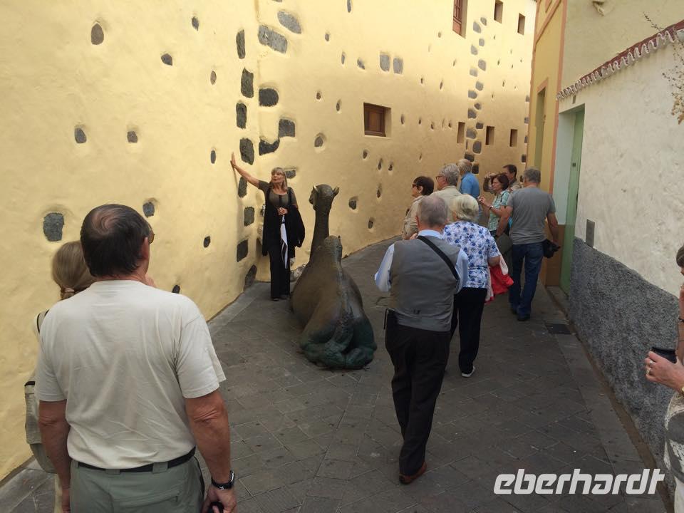 Als wir die Nachrichten am Morgen lesen, sehen wir wahre Schauerfotos von der Hauptstadt Las Palmas und Telde. Die Straßen überflutet und die Autos unter Wasser. Was wird uns wohl heute erwarten? Das Wetter spielt gerade verrückt auf den Kanaren. Um 9 Uhr werden wir von Anita abgeholt. Bevor wir zu den Ureinwohnerhöhlen fahren, gibt es noch eine kleine Überraschung: ein Morgenspaziergang an den Dünen von Maspalomas. Die Morgensonne färbt die gelben Dünen, welche aus naturhellen Sand bestehen. Eigenartig, denn auf den Kanaren findet man fast nur schwarzen Natursand. Dann fahren wir weiter in die Berge, denn das Wetter ist gerade traumhaft schön. Wir hoffen es bleibt noch eine Weile so! Auf dem Weg erläutert uns Anita wie es zum Namen Playa del Ingles (Strand des Engländers) kam und auch die Vorzüge der Kanaren. Der Tourismus gedeiht aufgrund der politischen Ruhe und des tollen Klimas. Hier wird es selten unerträglich heiß, es gibt auch im Winter noch angenehme Temperaturen um die 20 Grad und im Sommer weht stehts eine kühlende Atlantikbrise. Ebenso erfahren wir, dass der Name Canario eigentlich von dem Ureinwohnerwort „Can" = Hund stammt. Die ist darauf zurückzuführen, dass die Ureinwohner Canarios früher in der Hundezüchtung tätig waren. Auf dem Weg nach Agüimes sehen wir eine riesige Figur eines kanarischen Speerspringers. Zu alten Zeiten sind die Canarios auf ihren Speeren von Fels zu Fels gesprungen. Dann erreichen wir schon das beschauliche Städtchen Agüimes und unternehmen einen Spaziergang durch die Stadt. Auffällig für das Städtchen sind die überall zu findenden Bronzefiguren, welche das alte Leben der Canarios in dem Städtchen widerspiegeln. So sehen wir zum Beispiel einen riesigen Dromedar vor dem Kamelhaus in der Gasse liegen, die Verliebtenecke und auf dem Hauptplatz Figuren von Vorlesern und weitere typische Straßenszenen. Ein seltsames Gewächs kommt uns hier auch zu Gesicht: der schöne Baum namens „El Rabo de Calamar". Unseren Weg zieren typische Casas Canarias: die traditionellen Steinhäuser der Kanaren aus Lavagestein. Wir spazieren bis zur Iglesia de San Sebastian mit dem idyllischen Dorfplatz und haben hier etwas Freizeit um den Altstadtkern zu erkunden. Anschließend fahren wir weiter zwischen Agüimes und Ingenio durch den Barranco de Guayadeque, welcher die zwei Städte voneinander trennt. Eine tolle Aussicht hinunter in die Schlucht und auf die umliegende Bergwelt mit faszinierenden Felsformationen begleitet uns. In den Felswänden des Barrancos sehen wir schon die ersten Höhlenbehausungen. Viele Bienenkästen stehen hier an den Felswänden, denn diese sind ein wichtiger Bestandteil der hier befindlichen Einkommensquelle. Ihre Wasservorräte entnehmen die Bewohner auch heute noch aus den Felsquellen des Barrancos. Dann begeben wir uns auf einen Spaziergang um einen dieser Berge herum. Wir kommen an Felswohnungen vorbei und dürfen bei einer herzlichen Dame sogar in die Wohnung eintreten. Hier sehen wir eine originale Höhlenwohnung. Sehr dunkel ist es drinnen, doch auch sehr gemütlich. Anschließend gelanden wir an den Ausgangspunkt unseres Spaziergangs: das Höhlenrestaurant. Hier wird uns in einer gemütlichen Höhle ein typisch kanarisches Menü serviert. Begleitet von kanarischem Wein probieren wir den Potaje, Schweinefleisch oder Fisch und den Gofiomousse. Gut das wir im Trockenen sitzen, denn draußen braut sich ein unheimliches Unwetter zusammen. Regenmassen stürzen herunter und die Straße schwimmt wortwörtlich. Als wir gerade Richtung Telde aufbrechen wollten, heißt es schon: nur schnell herunter vom Berg - Katastrophenwarnung! Wir beeilen uns und bekommen auf unserem Rückweg tolle Fotomotive geboten, welche nur selten die Besucher von Gran Canaria zu sehen bekommen. Tosende Bergflüsse und Wasserfälle, welche von den steilen Berghängen herunterfallen bekommen wir zu Gesicht. Die Straße nach Telde ist leider schon gesperrt aufgrund von Steinschlaggefahr. Die gesamte Stadt soll im Ausnahmezustand sein, daher müssen wir heute auf den anschließenden Spaziergang durch das Stadtviertel verzichten. Unten im Süden erwarten uns wieder strahlender Sonnenschein und gefühlte 35 Grad. Perfektes Wetter für einen letzten freien Nachmittag in Playa del Ingles. Zum Abendessen treffen wir uns alle wieder und stoßen nach dem Essen mit einem Glas Sekt auf unseren letzten gemeinsamen Abend an. Nach einem lustigen Abendausklang gehen einige von uns noch zur tollen Akrobatikshow im Hotel. Dann heißt es schon Packen oder einen letzten Strandspaziergang unternehmen.