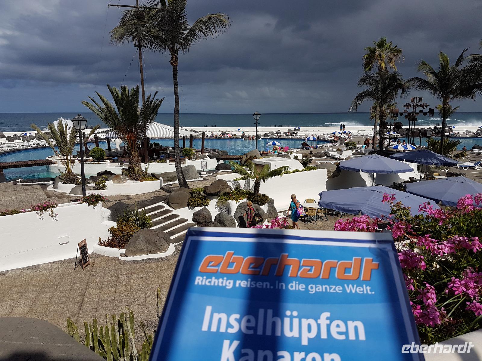 Unsere schöne Terrasse mit Blick zum Meer wartet auf uns zum Frühstücken. Heute machen wir wieder einen tollen Ausflug. Diesmal geht's in den Norden der Insel. Alle Gäste kamen mit, außer zwei Ehepaare, die wollten lieber faulenzen: Strand, Pool und Fahrt mit öffentlichen Bus nach Santa Cruz de La Palma.