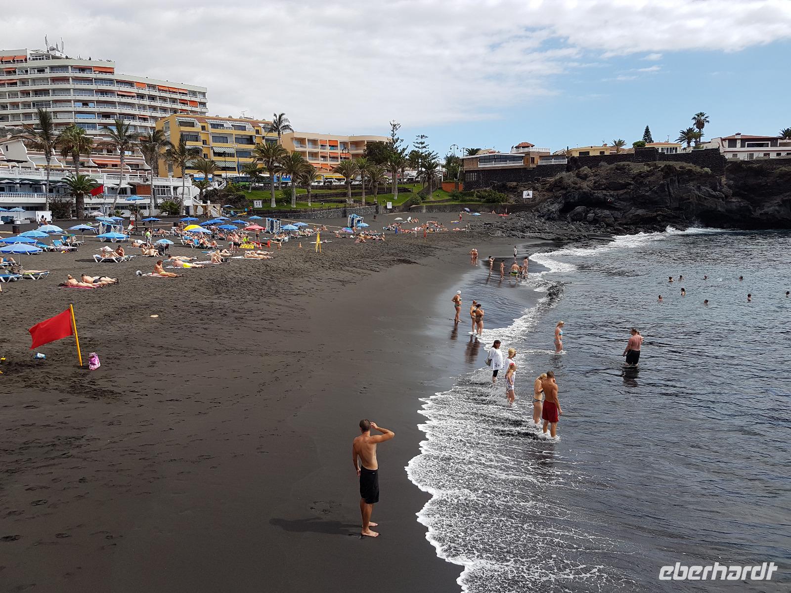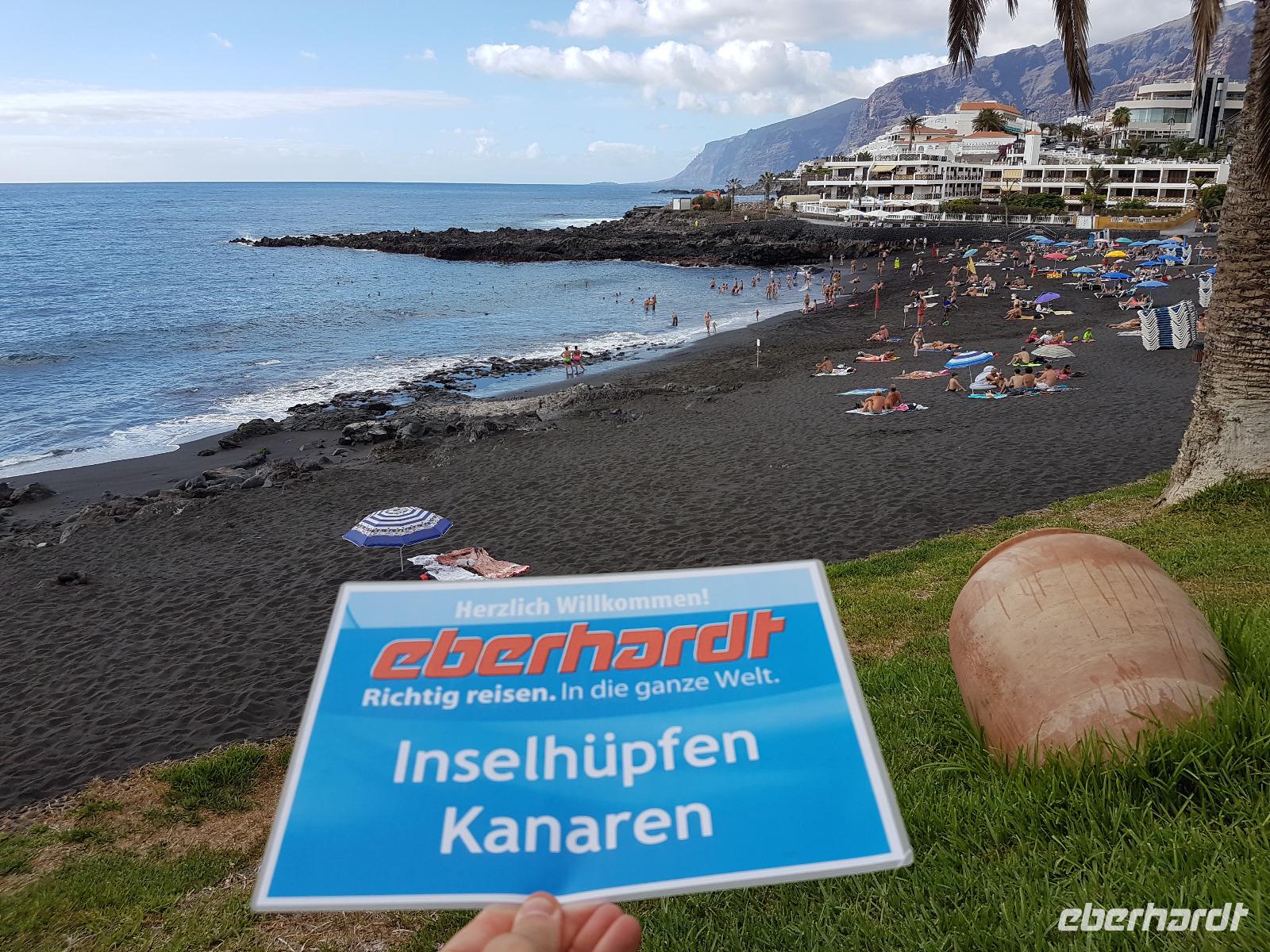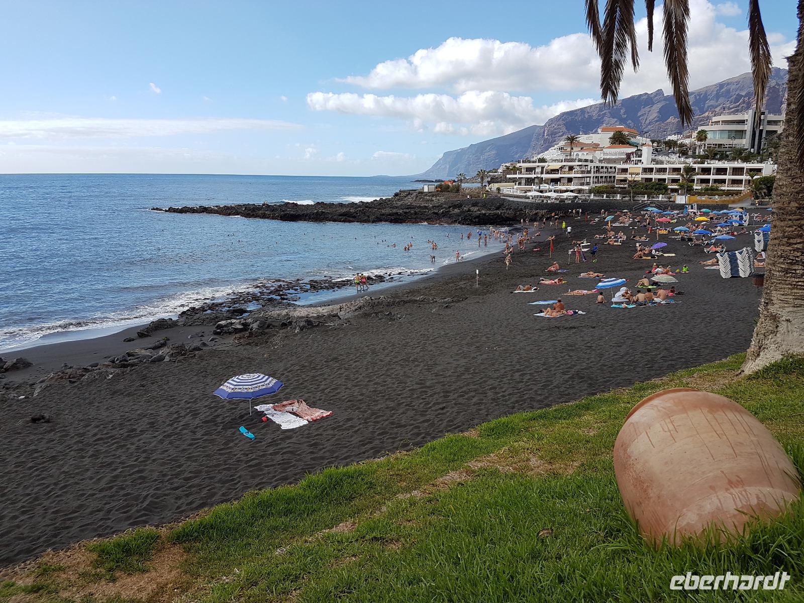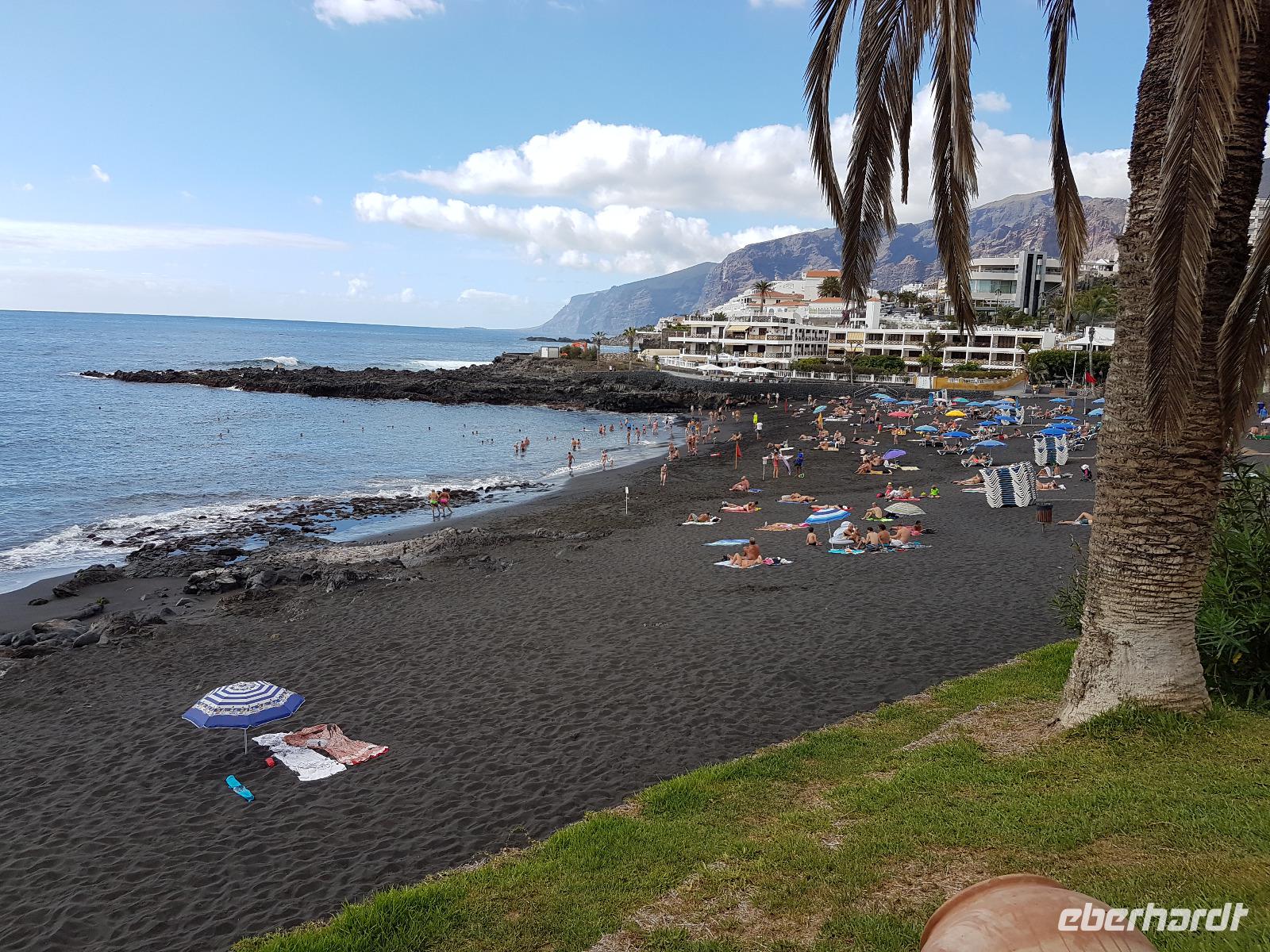 Einige folgen dem Vorschlag von Gisela und essen hier zum ersten Mal ein Barraquito: kanarischen Kaffe mit nicht nur Milch, sondern auch Kondensmilch, Zitronenschale, Zimt und drei Tropfen Orangen-Likör. Weiter geht es nach "Icod de los Vinos", wo sich der älteste „Drago Milenario" (Drachenbaum) befindet. Uns gefällt es sehr und wir machen mit dem schönen Baum im Hintergrund das erste Gruppenfoto. Für die, die morgen den Ausflug nach Garachico nicht gebucht haben, machen wir auch einen Stopp bei einem Aussichtspunkt mit Blick auf Garachico, wo man wieder einen Barraquito Kaffee trinken kann. Anschließend fuhren wir nach Los Gigantes über den Erjo Pass. Es ändert sich ständig heute die Vegetation und das Klima. Herrlich! Unterhalb von El Mirador Archipenque Aussichtspunkt können wir die Steilküsten von Los Gigantes fotografieren. Steinwände, Klippen und Felsen, die über 500 Meter über das Meer hoch sind. Wir bestaunen vor uns eine der höchsten Steilküsten in Europa. Wir haben heute zum Mittag nicht viel gegessen, da Benjamin eine Überraschung für uns alle vorbereitet hat. Am Strand Playa de La Arena, wo Benjamin eine Ferienwohnung hat und dort mal lebte, organsierte er direkt am Meer auf der Neptuno Terrasse einen langen Tisch nur für Eberhardt Travel Gäste. Wir sitzen in der Sonne und der Kellner brachte Sangria, Chopitos und Calamares (kleine panierte Baby-Tintenfische) und Tomaten mit Thunfischsalat. Drei von uns gingen baden. Es war einfach herrlich.
