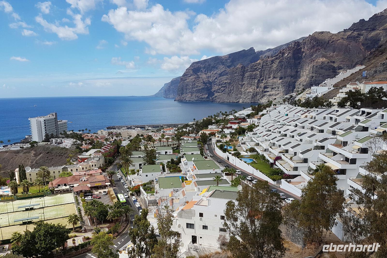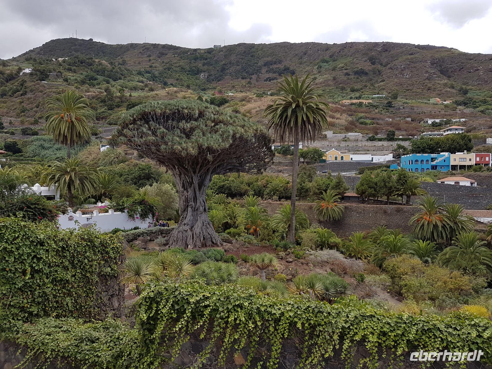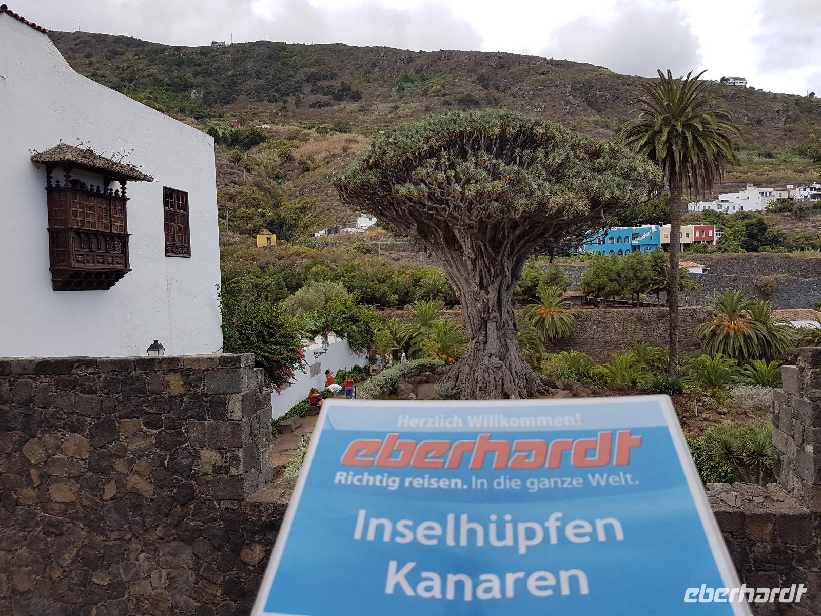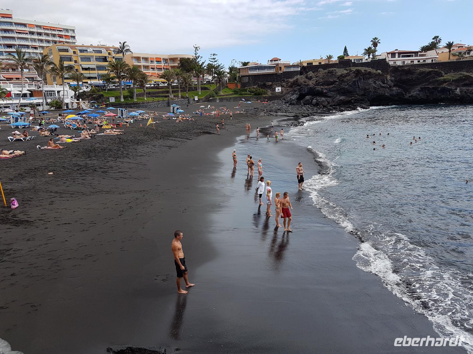 Einige folgen dem Vorschlag von Gisela und essen hier zum ersten Mal ein Barraquito: kanarischen Kaffe mit nicht nur Milch, sondern auch Kondensmilch, Zitronenschale, Zimt und drei Tropfen Orangen-Likör. Weiter geht es nach "Icod de los Vinos", wo sich der älteste „Drago Milenario" (Drachenbaum) befindet. Uns gefällt es sehr und wir machen mit dem schönen Baum im Hintergrund das erste Gruppenfoto. Für die, die morgen den Ausflug nach Garachico nicht gebucht haben, machen wir auch einen Stopp bei einem Aussichtspunkt mit Blick auf Garachico, wo man wieder einen Barraquito Kaffee trinken kann. Anschließend fuhren wir nach Los Gigantes über den Erjo Pass. Es ändert sich ständig heute die Vegetation und das Klima. Herrlich! Unterhalb von El Mirador Archipenque Aussichtspunkt können wir die Steilküsten von Los Gigantes fotografieren. Steinwände, Klippen und Felsen, die über 500 Meter über das Meer hoch sind. Wir bestaunen vor uns eine der höchsten Steilküsten in Europa. Wir haben heute zum Mittag nicht viel gegessen, da Benjamin eine Überraschung für uns alle vorbereitet hat. Am Strand Playa de La Arena, wo Benjamin eine Ferienwohnung hat und dort mal lebte, organsierte er direkt am Meer auf der Neptuno Terrasse einen langen Tisch nur für Eberhardt Travel Gäste. Wir sitzen in der Sonne und der Kellner brachte Sangria, Chopitos und Calamares (kleine panierte Baby-Tintenfische) und Tomaten mit Thunfischsalat. Drei von uns gingen baden. Es war einfach herrlich.