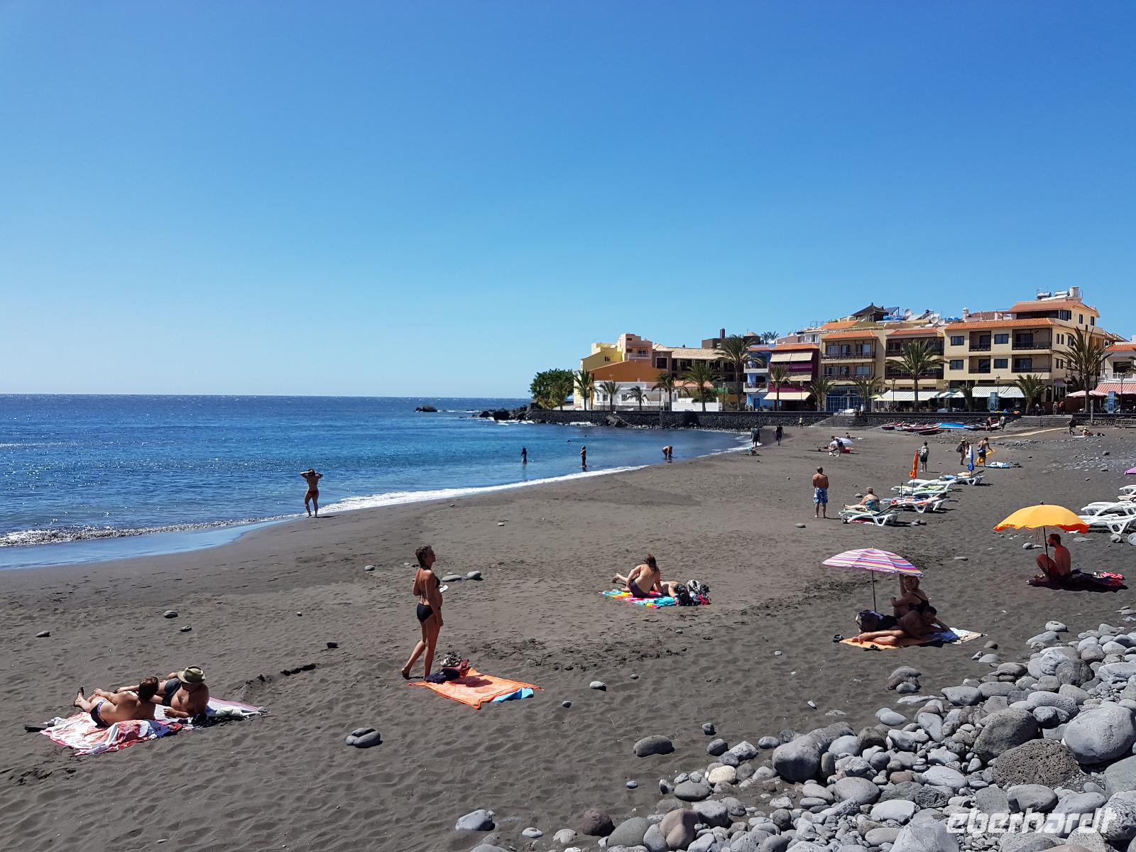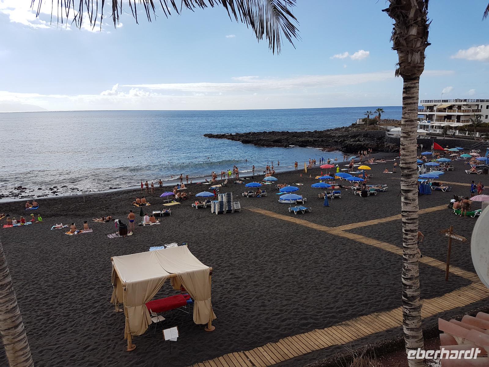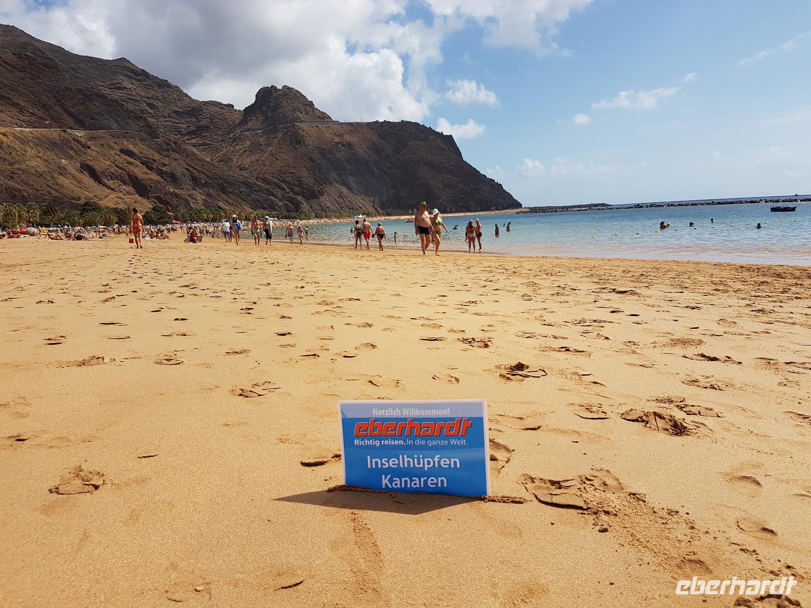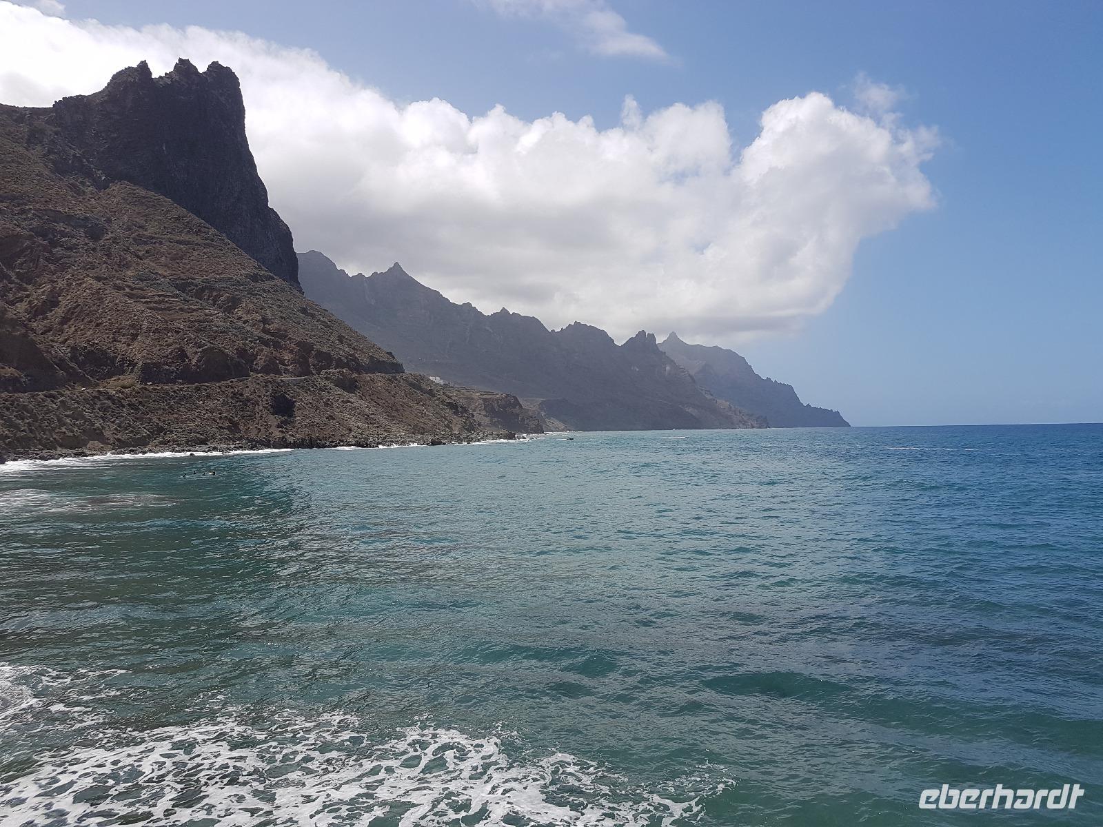 Einige folgen dem Vorschlag von Gisela und essen hier zum ersten Mal ein Barraquito: kanarischen Kaffe mit nicht nur Milch, sondern auch Kondensmilch, Zitronenschale, Zimt und drei Tropfen Orangen-Likör. Weiter geht es nach "Icod de los Vinos", wo sich der älteste „Drago Milenario" (Drachenbaum) befindet. Uns gefällt es sehr und wir machen mit dem schönen Baum im Hintergrund das erste Gruppenfoto. Für die, die morgen den Ausflug nach Garachico nicht gebucht haben, machen wir auch einen Stopp bei einem Aussichtspunkt mit Blick auf Garachico, wo man wieder einen Barraquito Kaffee trinken kann. Anschließend fuhren wir nach Los Gigantes über den Erjo Pass. Es ändert sich ständig heute die Vegetation und das Klima. Herrlich! Unterhalb von El Mirador Archipenque Aussichtspunkt können wir die Steilküsten von Los Gigantes fotografieren. Steinwände, Klippen und Felsen, die über 500 Meter über das Meer hoch sind. Wir bestaunen vor uns eine der höchsten Steilküsten in Europa. Wir haben heute zum Mittag nicht viel gegessen, da Benjamin eine Überraschung für uns alle vorbereitet hat. Am Strand Playa de La Arena, wo Benjamin eine Ferienwohnung hat und dort mal lebte, organsierte er direkt am Meer auf der Neptuno Terrasse einen langen Tisch nur für Eberhardt Travel Gäste. Wir sitzen in der Sonne und der Kellner brachte Sangria, Chopitos und Calamares (kleine panierte Baby-Tintenfische) und Tomaten mit Thunfischsalat. Drei von uns gingen baden. Es war einfach herrlich.