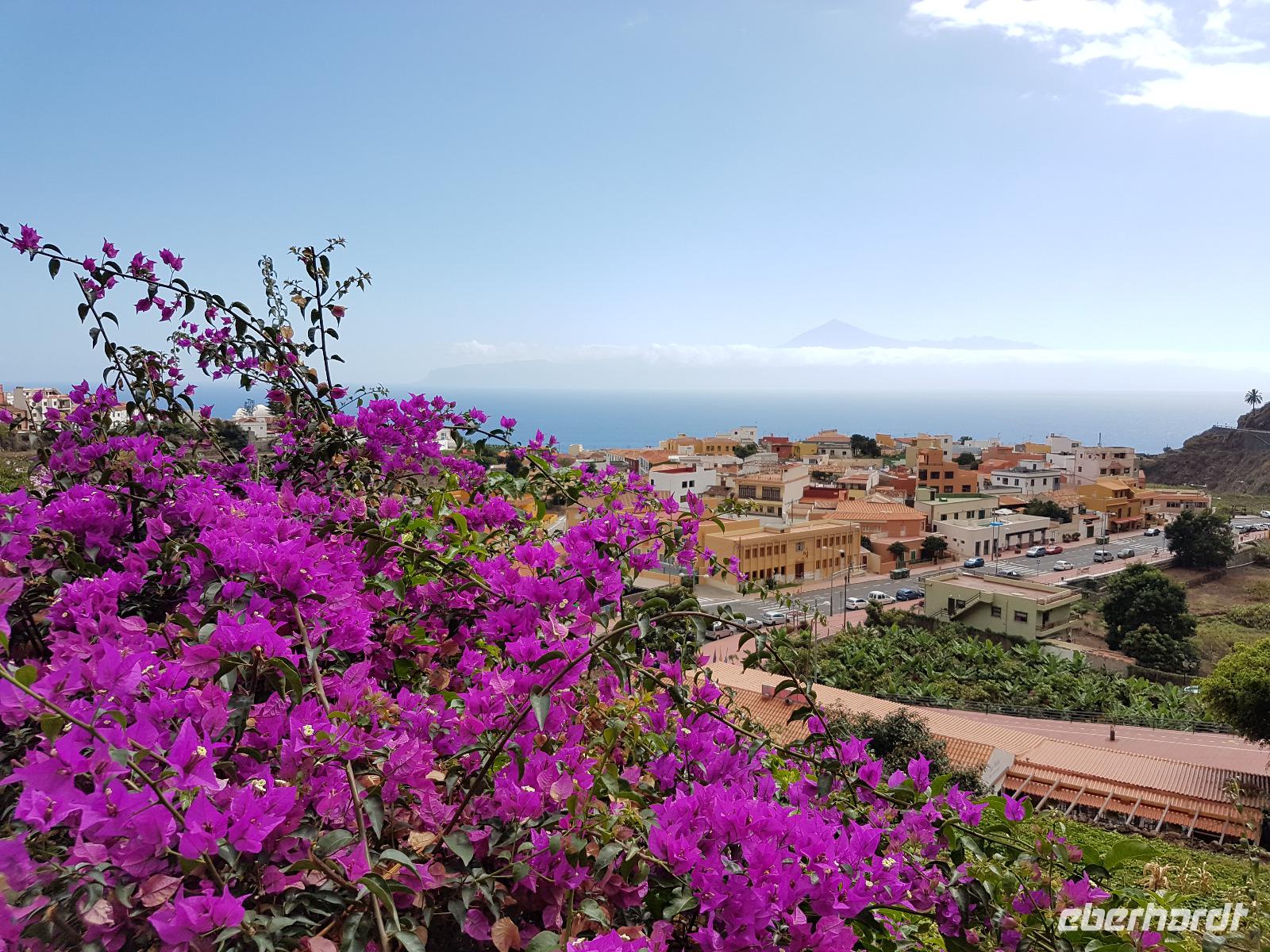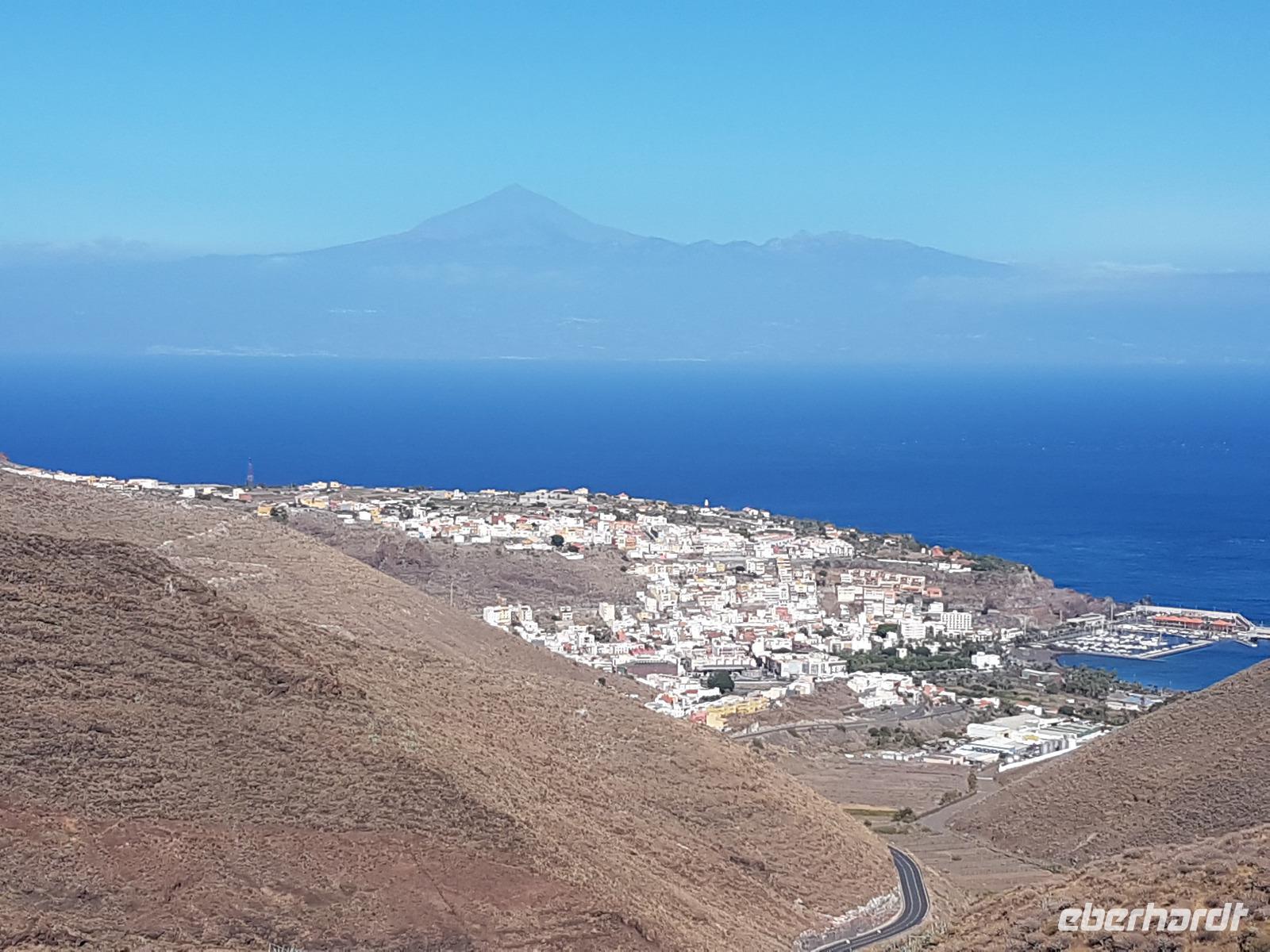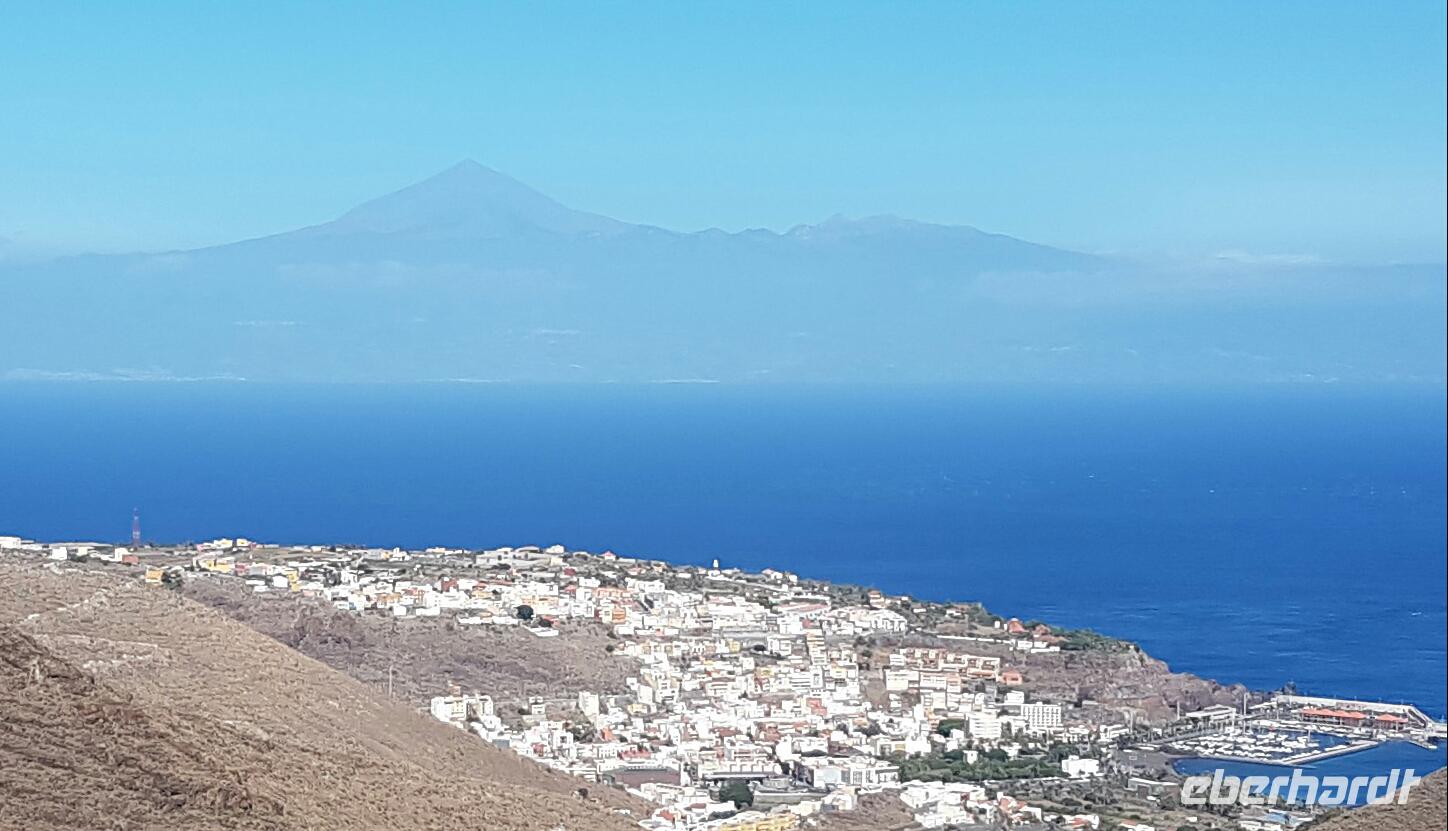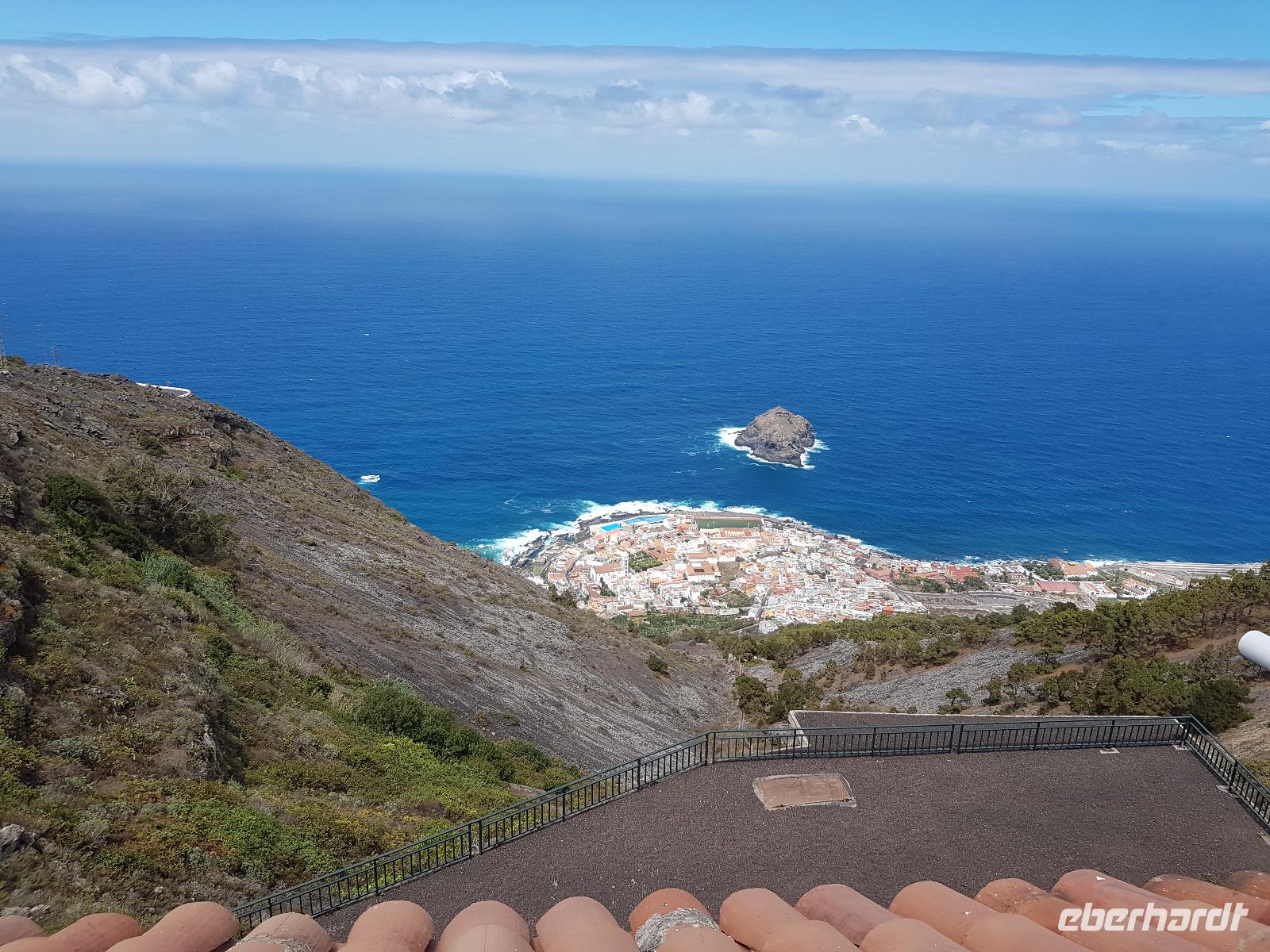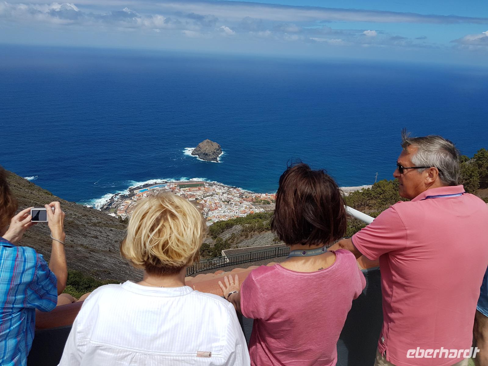 Die Vögel wecken uns heute. Unser Hotel Torrel del Conde lieg direkt im Zentrum der kleinen Haupstadt. Nach einem ruhigen Frühstück bringen wir unsere Koffer schon zum Bus, da wir heute Abend direkt zum Hafen fahren werden. Mit Melanie fuhren wir von der Nordwest-Küste nach Südost und machen dort eine schöne Inselrundfahrt. Das Wetter war heute wieder prima und je später es wird, desto schöner wird es. Erster wichtiger Stopp war in Agulo, wo wir die Hauptkirche und die schöne Stadt besichtigen. Wir fuhren zum Besucherzentrum des National Parks Garajonay, wo Melanie uns sehr viel über die Natur hier erklärt und gemeinsam wir ein Video guckten. Weiter fuhren wir bis zum Aussichspunkt Abrantes, wo es einen Skywalk, wie am Grand Canyon gibt. Es ist schon Zeit zum Mittagessen und Eberhardt Travel hatte heute hier zum ersten Mal das Mittagsessen hier direkt am Fenster mit Blick auf den Teide. Unvergesslich!