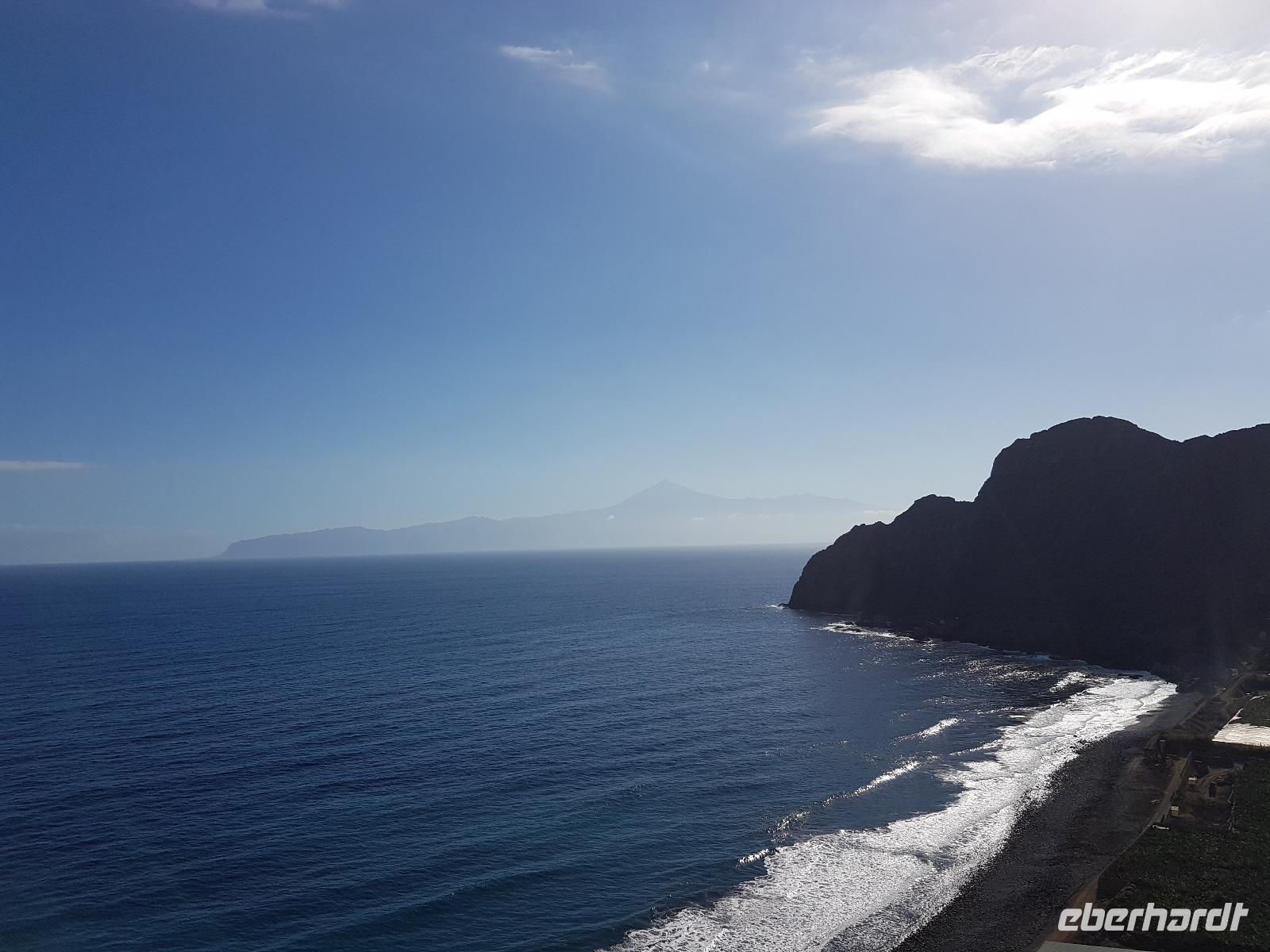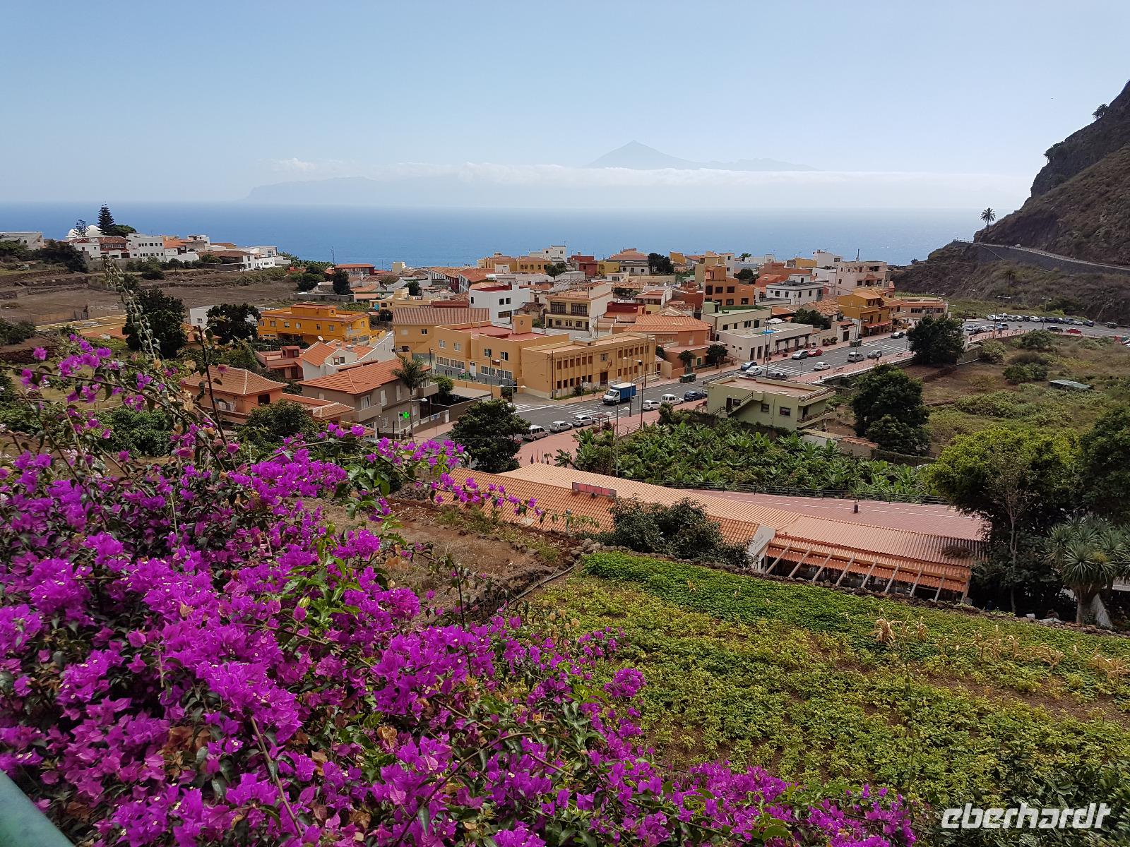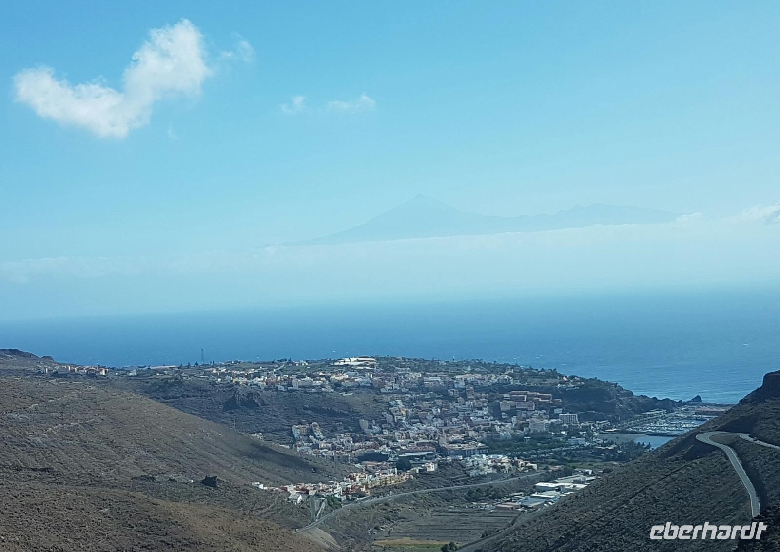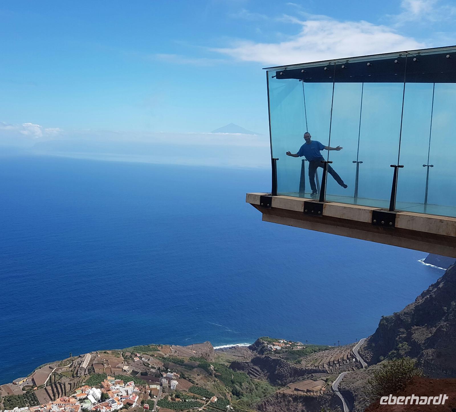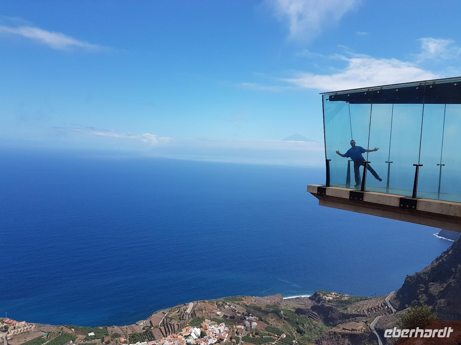 Die Vögel wecken uns heute. Unser Hotel Torrel del Conde lieg direkt im Zentrum der kleinen Haupstadt. Nach einem ruhigen Frühstück bringen wir unsere Koffer schon zum Bus, da wir heute Abend direkt zum Hafen fahren werden. Mit Melanie fuhren wir von der Nordwest-Küste nach Südost und machen dort eine schöne Inselrundfahrt. Das Wetter war heute wieder prima und je später es wird, desto schöner wird es. Erster wichtiger Stopp war in Agulo, wo wir die Hauptkirche und die schöne Stadt besichtigen. Wir fuhren zum Besucherzentrum des National Parks Garajonay, wo Melanie uns sehr viel über die Natur hier erklärt und gemeinsam wir ein Video guckten. Weiter fuhren wir bis zum Aussichspunkt Abrantes, wo es einen Skywalk, wie am Grand Canyon gibt. Es ist schon Zeit zum Mittagessen und Eberhardt Travel hatte heute hier zum ersten Mal das Mittagsessen hier direkt am Fenster mit Blick auf den Teide. Unvergesslich!