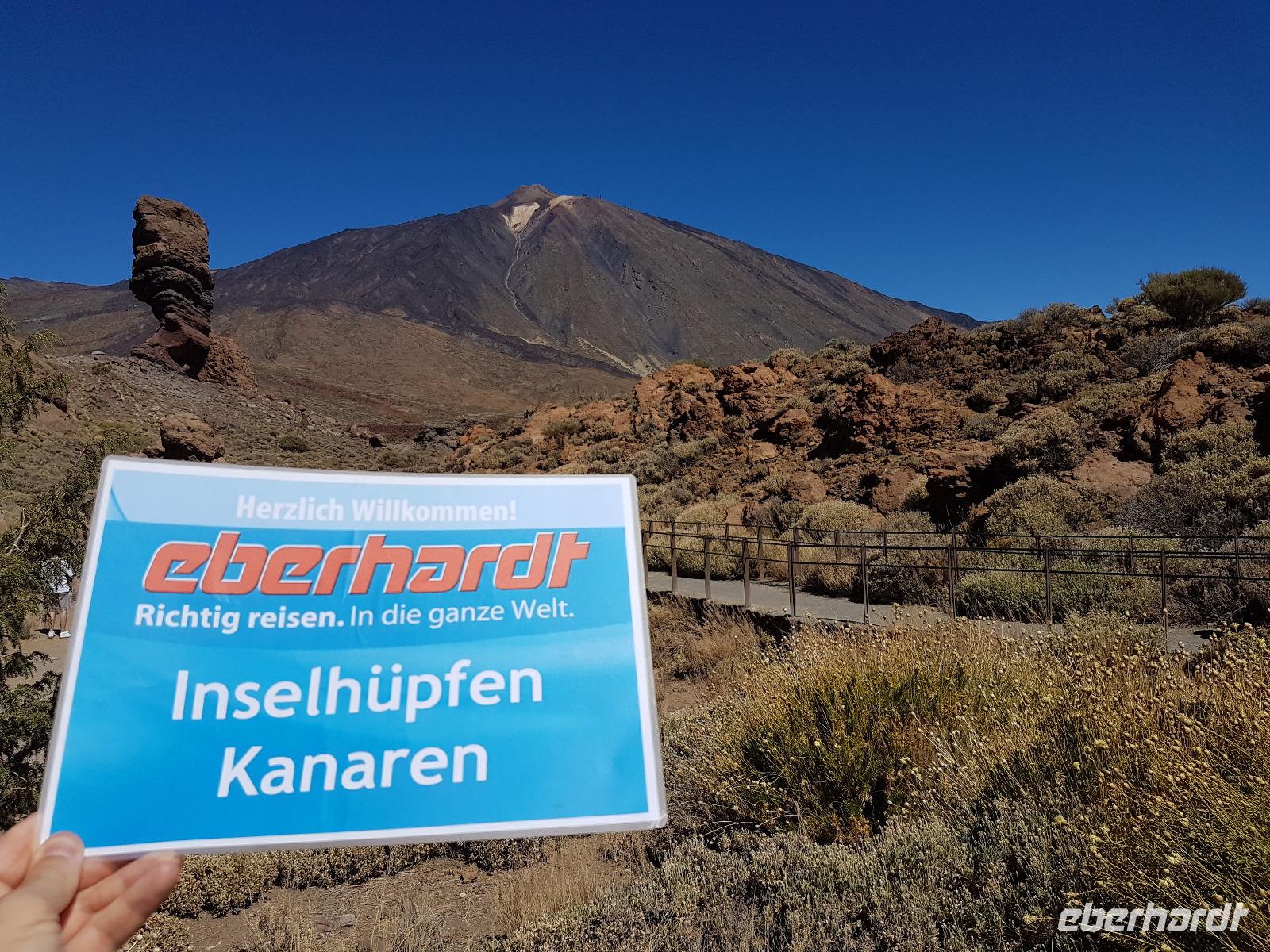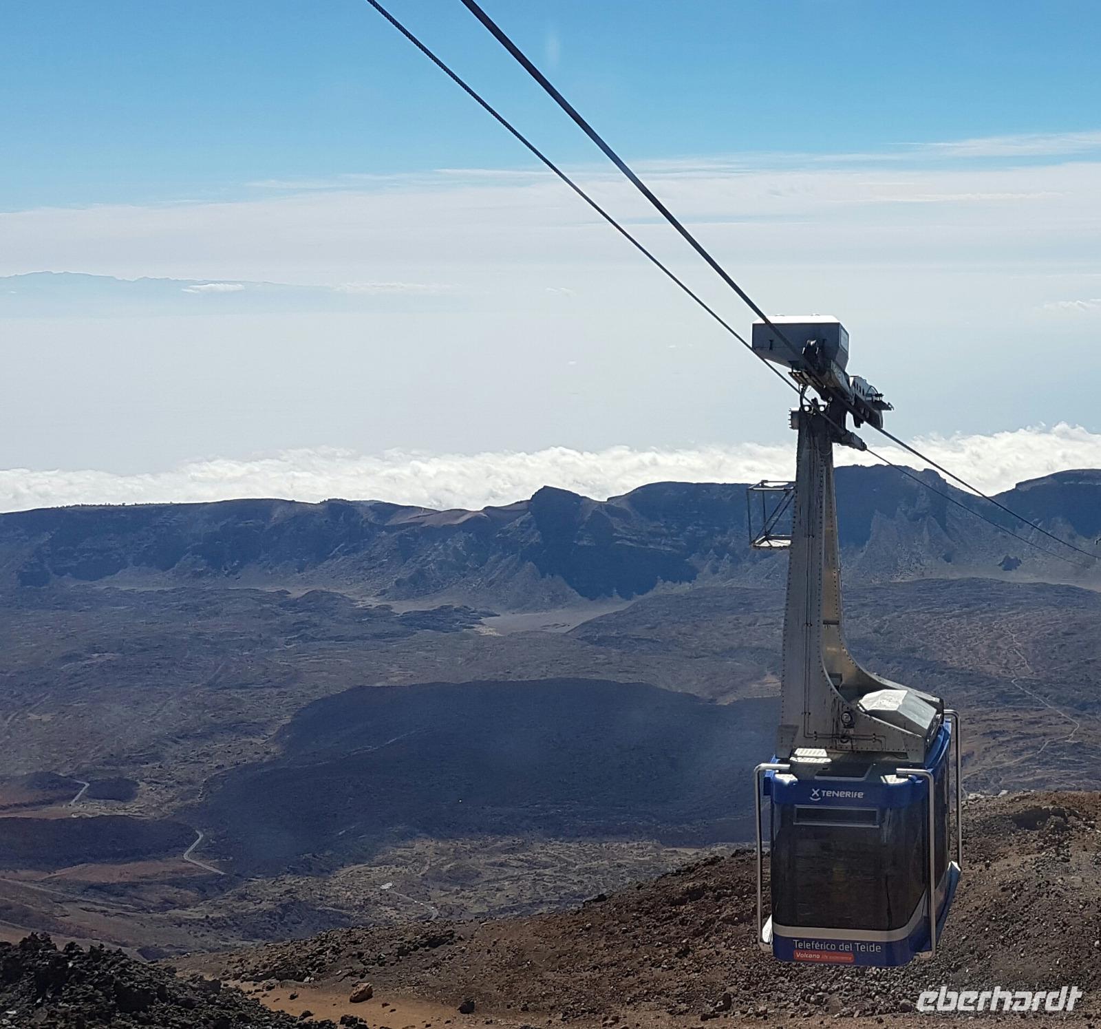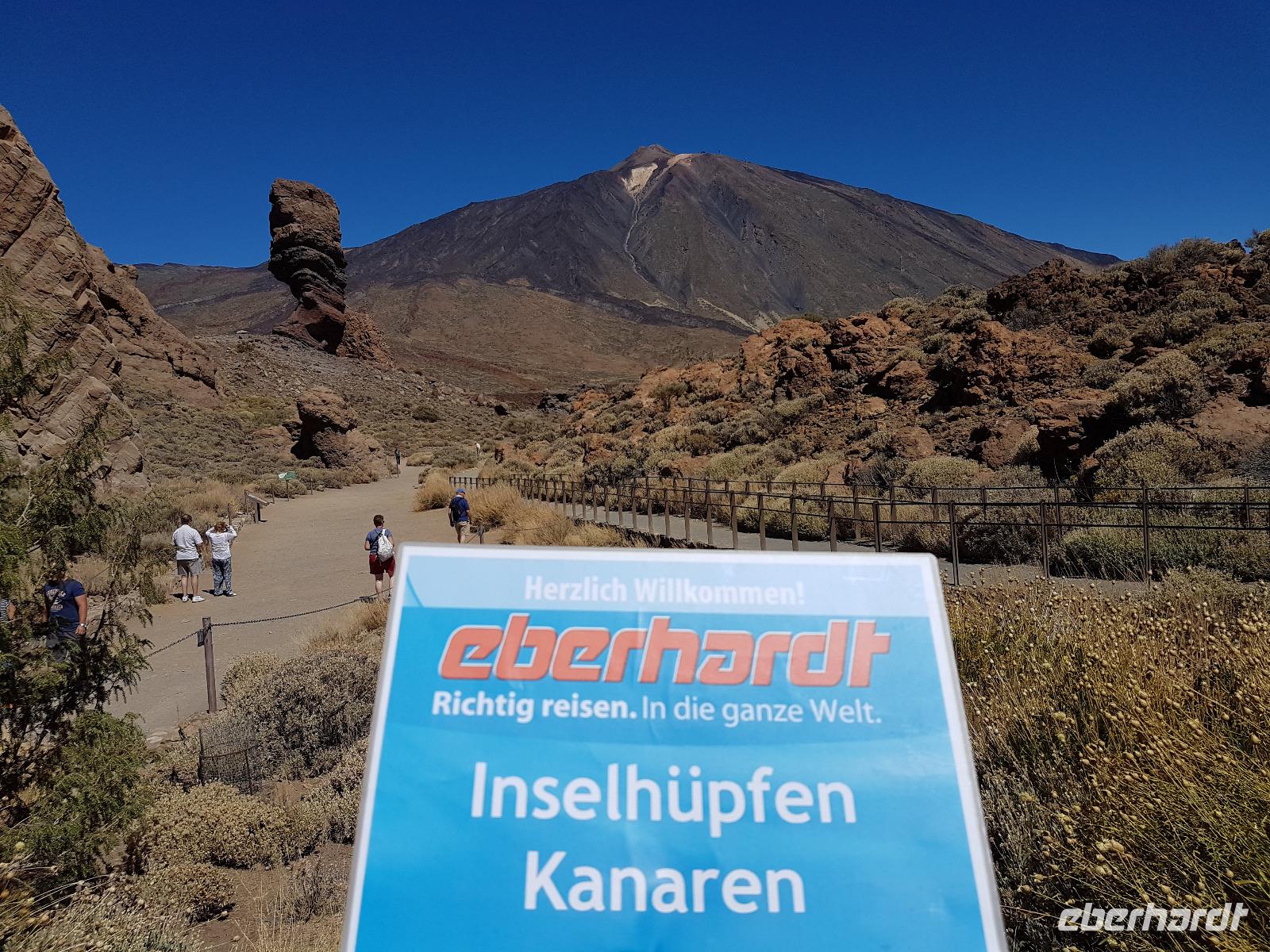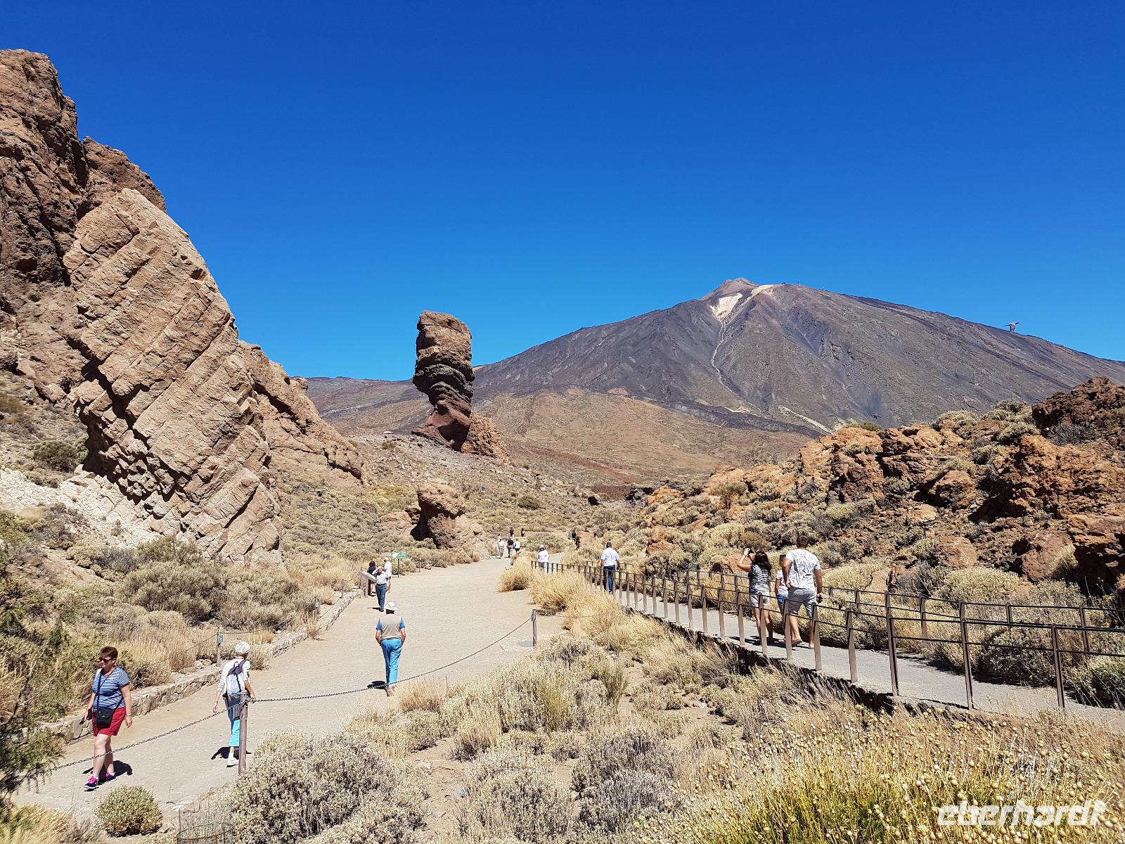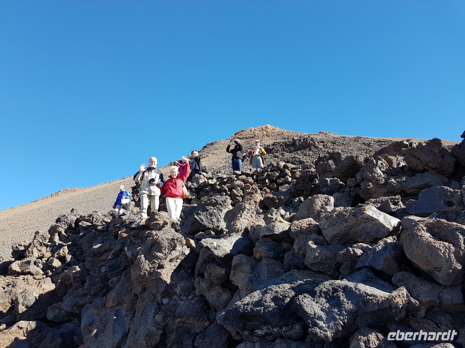 An der Seilbahnstation fuhren wir mit der Seilbahn bis zu 3.500 Meter hoch, 1000 Meter Unterschied in nur knapp 5 Minuten. Von hier oben kann man La Gomera, La Palma und Gran Canaria sehen. Es ist heute windig, aber dafür ist die Sicht sehr klar. Wir machen einen kleinen Spaziergang bis Pico Viejo. Und alle alle kommen mit. Ich bin stolz auf meine Truppe;) Der Teide ist mit 3.718m die höchste Erhebung Teneriffas. Ein schlafender Vulkan, der irgendwann mal hier oder woanders aufwachen könnte. Wieder unten, fahren wir bis Los Roques de Garcia, ein bizarre lustige Felsformation, wo Gisela das klassische Eberhardt Travel-Gruppenfoto mit dem Teide im Hintergrund machte.