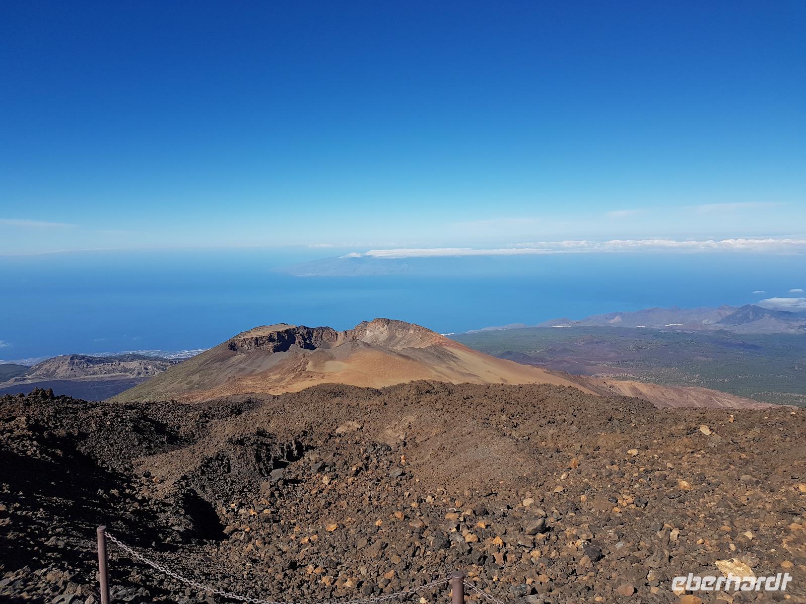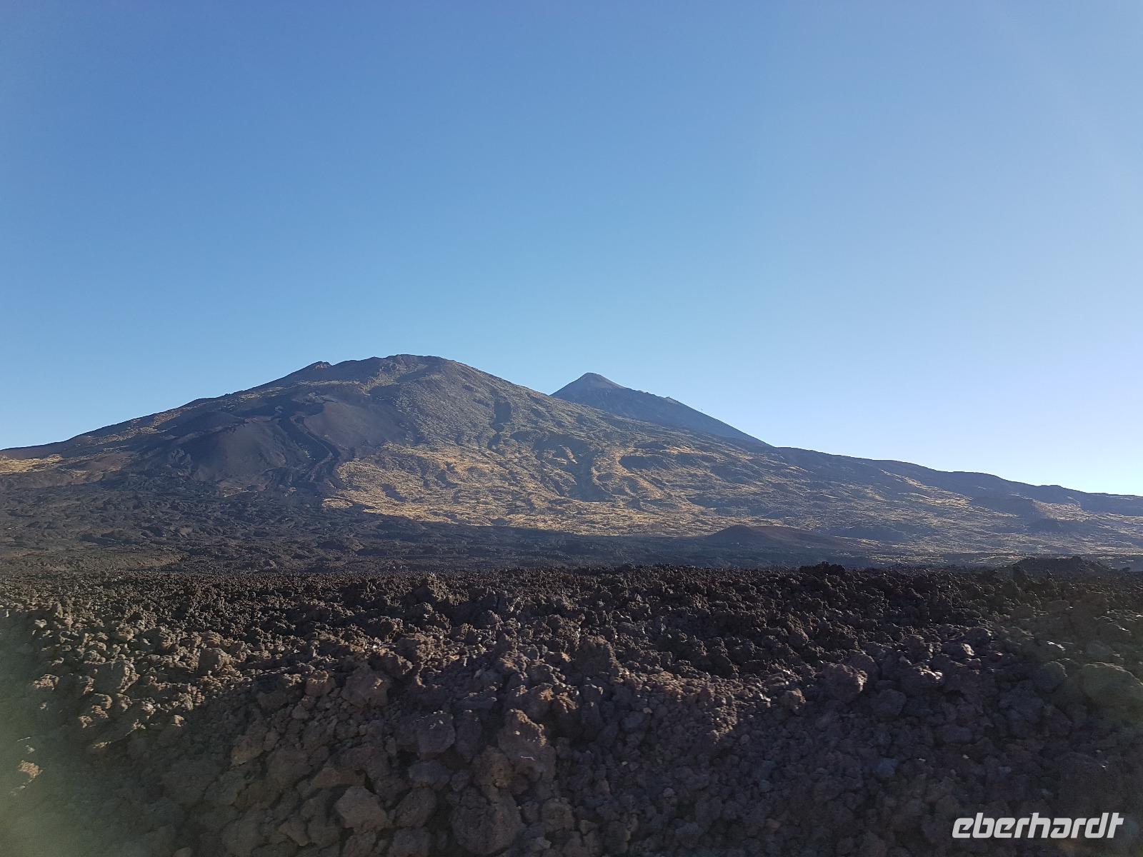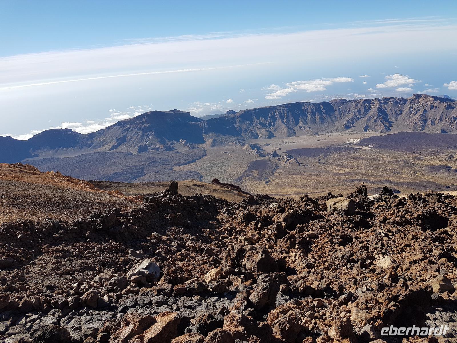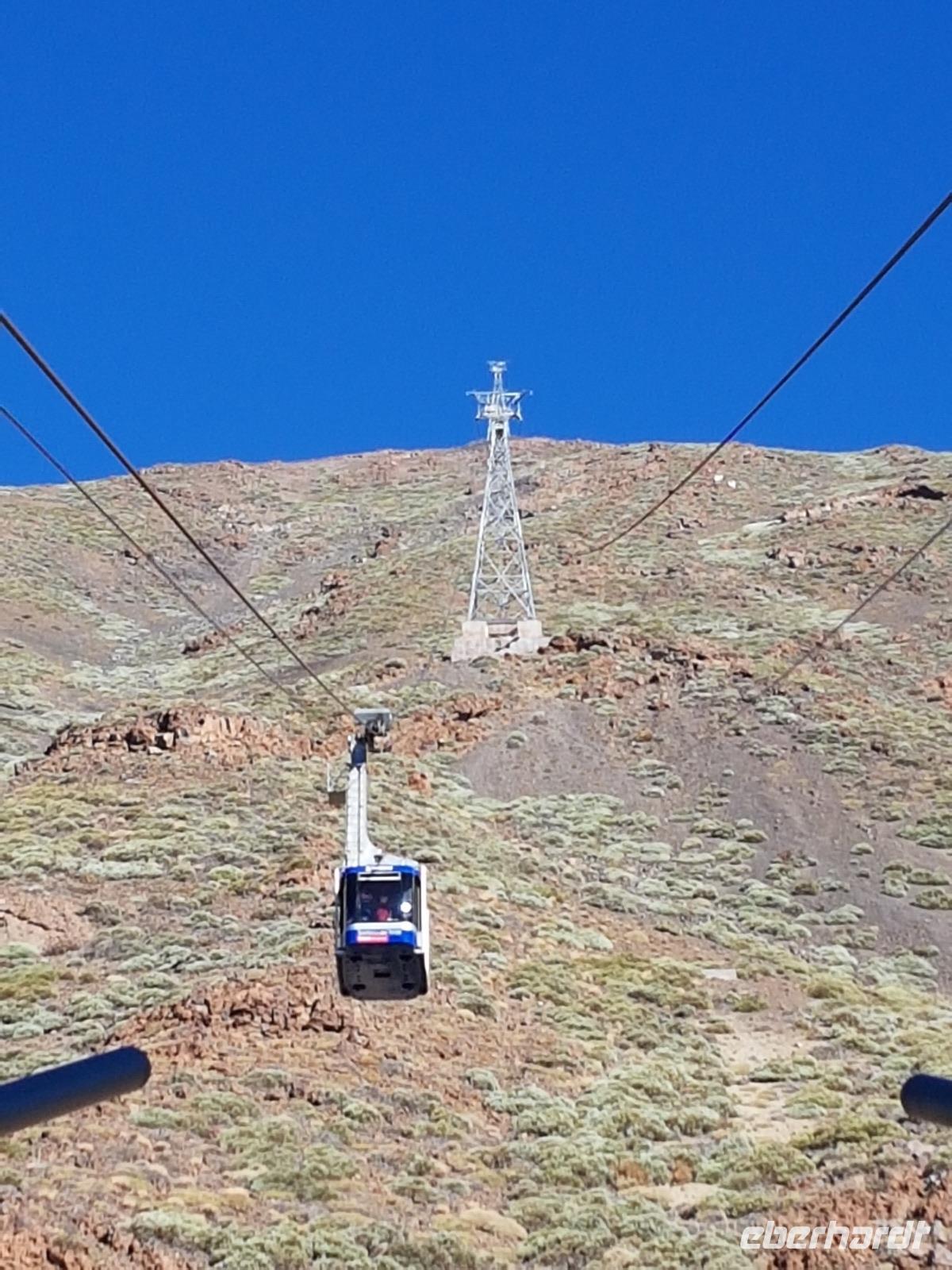 An der Seilbahnstation fuhren wir mit der Seilbahn bis zu 3.500 Meter hoch, 1000 Meter Unterschied in nur knapp 5 Minuten. Von hier oben kann man La Gomera, La Palma und Gran Canaria sehen. Es ist heute windig, aber dafür ist die Sicht sehr klar. Wir machen einen kleinen Spaziergang bis Pico Viejo. Und alle alle kommen mit. Ich bin stolz auf meine Truppe;) Der Teide ist mit 3.718m die höchste Erhebung Teneriffas. Ein schlafender Vulkan, der irgendwann mal hier oder woanders aufwachen könnte. Wieder unten, fahren wir bis Los Roques de Garcia, ein bizarre lustige Felsformation, wo Gisela das klassische Eberhardt Travel-Gruppenfoto mit dem Teide im Hintergrund machte.