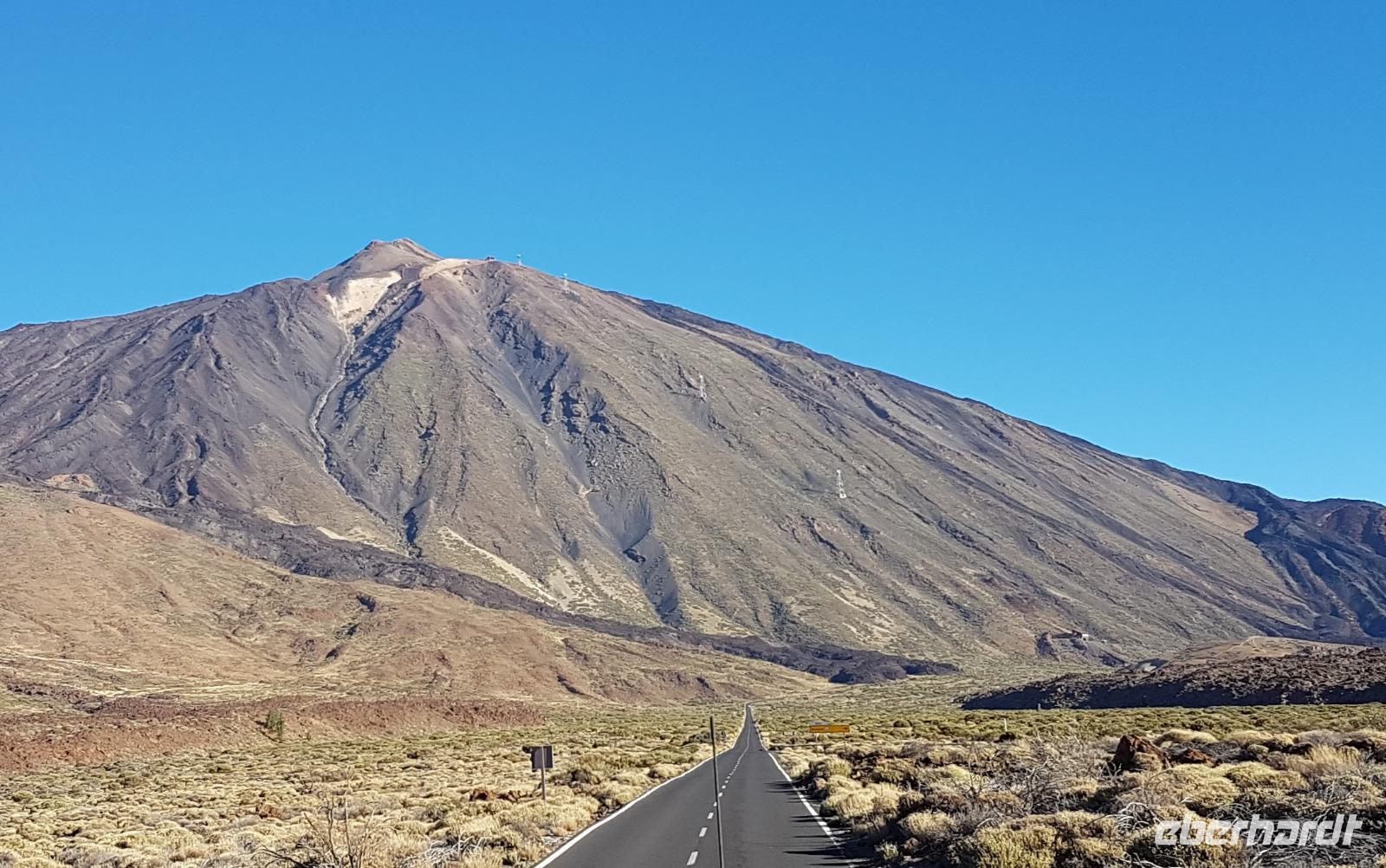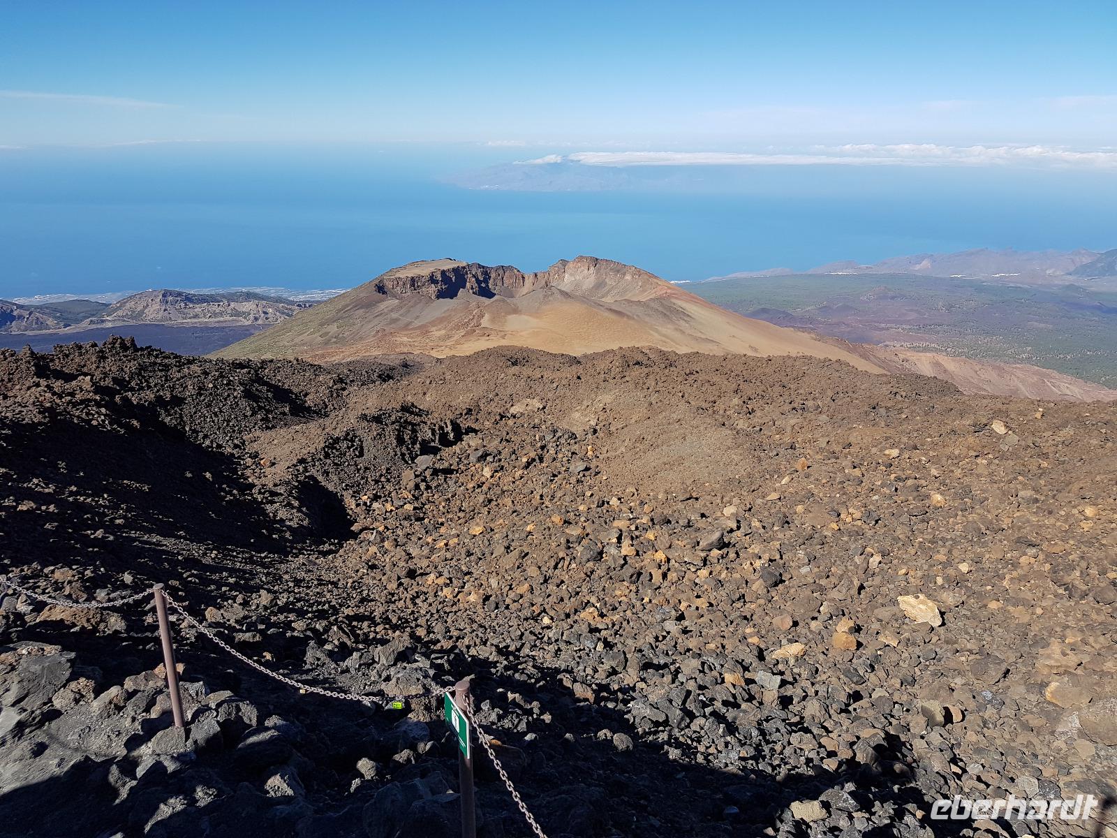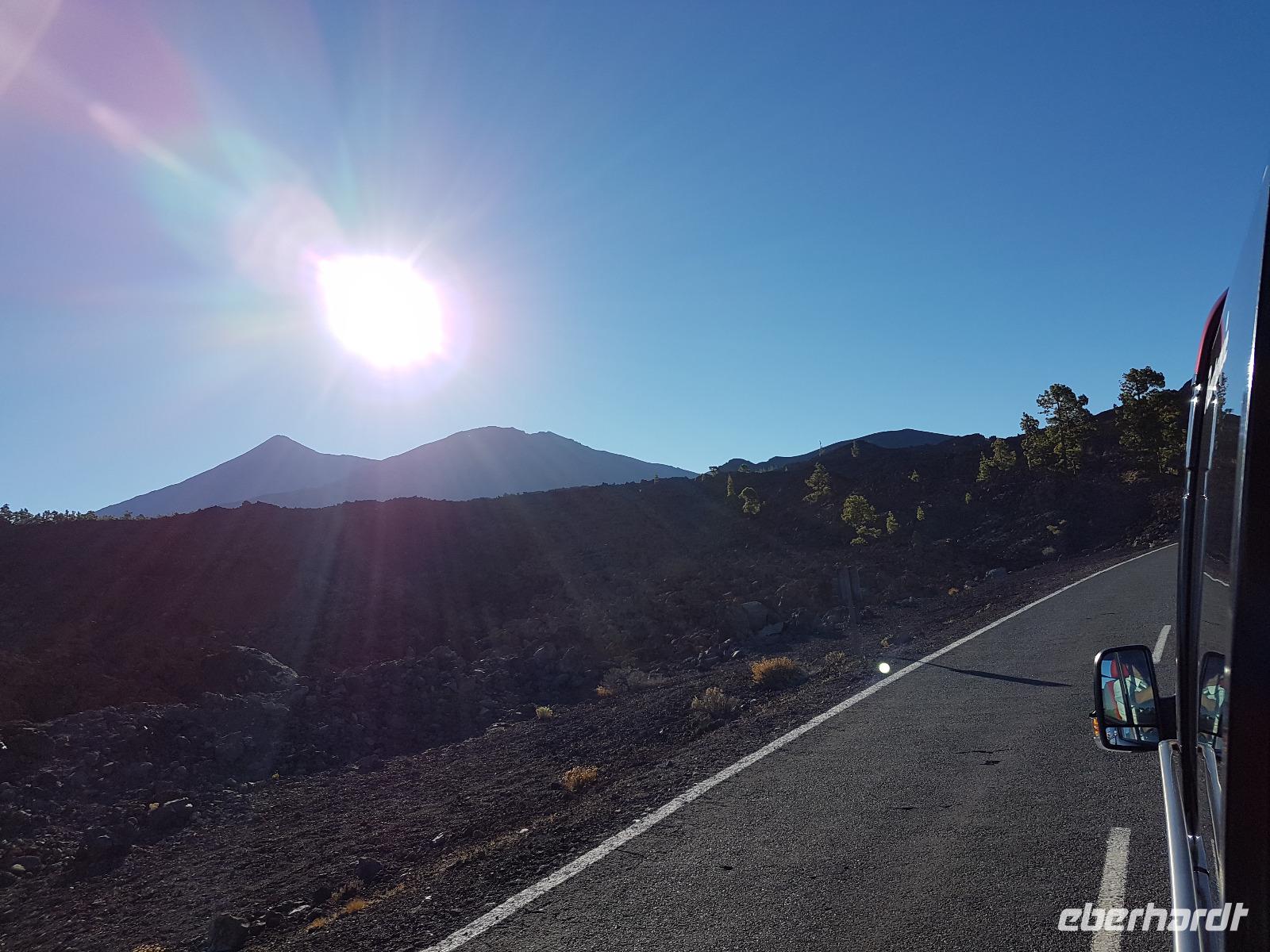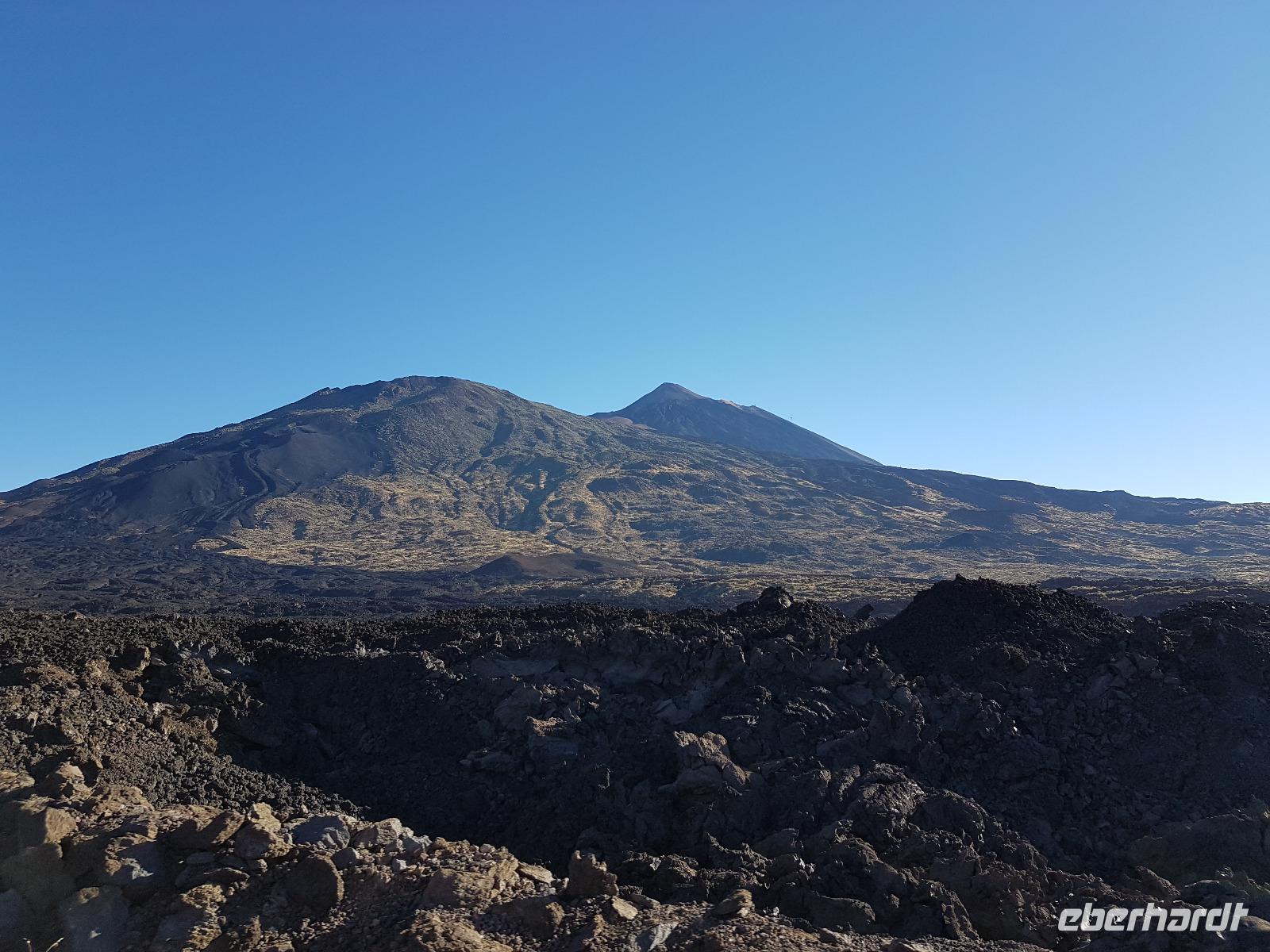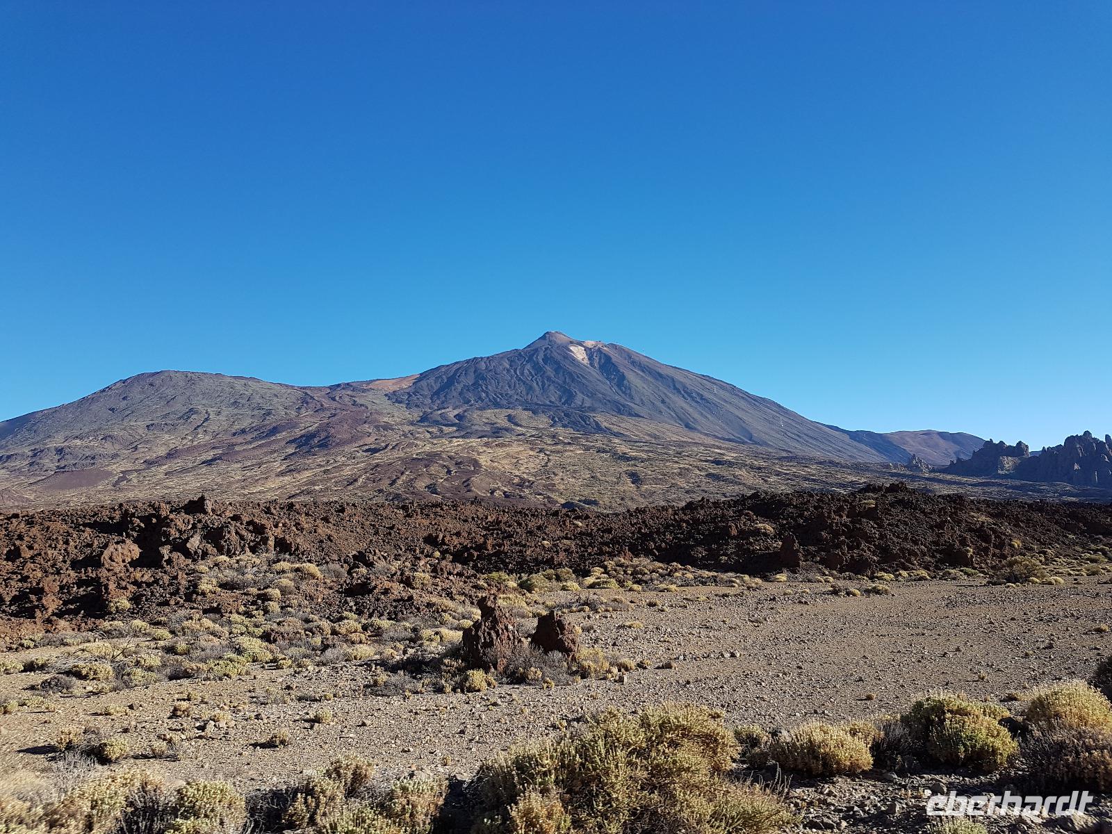An der Seilbahnstation fuhren wir mit der Seilbahn bis zu 3.500 Meter hoch, 1000 Meter Unterschied in nur knapp 5 Minuten. Von hier oben kann man La Gomera, La Palma und Gran Canaria sehen. Es ist heute windig, aber dafür ist die Sicht sehr klar. Wir machen einen kleinen Spaziergang bis Pico Viejo. Und alle alle kommen mit. Ich bin stolz auf meine Truppe;) Der Teide ist mit 3.718m die höchste Erhebung Teneriffas. Ein schlafender Vulkan, der irgendwann mal hier oder woanders aufwachen könnte. Wieder unten, fahren wir bis Los Roques de Garcia, ein bizarre lustige Felsformation, wo Gisela das klassische Eberhardt Travel-Gruppenfoto mit dem Teide im Hintergrund machte.
