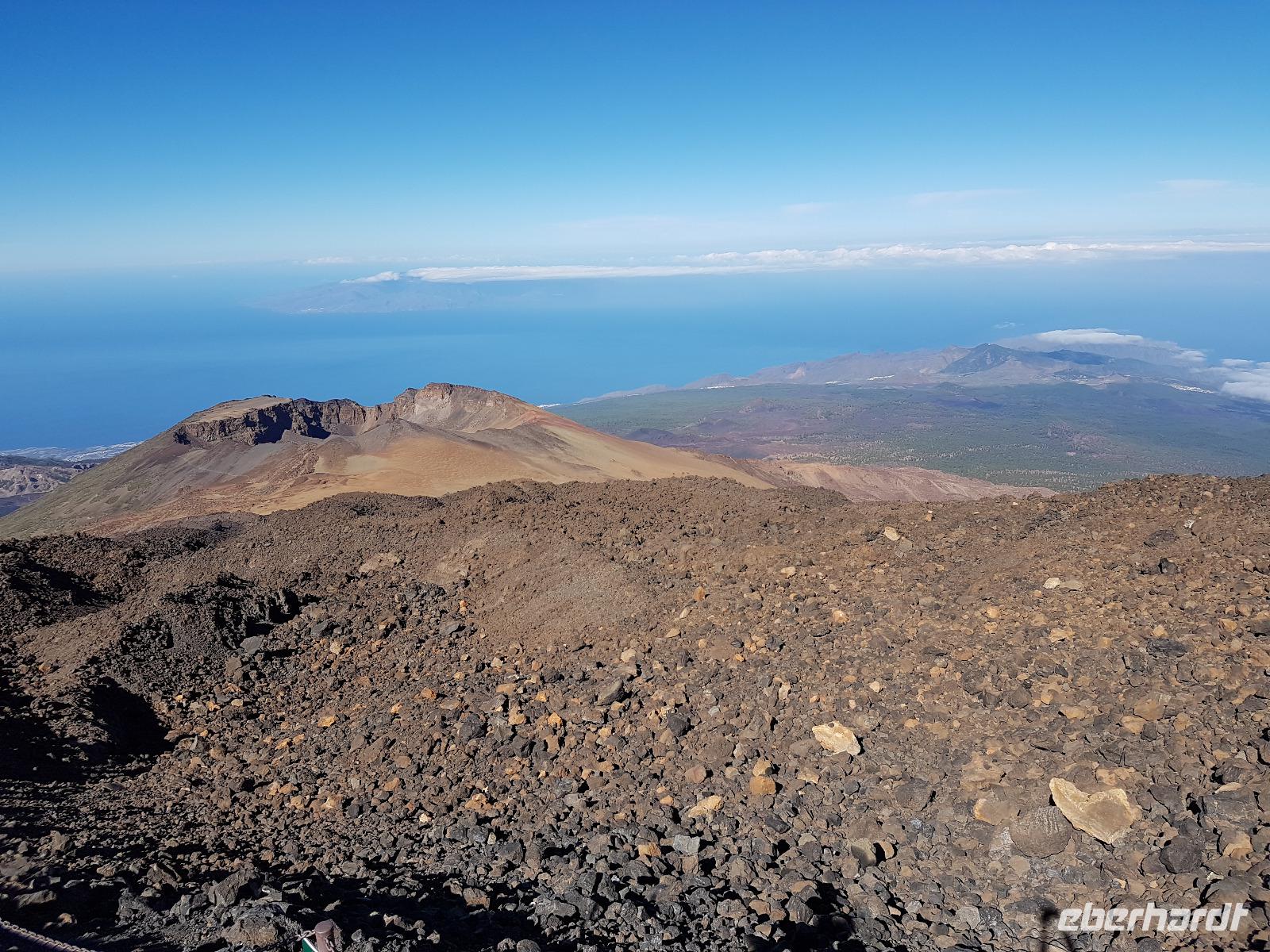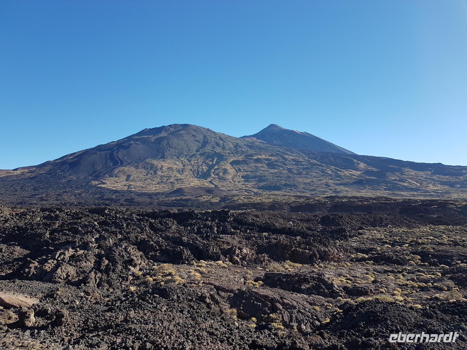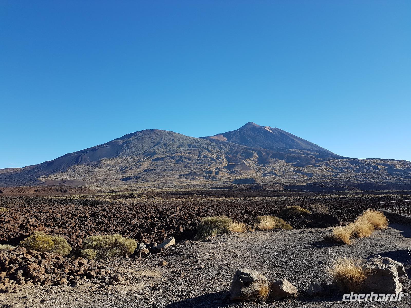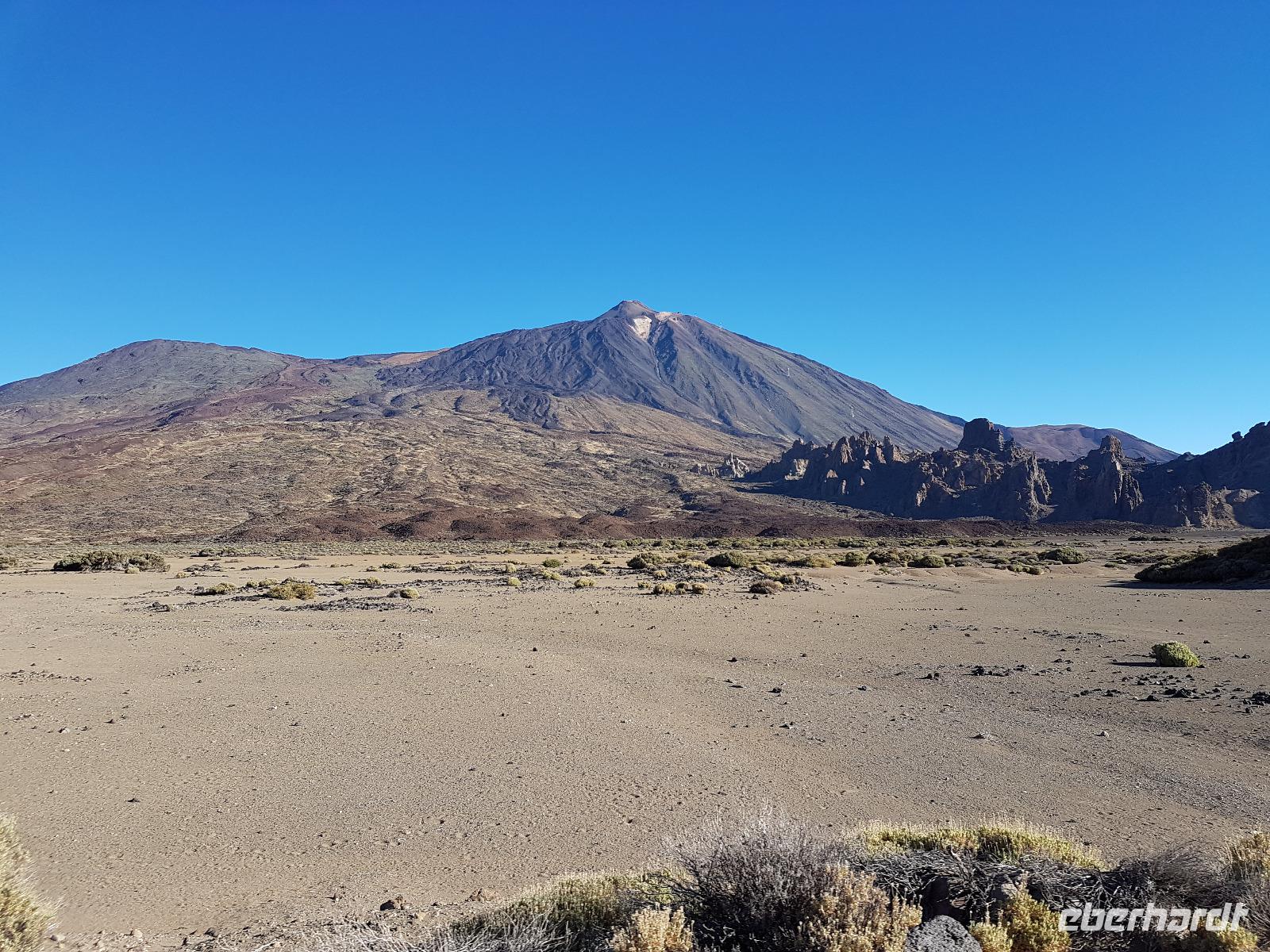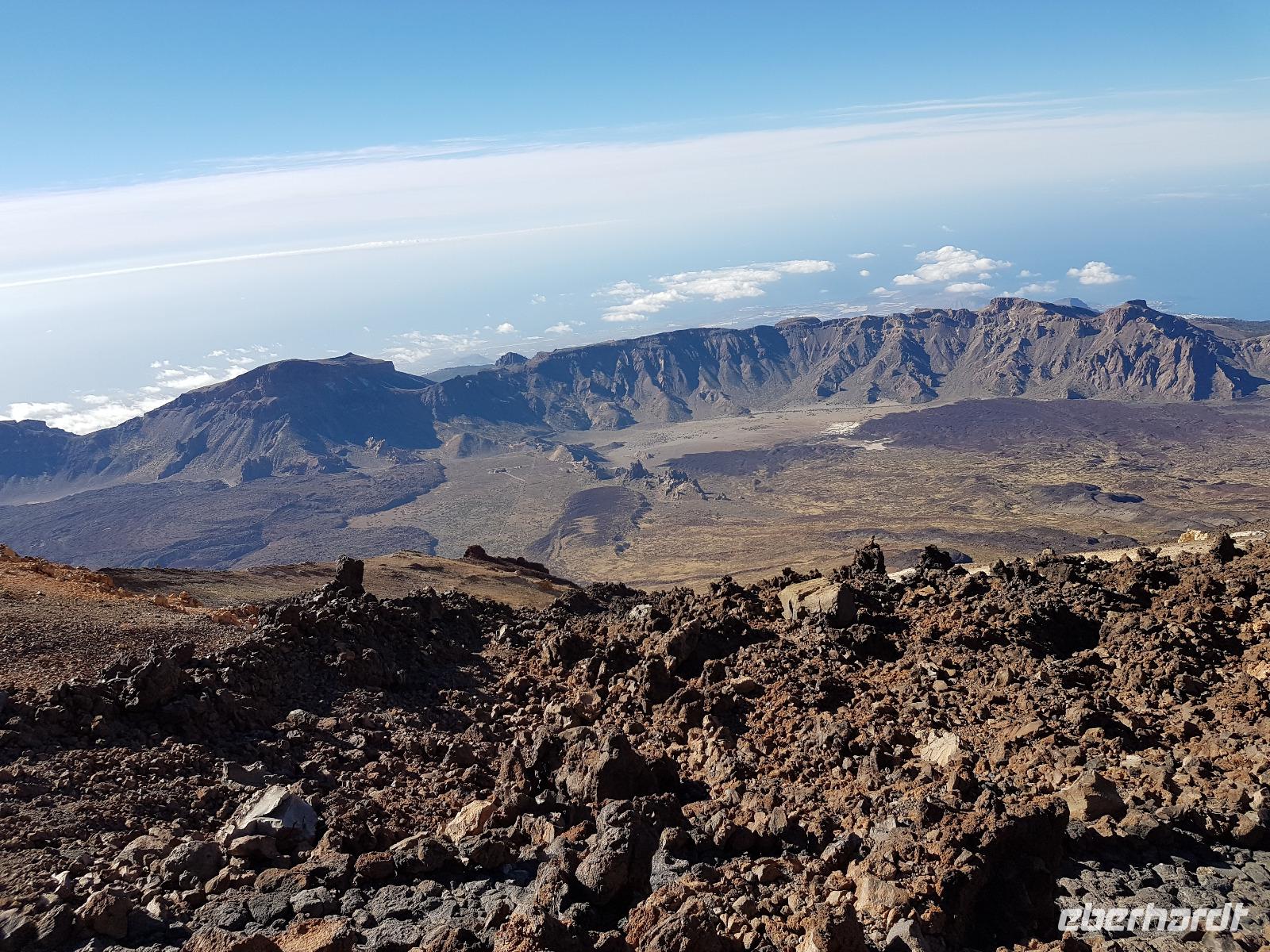 An der Seilbahnstation fuhren wir mit der Seilbahn bis zu 3.500 Meter hoch, 1000 Meter Unterschied in nur knapp 5 Minuten. Von hier oben kann man La Gomera, La Palma und Gran Canaria sehen. Es ist heute windig, aber dafür ist die Sicht sehr klar. Wir machen einen kleinen Spaziergang bis Pico Viejo. Und alle alle kommen mit. Ich bin stolz auf meine Truppe;) Der Teide ist mit 3.718m die höchste Erhebung Teneriffas. Ein schlafender Vulkan, der irgendwann mal hier oder woanders aufwachen könnte. Wieder unten, fahren wir bis Los Roques de Garcia, ein bizarre lustige Felsformation, wo Gisela das klassische Eberhardt Travel-Gruppenfoto mit dem Teide im Hintergrund machte.