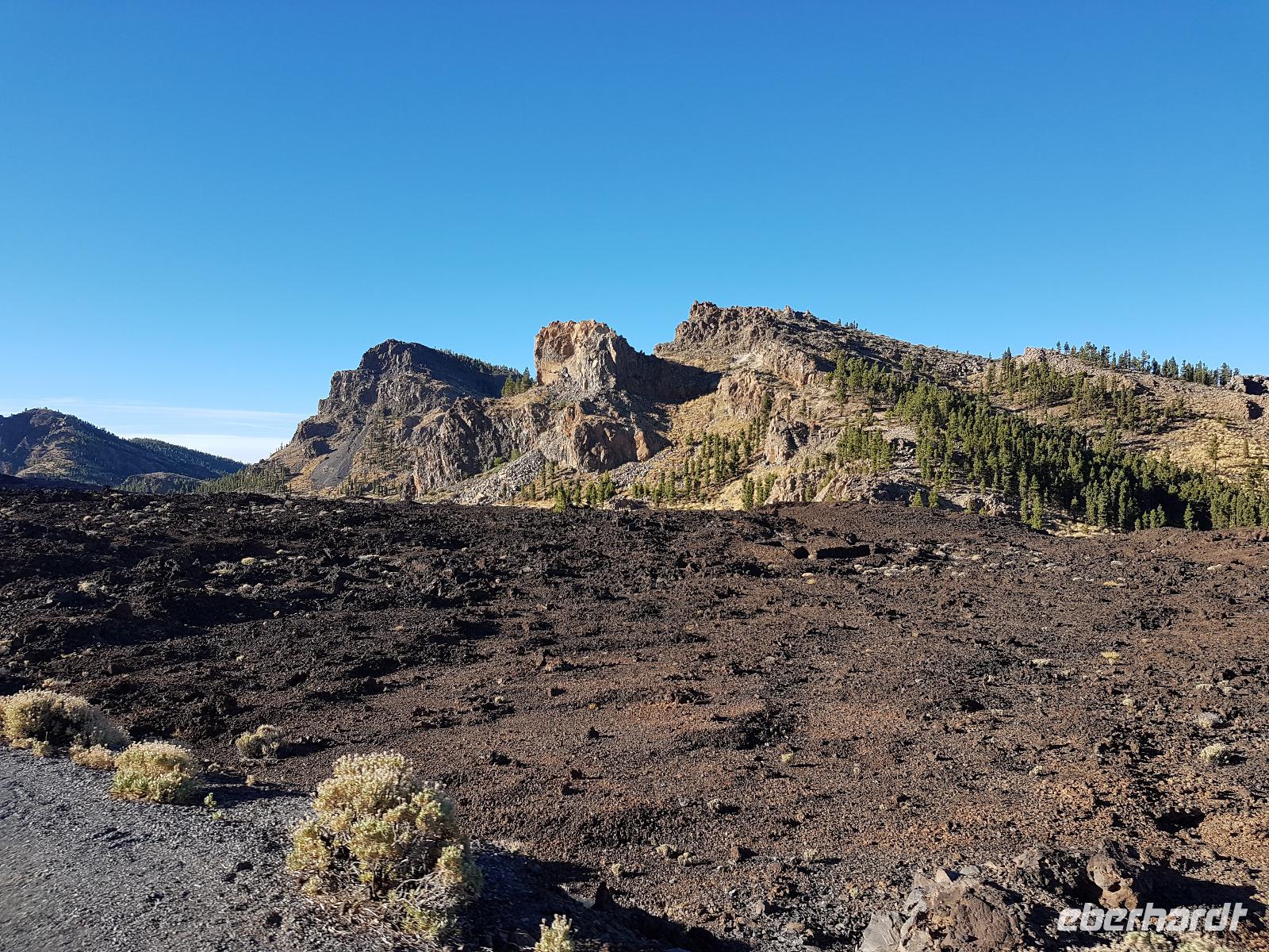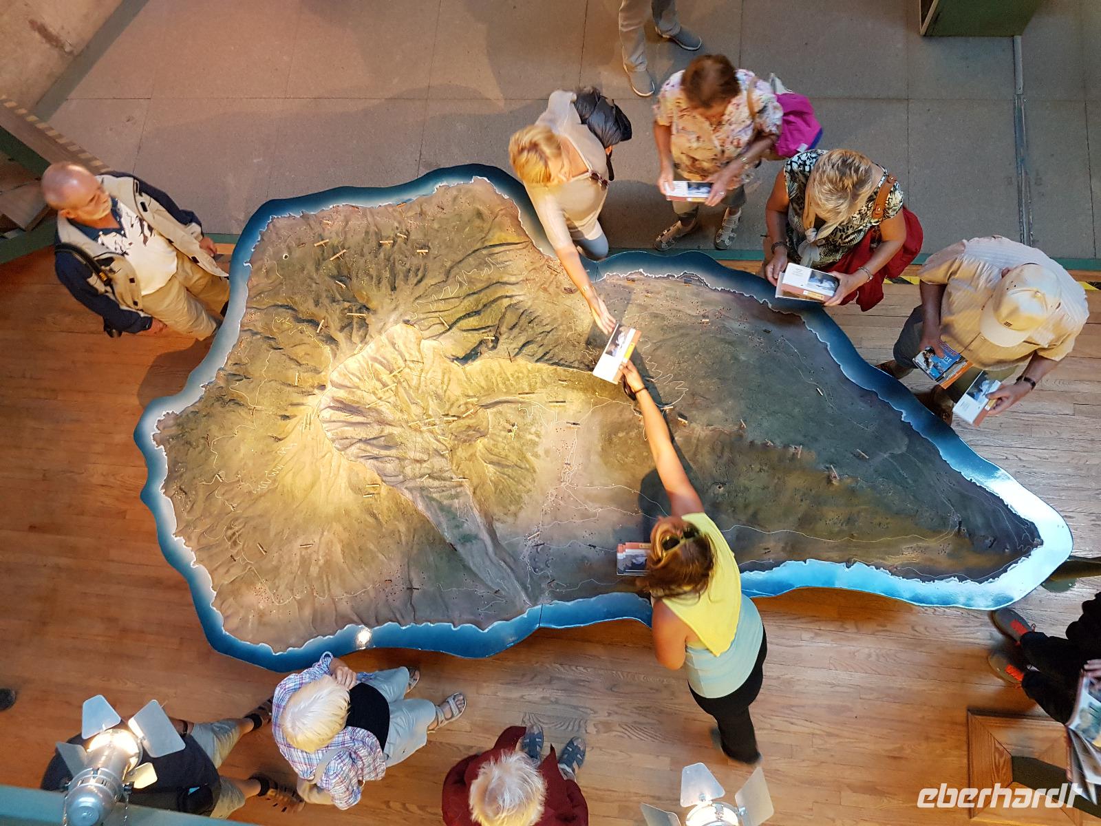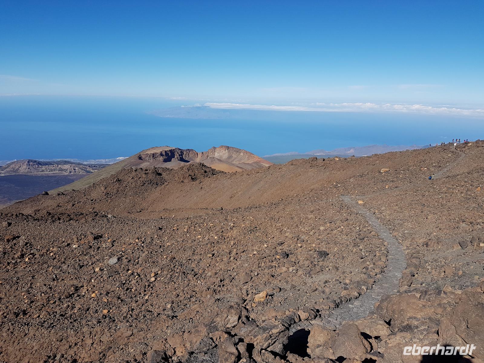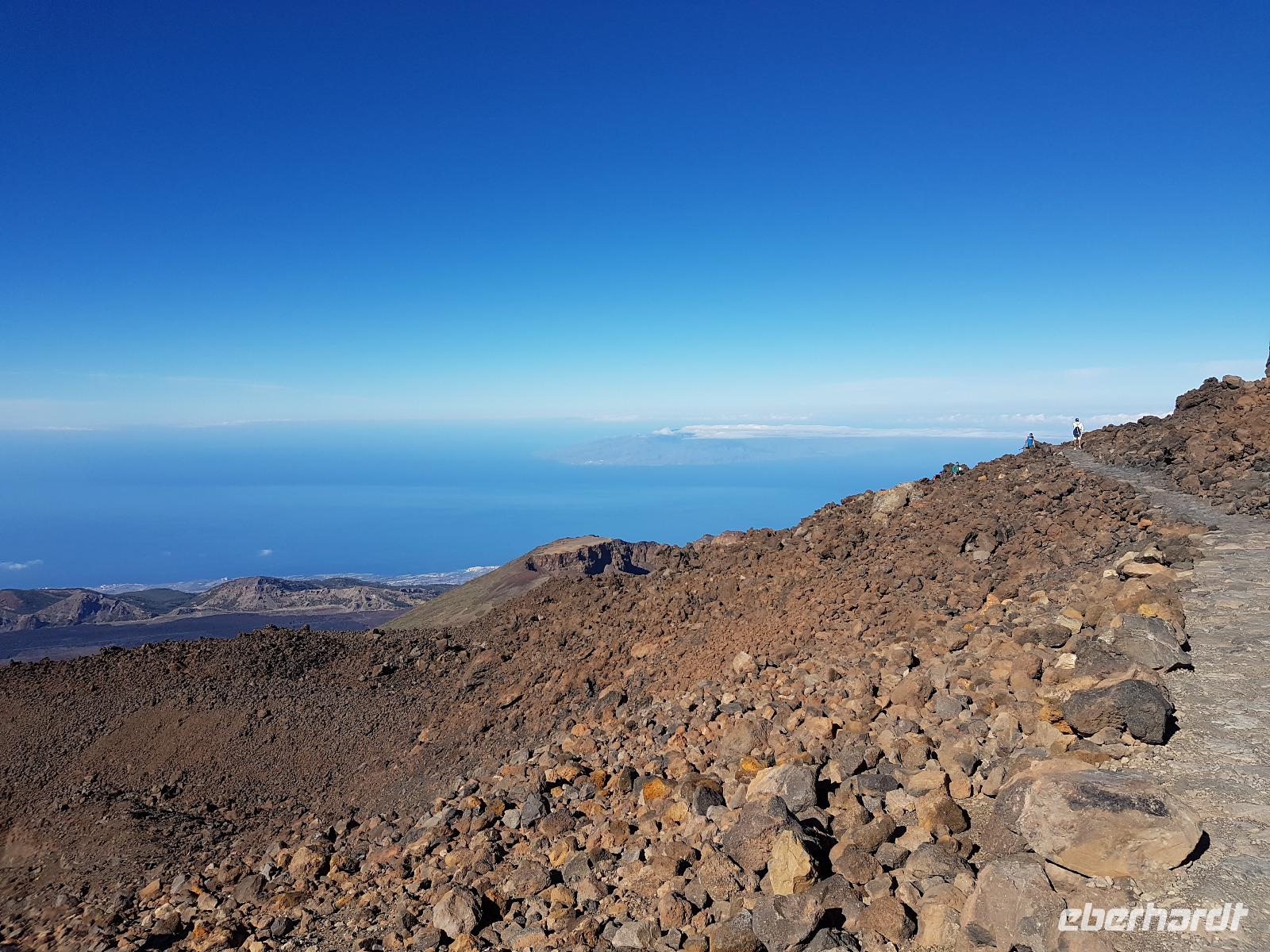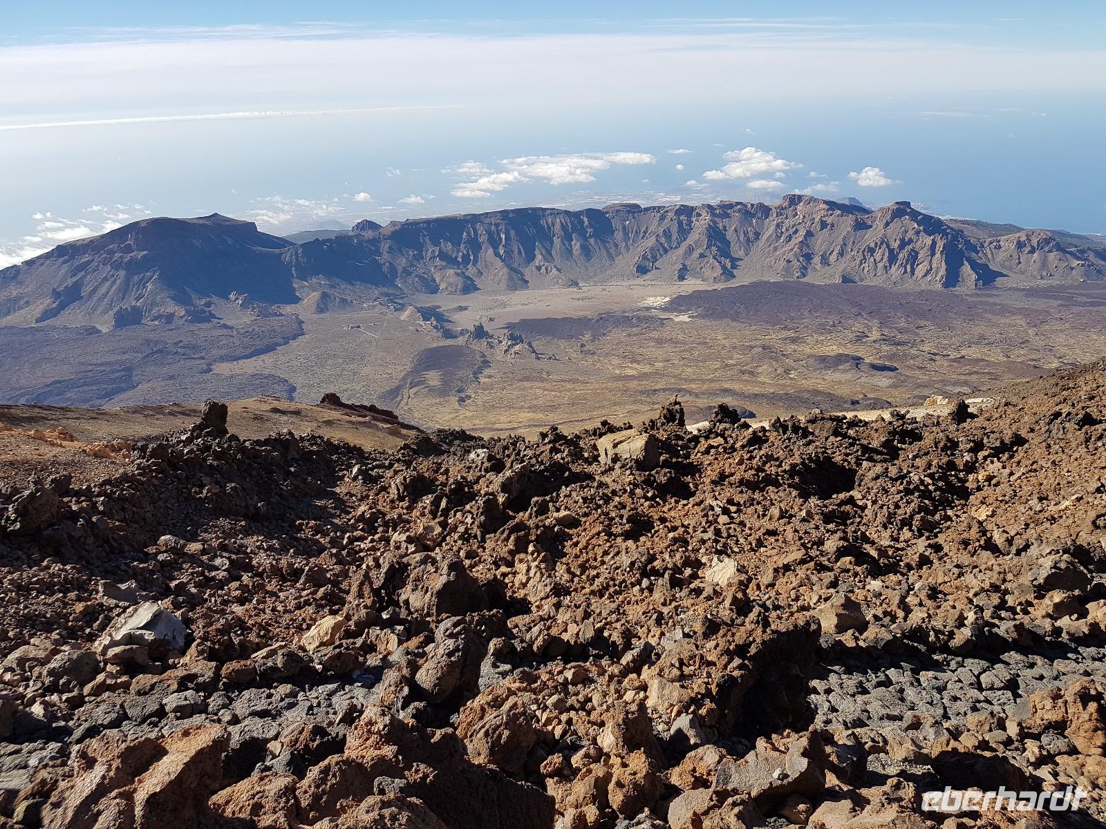 An der Seilbahnstation fuhren wir mit der Seilbahn bis zu 3.500 Meter hoch, 1000 Meter Unterschied in nur knapp 5 Minuten. Von hier oben kann man La Gomera, La Palma und Gran Canaria sehen. Es ist heute windig, aber dafür ist die Sicht sehr klar. Wir machen einen kleinen Spaziergang bis Pico Viejo. Und alle alle kommen mit. Ich bin stolz auf meine Truppe;) Der Teide ist mit 3.718m die höchste Erhebung Teneriffas. Ein schlafender Vulkan, der irgendwann mal hier oder woanders aufwachen könnte. Wieder unten, fahren wir bis Los Roques de Garcia, ein bizarre lustige Felsformation, wo Gisela das klassische Eberhardt Travel-Gruppenfoto mit dem Teide im Hintergrund machte.