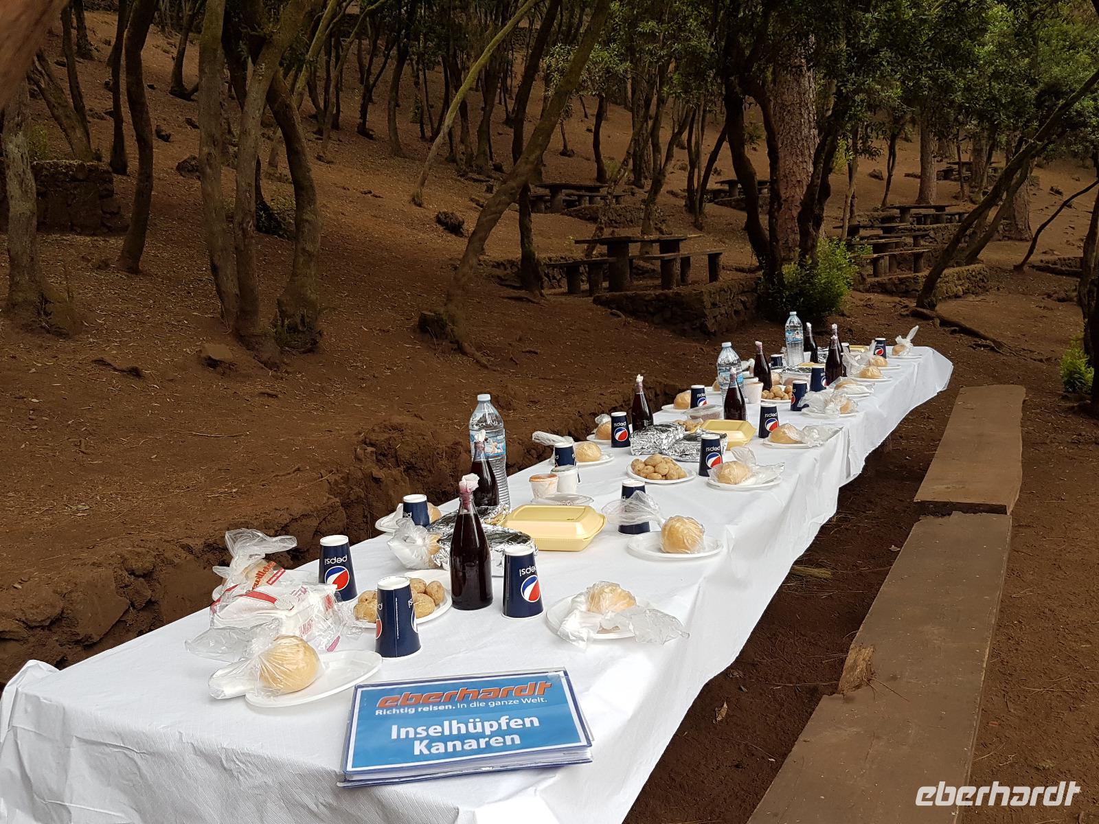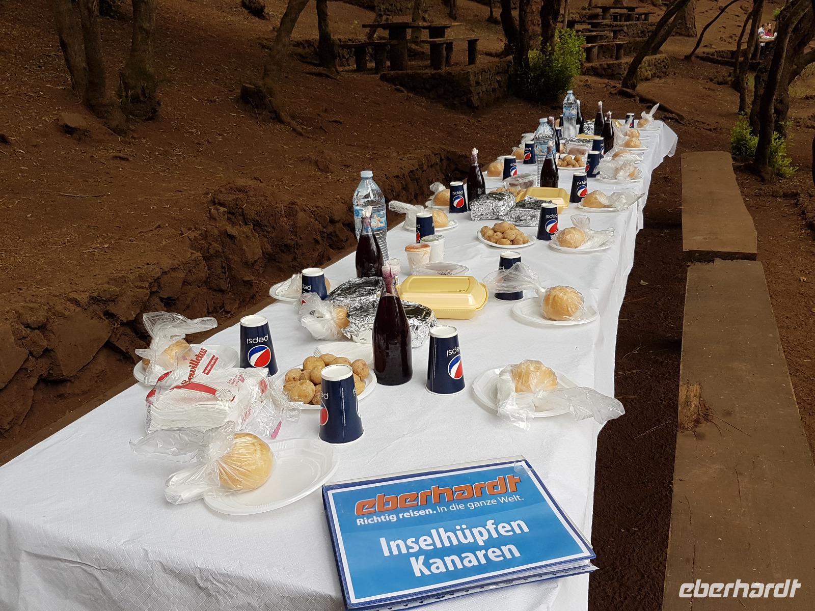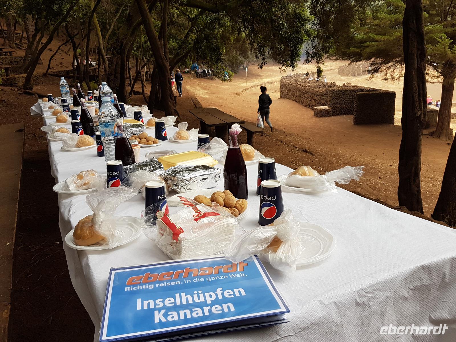 Weiter fahren wir bis Las Minas de San Jose, es sieht aus, als wären wir gerade auf dem Mond gelandet. Die Natur ist heute so schön und der Himmel ist klar. Unvergesslich wunderschön... Und nun ist es Zeit für eine Überraschung, die wieder mit Trinken und Essen zu tun hat, aber nicht irgendwo, sondern auf dem La Caldera-Freipark, einem alten Vulkankrater, wo es nun Tapas für uns gibt. Der Tisch ist schon vorbereitet. Und heute sind Tapas angesagt: Ziegenfleisch, Kirchererbsen-Eintopf, Hühnchenfleisch und kanarische Kartoffeln mit roter und grüner Soße. Und alles mit einem sehr guten Rot-Wein. Hier haben wir viel gesungen, Witze erzählt und gelacht.