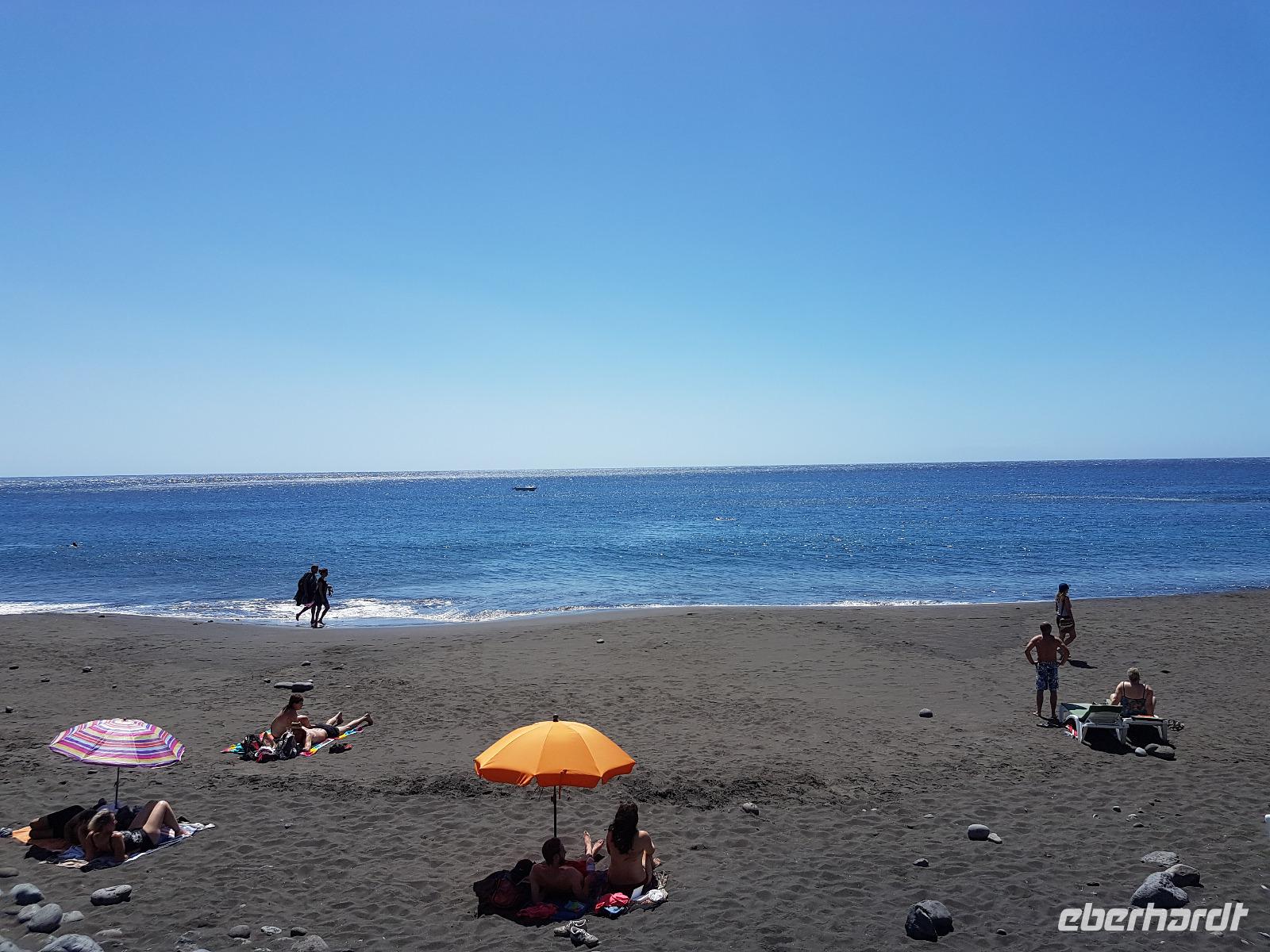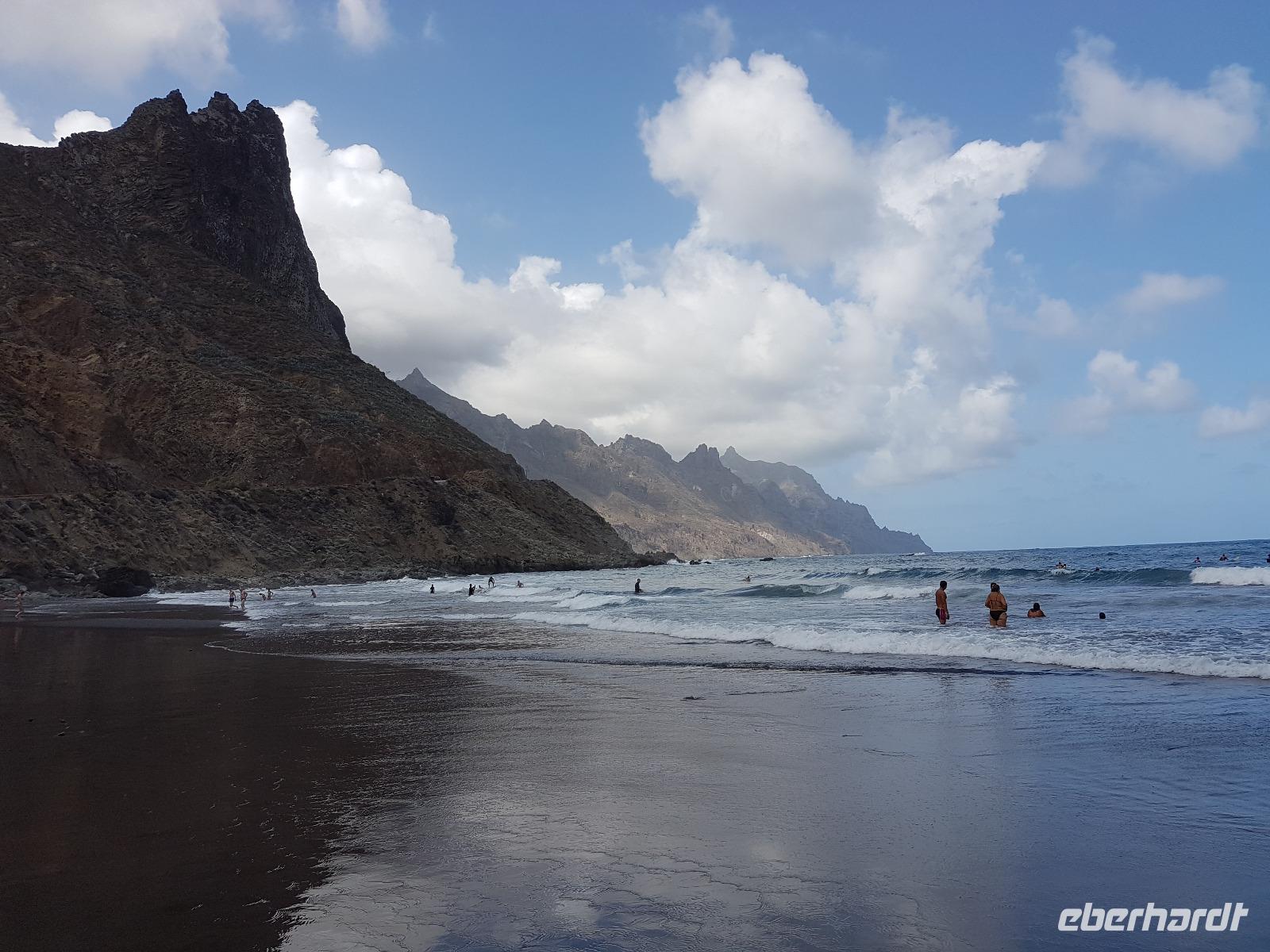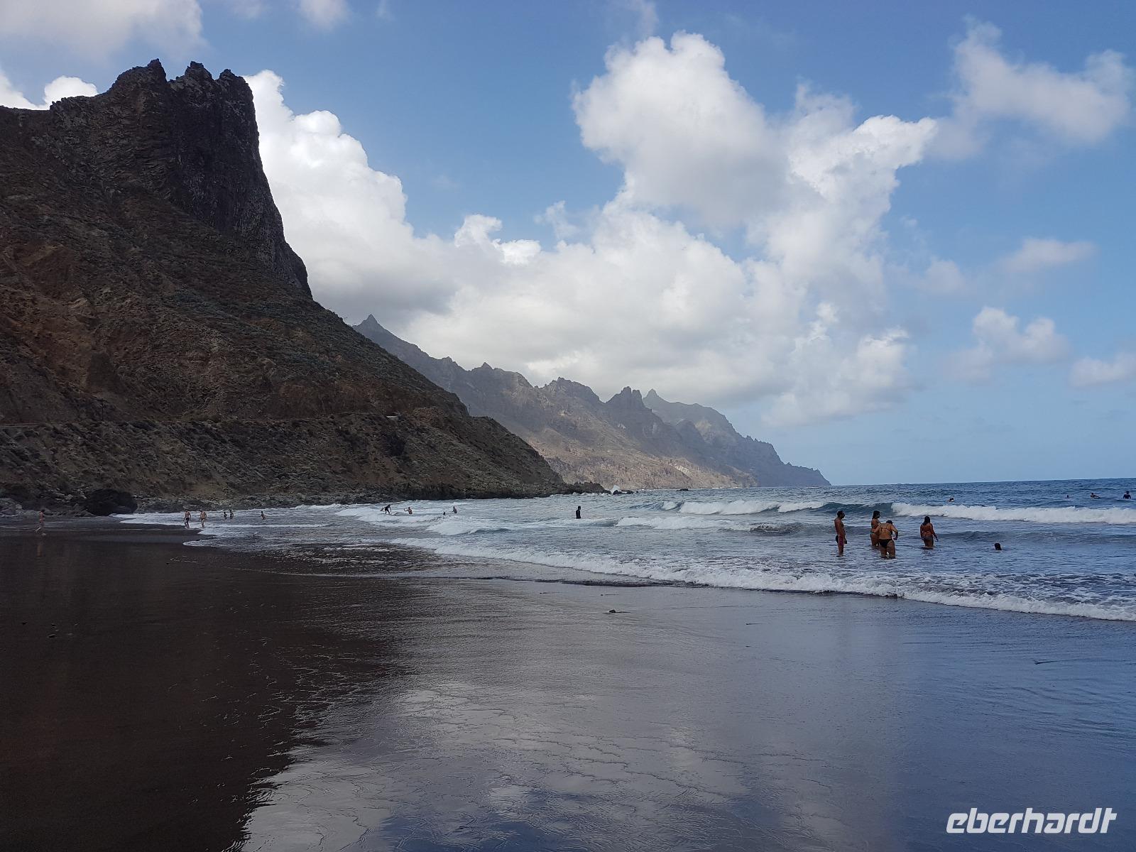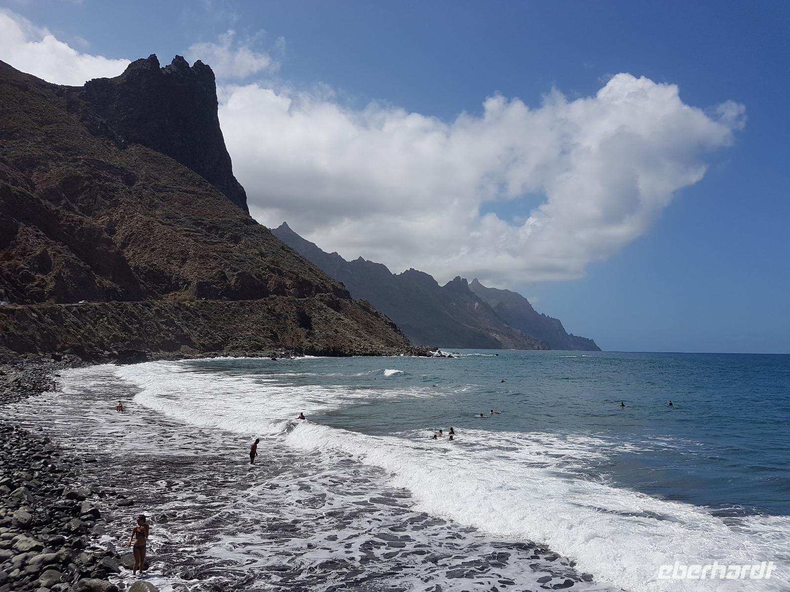 Mit dem Bus fuhren wir weiter zum Las Teresitas Strand, der mit Sand aus der Sahara gemacht wurde. Das Wetter bis jetzt könnte nicht besser sein. Weiter fuhren wir bergauf durch das Anaga Gebirge über einen Pass und durch einen Tunnel bis Taganana auf die andere Seite der Insel. In der Casa Afrika haben wir dann ein tolles tolles Mittagessen: Salat mit Erdbeeren und Avocado, Ziegenkäse, Rotwein aus dem Norden Teneriffas und einen leckeren gebratenen Fisch!!! Zusammen mit einem Mann, der eine Guitarre hatte, sang Benjamin einige Lieder für unsere Gäste wie „Palmero sube a la Palma". Um das Essen zu verdauern machen wir in Taganana noch einen Spaziergang am Meer entlang und Benjamin ging kurz wieder baden.