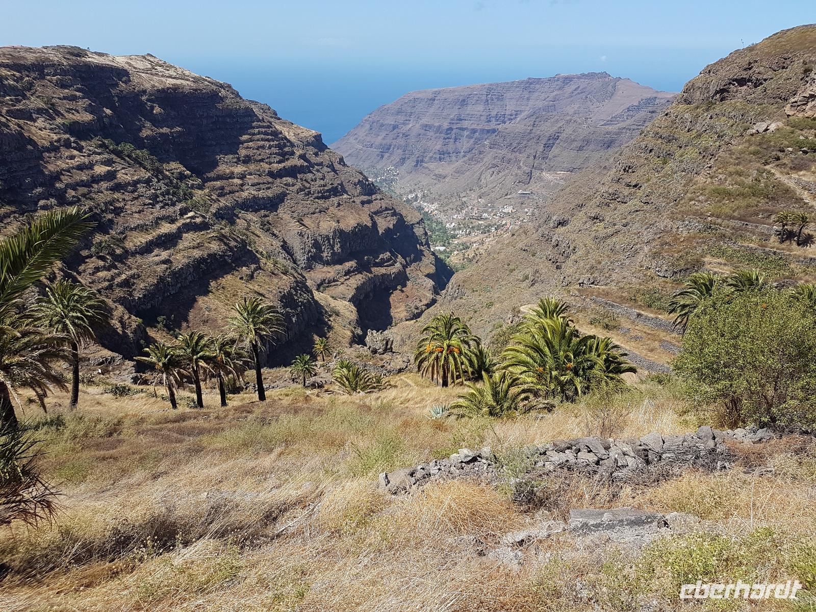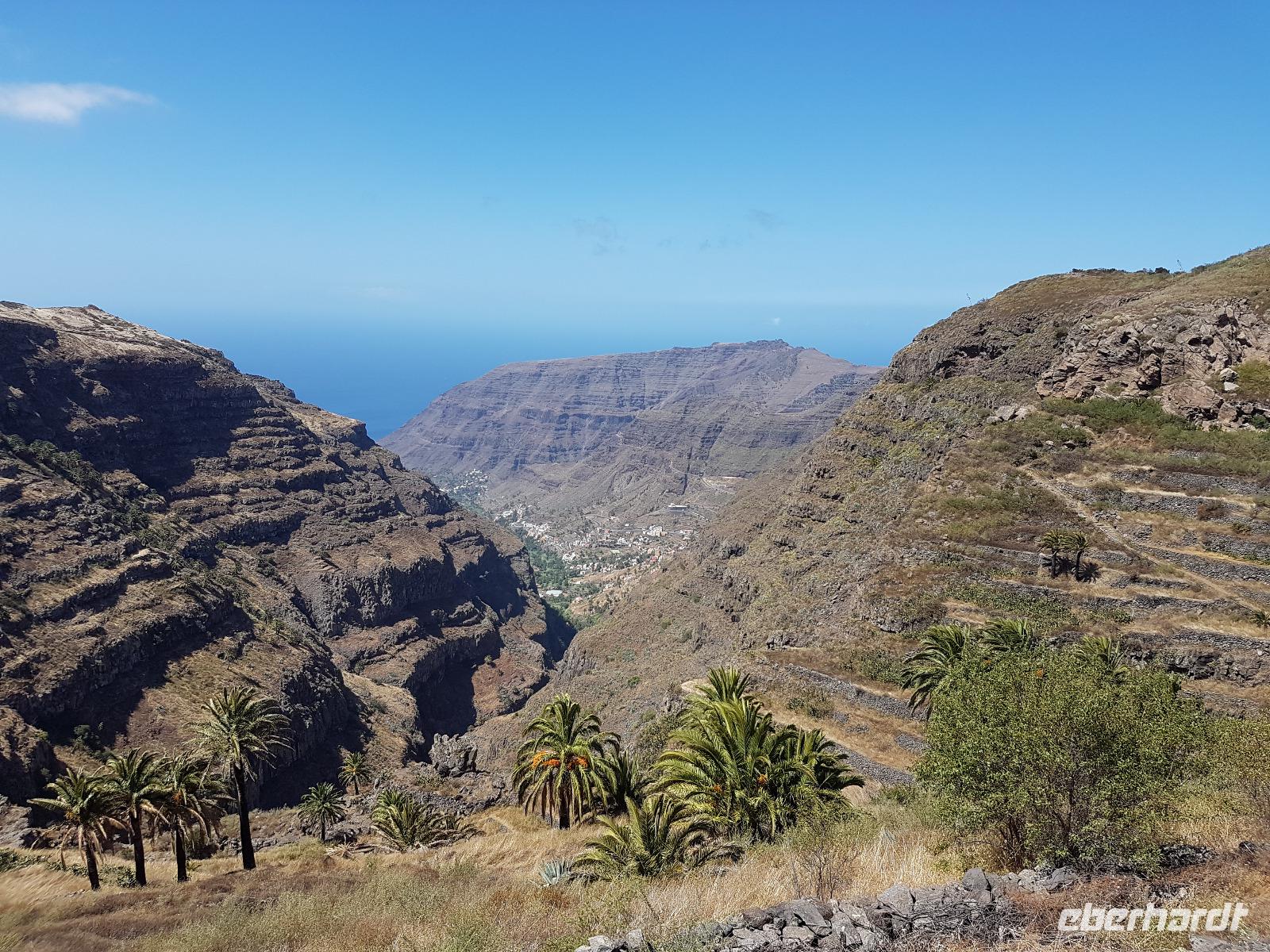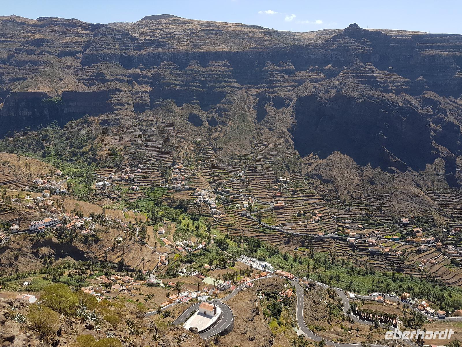 Nach dem Lorbeerwald werden wir langsam bergab Richtung Valle Gran Rey fahren. Alles ist voll mit Palmen, eine erstaunlich schöne Landschaft mit winzigen schönen Häusern mit verschiedenen Farben... wunderschön. Mit den Tafelbergen im Hintergrund genaßen wir diese Landschaft und die Ruhe. Wir fuhren weiter bergab und machten noch einen Stopp bei einem Aussichstpunkt von Cesar Manriquez. Im Valle Gran Rey haben wir 1,5 Stunden Freizeit, um im Meer zu baden oder einfach an der Promenade zu sitzen und in Ruhe ein Mittagsessen zu genießen. Zurück in der Hauptstadt konnten wir wieder Teneriffa und denTeide ohne Wolken sehen. Das Wetter hier änderte sich ständig.