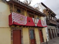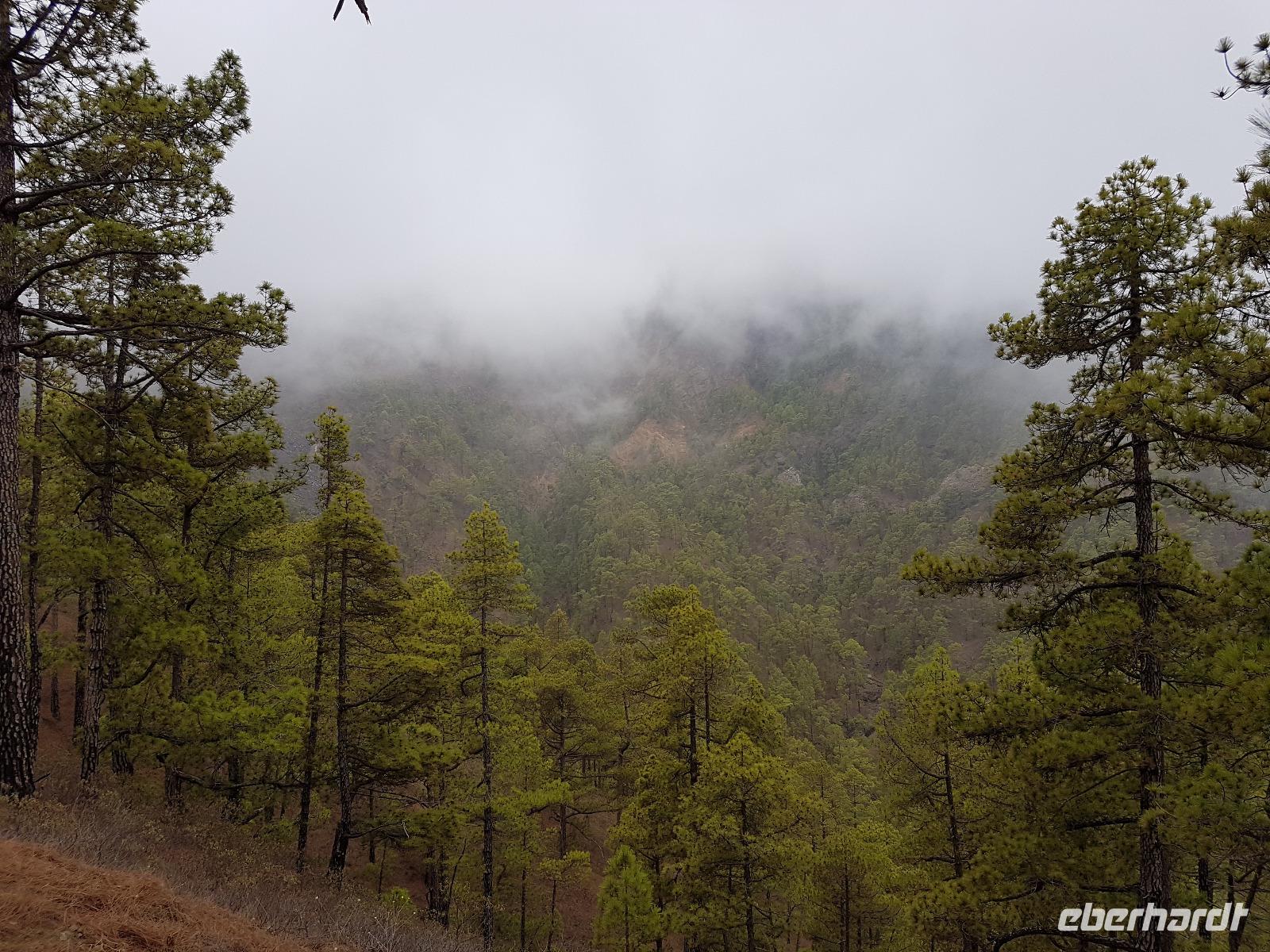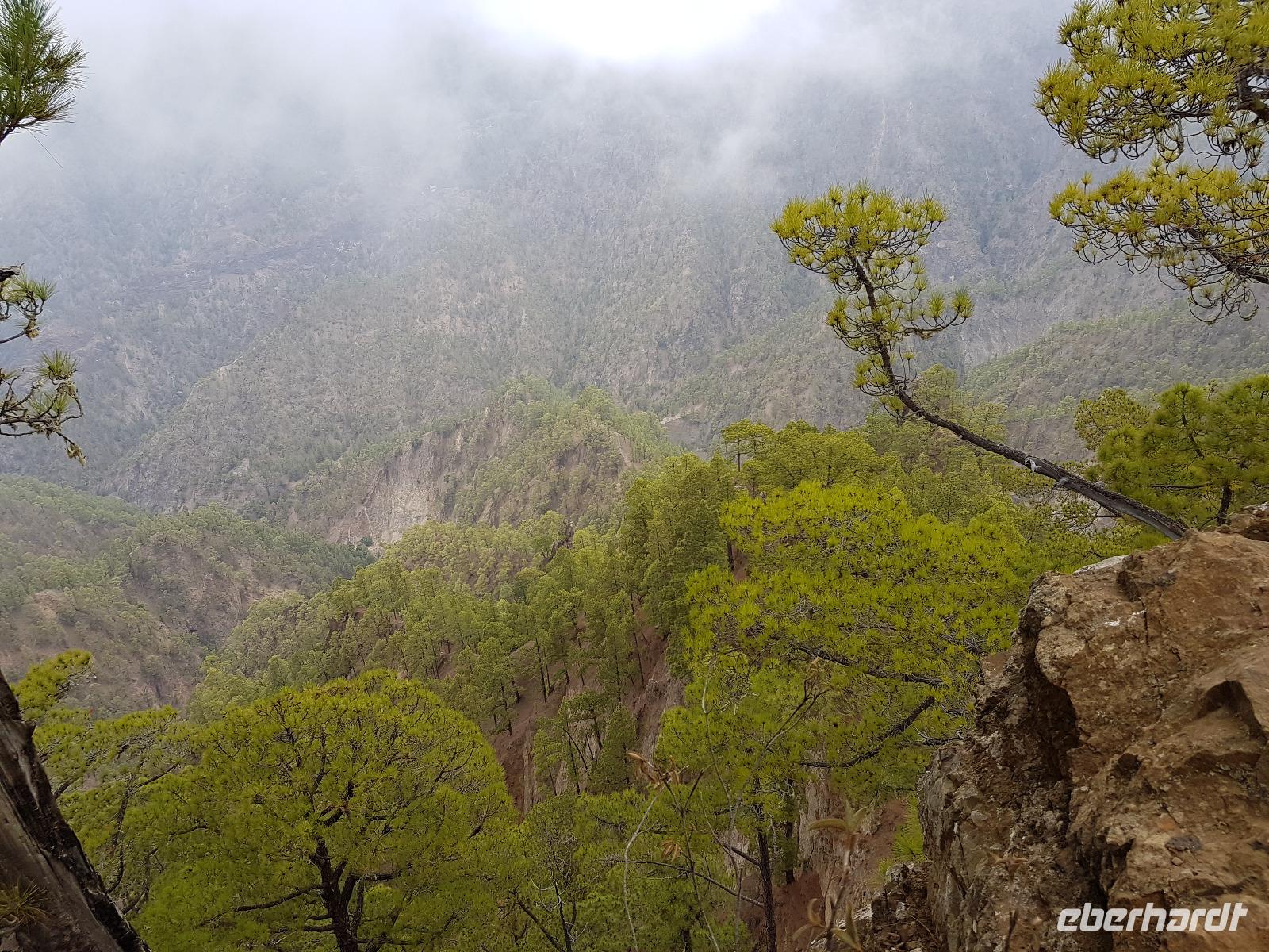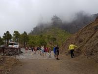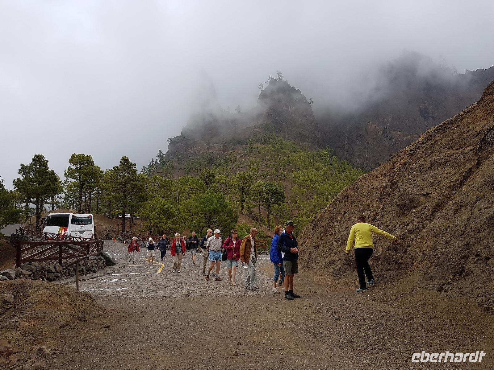 Für die Gruppe war heute der erste Stopp die Hauptstadt, Santa Cruz de La Palma: klein, aber fein. Wir spazierten durch die alten Gassen und konnten das Rathaus und andere Häuser mit ihren inneren Höfen bestaunen. Bei der Markthalle bestellten wir Zuckerrohrsaft, direkt nur für uns frisch gepresst. Es war sehr lecker und man konnte es mit Zitronen, Orangen oder sogar mit Rum mischen. Anschließend gingen wir zu Fuß bis zum Haus der Balkone. Es war toll geschmückt mit Blumen und Pflanzentöpfen. Carlos, der Busfahrer, wartete dort auf uns und gemeinsam mit ihm fuhren wir bis 2.400 Meter hoch... bis zum Caldera de Taburiente. Es ist wie ein Kessel oder ein Topf und wir befanden uns am Rand davon. Wir fuhren durch und über die Wolken und bestaunen eine ganz neue Vegetation hier. Erst noch Kiefern, aber danach nur Pflanzen, Büsche und Blumen, die man nur hier über 2.400 Meter finden kann.