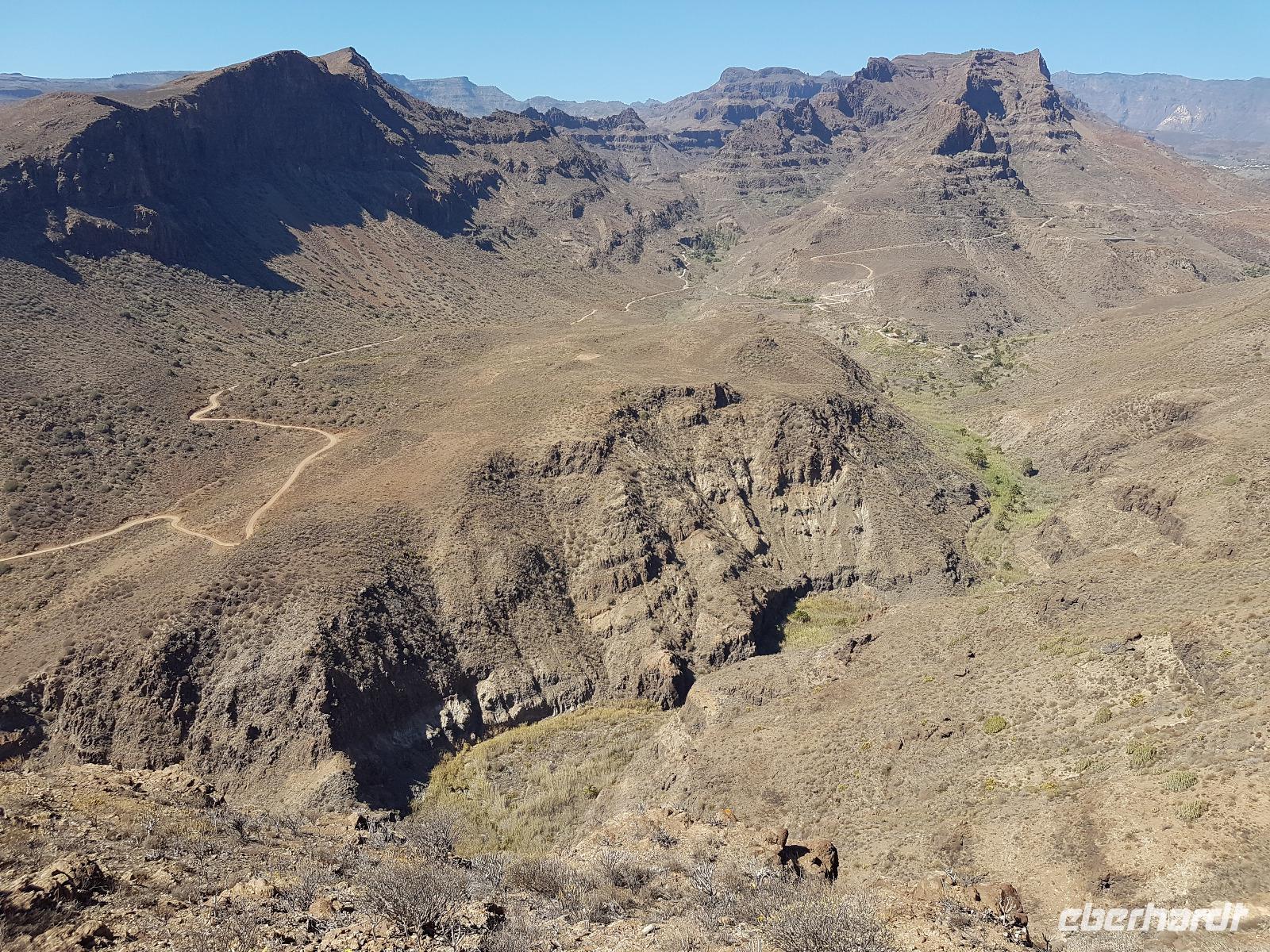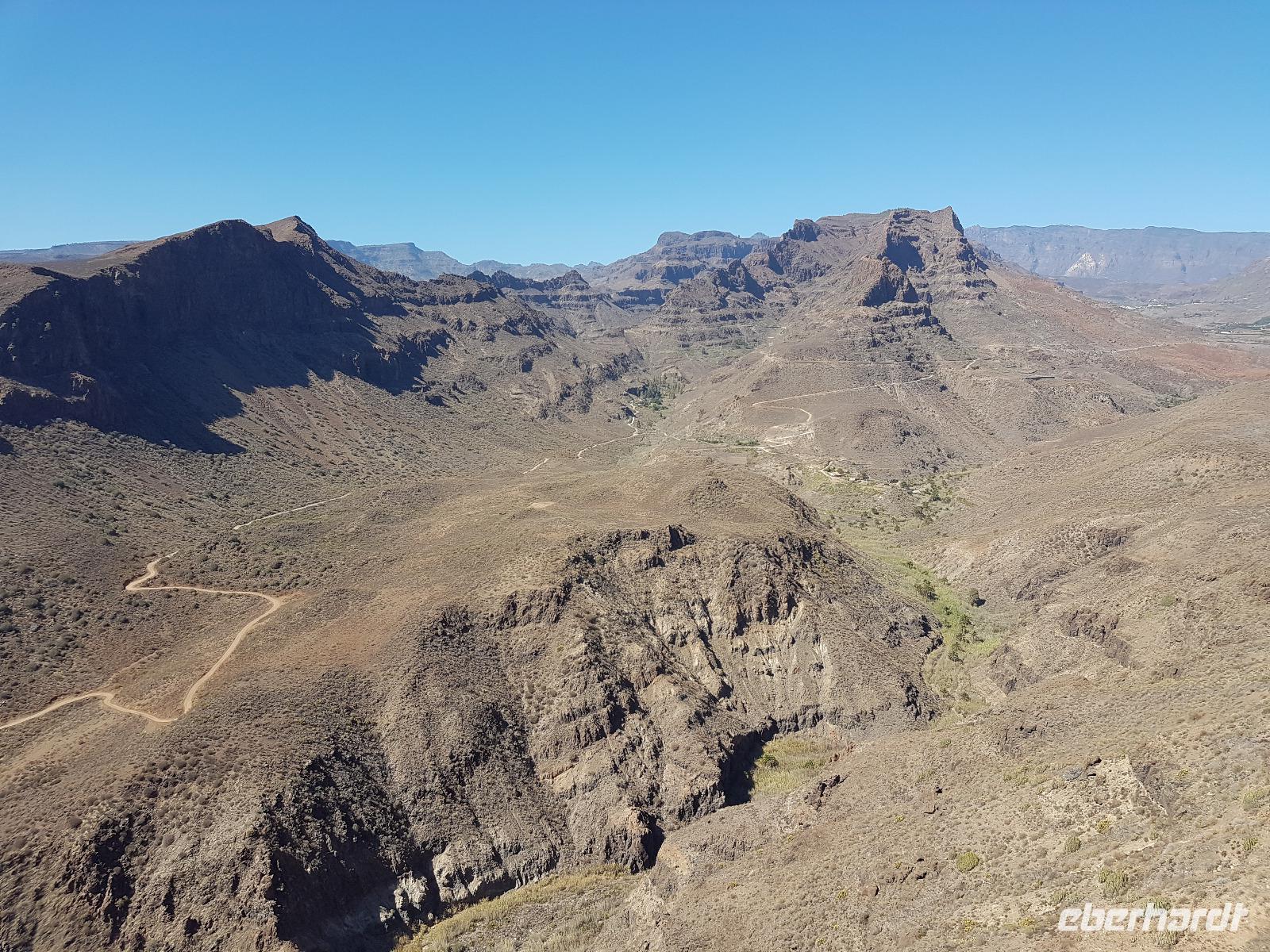 Weiter fuhren wir über einen Pass auf die andere Seite der Insel. Es ist eine total andere Landschaft. Schluchten und Barrancos. Es sieht so aus als wären wir im Grand Canyon in den USA. Herrlich hier! Wir fuhren an der Stadt Tunte vorbei und machen später eine Pause auf einer Terrasse, wo wir einen Barraquito Kaffee in der Sonne genießen könnten. Noch eine letzte Pause um diese kanarische "Grand Canyon Landschaft" zu genießen. Weiter fahren wir bis zum Hotel, wo wir noch vor dem Abendessen am Strand gemeinsam baden können. Nach dem Abendessen gab es noch eine Show im Hotel.