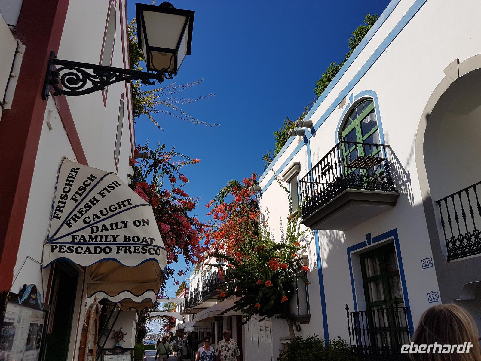 Mit unserem Busfahrer fuhren wir weiter bis Puerto Mogan oder auch das "kleine Venedig" genannt. Uns gefällt es sehr gut. Wir haben etwas Zeit um zu bummeln und einen Kaffee zu trinken. Wir waren 12 Tage auf den Kanaren mit Vulkanen und Natur, aber wir wollen heute eine engere Beziehung mit dem Meer haben, also fahren wir mit einem Boot von Puerto Mogan bis Puerto Rico. Das war sehr schön. Der Kapitän wirft Brot ins Meer und plötzlich können wir viele Fische sehen. Wenn jemand nicht so viel Sonne will gab es auch unten ein Deck im Schatten. Mit Glasboden, um die Fische zu beobachten.
