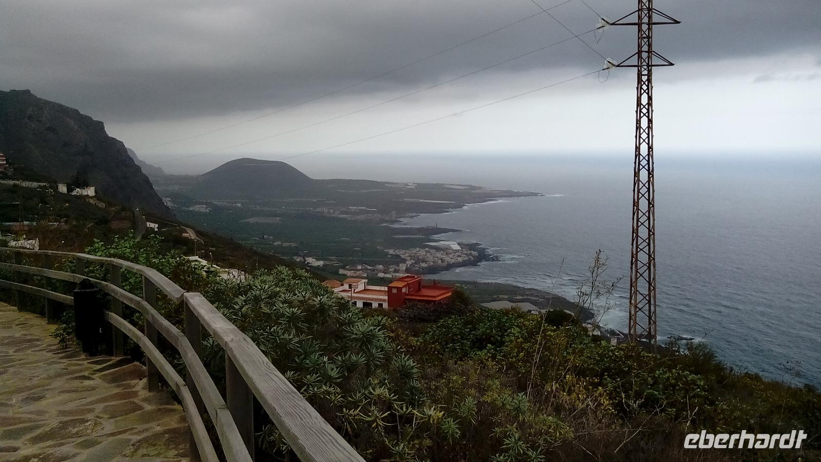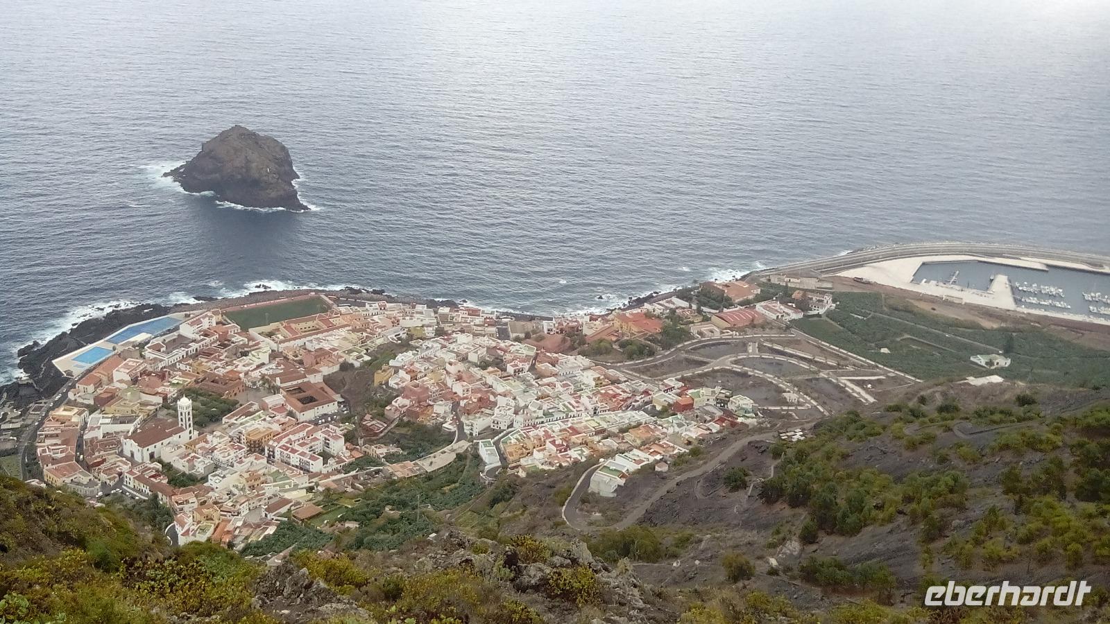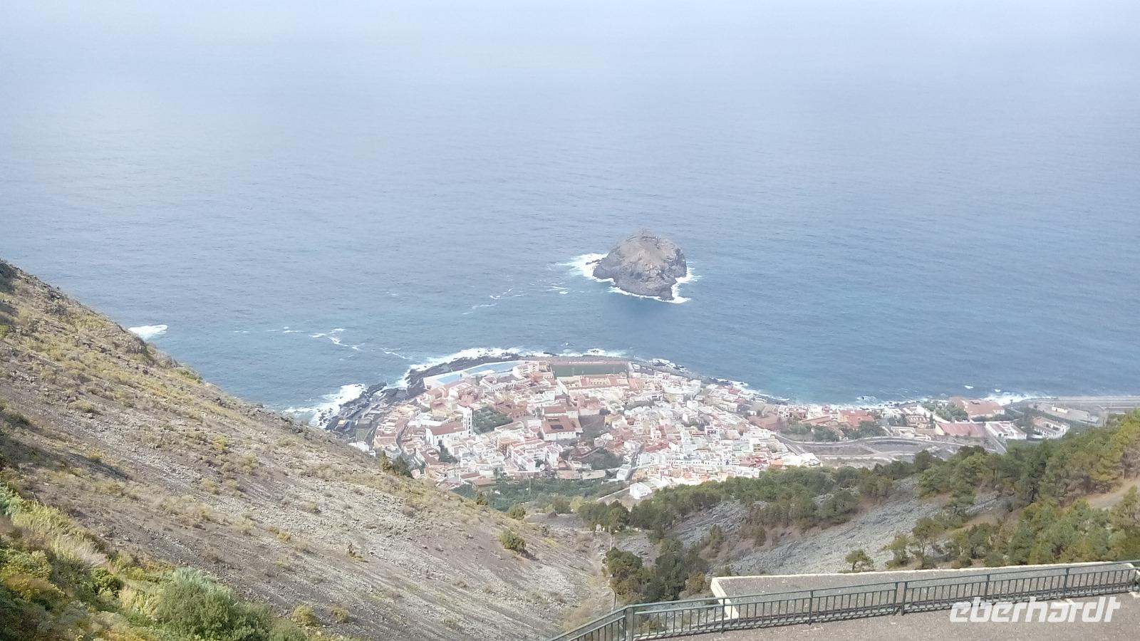 Am Mirador (Aussichtspunkt) de Garachico sahen wir die fächerförmige Platte aus Lavagestein, die das alte Dorf Garachico unter sich begraben hatte & auf der das neue Dorf erbaut worden ist.