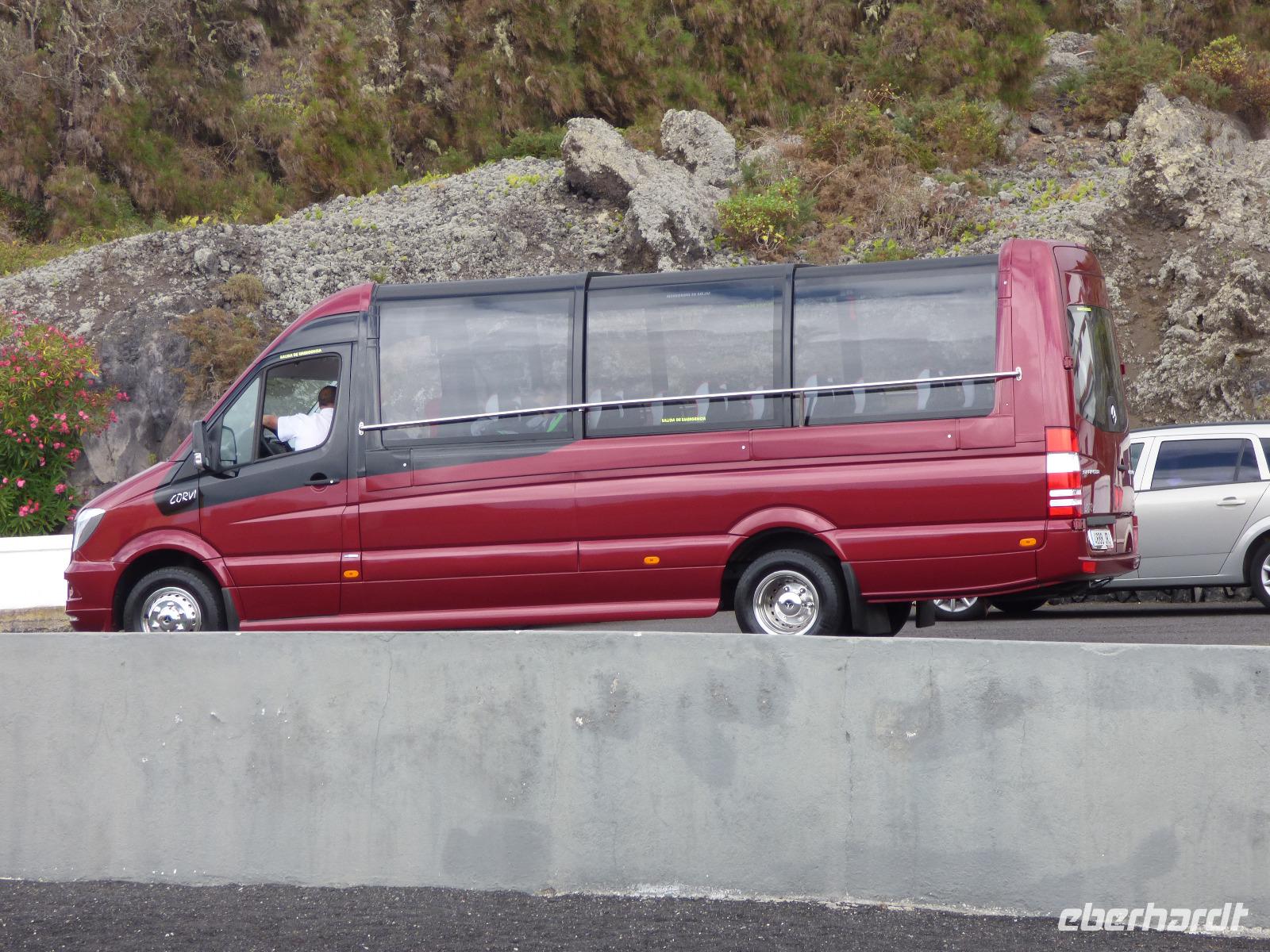 Mit Anne und unserem Busfahrer Oscar ging es schnurstracks durch den kanarischen Kiefernwald in den Teide-Nationalpark und zur Seilbahnstation des Teide. Diese Kiefern sind eine kanarische Besonderheit: Sie sind feuerresistent und überleben deshalb die hier leider sehr oft vorkommenden Waldbrände. Dabei brennen sie bis auf den Stamm ab, aber innerhalb weniger Jahre bekommen sie neue Äste & Nadeln. Wegen dieser einzigartigen Eigenschaft hat man sie nach Australien, Südafrika, Zypern, Griechenland, Israel importiert, aber dort haben sie sich nicht bewährt, da sie sich besser vermehren als endemische Arten und diese verdrängen.