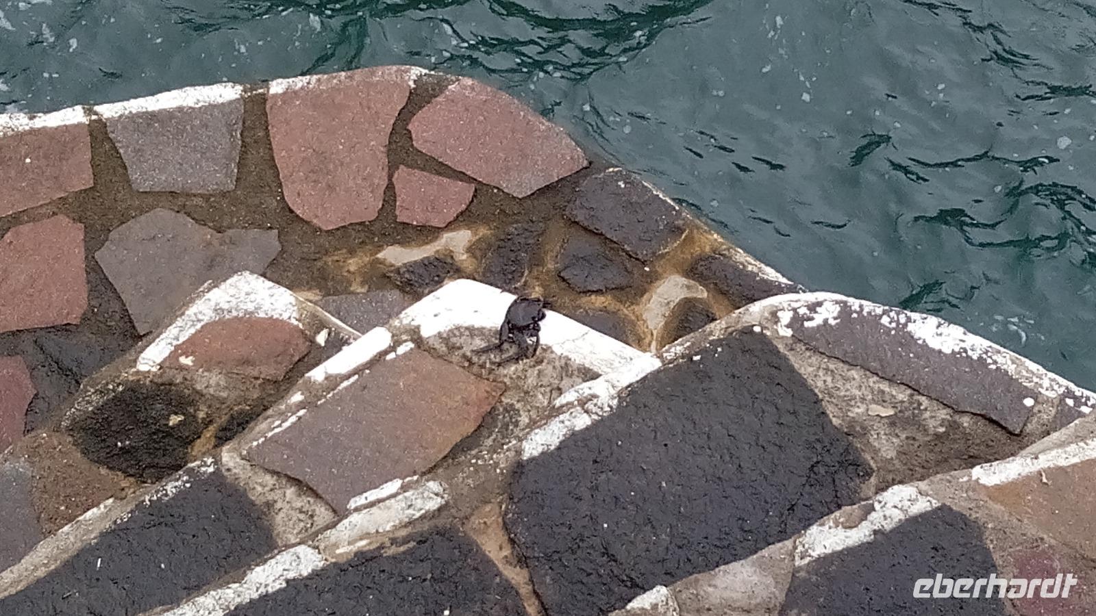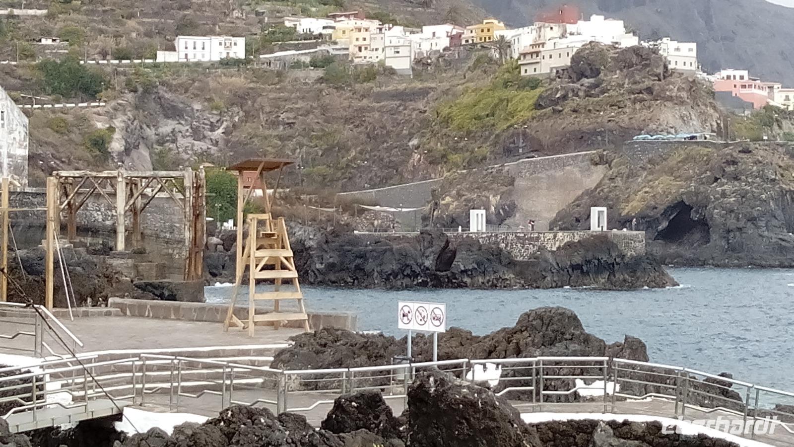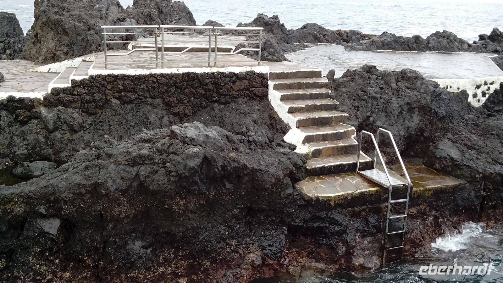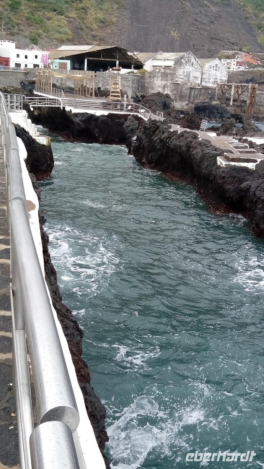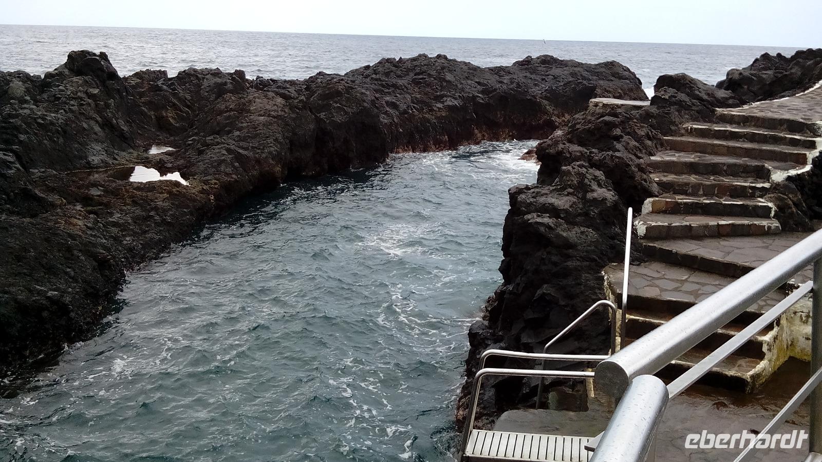 Im Ort selbst konnten wir den ehemaligen Eingang zum Hafen anschauen, die ebensowenig zerstörte Kirche und eine Attraktion: ein natürliches, über 100 m langes Badebecken zwischen schwarzen Lavafelsen mit in selbige gehauenen Treppen und Sprunggelegenheiten. Die sich entlang bewegende Welle fegte die dunkelroten und schwarzen Krabben wundersamerweise nicht von den steilen Wänden. Dann hatten wir Zeit zum Bummeln und Essen.