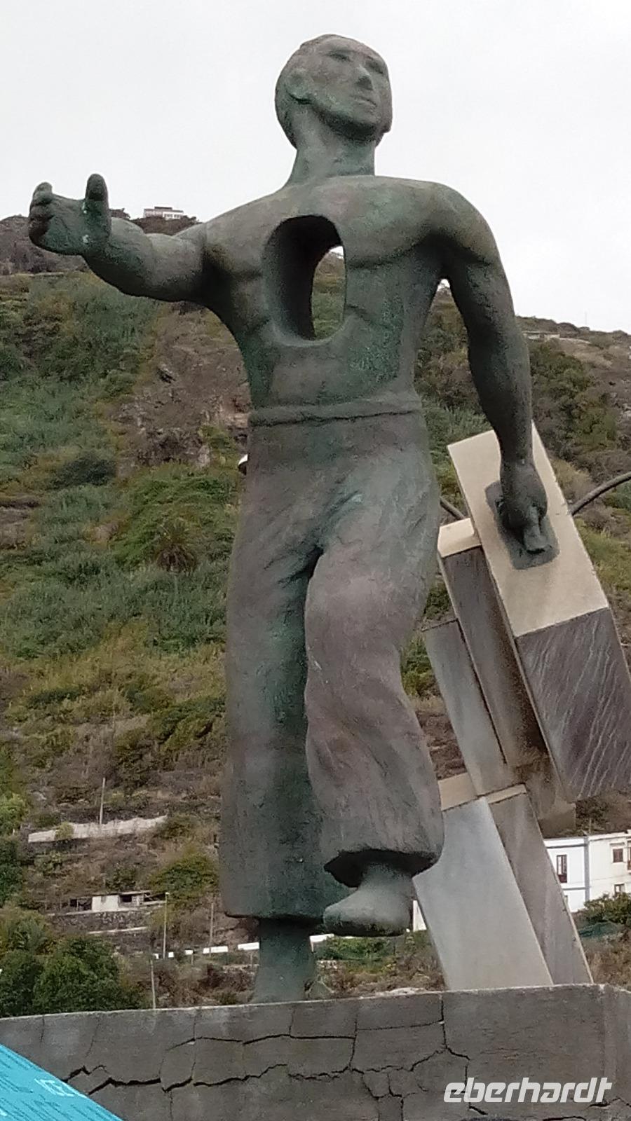 An diesem geruhsamen Tag fuhr uns Salomé, unsere Busfahrerin, ebenso geruhsam auf den spektakulär engsten und gewundensten Straßen im Nordwesten der Insel. Es ging los mit zwei schönen Aussichtspunkten: Mirador Lomo Molino und Lagarito. Das Dorf oder die Stadt Garachico ("kleine Insel", so benannt nach der kleinen vorgelagerten Insel), war unser erstes Highlight. Sie war die wichtigste Hafenstadt von Teneriffa, bis sie vor 310 Jahren zerstört wurde von Lava, zuerst der Hafen innerhalb von 6 Stunden, später große Teile der Wohngebiete. Es setzte eine große Landflucht nach dem Vulkanausbruch ein, die ökonomische Grundlage war zerstört. Oberhalb des ehemaligen Hafens befindet sich eine Metall-Skulptur, die symbolisch hierfür geschaffen wurde: ein Mann mit vielen Koffern, der Garachico verlässt, aber ein großes Loch in der Brust hat, da sein Herz hierbleibt.