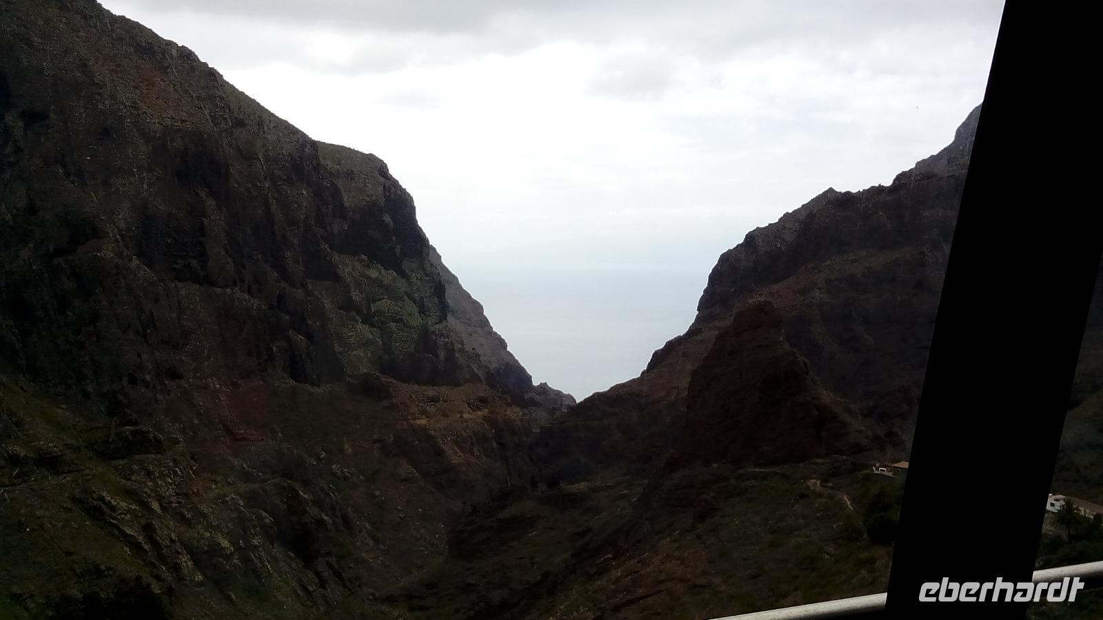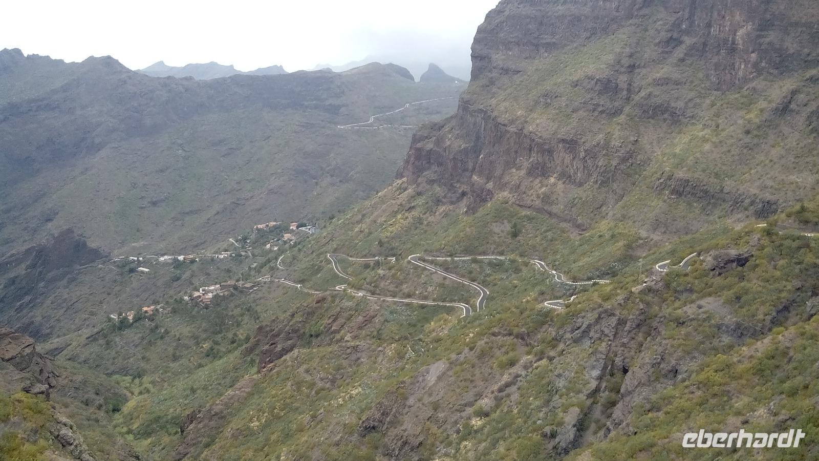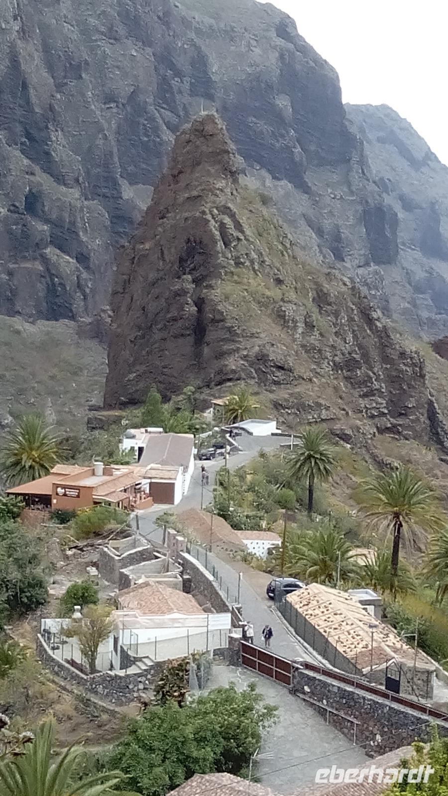 Weiter ging es durch das Teno-Gebirge, was manchmal ein bisschen in einer Wolke lag. Am Cruz de Hilda sahen wir die beeindruckende, berühmt-berüchtigte Masca-Schlucht von oben und darin Masca, das aus drei Mikroballungen von Häusern besteht. Hier konnten wir Kaffee und Kuchen zu uns nehmen oder eine ganz kleine, ca. zehnminütige Wanderung in Richtung der Schlucht machen.