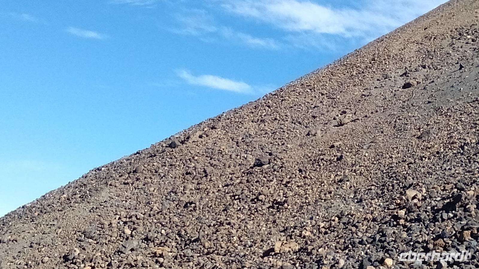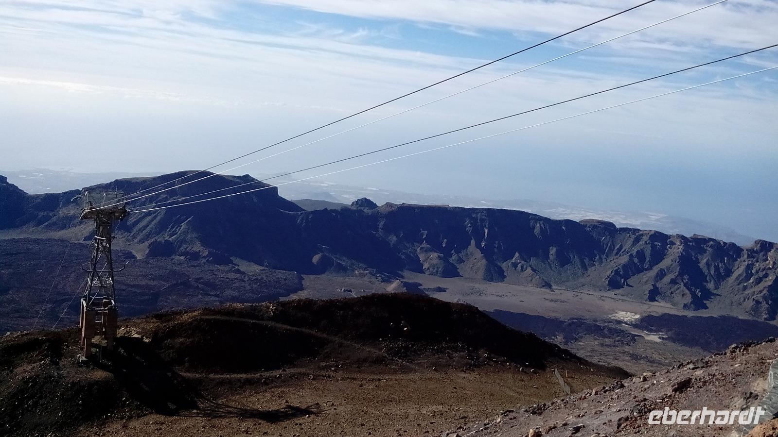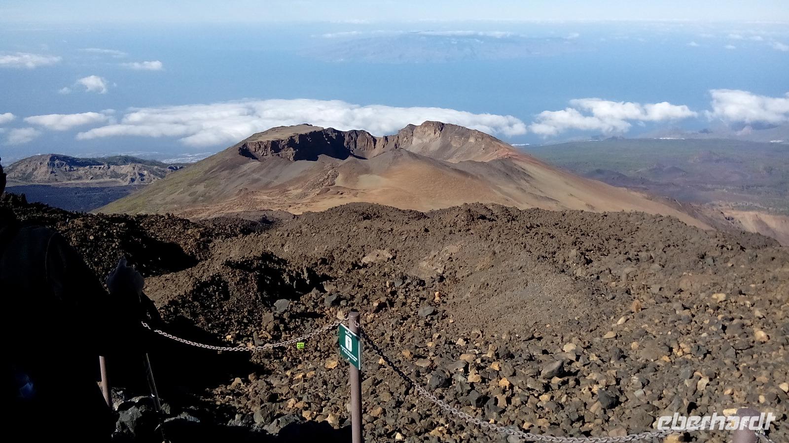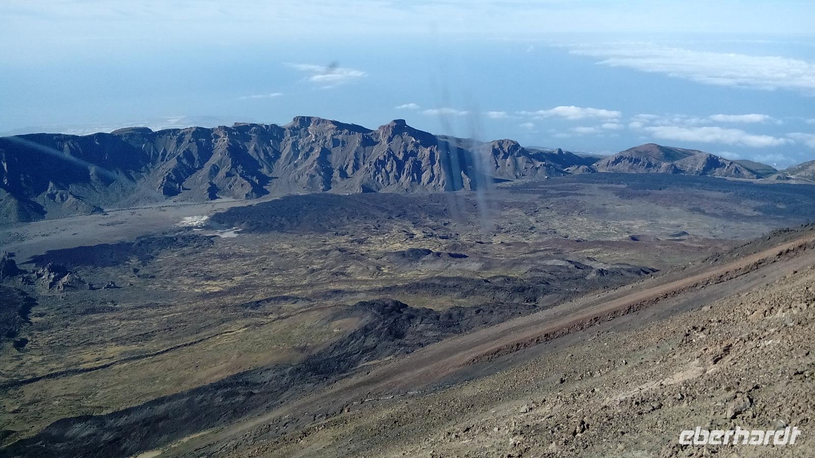 Um 10 Uhr ging unsere Seilbahn mit 44 Personen in nur acht Minuten nach oben. Auf der Fahrt und auf unserem Spaziergang 170 Meter unter dem Gipfel konnten wir sehr schön die unterschiedlichen Lavaströme und Gesteinsarten erkennen und den benachbarten Gipfel Pico Viejo bestaunen.