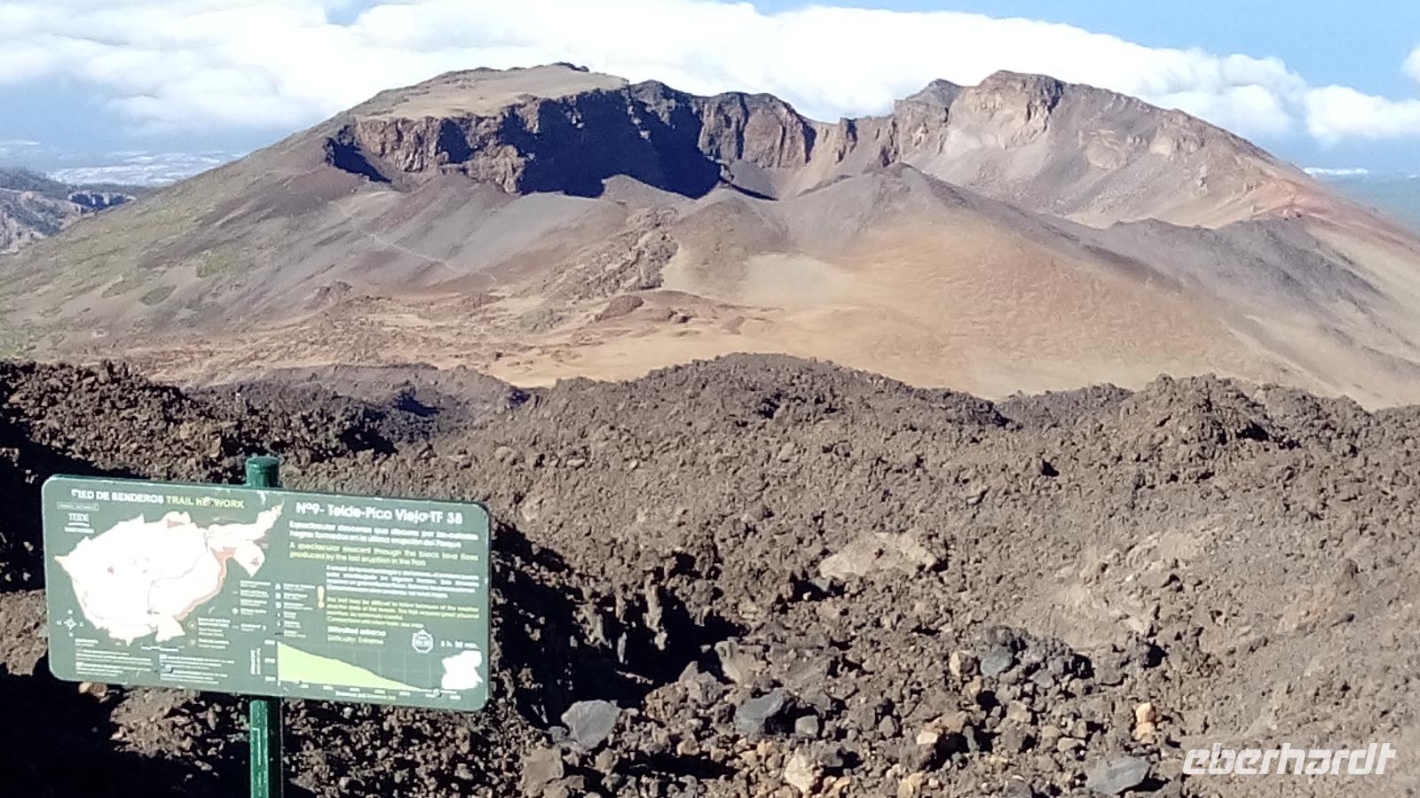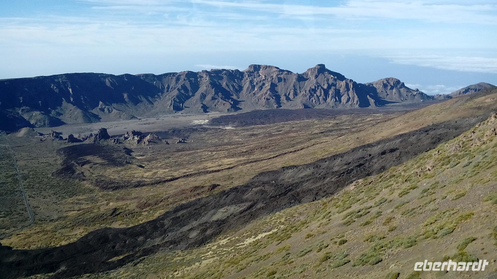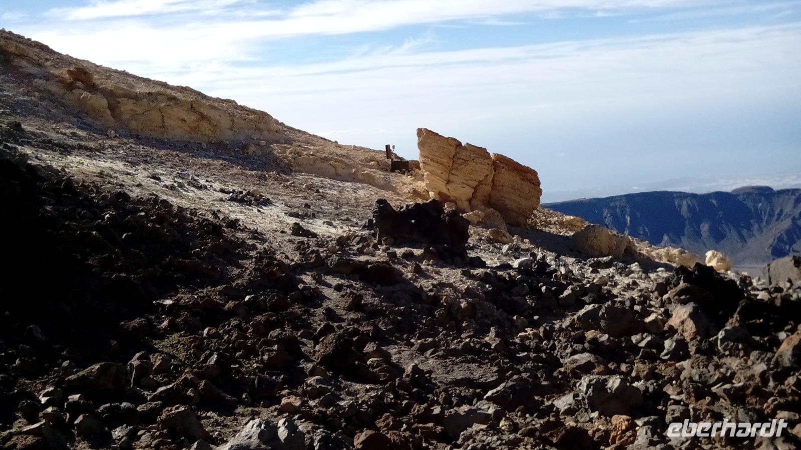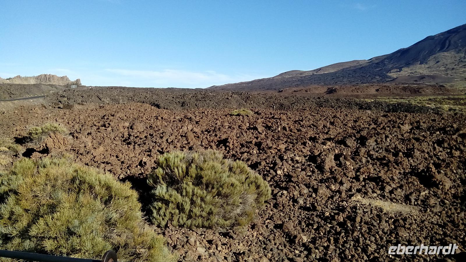 Um 10 Uhr ging unsere Seilbahn mit 44 Personen in nur acht Minuten nach oben. Auf der Fahrt und auf unserem Spaziergang 170 Meter unter dem Gipfel konnten wir sehr schön die unterschiedlichen Lavaströme und Gesteinsarten erkennen und den benachbarten Gipfel Pico Viejo bestaunen.