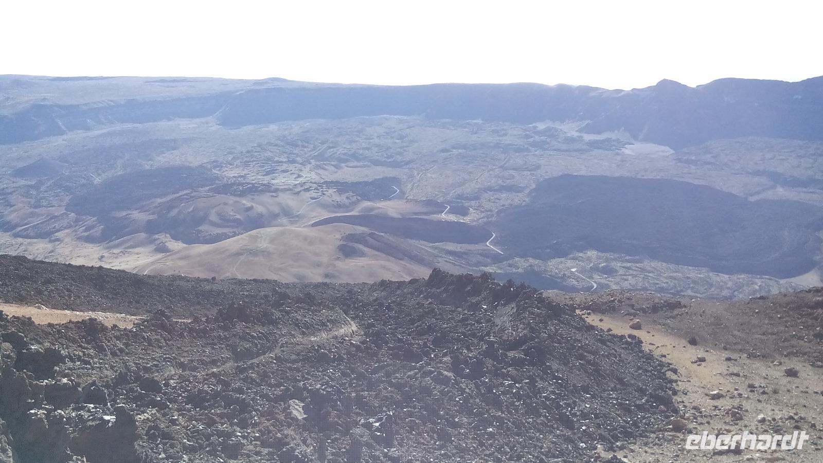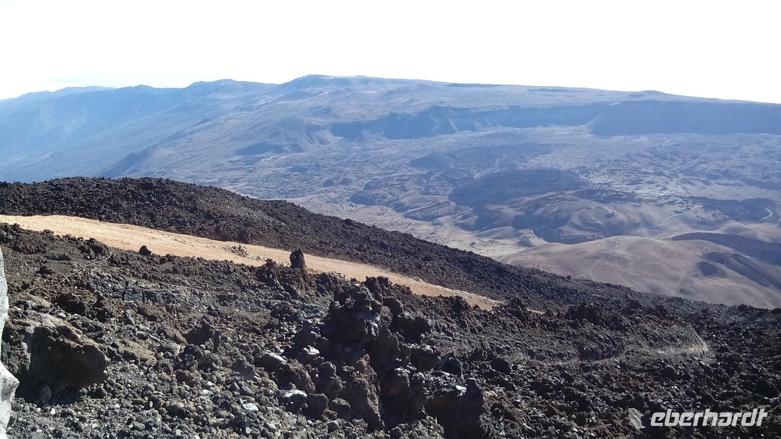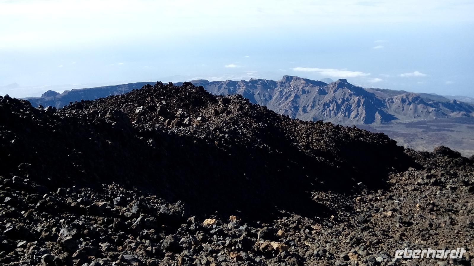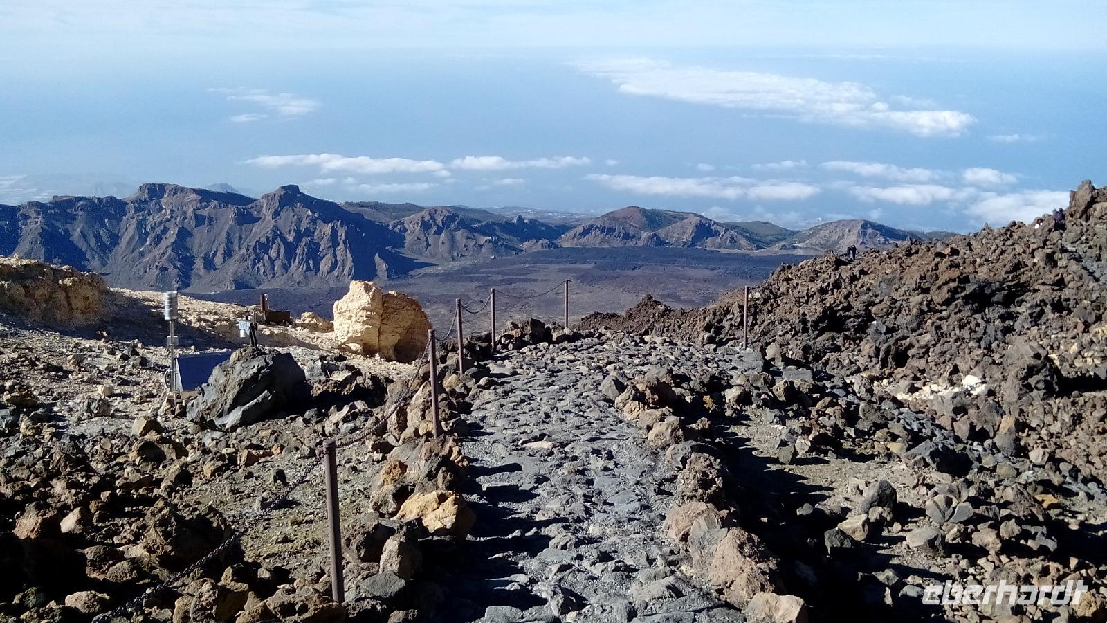 Um 10 Uhr ging unsere Seilbahn mit 44 Personen in nur acht Minuten nach oben. Auf der Fahrt und auf unserem Spaziergang 170 Meter unter dem Gipfel konnten wir sehr schön die unterschiedlichen Lavaströme und Gesteinsarten erkennen und den benachbarten Gipfel Pico Viejo bestaunen.