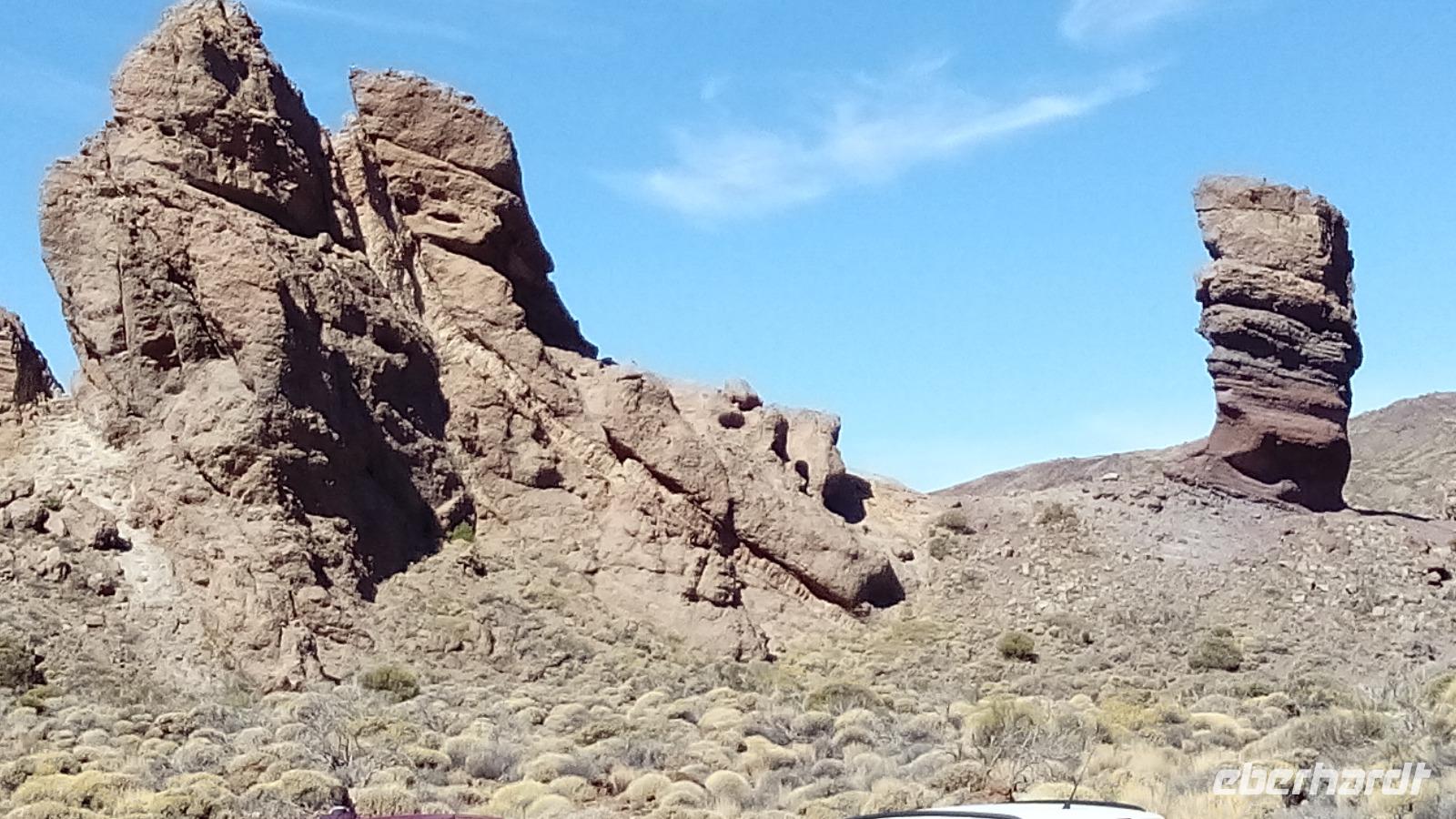 Nachdem wir alle wieder unten angekommen waren ;-) , ging es weiter zu den Roques de García. Diese bizarren Felsen haben jahrelang Modell gestanden für den 1000-Peseten-Schein. Sie befinden sich mitten in der alten Vulkanmauer, die der Überrest des gigantischen Urkegels des Vulkans ist, der viel größer war, als der jetzige Teide, und der aufgrund seiner massiven Größe zusammengebrochen ist.