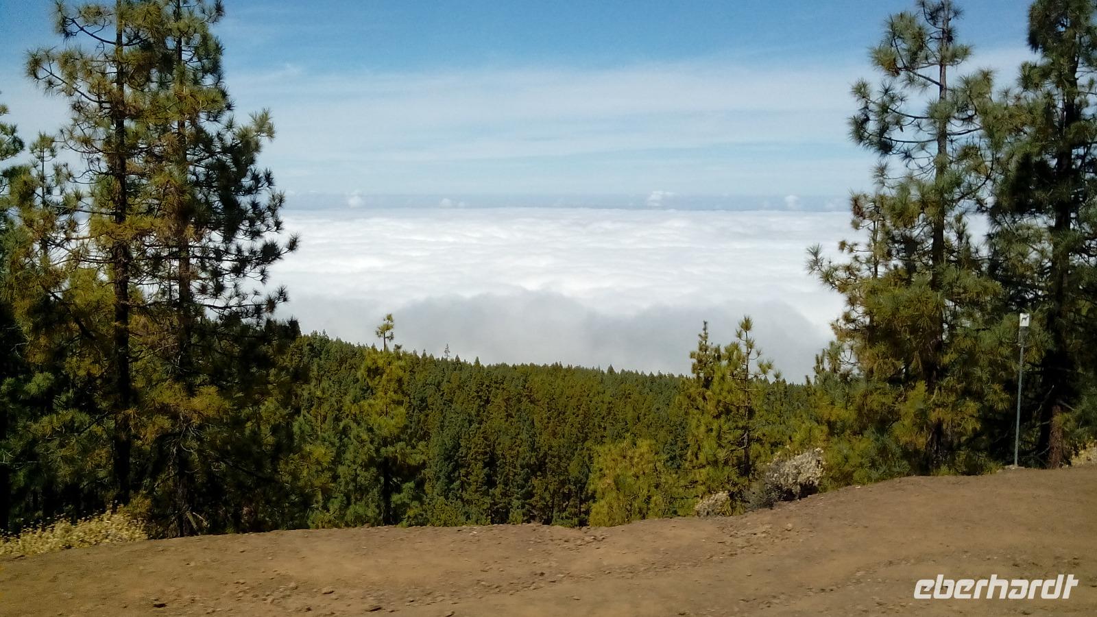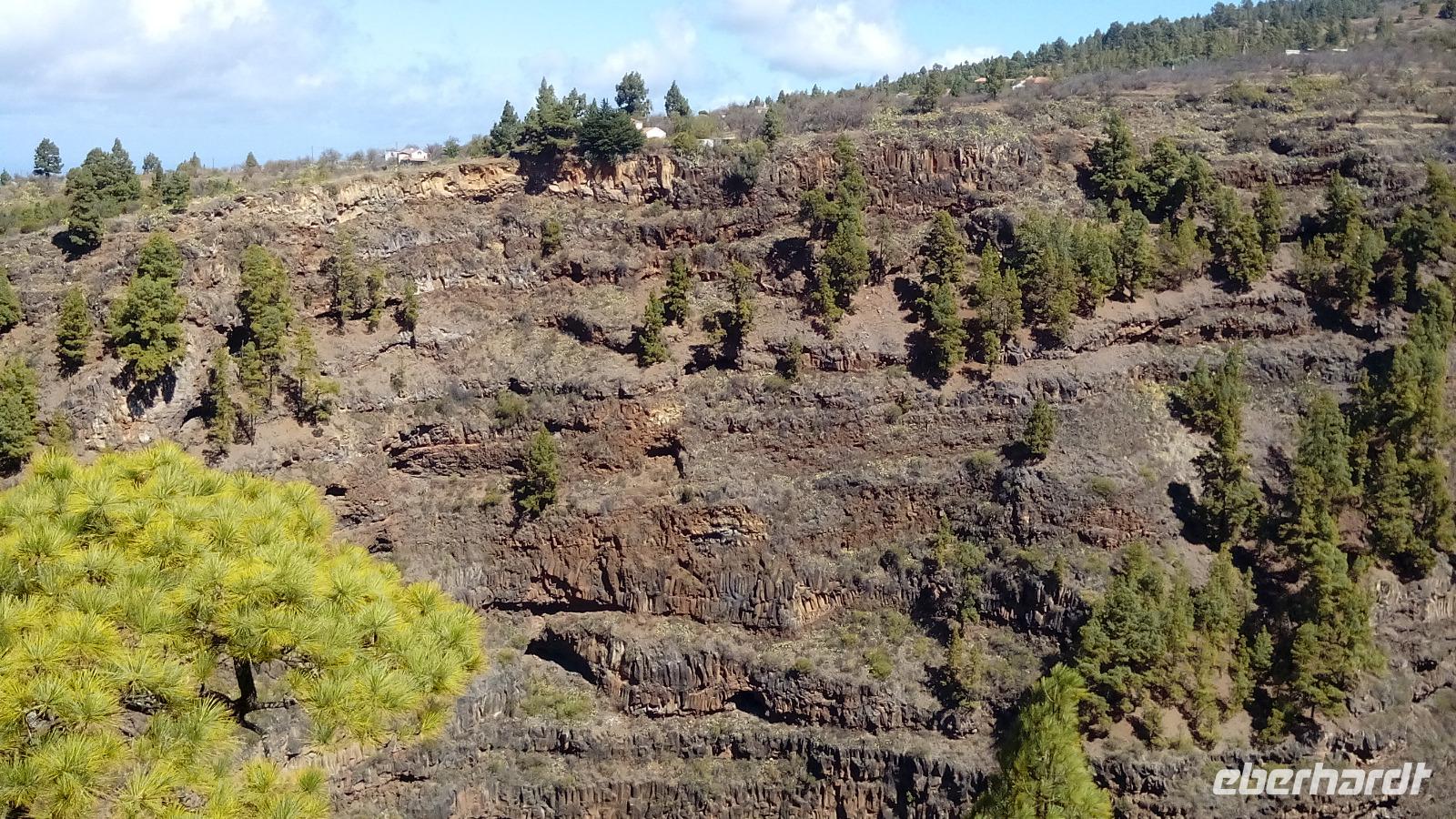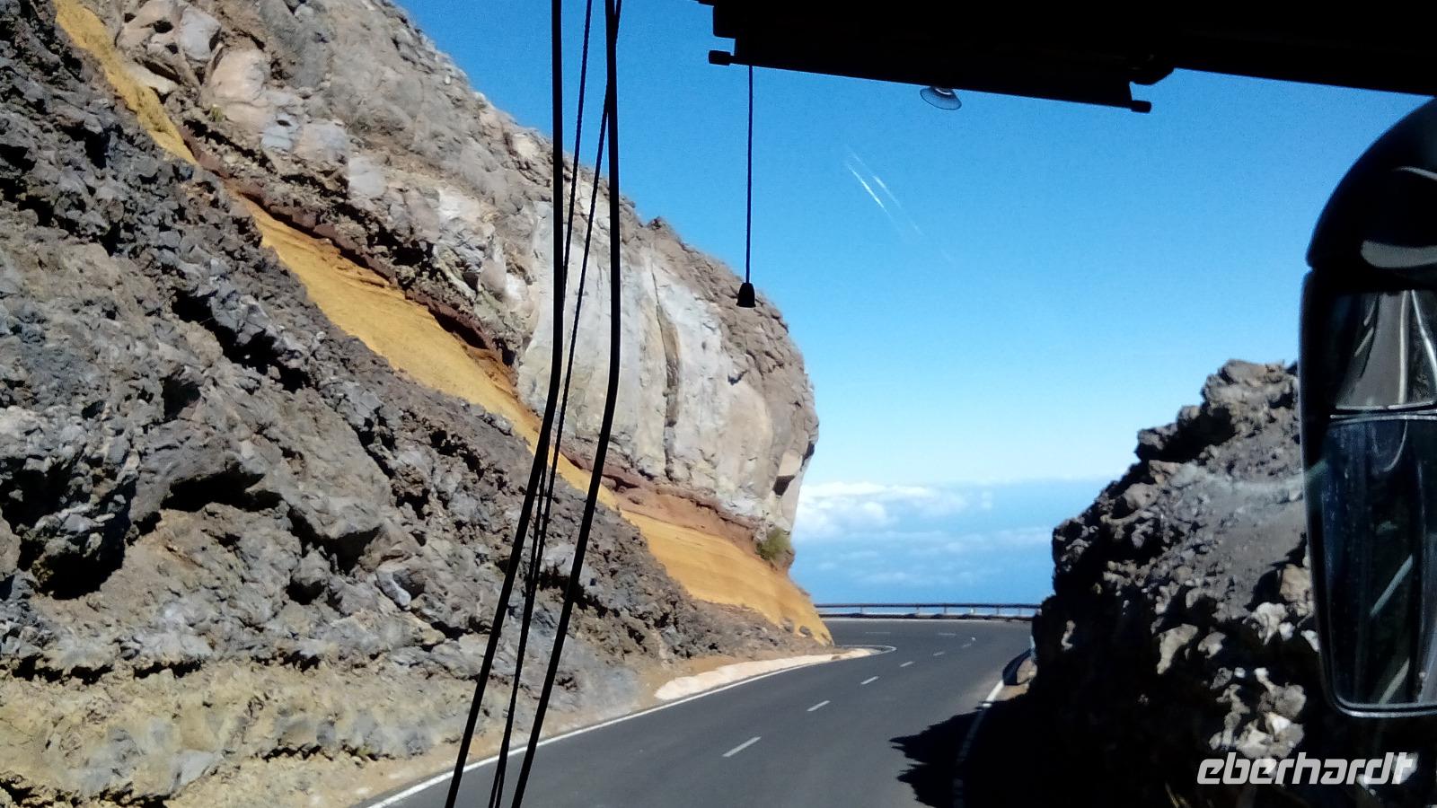 Unsere Fahrt ging weiter durch Kiefernwald, der den letzten Brand zum Teil noch mit Nadeln überstanden hat. Die Nadeln waren zum Teil grün auf der einen, braun auf der anderen Seite der Bäume. Die kanarische Kiefer wird als natürlicher Wolkenkratzer bezeichnet, oder als Baum, der die Wolken melkt. Letztere Eigenschaft hatte uns Anne schon von den Lorbeerbäumen erklärt (horizontaler Regen).