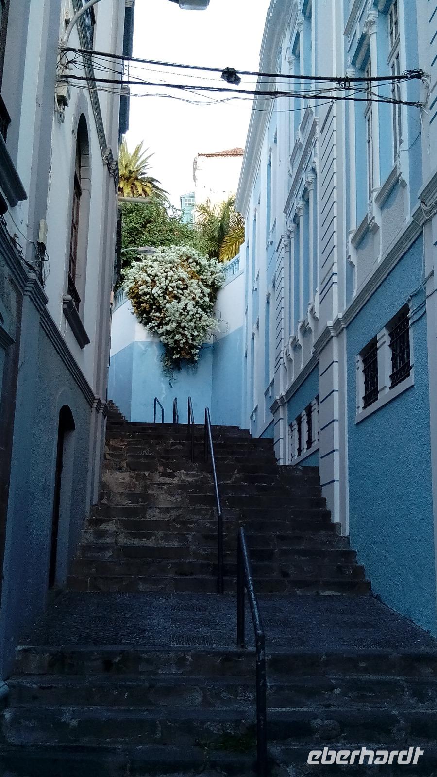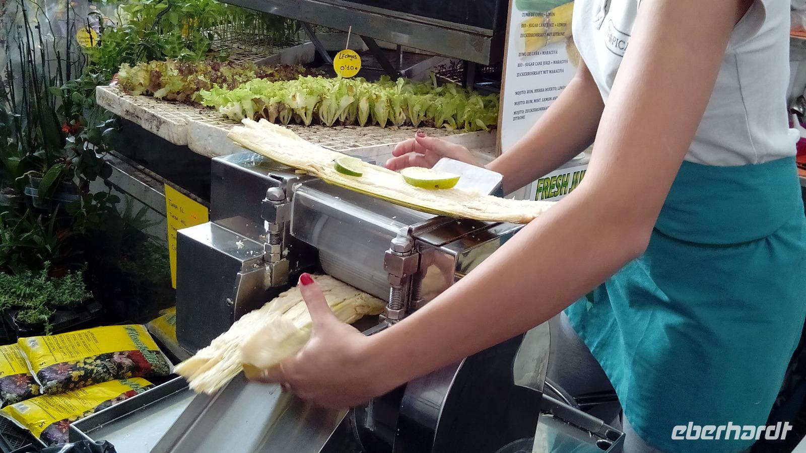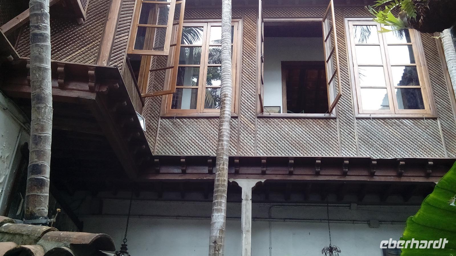 Am Donnerstag hatten wir wieder "unseren lieben Paco" als Fahrer und der Tag begann mit einem Stadtrundgang durch Santa Cruz. Auf dem Markt empfahl uns Gabriele, Zuckerrohrsaft mit Maracuja zu probieren, und das war wirklich eine äußerst leckere Saftmischung, die vor unseren Augen gepresst wurde. Vor dem Rathaus erklärte sie uns die Tradition der tanzenden Zwerge, die zuerst hochgewachsene Männer sind, und sich dann in einem Haus in Zwerge verwandeln und den ganzen Tag mit zusammengebundenen Beinen tanzen. Wir genossen den Anblick schönster Holzbalkons und erfuhren ihre ursprüngliche Nutzung: Ein Teil der Balkons auf der meereszugewandten Seite war jeweils als Toilette abgetrennt!