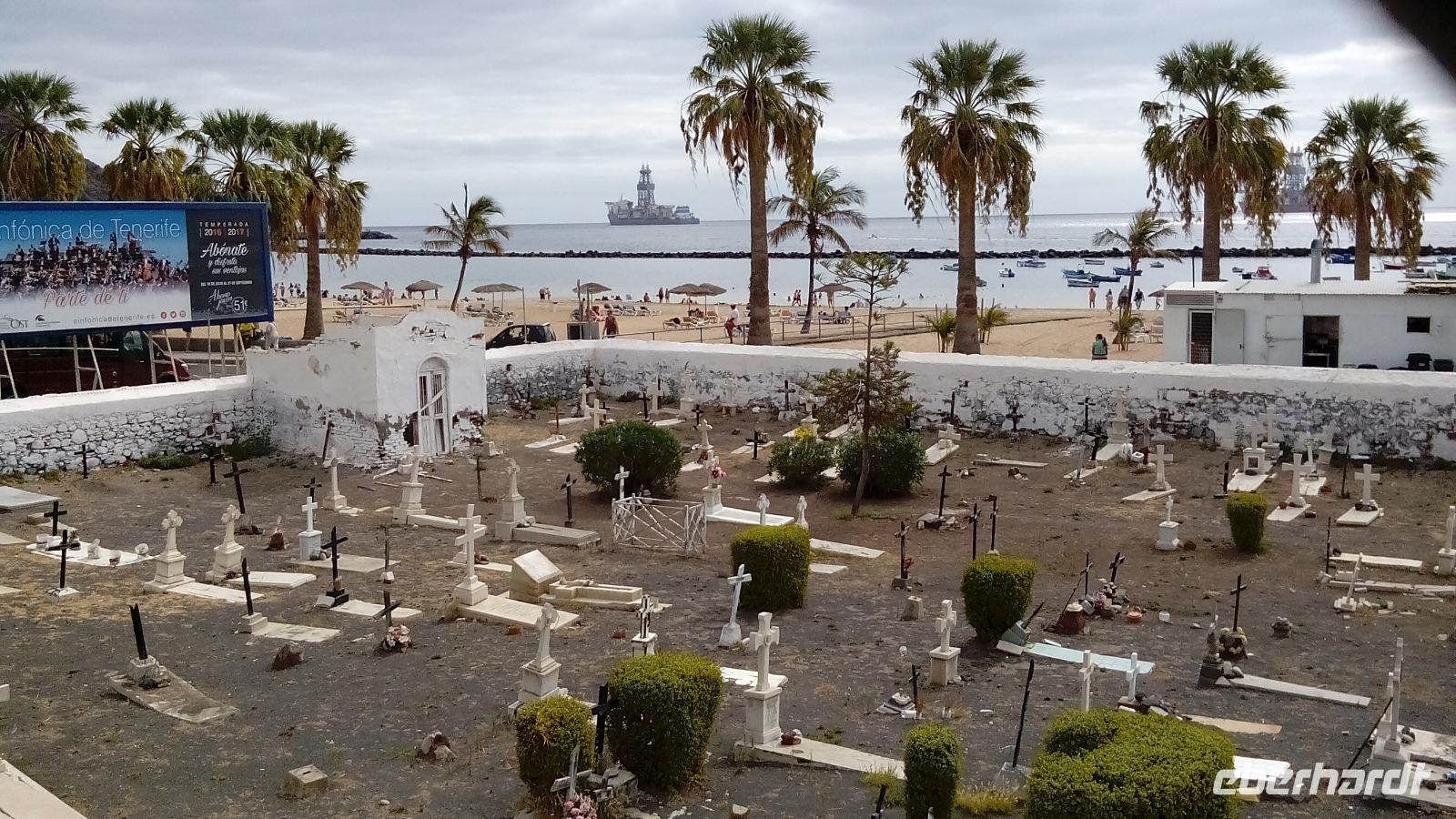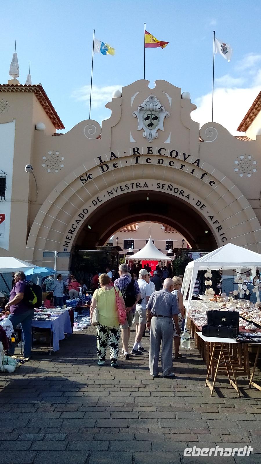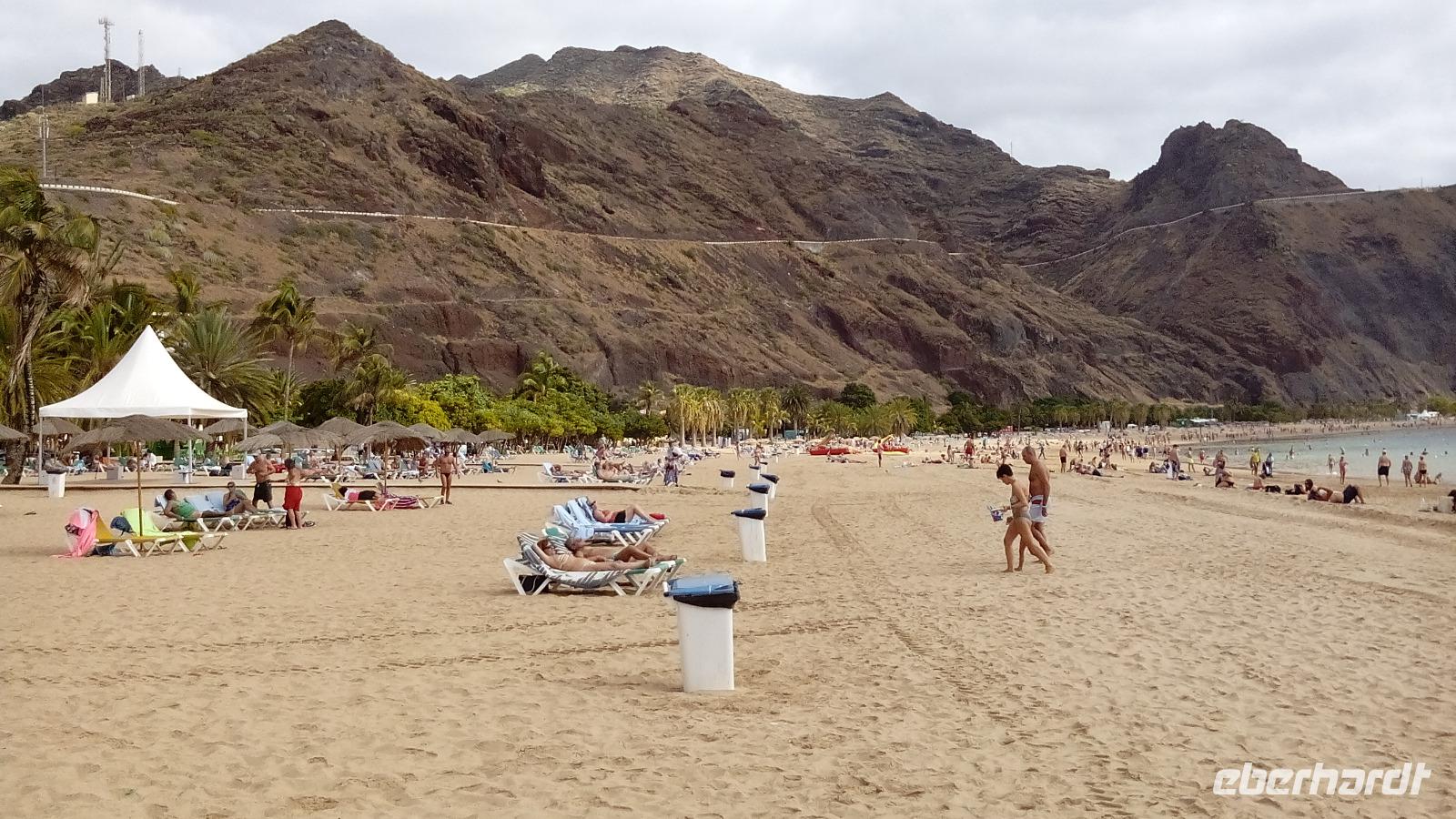 Am Sonntag fuhren wir mit Anne und Salomé zuerst nach Santa Cruz auf den Markt, wo halb Teneriffa seinen "Kram" verkauft, und die andere Hälfte selbigen kauft. Wir machten einen kleinen Stadtrundgang und besichtigten die Kirche mit dem heiligen Kreuz, das bei der Ankunft an der Küste in den Sand gerammt worden war und das der Stadt ihren Namen gab. Da die Stadt wegen des Hafens keinen Strand hat, wurde ein kleiner symbolischer künstlicher angelegt gegenüber des Gebäudes der Inselregierung. Da die Bewohner aber auch an einem richtigen Strand baden wollten, wurde acht Kilometer außerhalb der Stadt ein ganz besonderer angelegt: Las Teresitas, für den gelber Saharasand angeschleppt wurde. Dieser blieb jedoch nicht lange liegen, deshalb musste noch ein zweites Mal angeschleppt werden, nach dem Bau von einem Steinwall in der Bucht.